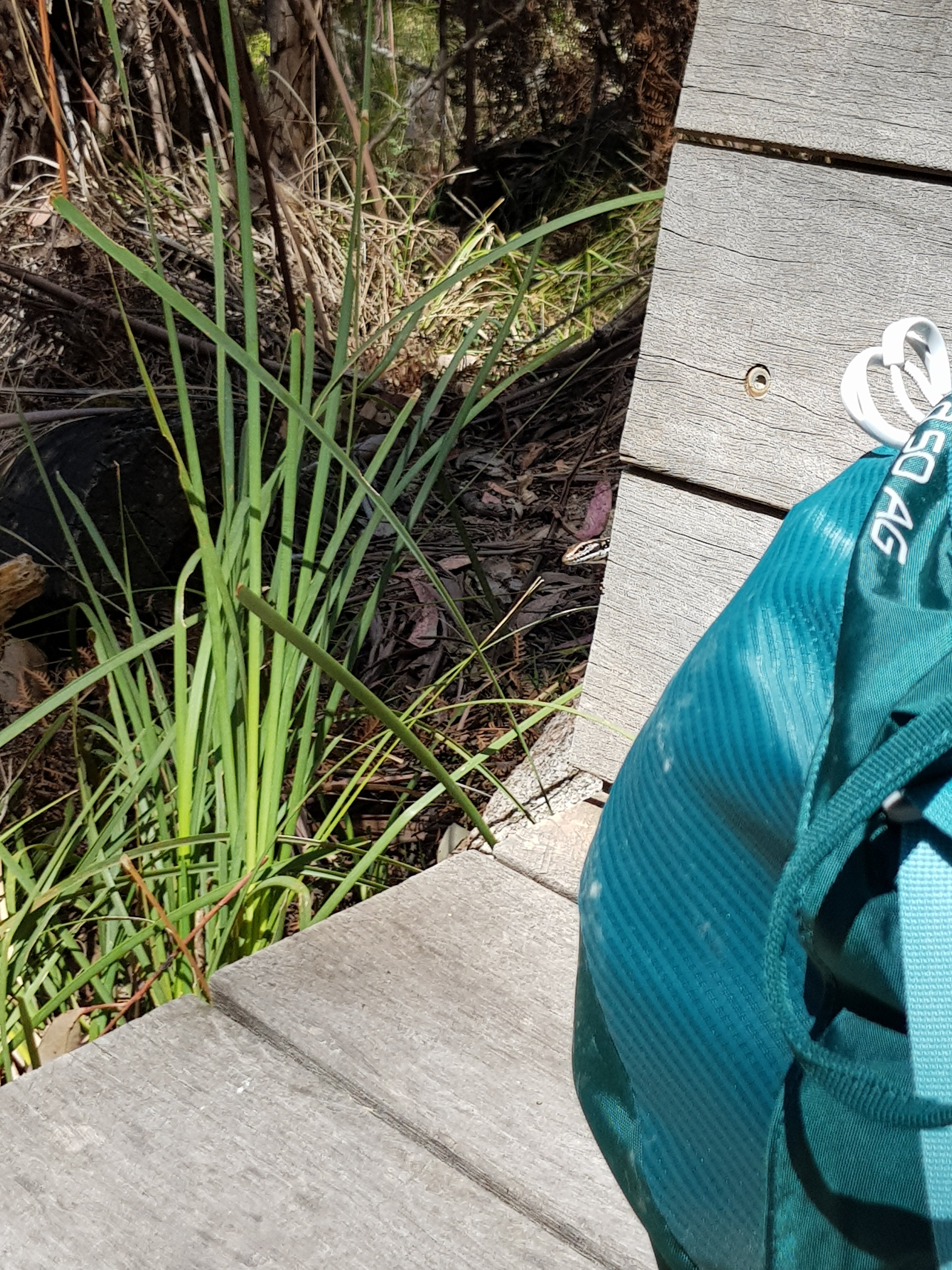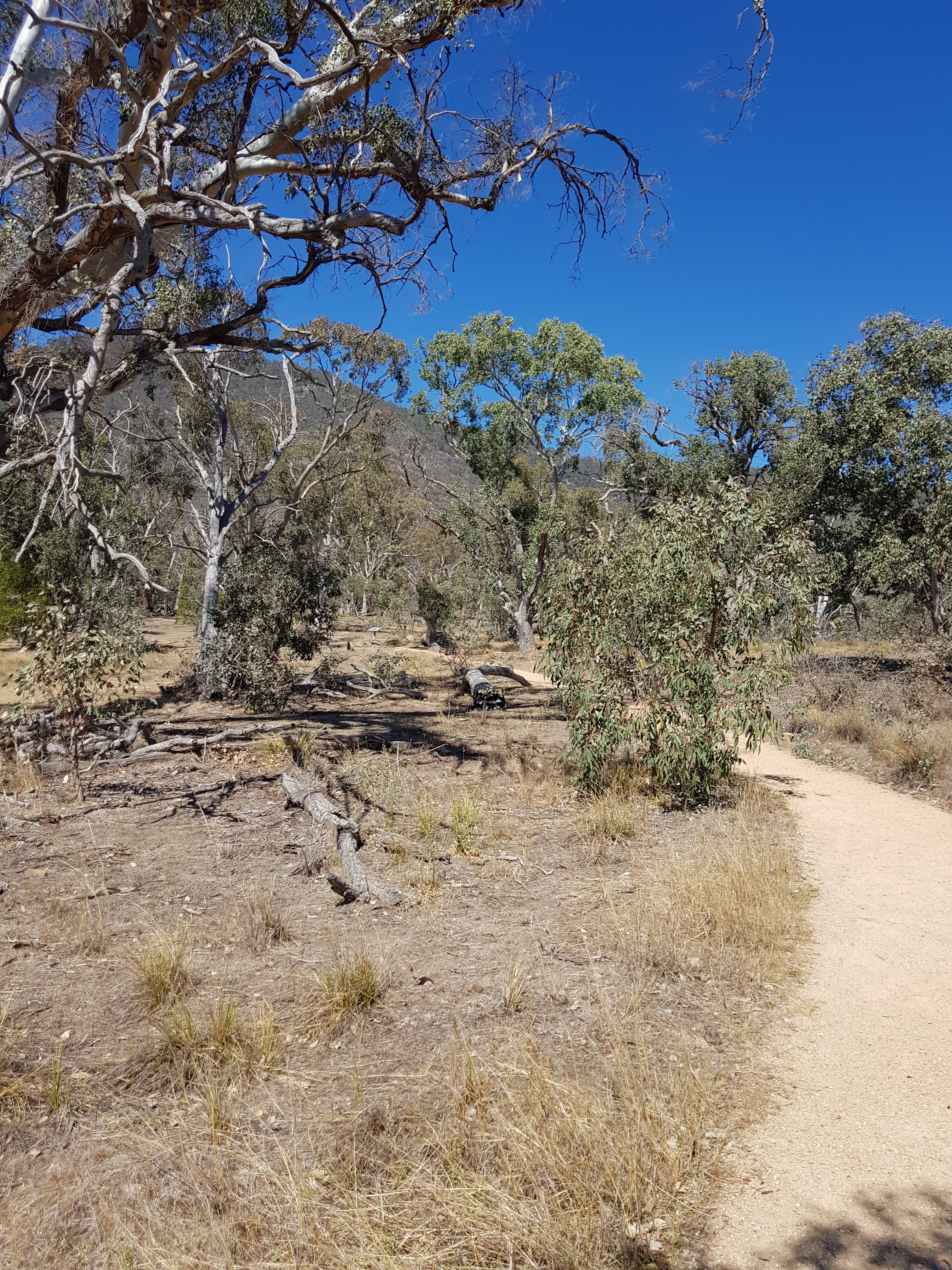 After a restless night spent thinking about all the things that could go wrong (why didn’t I test the solar charger before now, l need to send people the map before l go, what if l bought the wrong length gaiters, what if brumbies stampede my tent while I’m sleeping – lucky my research told me l didn’t need to worry about dying from funnel web spider bite otherwise that would have been on the list too no doubt), l set off from Tharwa at 10am along a lovely undulating bush track. Right near the beginning some people had left a collection of snake sticks for which l would quickly become extremely grateful.