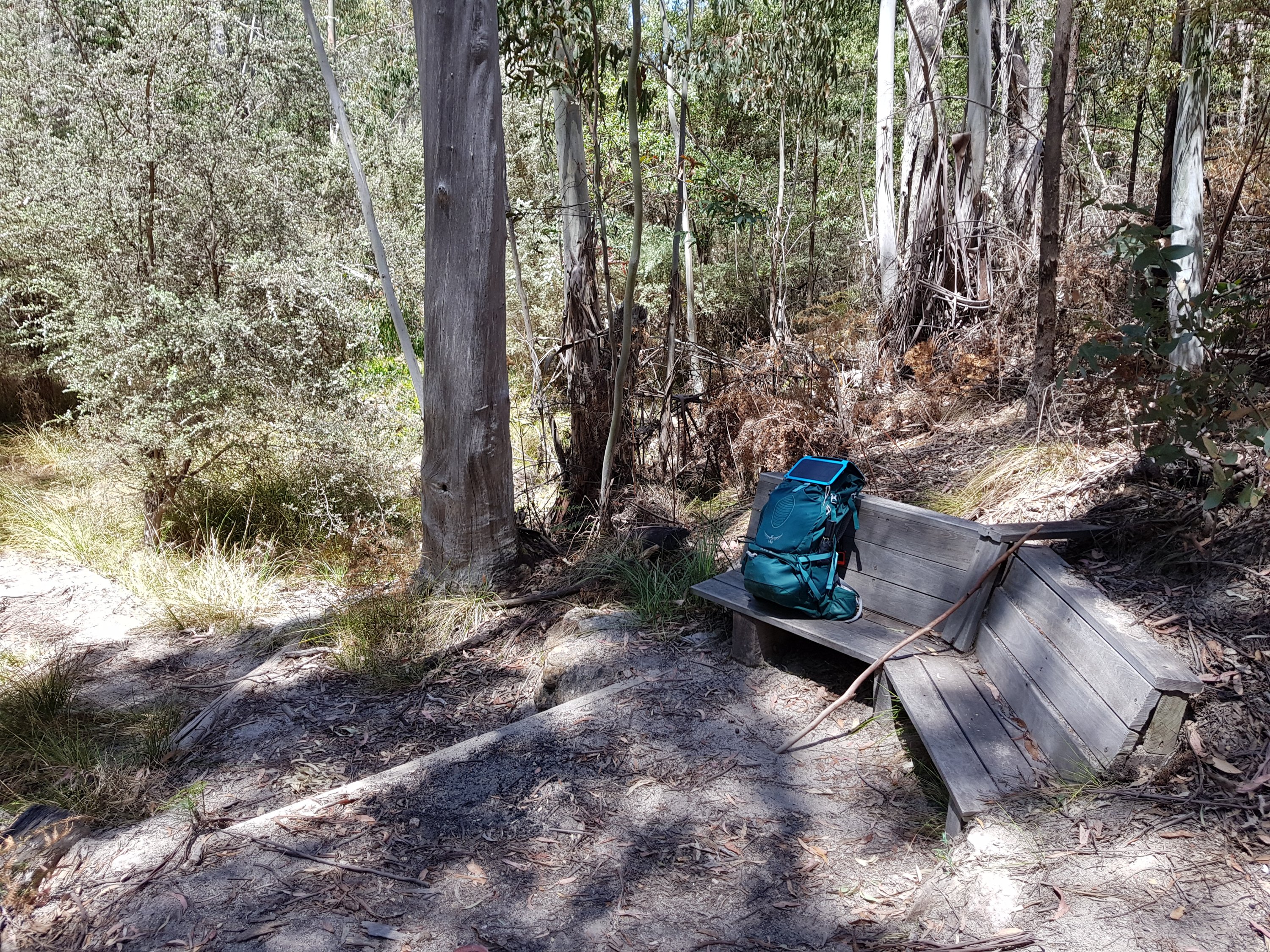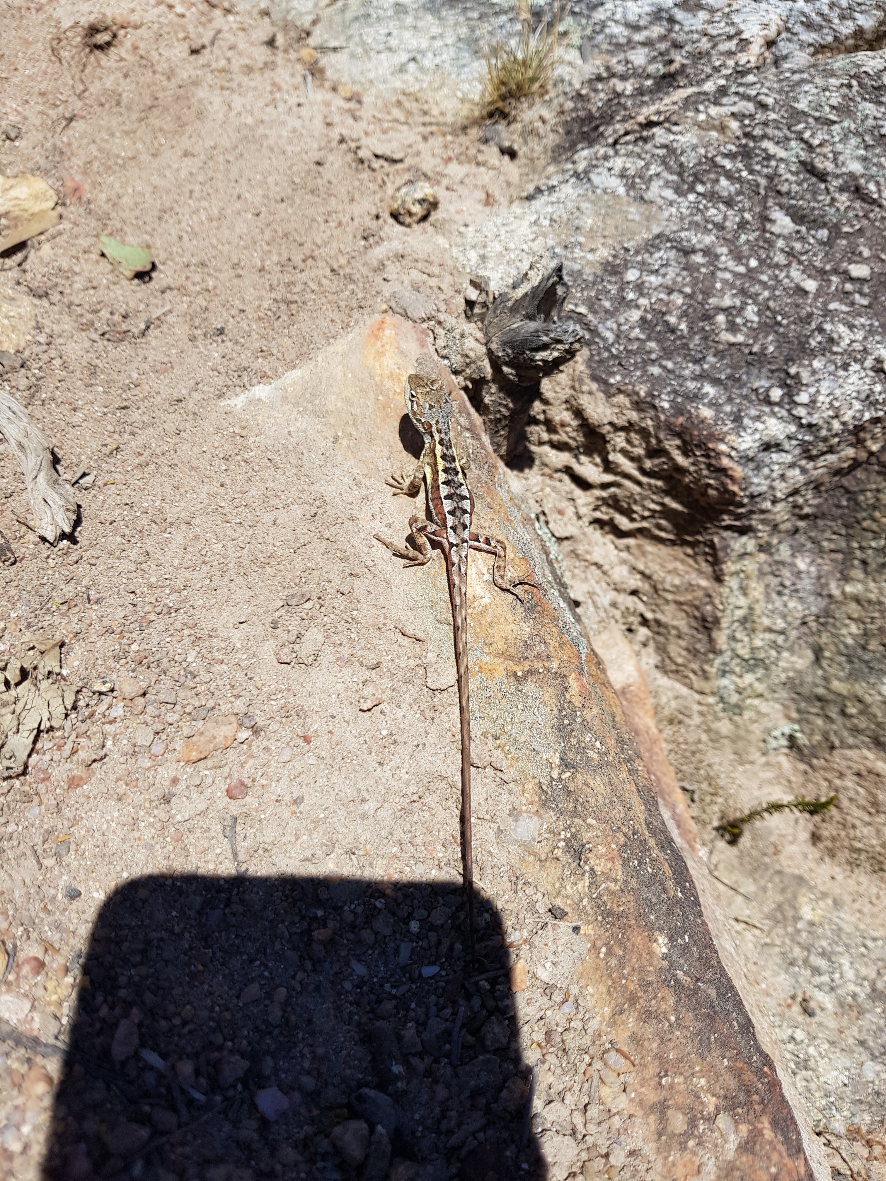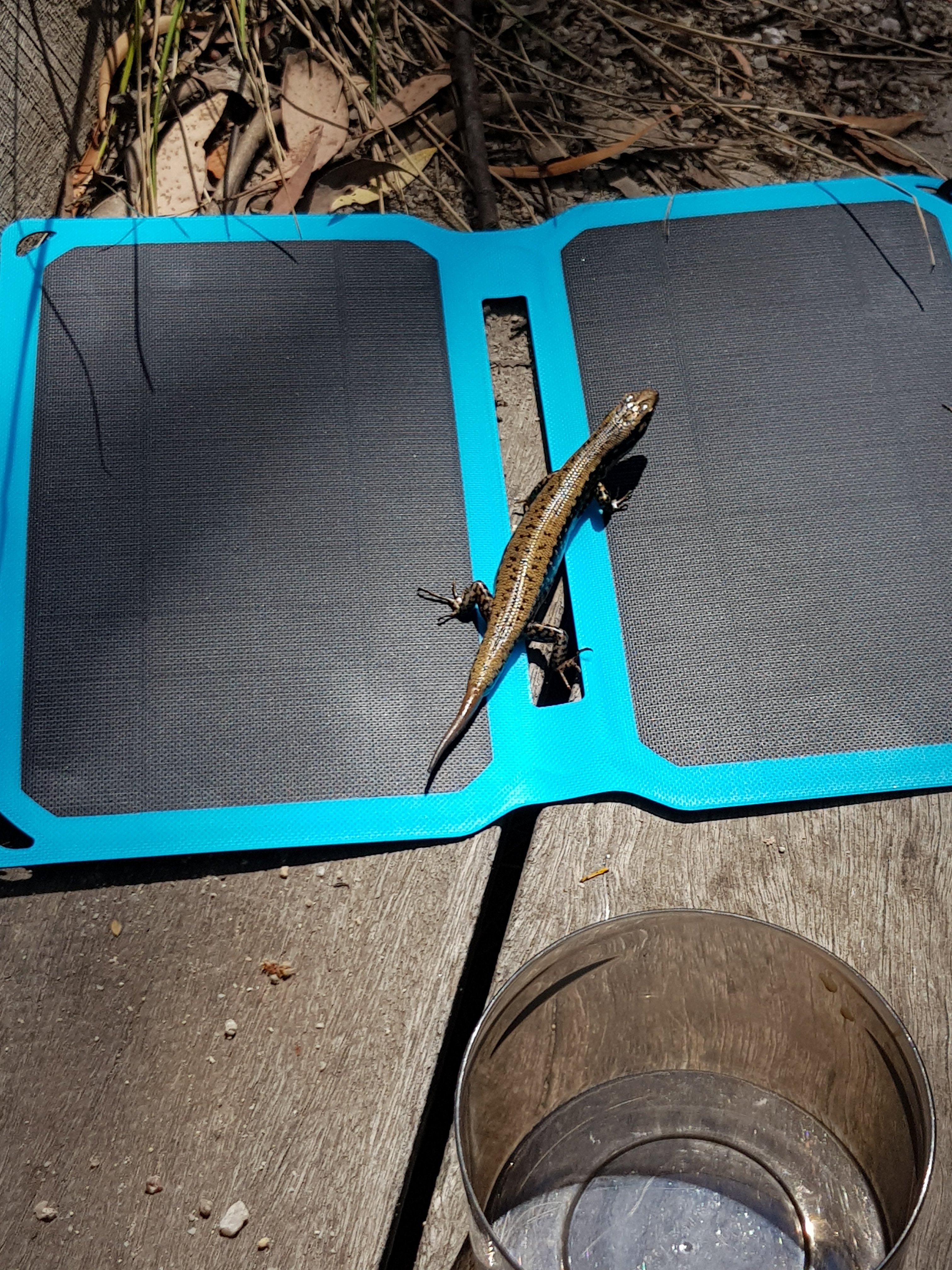 I came across the perfect lunch spot complete with wooden seats and even had some company from a grand daddy skink. He checked me out from few angles before plonking himself on my solar charger next to me on the bench! In the second photo below if you look closely you can see his little head over the left hand top of the chair and in the third photo you can see his head poking around the left side of the chair lower down right near my backpack.