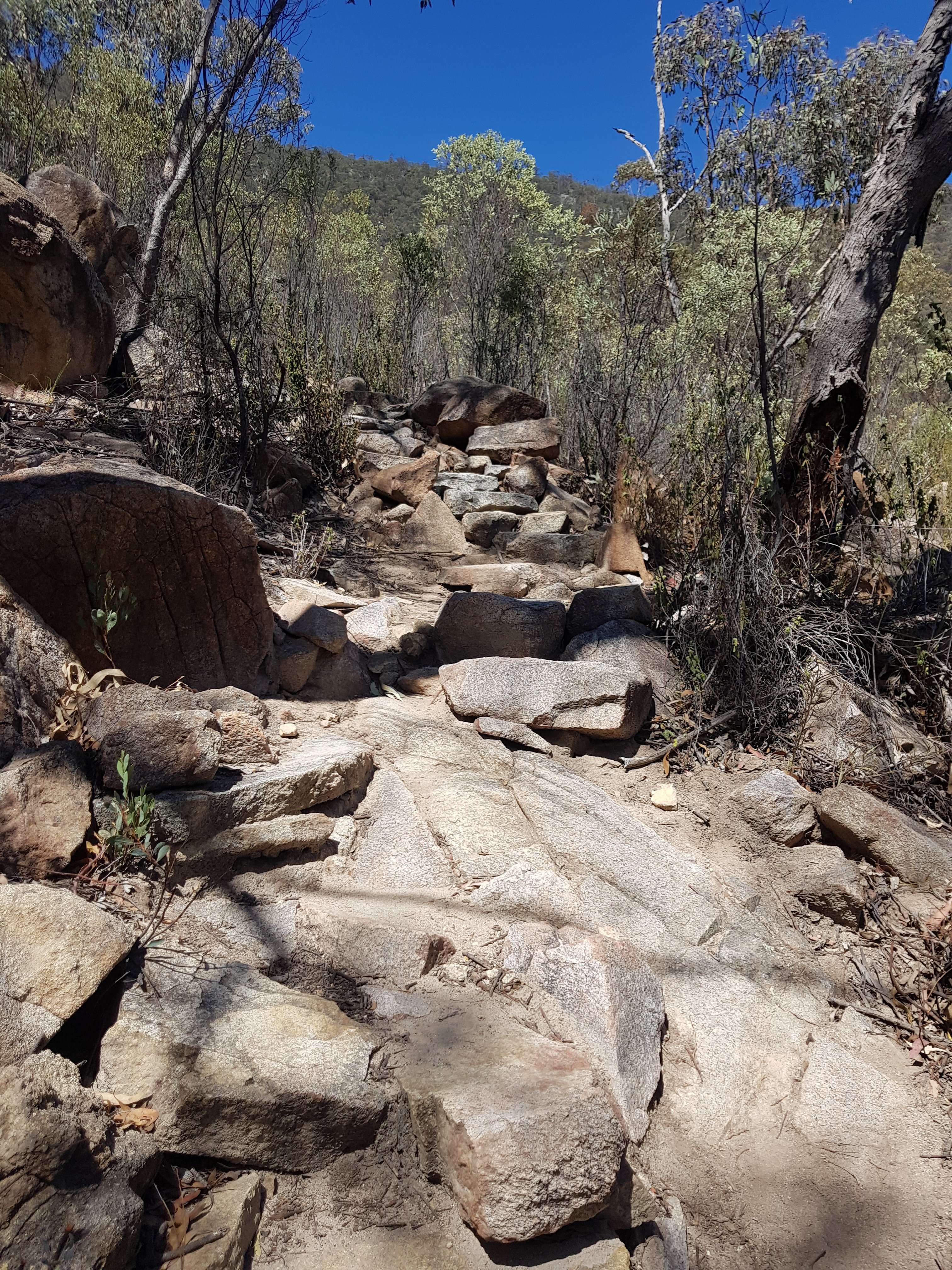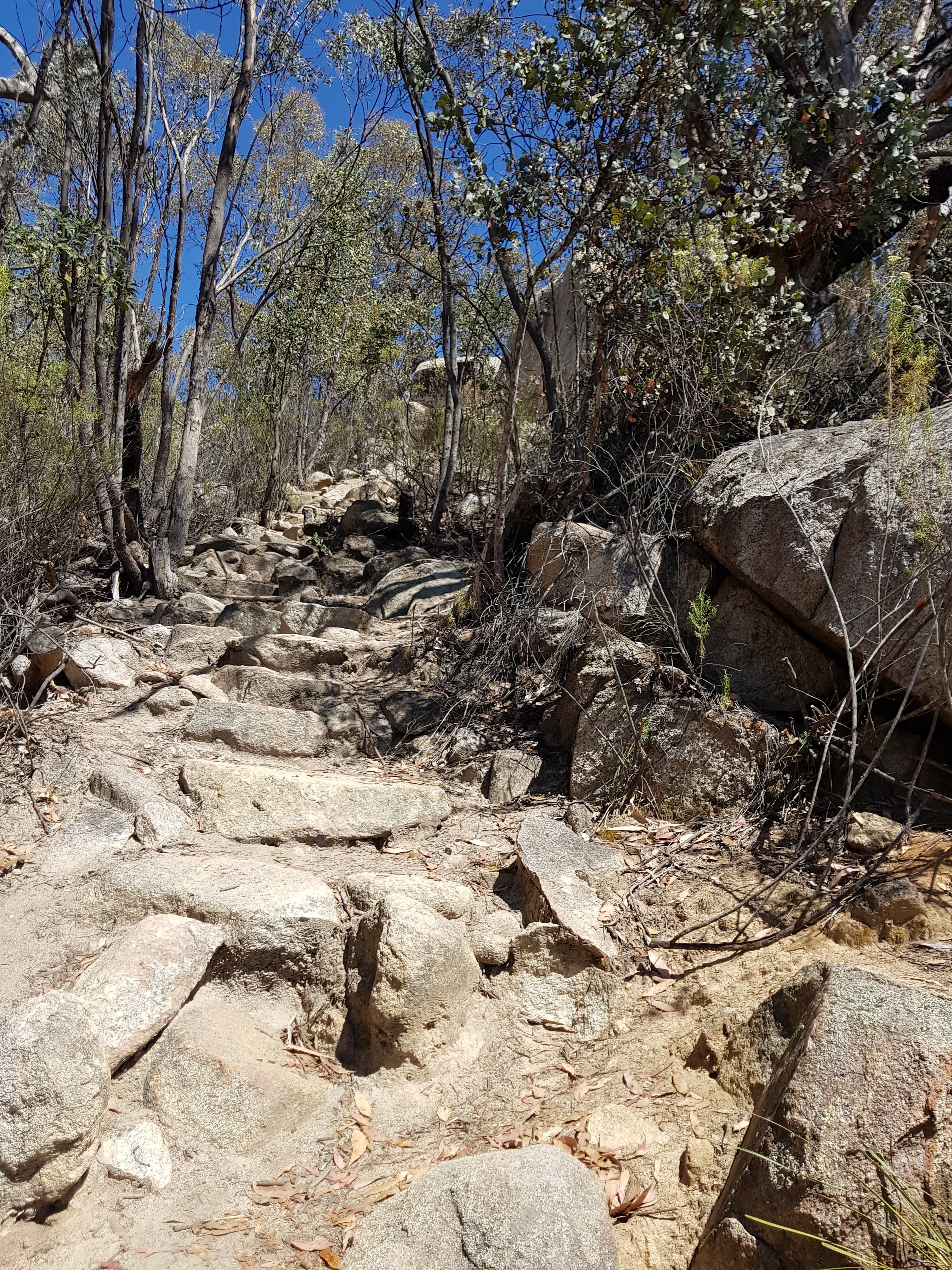 The gently undulating path did not last long. It soon turned to a fairly steep rocky steps ascent which seemed to go for a very long time – up about 500m. Maybe it was the heat or the steepness or maybe it was just day one but before long, l felt buggered! Nothing a vegan anzac bikkie (copyright Chef Jublé) couldn’t fix though.