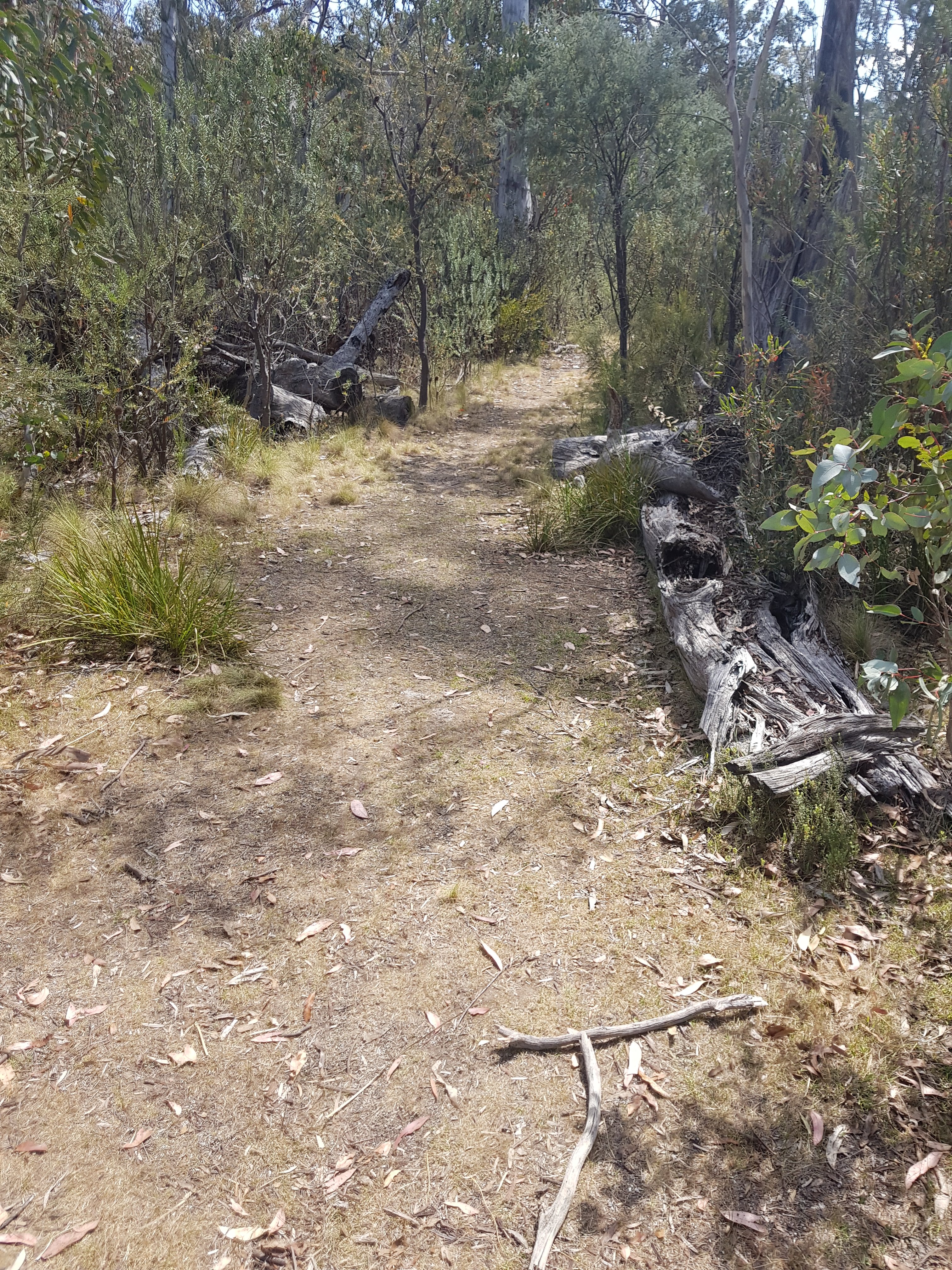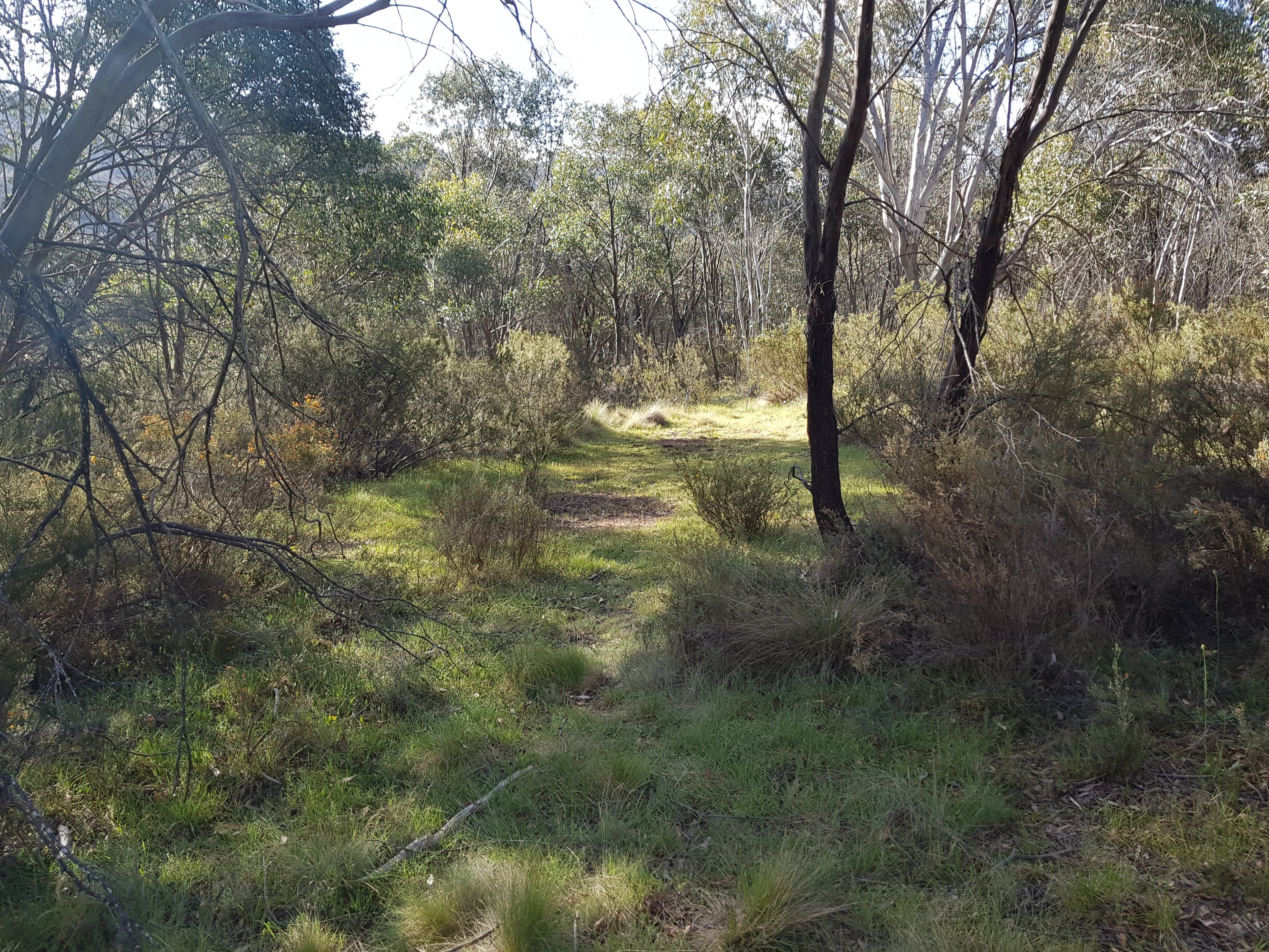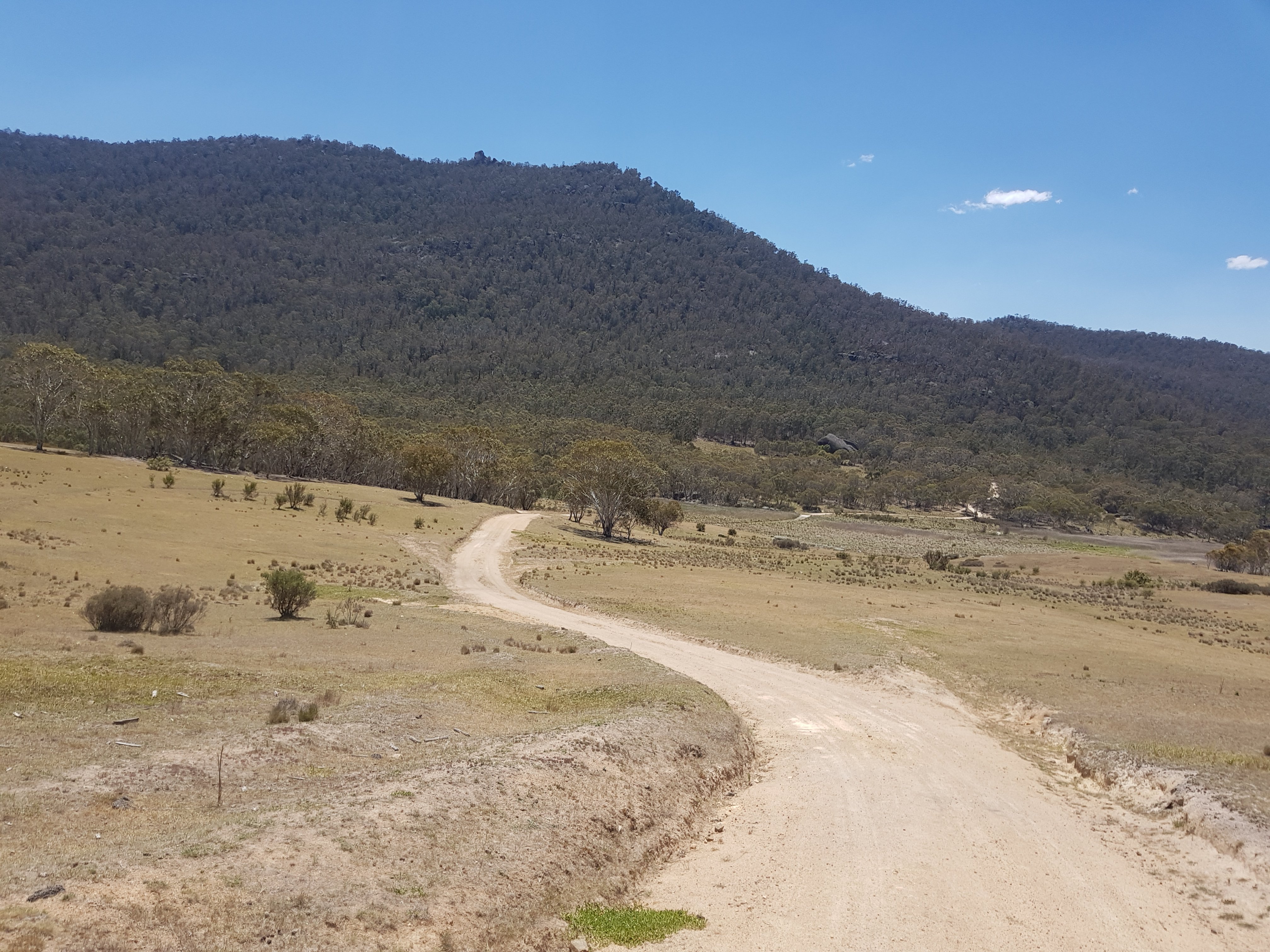 Soon after making it to the top of the hill, the trail left the gravel road and headed into Bimberi wilderness area on a bush track. I collected my first water from Sawpit Creek and was pretty chuffed with myself! It was a pretty small bit of water – I imagine there won’t be any left in another month or so. The track up to Cotter Gap was really lovely and super steep. I made it up by counting to 100 with my snake stick in one hand, then changing hands and starting the count again from 0. I understand why someone said the hills are a bit anticlimactic. At Cotter Gap which was the high point on today’s walk at just under 1400m, there was no amazing view and no mark that you were at “the top”. Just wandered along for awhile then proceeded down an equally steep hill on the other side.