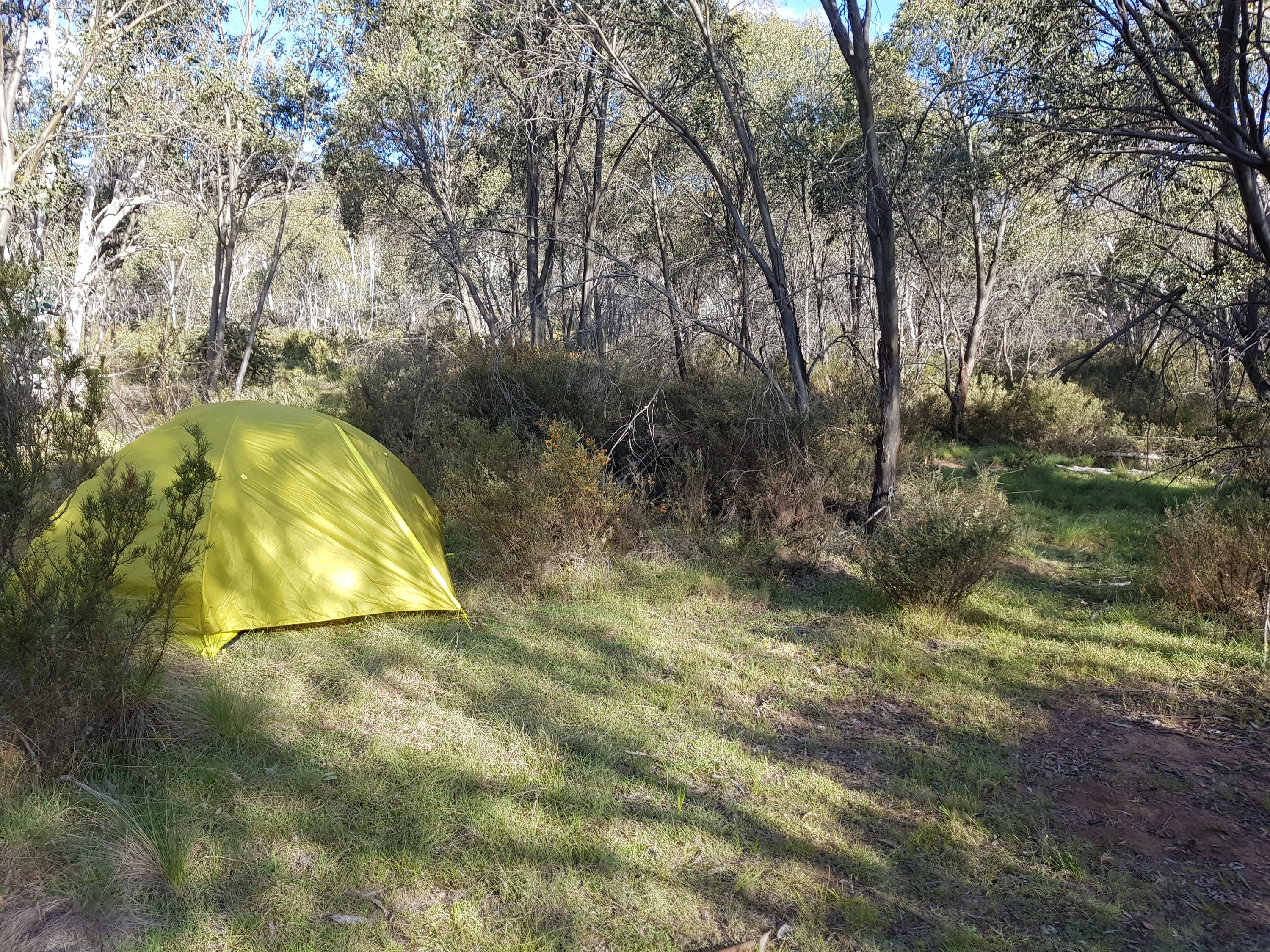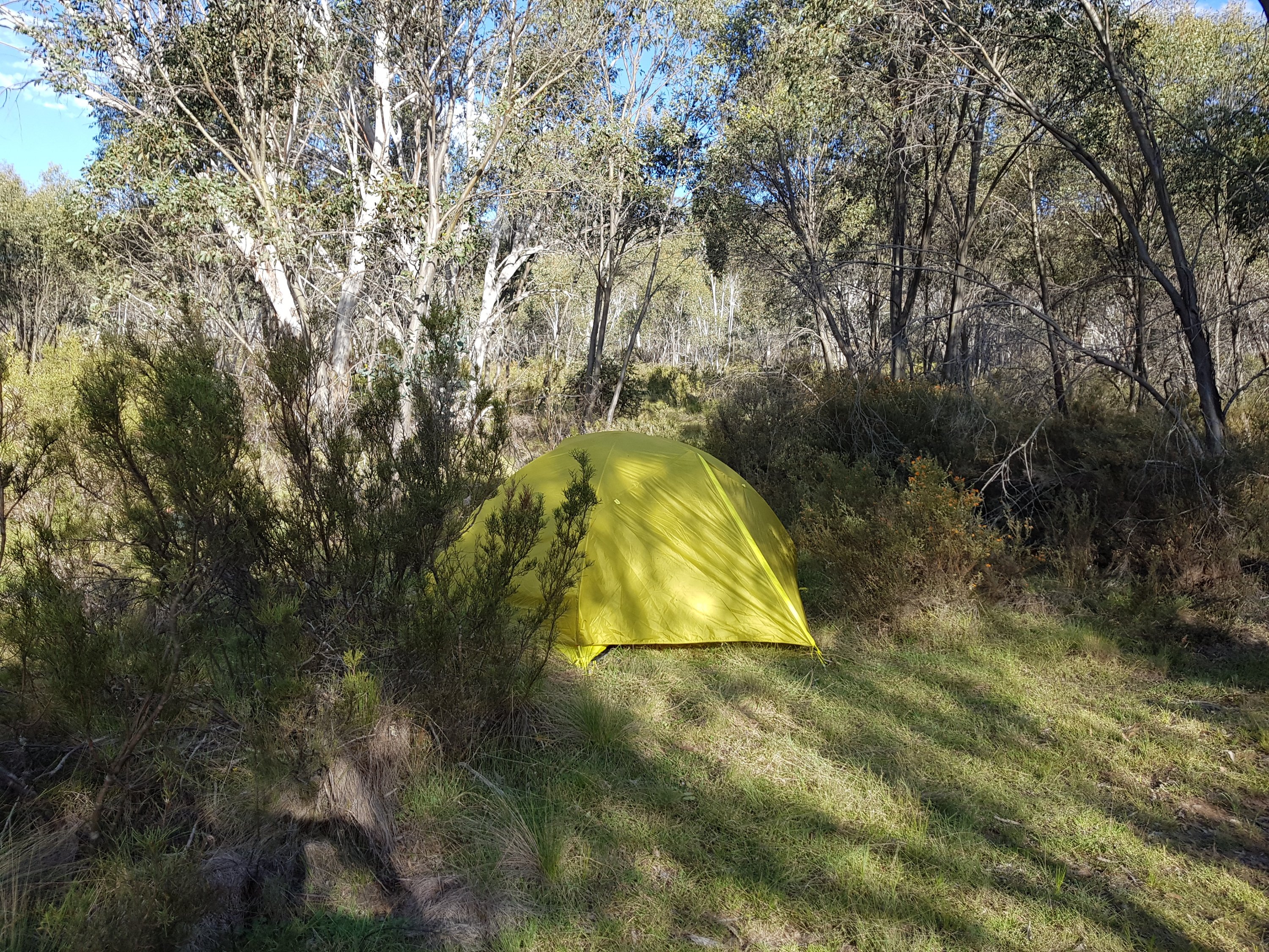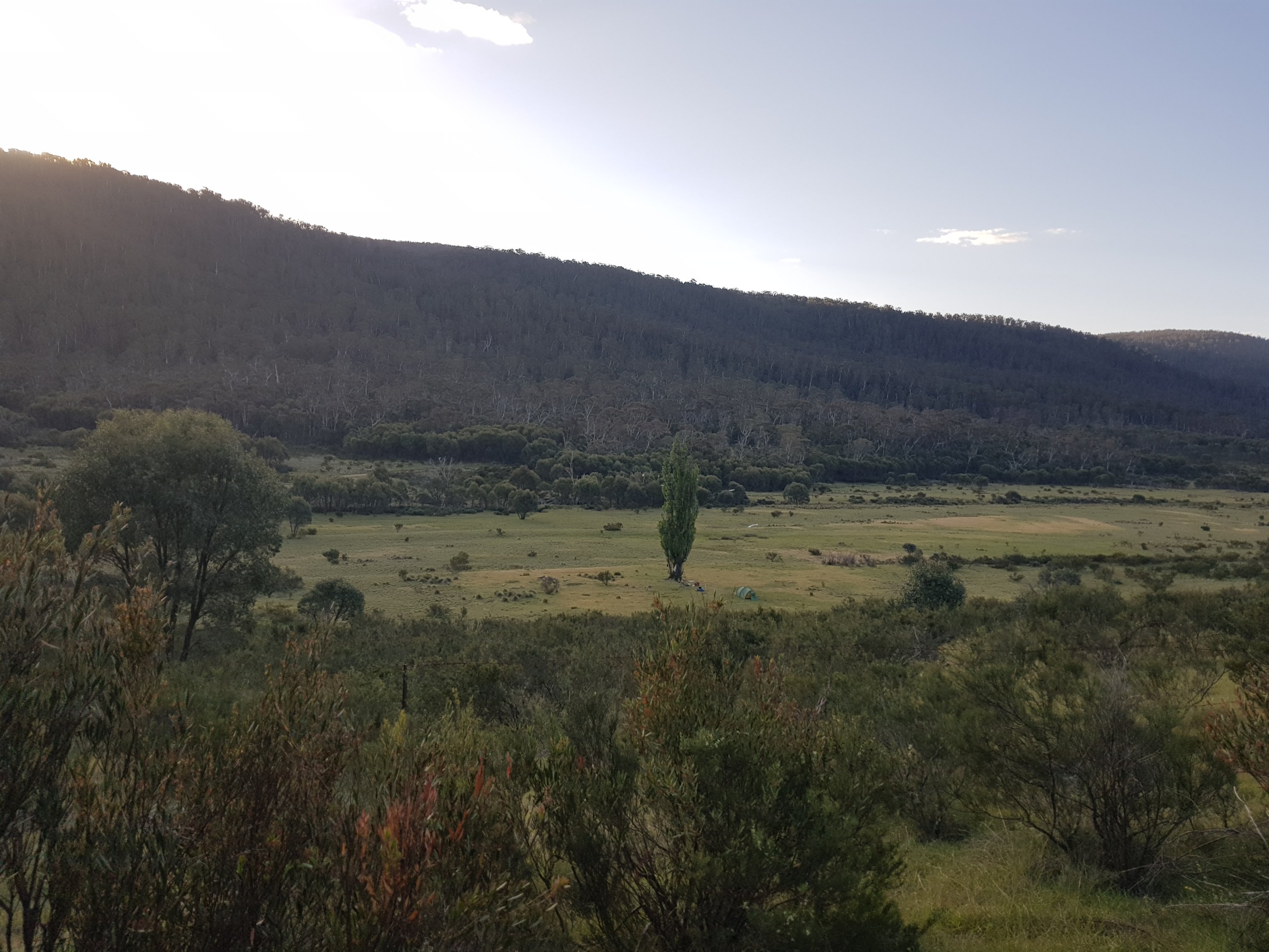 I came across a cat sunbaking on the path. It hadn’t seen me so I was able to take a snap before it did see me and hightail it off along the path. It was grey tabby, super fluffy and looked pretty well fed (unfortunately). Having never camped alone before, I was really hoping I’d find a good spot well before dark. I finally came across a great little patch off the track and decided to stop there, pitch my tent, then walk the extra 0.5kms to get water. I set up my tent then went off for water. I climbed a hill and saw laid out before me the amazing flats. I hadn’t known what to expect, so didn’t realise I’d actually pitched my tent about 300m too soon! Chatted to a guy who’s mountain biking up Mt Bimberi then collected water at Cotter River. How fantastic. Clean, fast flowing although not too deep with stones to stand on. For dinner l ate two sachets of Indian food – chana marsala and veggie biryani. Turns out, that’s way too much food for one person, even if she is hungry. I did some bush yoga before tucking myself into my tent nest. Lucky we got a two person tent bc the whole other side has the complete insides of my pack sprawled across it! The night was so quiet. The only thing l heard were a few kangaroos hopping nearby and the occasional insect. No wind, no people, no water.