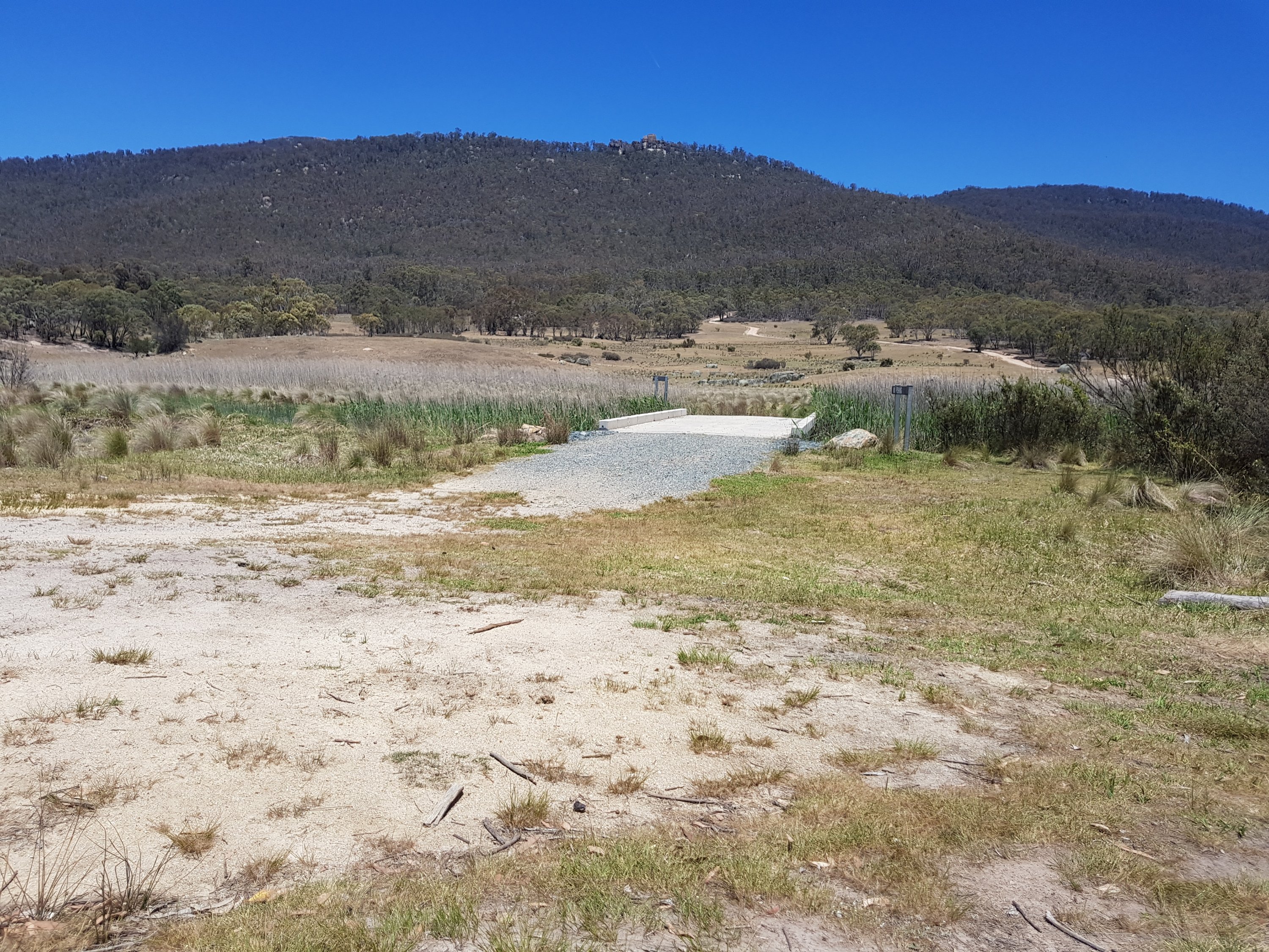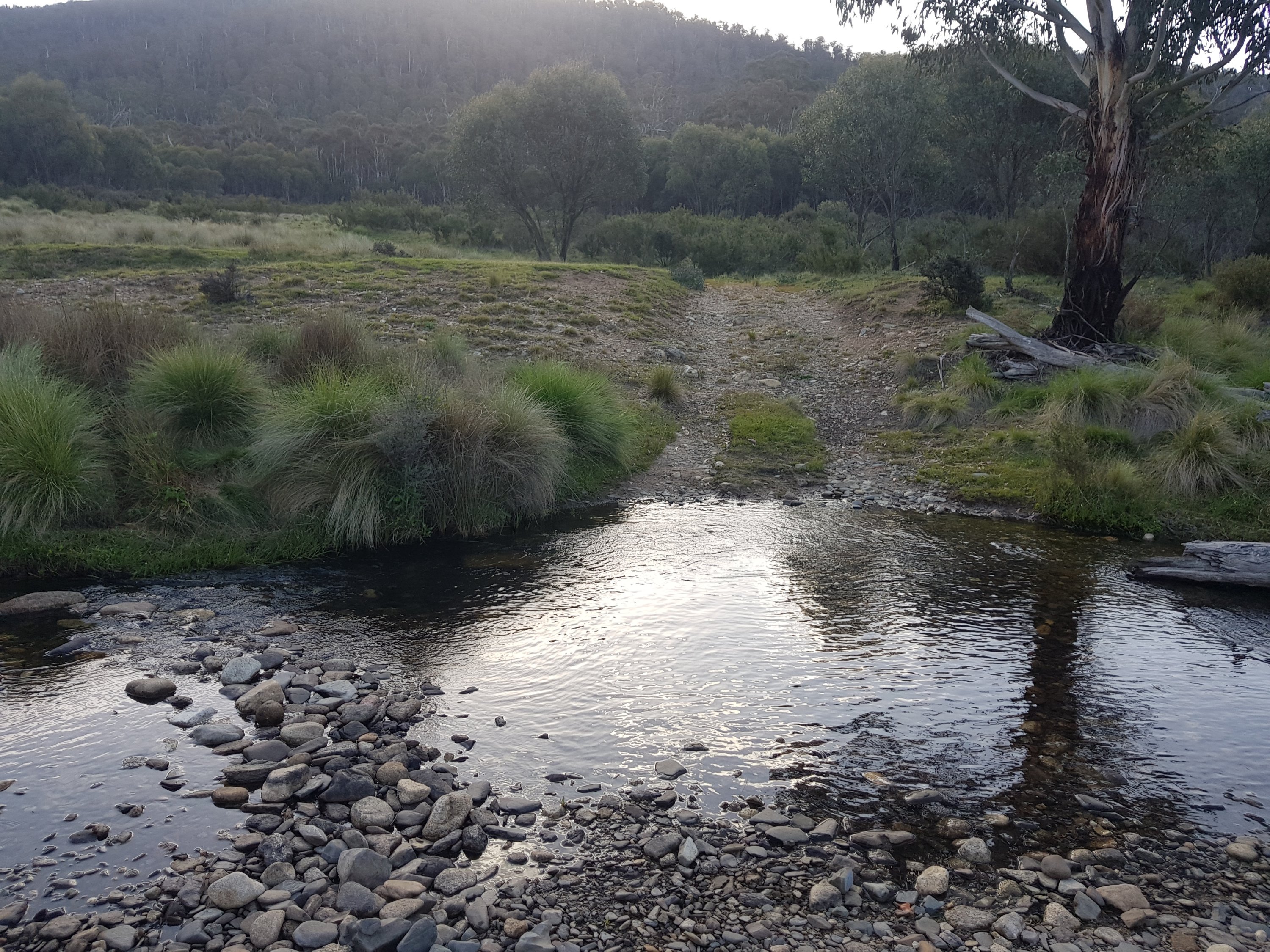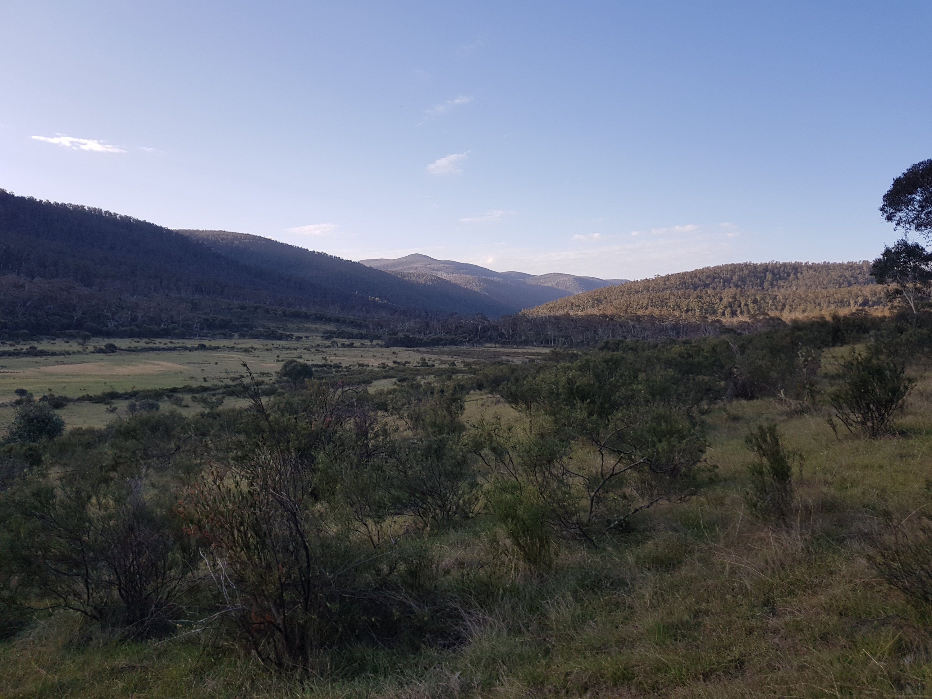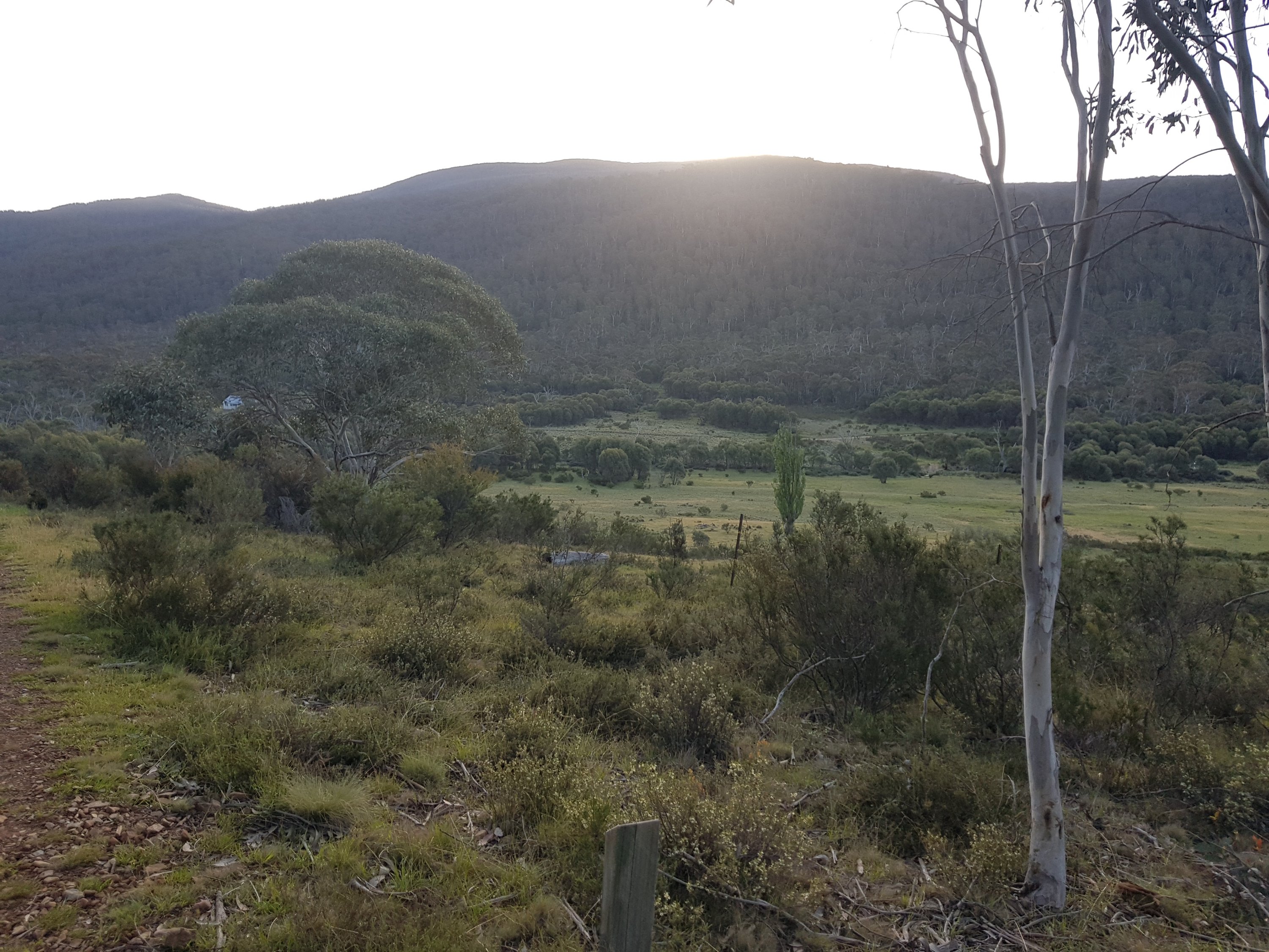 I came across a cat sunbaking on the path. It hadn’t seen me so I was able to take a snap before it did see me and hightail it off along the path. It was grey tabby, super fluffy and looked pretty well fed (unfortunately). Having never camped alone before, I was really hoping I’d find a good spot well before dark. I finally came across a great little patch off the track and decided to stop there, pitch my tent, then walk the extra 0.5kms to get water. I set up my tent then went off for water. I climbed a hill and saw laid out before me the amazing flats. I hadn’t known what to expect, so didn’t realise I’d actually pitched my tent about 300m too soon! Chatted to a guy who’s mountain biking up Mt Bimberi then collected water at Cotter River. How fantastic. Clean, fast flowing although not too deep with stones to stand on. For dinner l ate two sachets of Indian food – chana marsala and veggie biryani. Turns out, that’s way too much food for one person, even if she is hungry. I did some bush yoga before tucking myself into my tent nest. Lucky we got a two person tent bc the whole other side has the complete insides of my pack sprawled across it! The night was so quiet. The only thing l heard were a few kangaroos hopping nearby and the occasional insect. No wind, no people, no water.