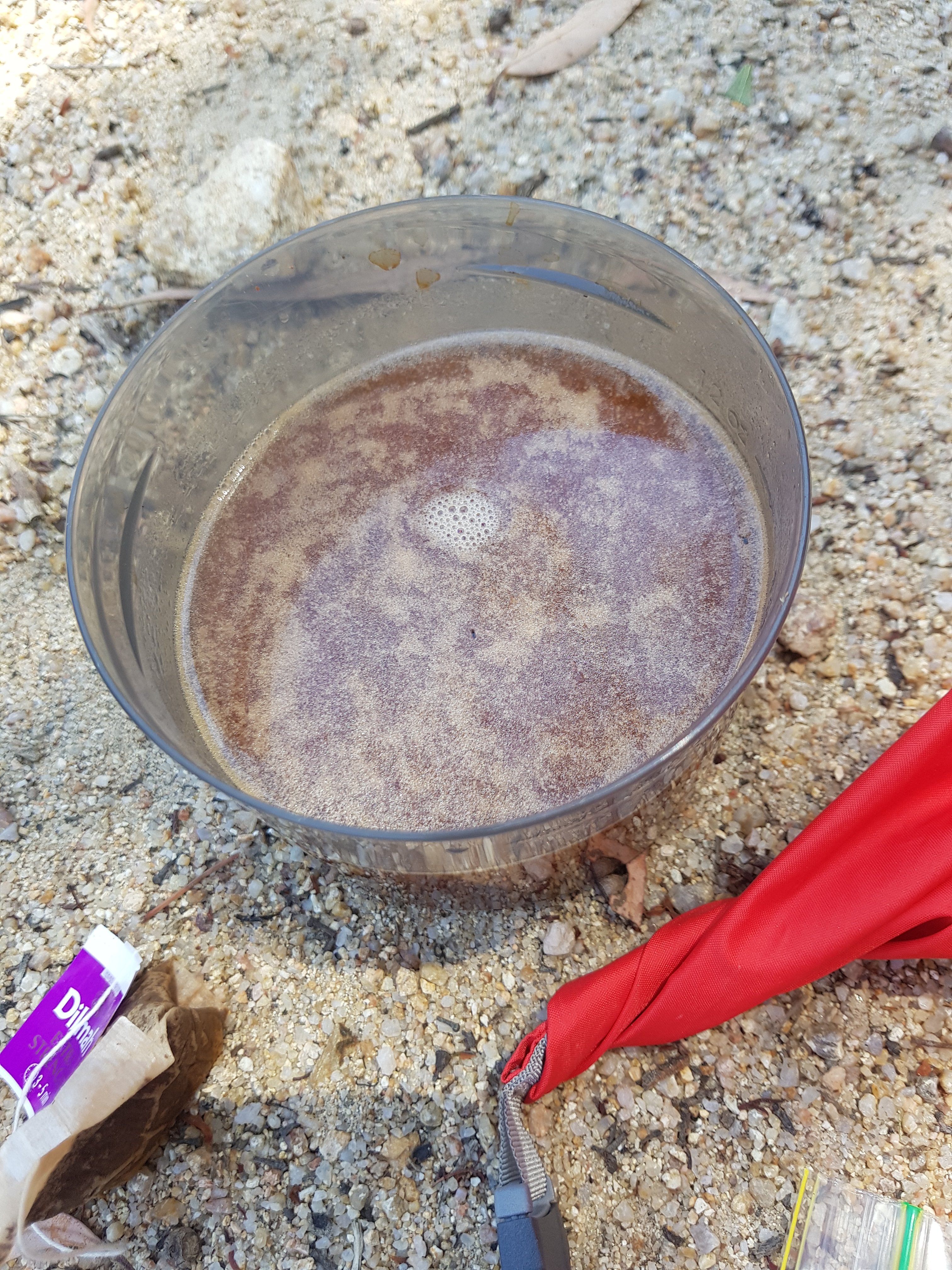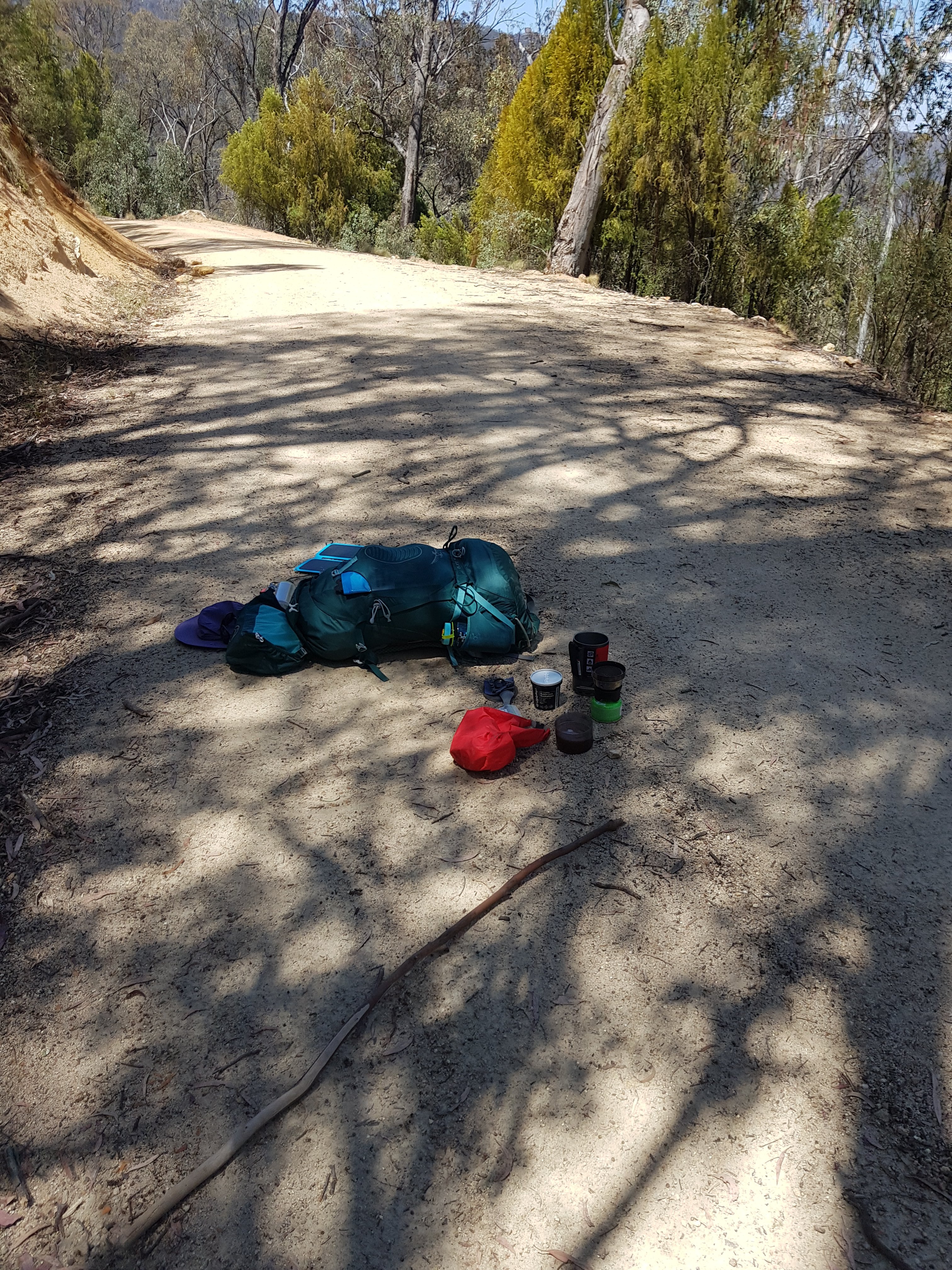 What a difference an extra 8-10kgs makes! About an hour in, my shoulders were sore (this is just sensation l told myself) but it’s funny how when you just keep going and think about other things the sensations change and move on. I had my Anzac bikkie sitting at Orroral River – not what I’d expected but a gorgeous view to look at from a shady spot. And thankfully, no shoes off river crossing! Orroral River was followed by my first large plain. There were mountains on all sides but not too close, maintaining a feeling of open and space. Loads of kangaroos all terrified of me. The first half of the day was all gravel roads which I quite enjoyed at first but by the time they turned to bush track l was pretty happy to see the end of them. There was a massive uphill slog along a gravel road to get from Namadgi National Park to the Bimberi wilderness area. I had been battling uphill for a couple of hours and decided to stop for lunch on the road. There were no particularly lunch worthy places, so I just sat on the road. Of course that’s when a group of teenagers came past after having spent a couple of nights camping at Cotter Flat. They probably thought I’d picked a pretty odd spot for lunch. Same as the firies who drove up and pulled up next to me checking that l was ok. I was pretty happy when one of them remarked how hot the day was for me to be doing this walk – l hadn’t even realised that’s probably why l was feeling stuffed!! I’m also entering the competition for worst looking cup of tea.