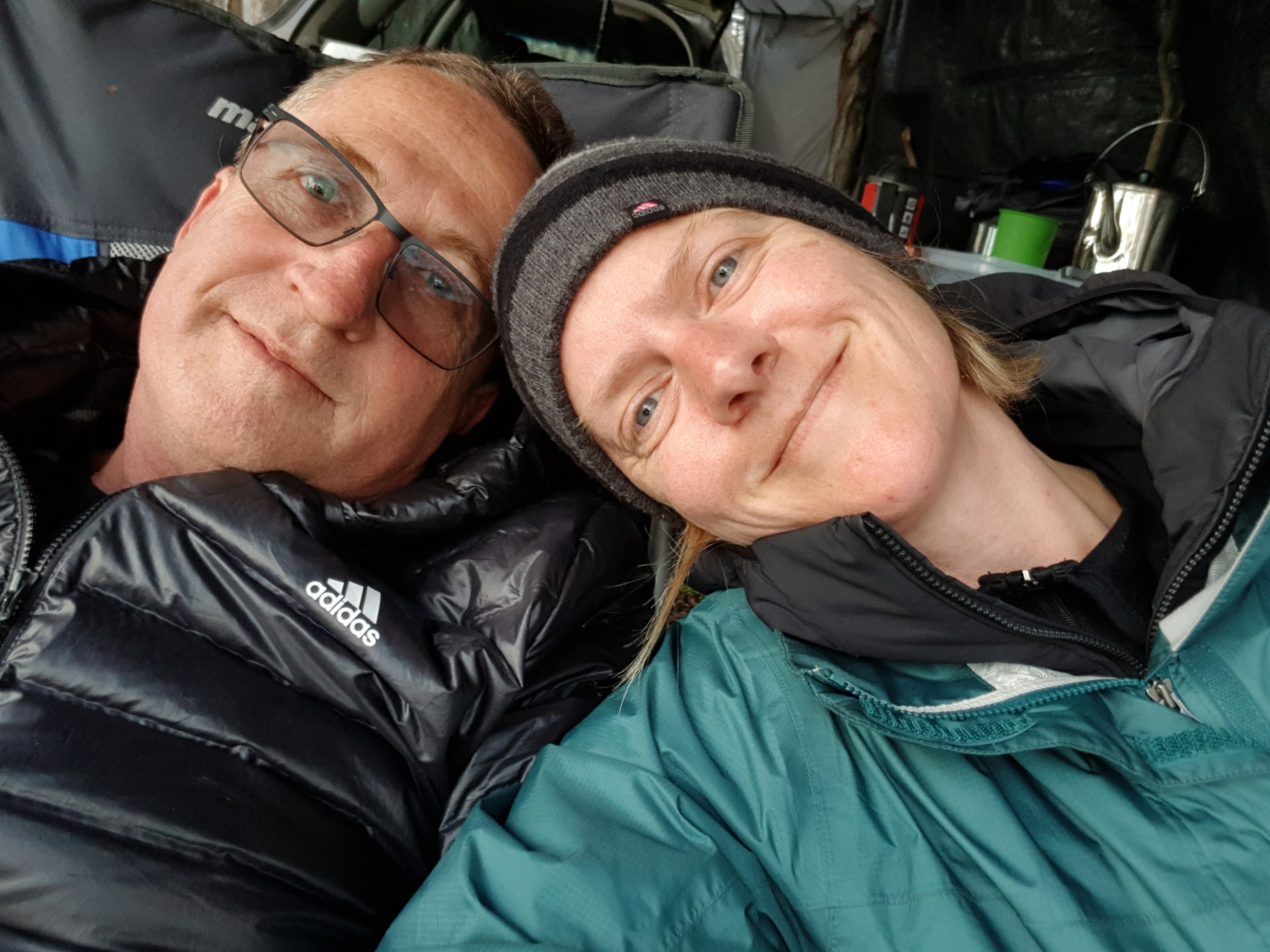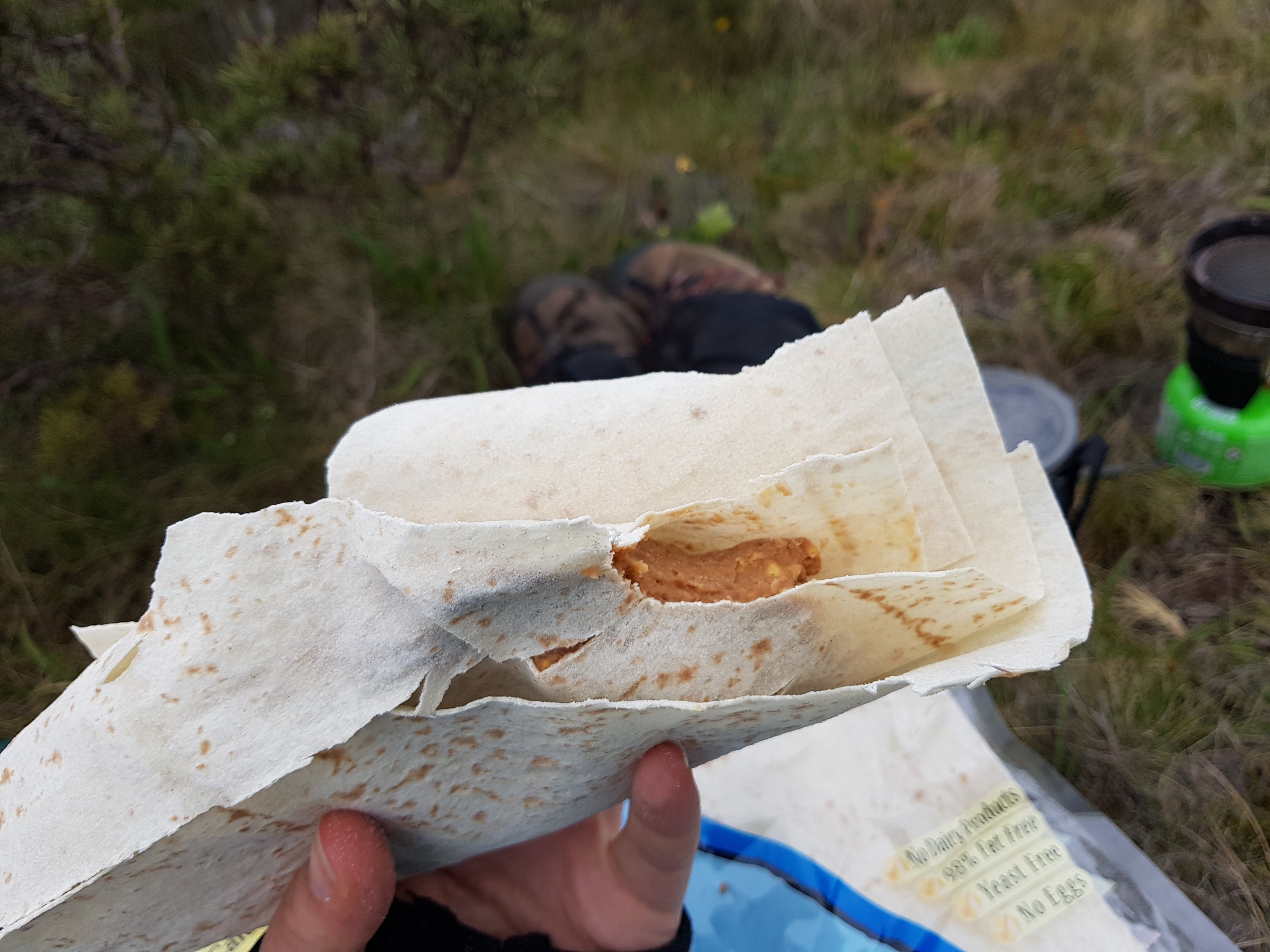 I stopped for lunch beside some low shrubs for a bit of shelter. It’s amazing how much such tiny plants cut out the wind! Lunch was refried beans mixed with hommus both dehydrated at home and rehydrated on the trail with my little stove. Followed by a cup of tea with some almond cream for “milk” and some dehydrated mango. Delicious!