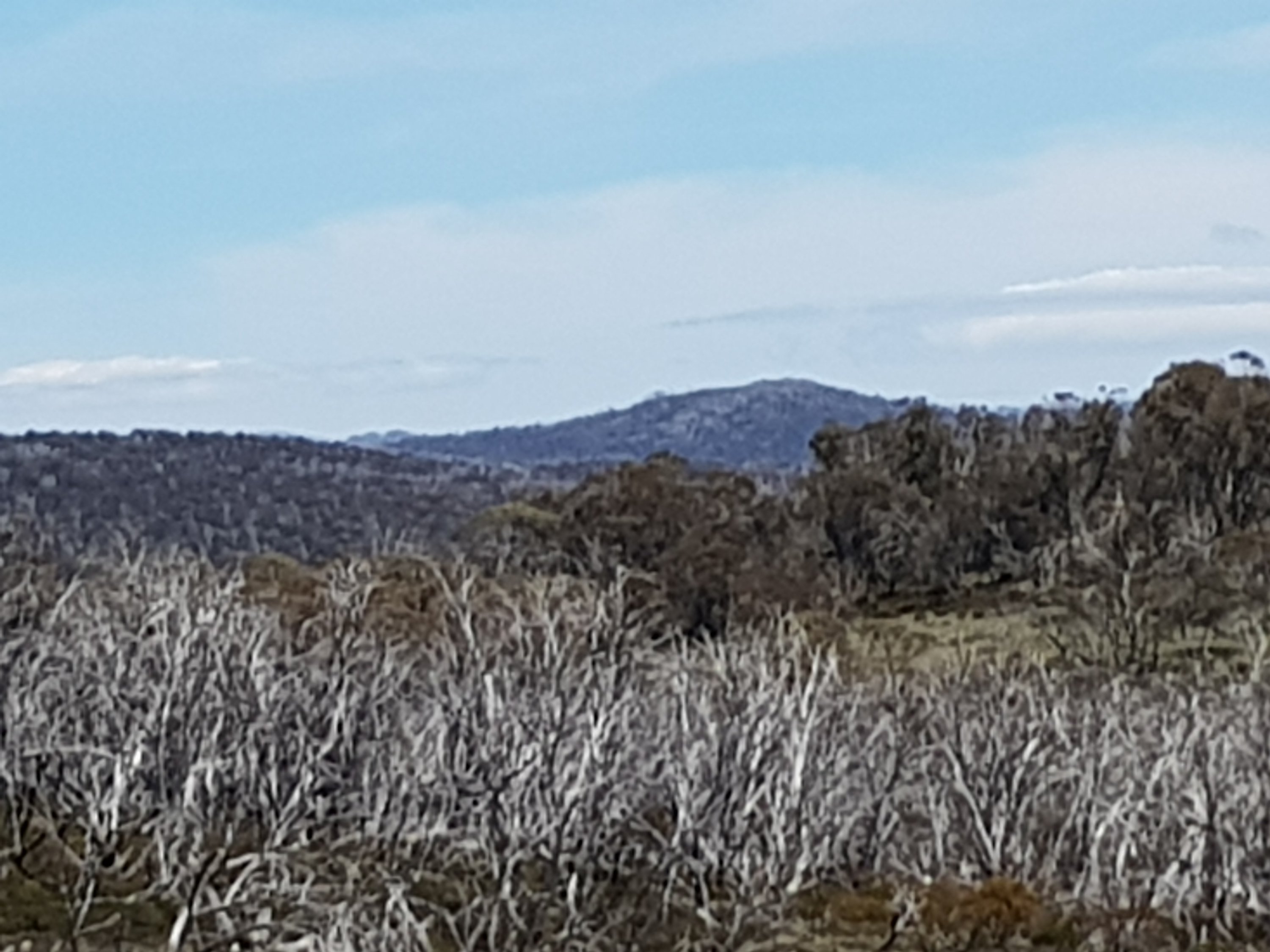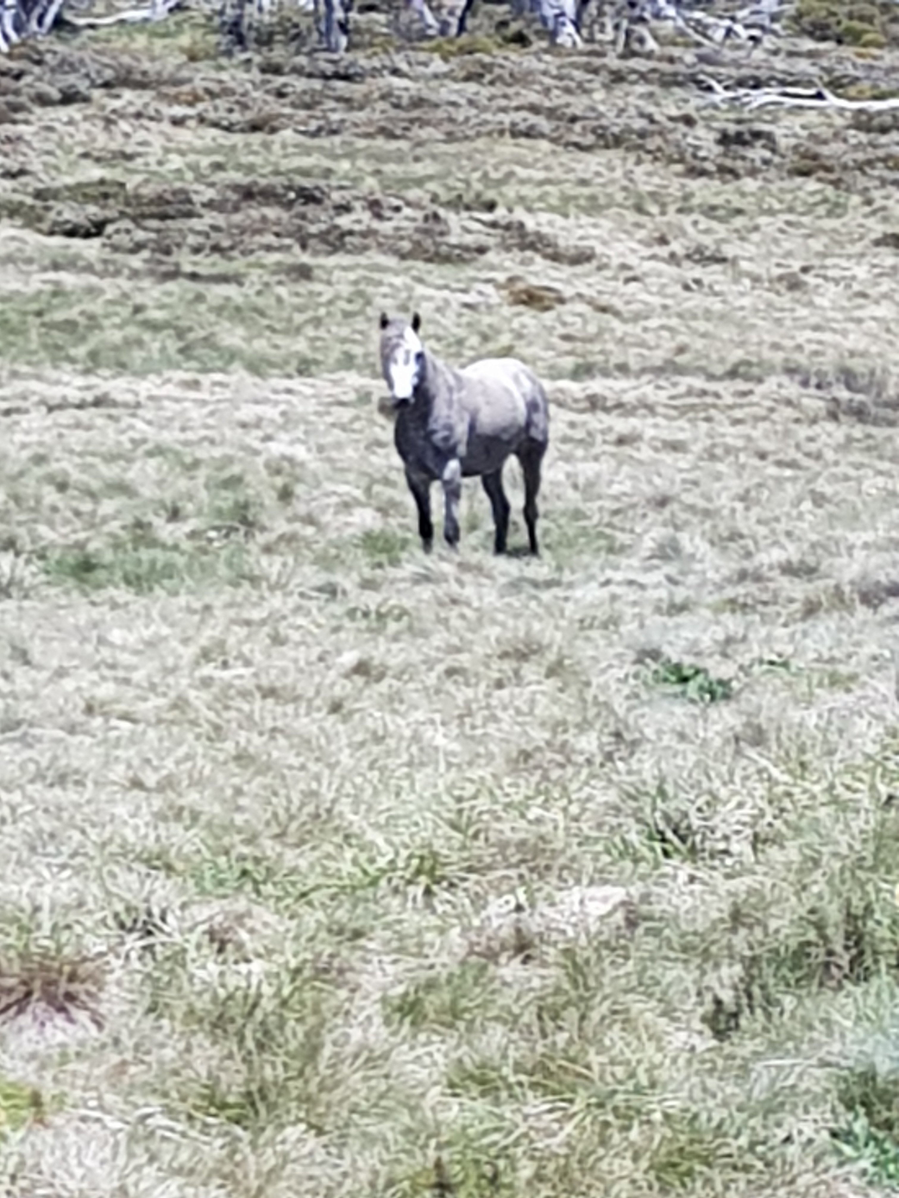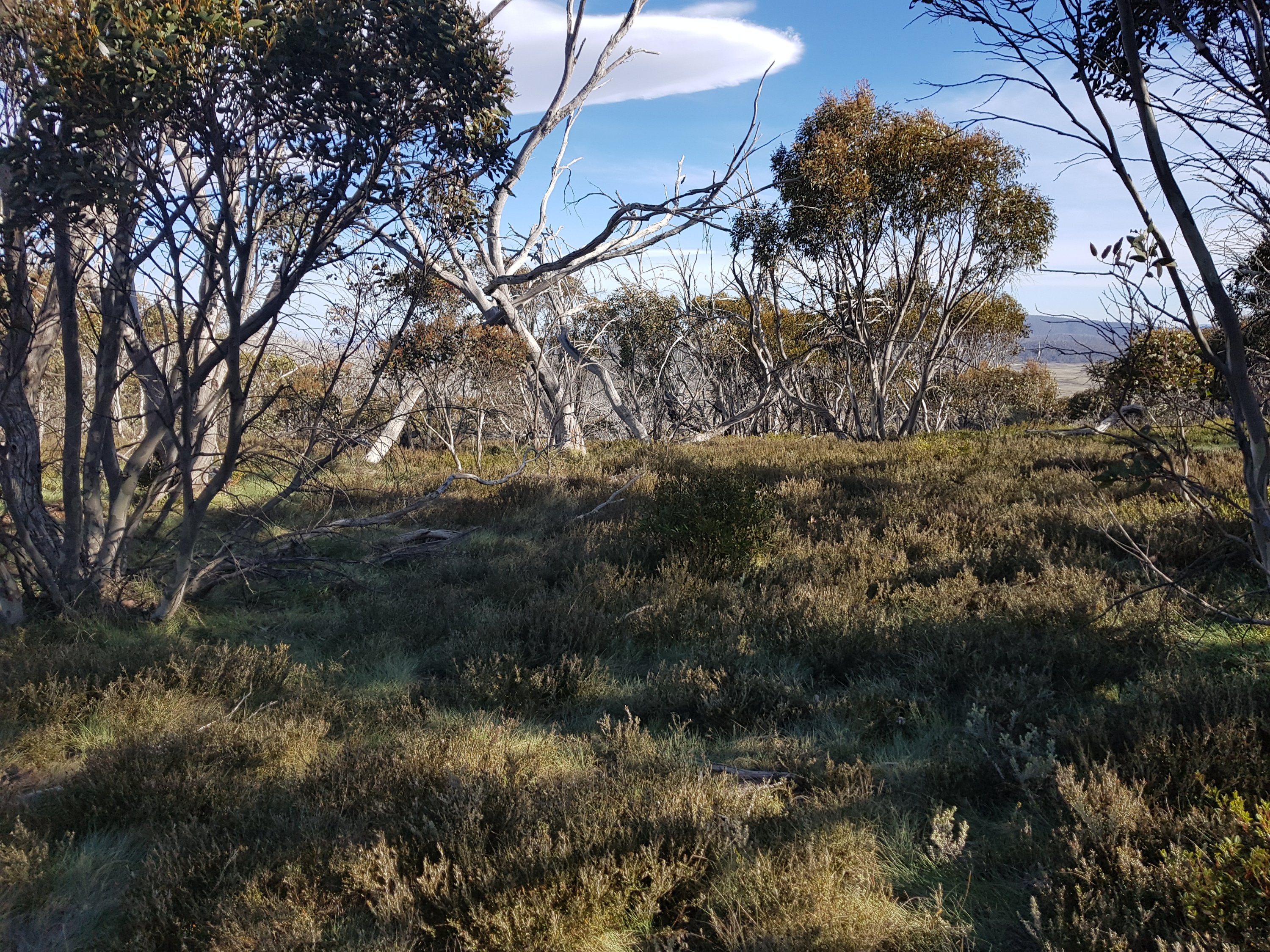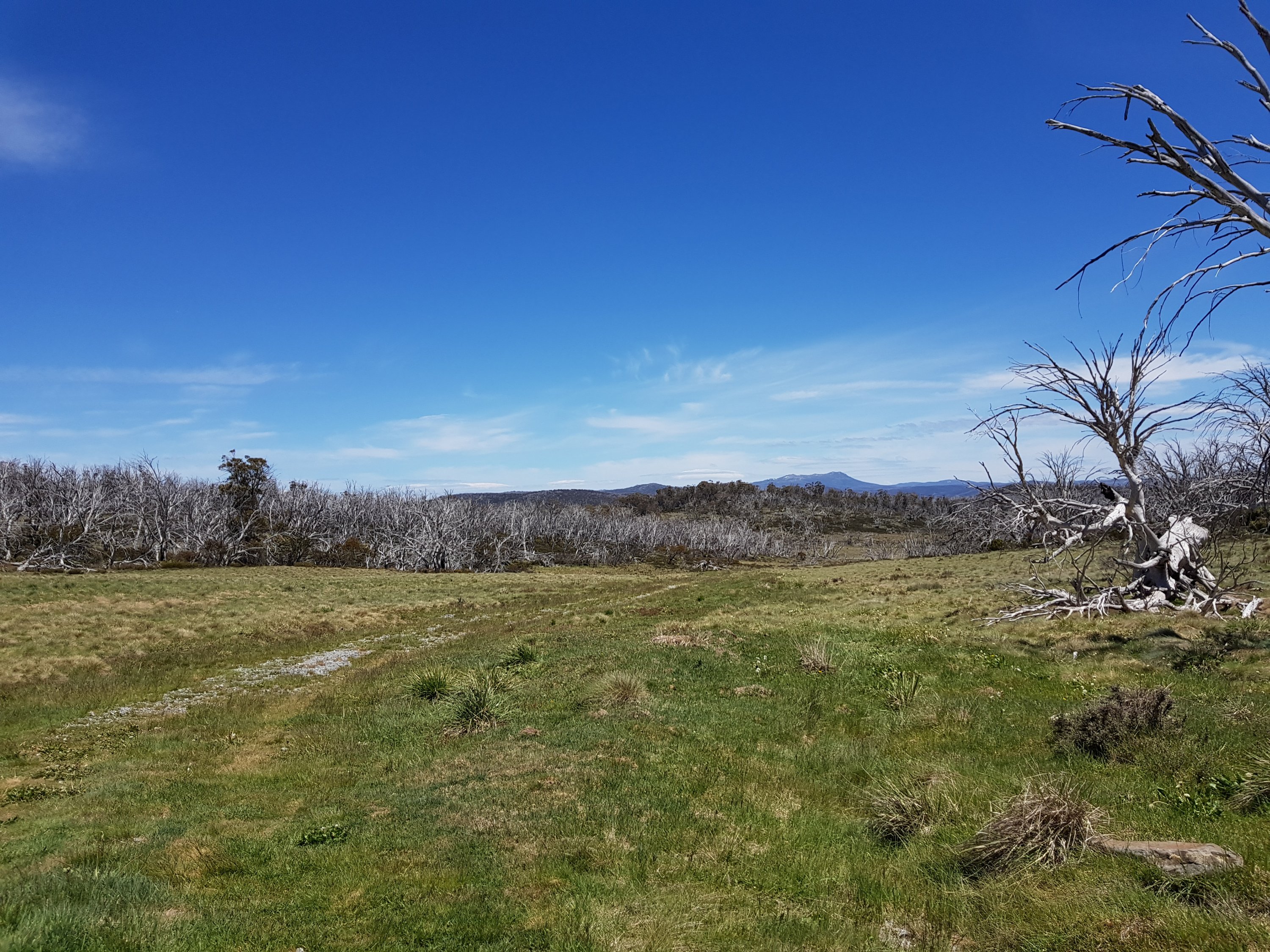 Shortly after leaving Four Mile Hut, I saw my first snake! I think it must have been trying to warm up on the path and I scared it before I saw it. It was small and brownish green coloured. Luckily for me, it got off the path super quickly. Unfortunately for you, that means no photo. But I did take a photo of the bush it crawled into. I got my first glimpse of what l think might be Mt Kosciuszko! Super exciting! [Comment after the fact – I don’t think this really was Mt Kosciuszko because there was too much snow on top!]. I came across a small group of brumbies right on my trail. By now, I know how this thing works. You get close, they run and that’s the end. But not this time. They didn’t know they were supposed to run. I got closer and closer and they were all very dismissive of me. There was a big one sitting down amongst the grass who finally stood up as I got pretty close. He did that head down dominant thing and I was worried he was going to charge me or something. I realised he was probably a lone male hanging near the group because there was another male in the group. None of them cared about me at all!