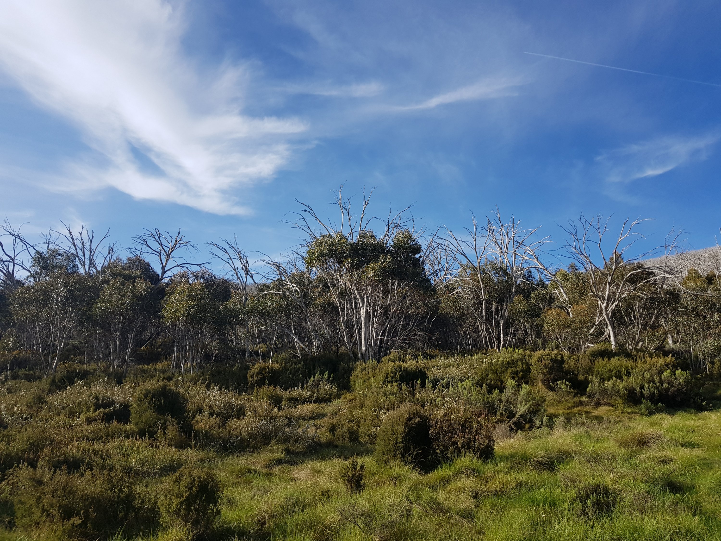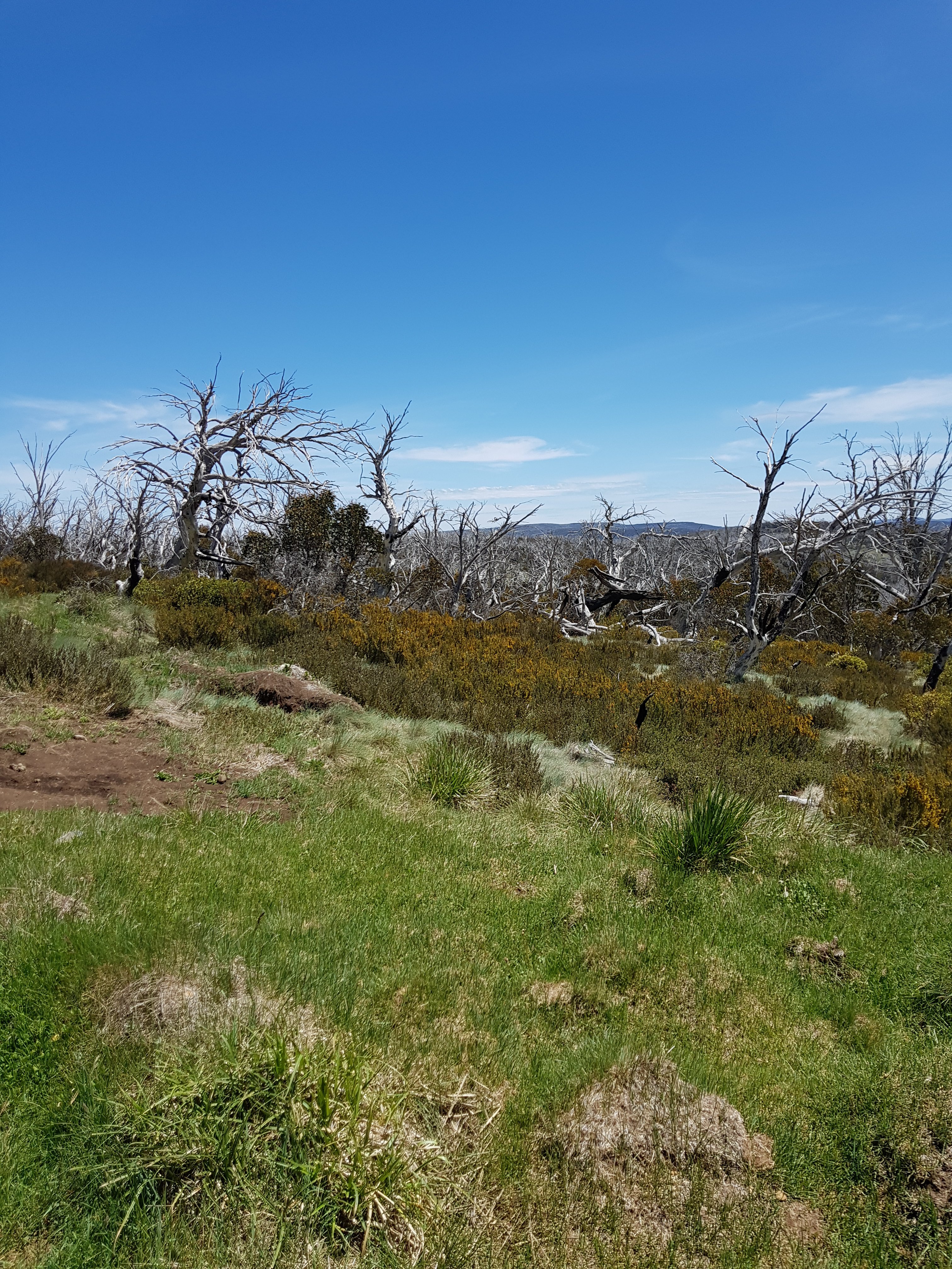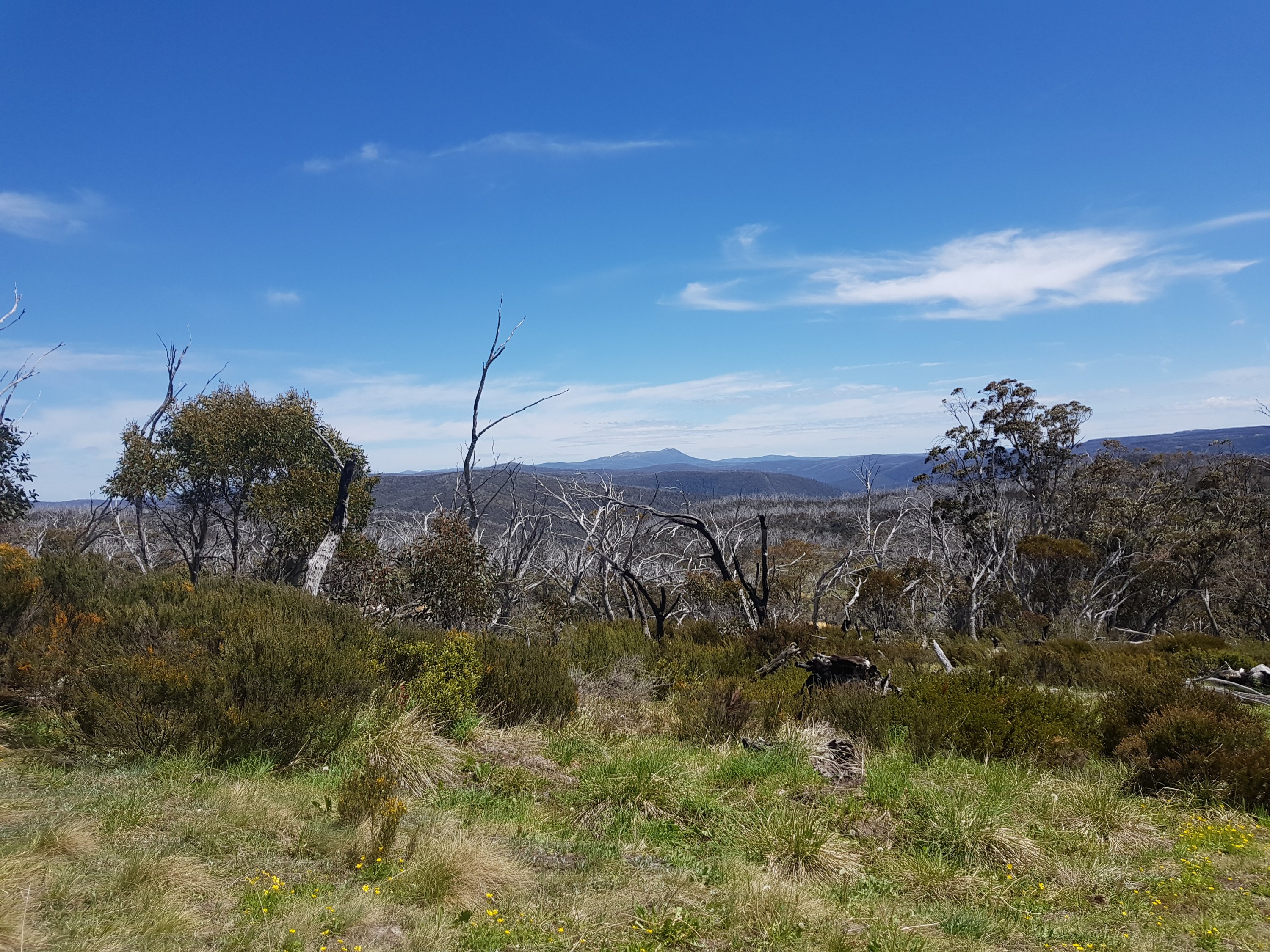 Shortly after leaving Four Mile Hut, I saw my first snake! I think it must have been trying to warm up on the path and I scared it before I saw it. It was small and brownish green coloured. Luckily for me, it got off the path super quickly. Unfortunately for you, that means no photo. But I did take a photo of the bush it crawled into. I got my first glimpse of what l think might be Mt Kosciuszko! Super exciting! [Comment after the fact – I don’t think this really was Mt Kosciuszko because there was too much snow on top!]. I came across a small group of brumbies right on my trail. By now, I know how this thing works. You get close, they run and that’s the end. But not this time. They didn’t know they were supposed to run. I got closer and closer and they were all very dismissive of me. There was a big one sitting down amongst the grass who finally stood up as I got pretty close. He did that head down dominant thing and I was worried he was going to charge me or something. I realised he was probably a lone male hanging near the group because there was another male in the group. None of them cared about me at all!
