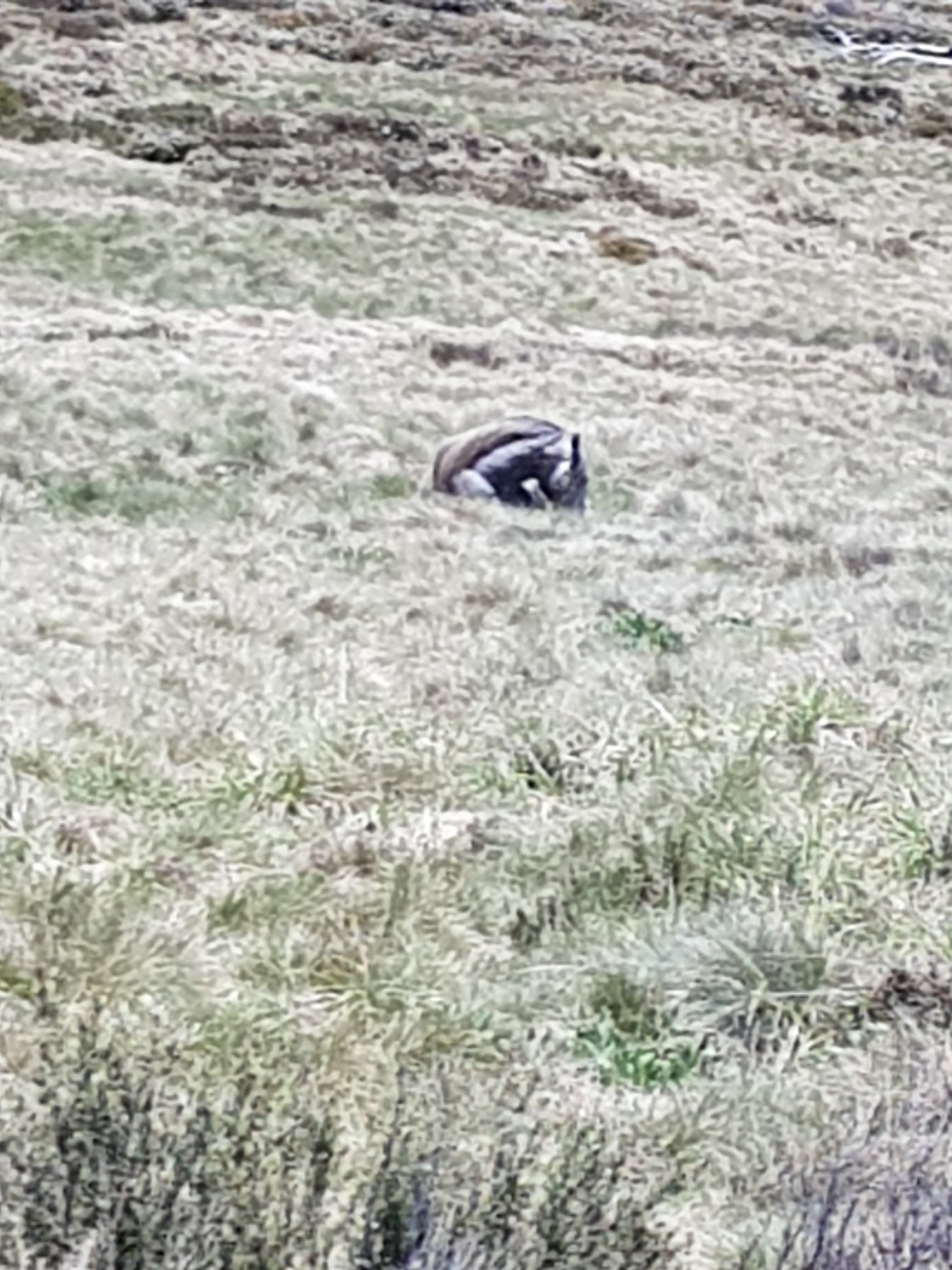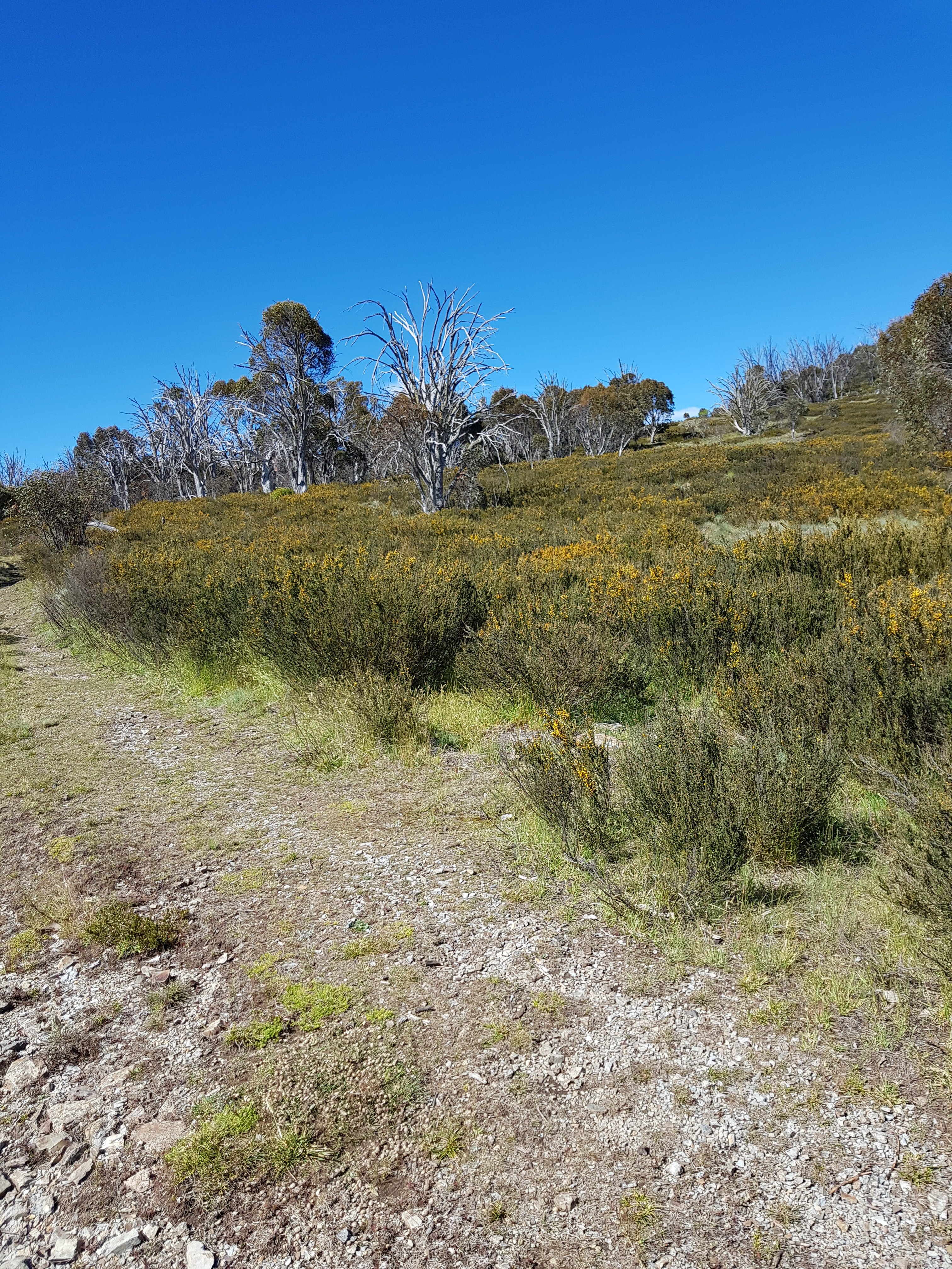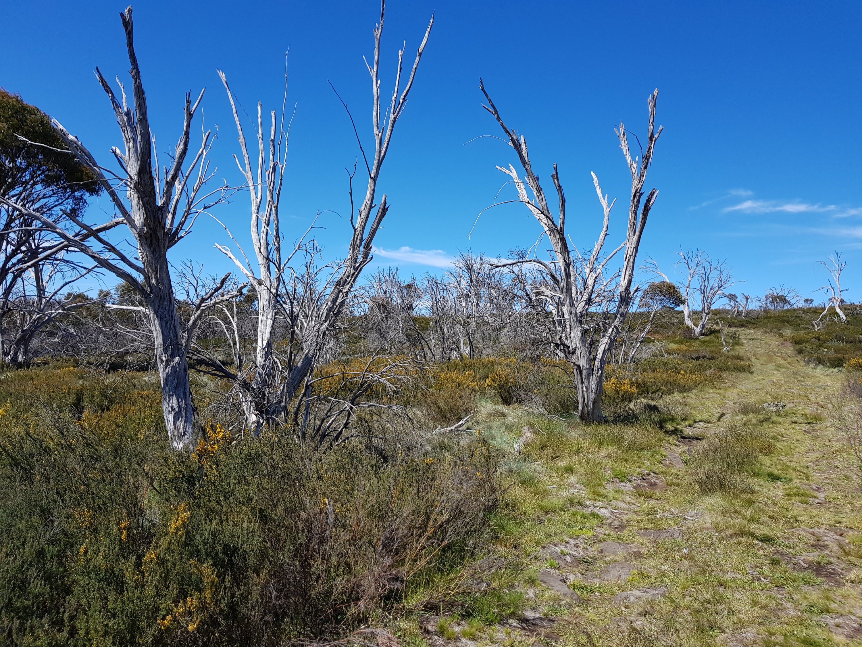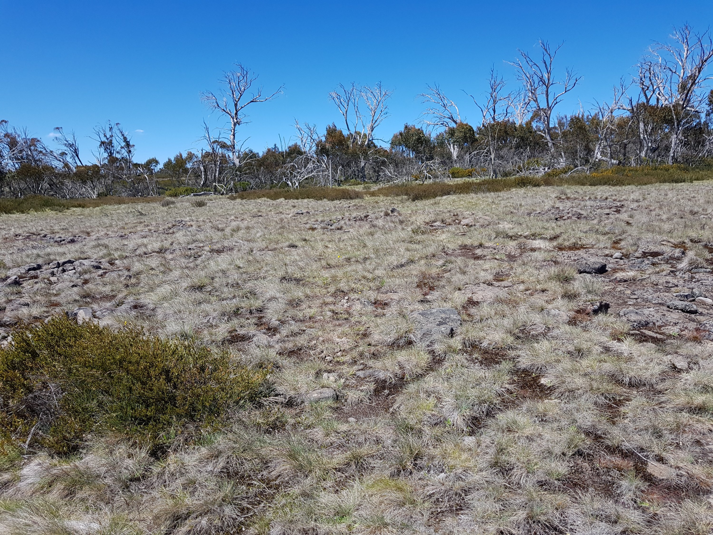 Shortly after leaving Four Mile Hut, I saw my first snake! I think it must have been trying to warm up on the path and I scared it before I saw it. It was small and brownish green coloured. Luckily for me, it got off the path super quickly. Unfortunately for you, that means no photo. But I did take a photo of the bush it crawled into. I got my first glimpse of what l think might be Mt Kosciuszko! Super exciting! [Comment after the fact – I don’t think this really was Mt Kosciuszko because there was too much snow on top!]. I came across a small group of brumbies right on my trail. By now, I know how this thing works. You get close, they run and that’s the end. But not this time. They didn’t know they were supposed to run. I got closer and closer and they were all very dismissive of me. There was a big one sitting down amongst the grass who finally stood up as I got pretty close. He did that head down dominant thing and I was worried he was going to charge me or something. I realised he was probably a lone male hanging near the group because there was another male in the group. None of them cared about me at all!