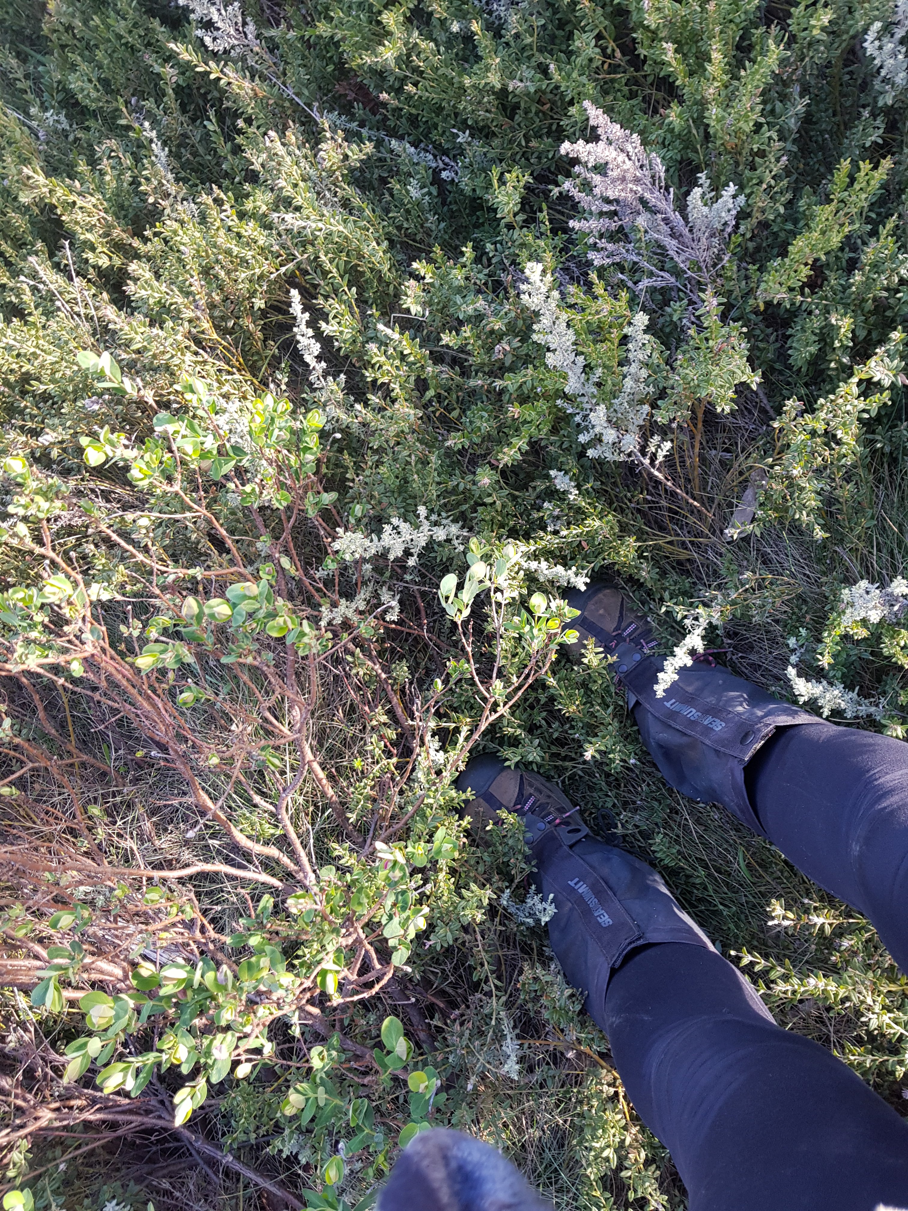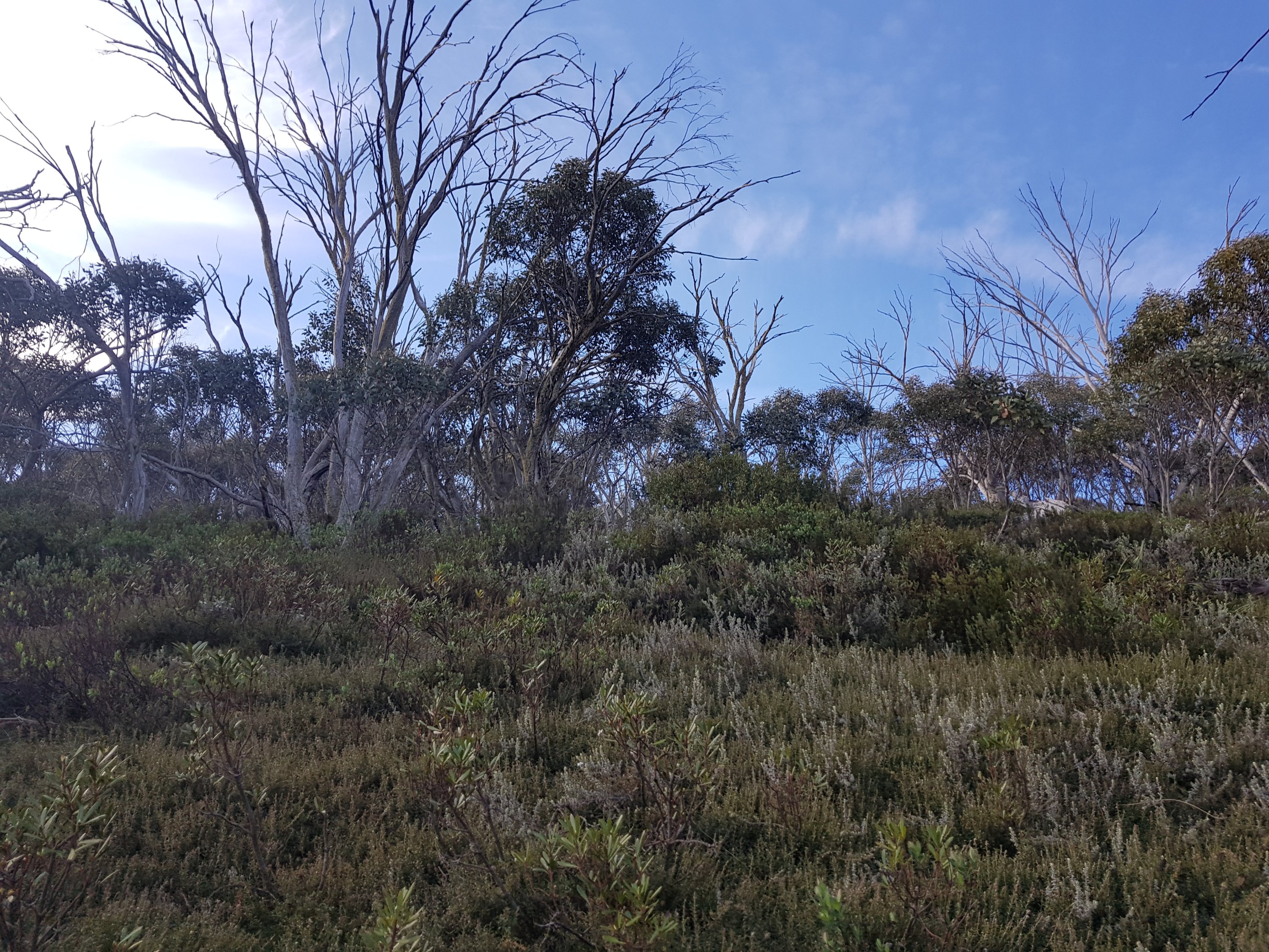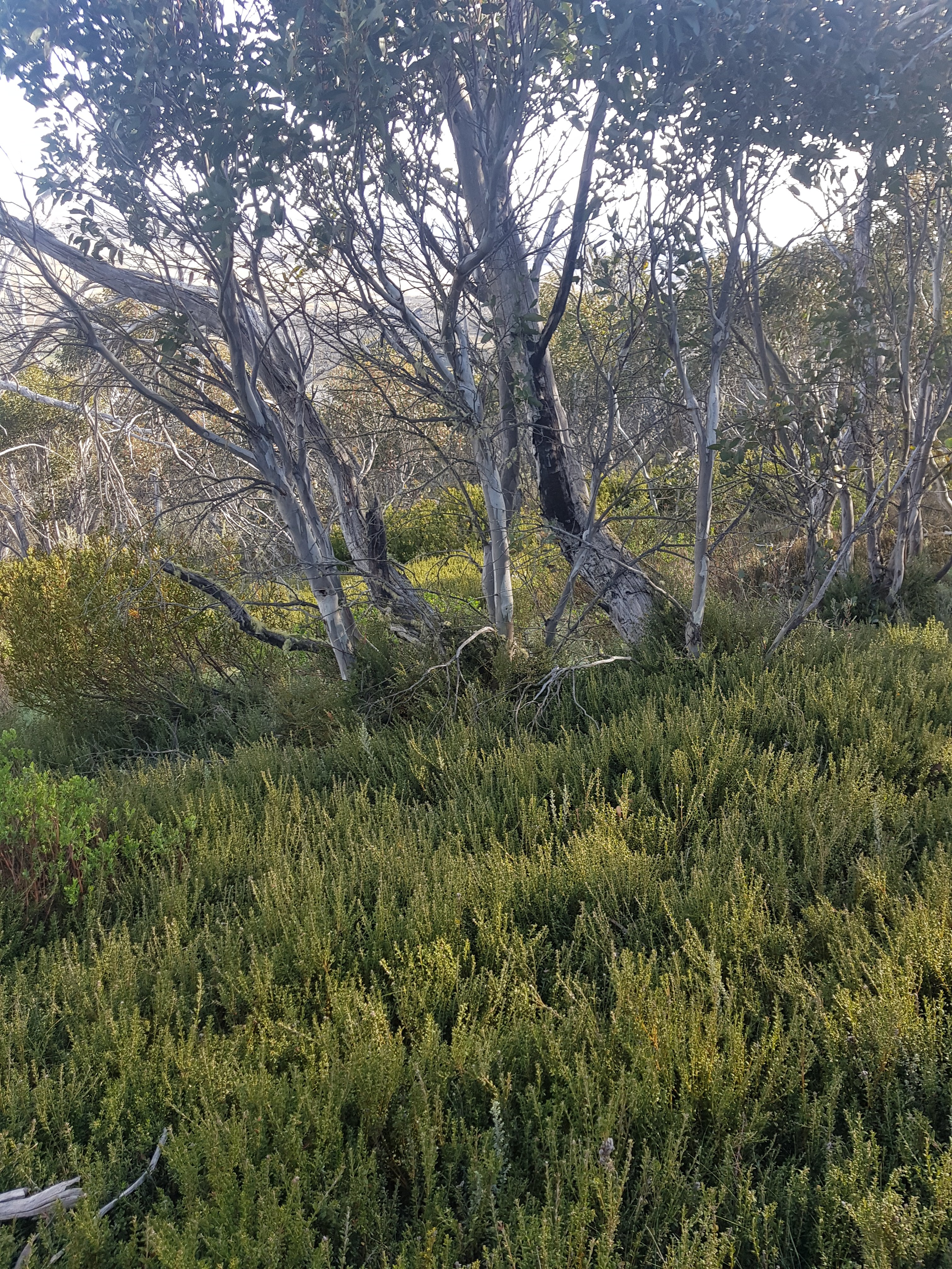 The daisies up here are so wiry and rugged. A bit like lavender. Really quite beautiful. The country up here is so dramatic. I’ve been surprised by the vastness of the plains. It changes as the hours pass and today I was treated to big, expansive views across to remote mountain ranges. For this trip I bought a Telstra sim for emergencies, thinking they’d have more coverage than Optus. After waiting on a windy hill this afternoon for an hour in a spot where l had one bar of Optus coverage for Telstra to not fix whatever problem they have and activate my service, l continued on to find Happy’s Hut. The notes in the book say “walk 0.3km east from the junction with Boltons Hill Trail before turning south into the forest to descend for 1.2km to Happy Jacks Hut”. Well, the reality was nowhere near as pleasant as that description sounded. At first it was great. I was off track for the first time, using my compass and feeling like a bit of a legend. Then the valley I was following got thicker and denser and harder to push through all the plants. Then there was a small creek to navigate (ie not repeatedly step into). It turned out to be a massive bush bash slog. I knew l was heading in the right direction (south), but wondered if I’d ever come out at the bottom, particularly before the sun went down!