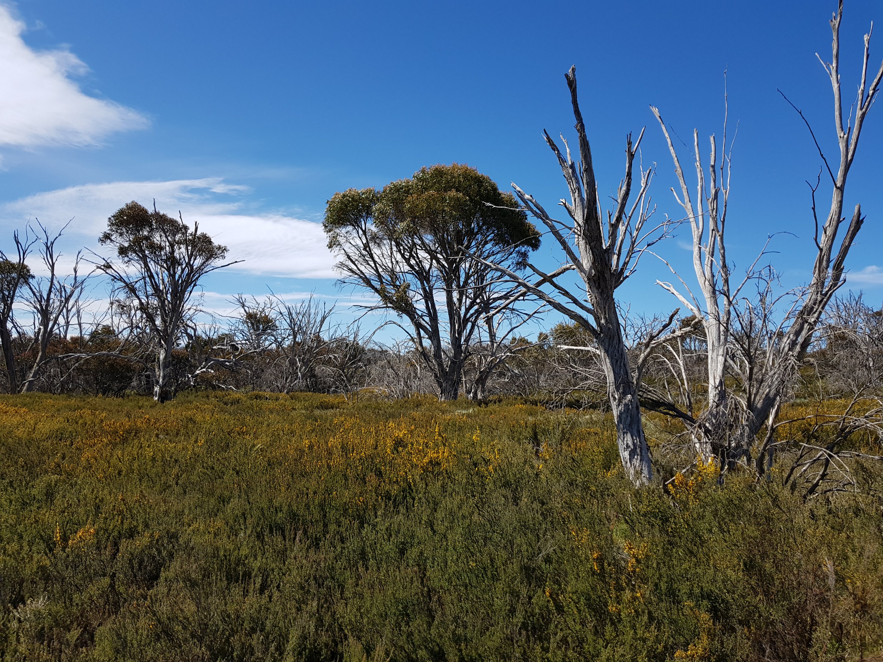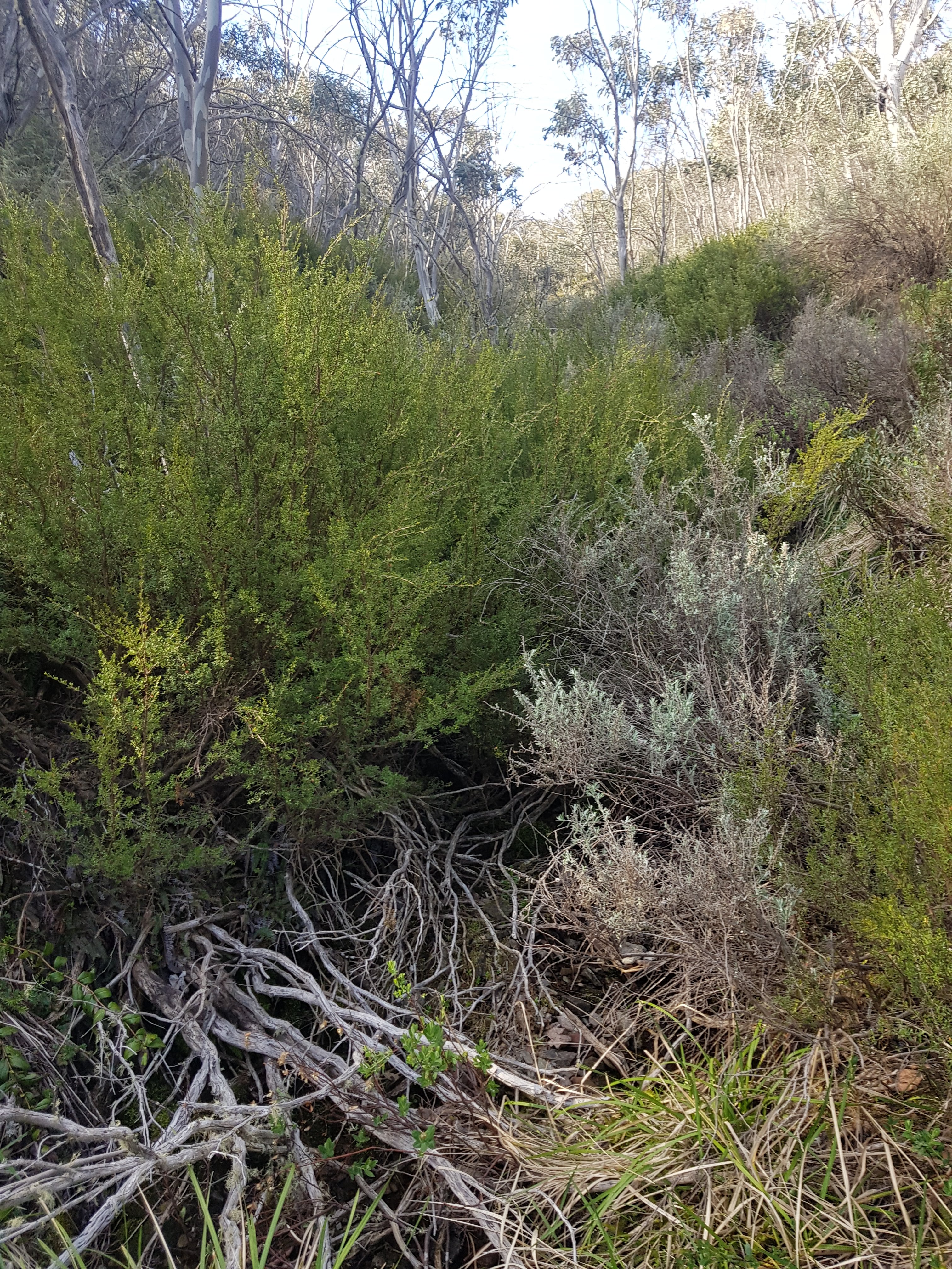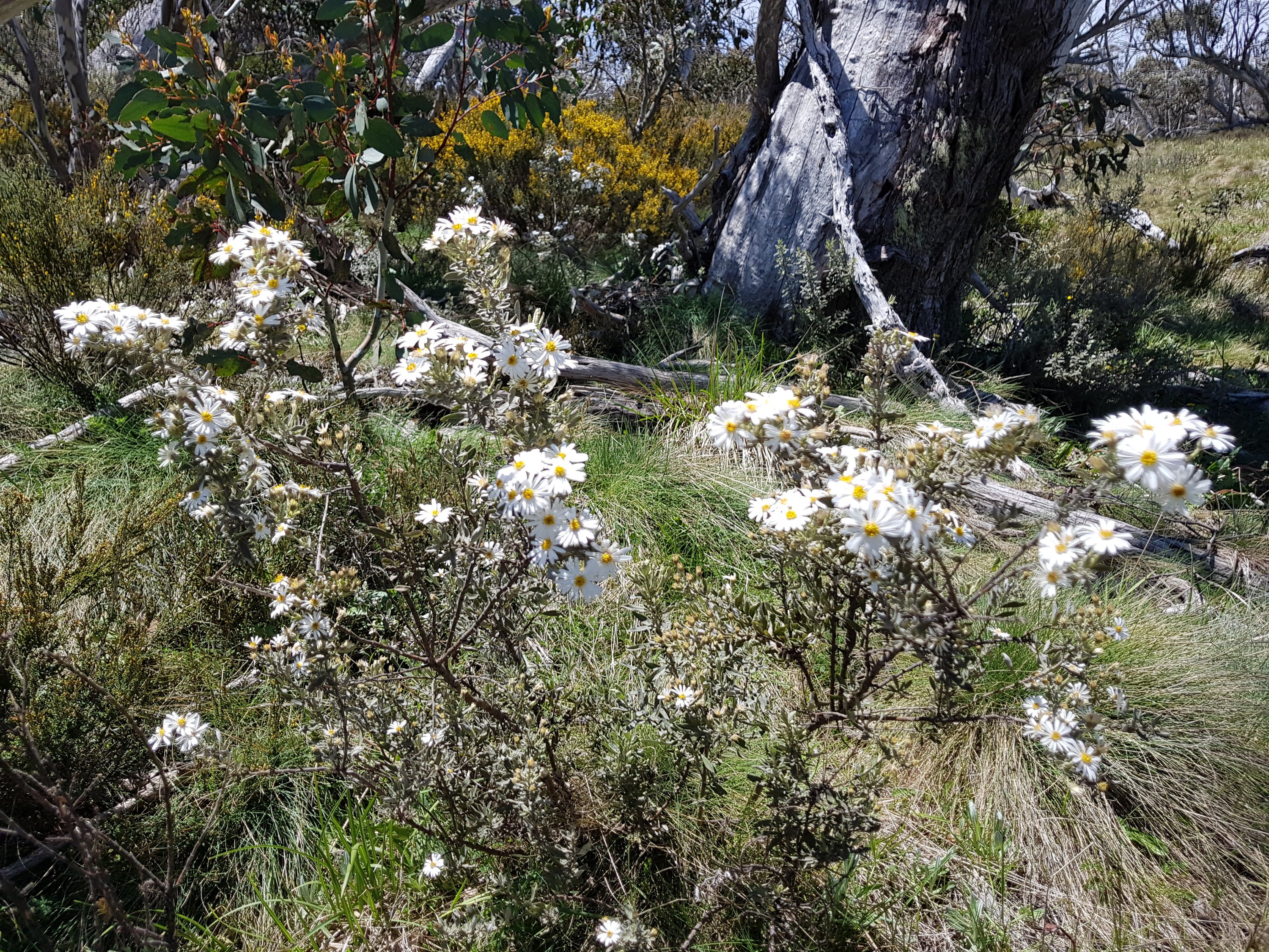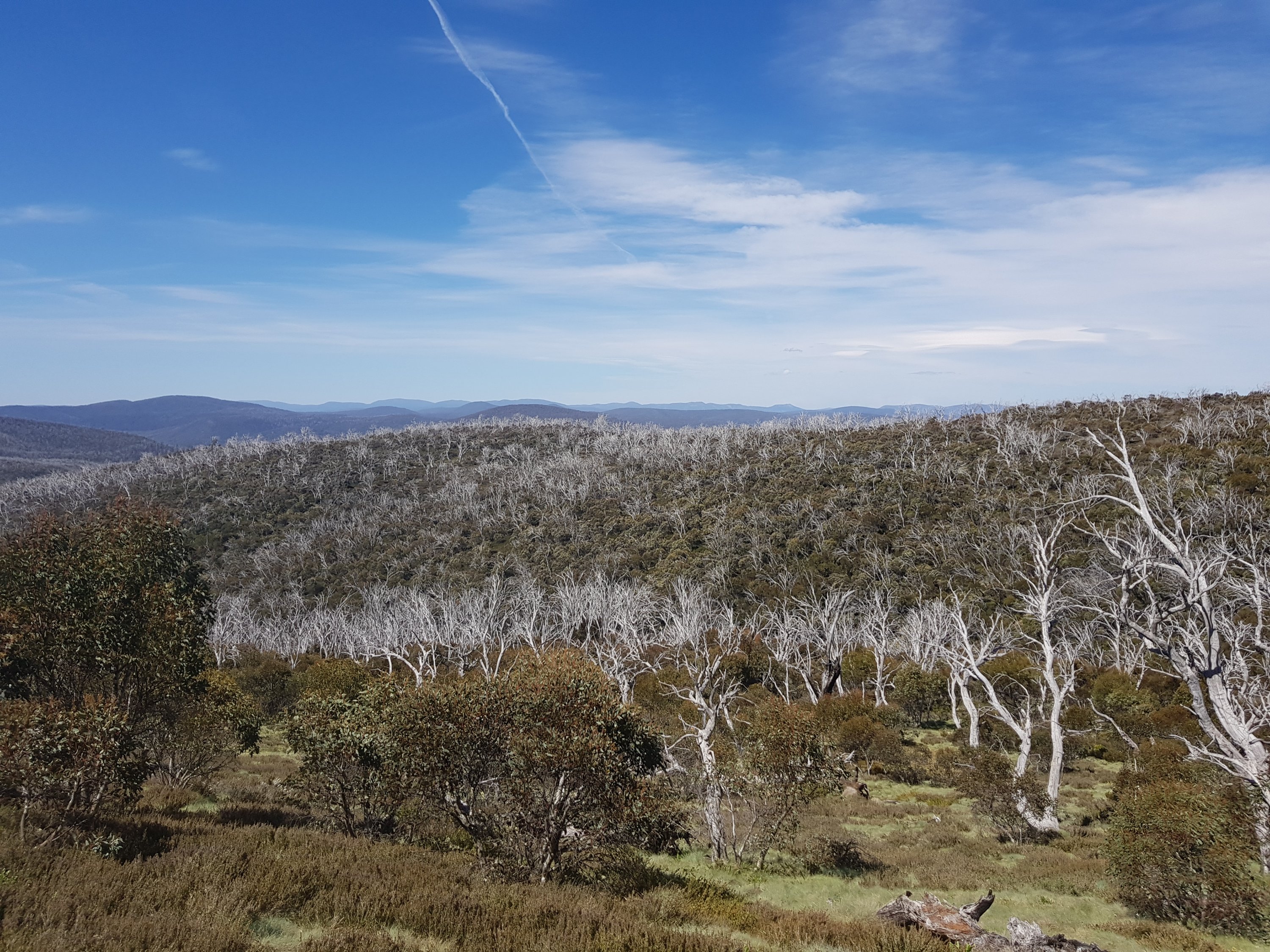 The daisies up here are so wiry and rugged. A bit like lavender. Really quite beautiful. The country up here is so dramatic. I’ve been surprised by the vastness of the plains. It changes as the hours pass and today I was treated to big, expansive views across to remote mountain ranges. For this trip I bought a Telstra sim for emergencies, thinking they’d have more coverage than Optus. After waiting on a windy hill this afternoon for an hour in a spot where l had one bar of Optus coverage for Telstra to not fix whatever problem they have and activate my service, l continued on to find Happy’s Hut. The notes in the book say “walk 0.3km east from the junction with Boltons Hill Trail before turning south into the forest to descend for 1.2km to Happy Jacks Hut”. Well, the reality was nowhere near as pleasant as that description sounded. At first it was great. I was off track for the first time, using my compass and feeling like a bit of a legend. Then the valley I was following got thicker and denser and harder to push through all the plants. Then there was a small creek to navigate (ie not repeatedly step into). It turned out to be a massive bush bash slog. I knew l was heading in the right direction (south), but wondered if I’d ever come out at the bottom, particularly before the sun went down!