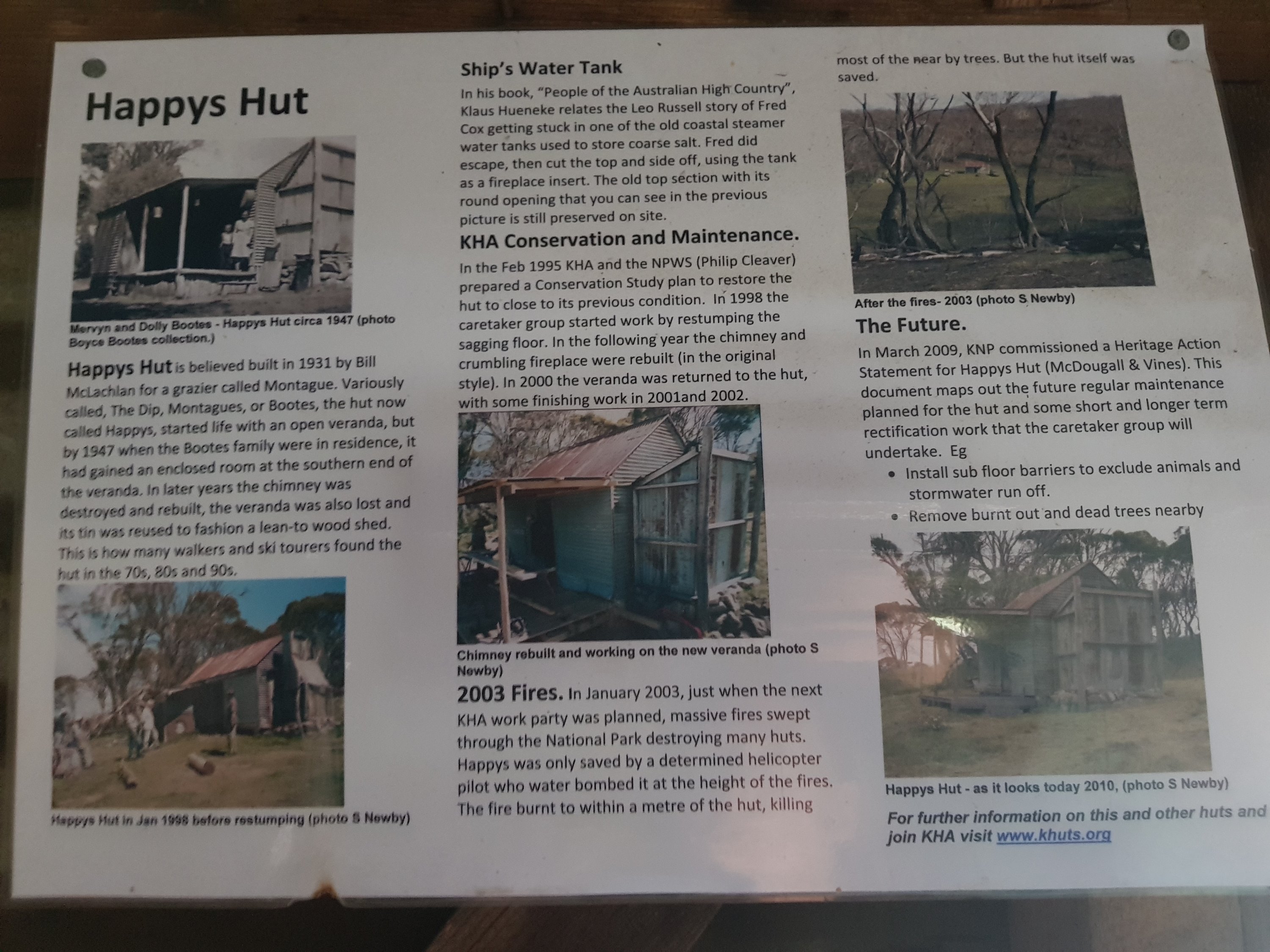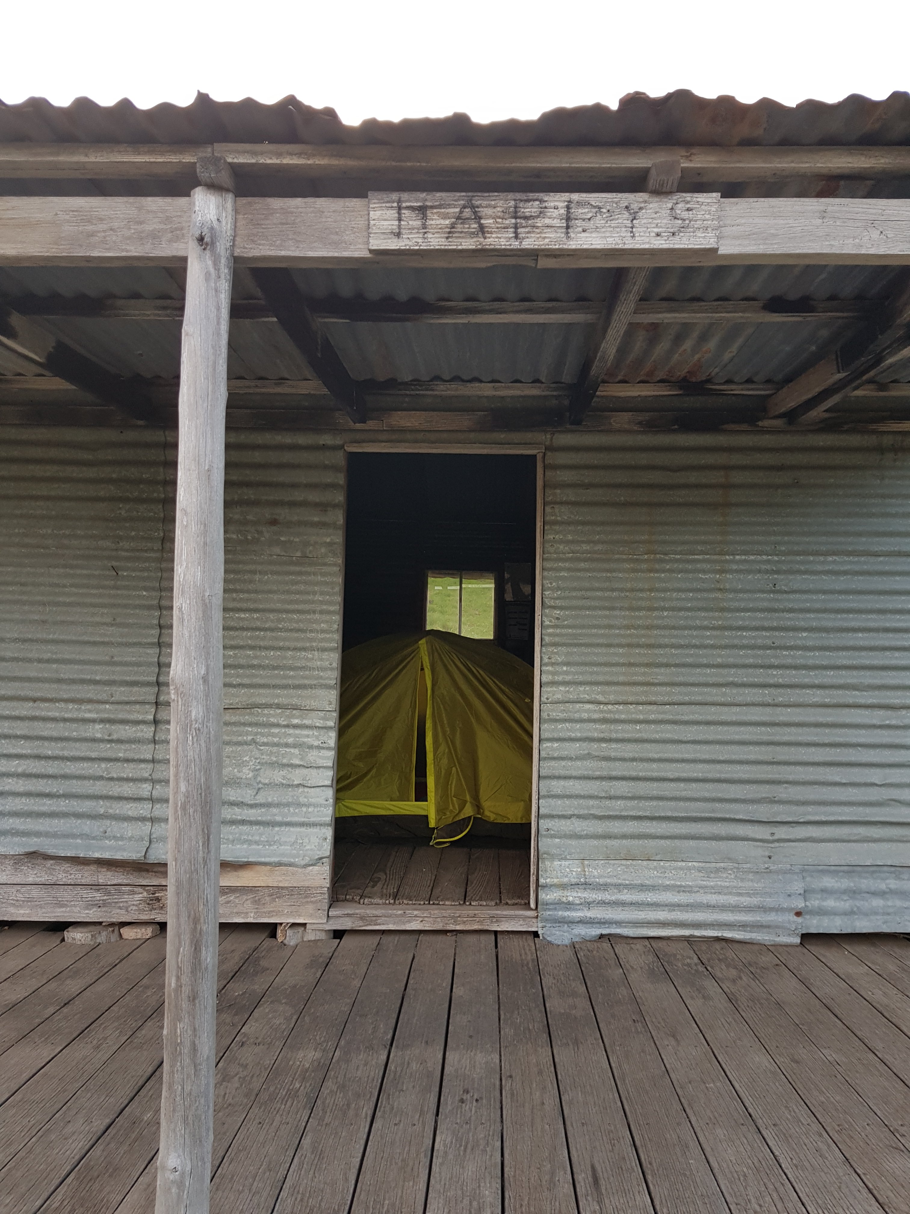 And finally I came out at Happy’s Hut. True to name, it did make me happy. It’s a cute little one room hut with a wide verandah. At first I set my tent up on the verandah but it was just too windy so I moved it inside the hut. The wind is forecast to drop off soon for the night. Hope that’s right. Apparently this hut nearly burnt down in the 2003 bushfires. It was only thanks to the efforts of a helicopter water pilot who kept it wet that it survived while the bush around it burnt.