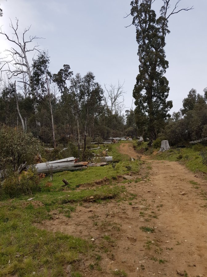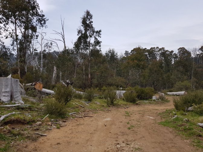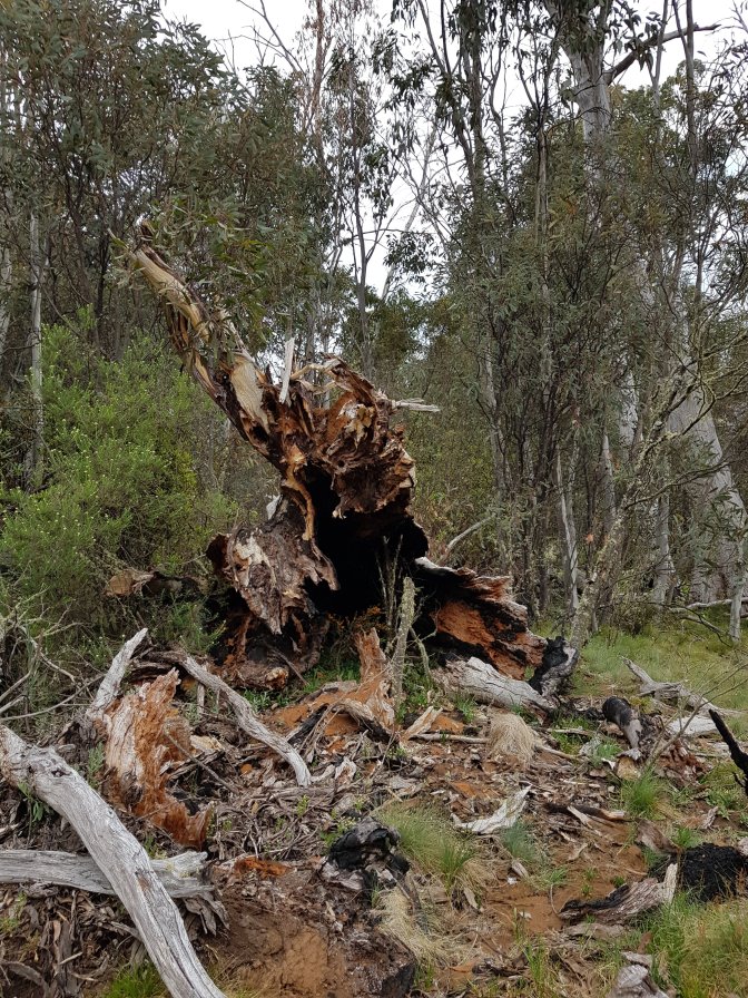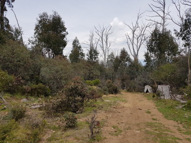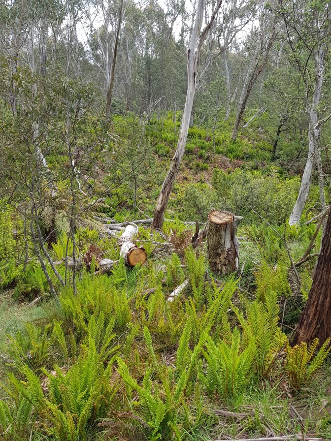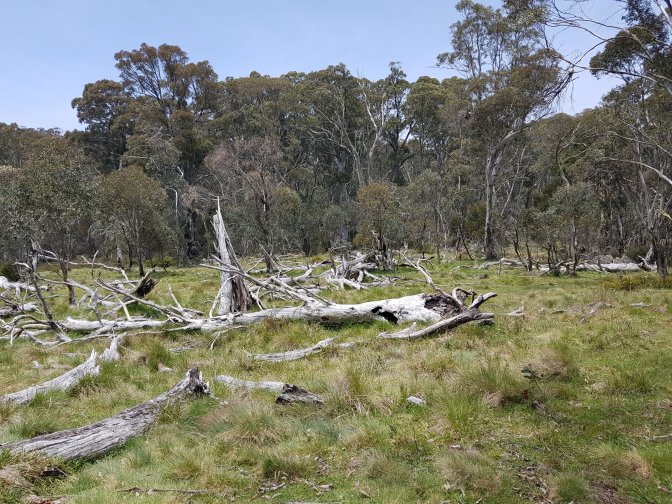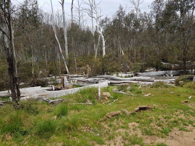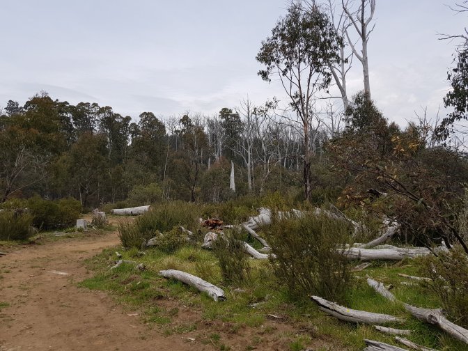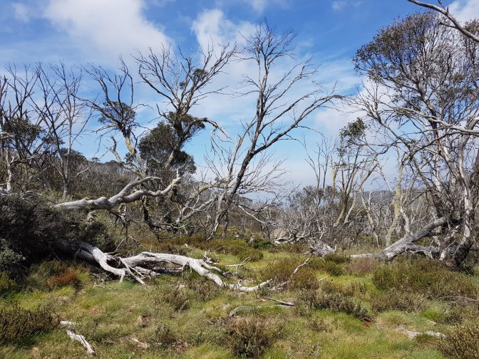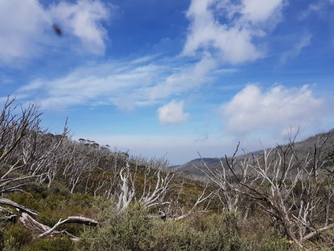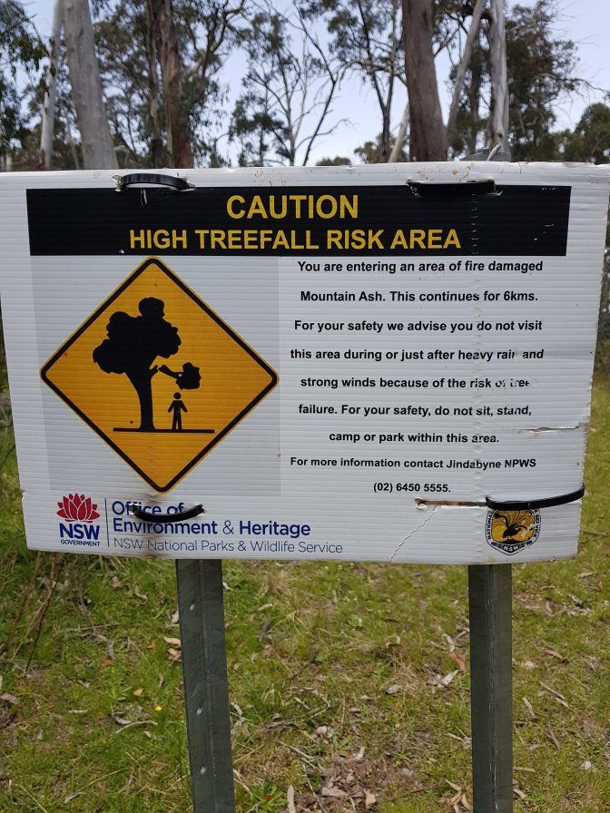 I left the three at Cascades Hut and continued on towards Tin Mine Huts. The landscape changed markedly. There has been huge clearance of all the fire damaged trees and it felt like I was walking through a logging area for much of the next section. Interesting sign saying don’t sit, stand, camp or park in the area due to high risk of falling trees!