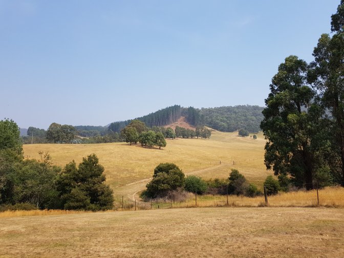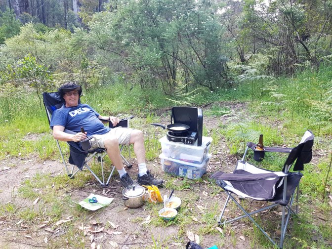 We tore ourselves away from Jamieson Valley Retreat and headed towards the start of tomorrow’s walk. We weren’t totally sure we could get there via the “roads” we’d chosen so wanted to check it out. After a short stretch on Jamieson Licola Road (graded gravel smooth) we turned off into Mt Sunday Road. The first half merited the title road. The second half was definitely more track and I reckon we pushed the old Jubbie-mobile to its limits. It was rocky and steep in sections. No way we could have done it in the wet. At one point I hopped out to move a log off the road and came close to stepping on a big black snake on the side of the road – lucky that one knew the appropriate behaviour and quietly slid away. We got down to the location I’d originally planned to start my walk from. There was no coverage and the road back up was the worst of it – I didn’t like the idea of Jubble doing that alone tomorrow so we decided to return about 5kms and set up camp. Before that we had a very non traditional Christmas lunch of sachet Indian food with wraps and a beer!