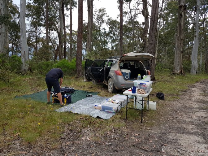 From there the track descended all the way to Thomson River. I’d been concerned about this crossing. The book said the log crossing was no longer there. Turns out, the original one had been destroyed – you could see it half under water – but another sturdy one was in its place complete with chain. Wow, the water must get high at times. I realised before the descent that I’d mapped the trail incorrectly on the app Jub and I are using. I had our meeting point upstream about 1km. I hadn’t heard from Jubble all day and had no way of communicating with him. I assumed he’d been out of coverage. He wasn’t at the point my track joined the road, so I hiked up the road to the point I’d mapped on our app at Easton Dam. There was the Jubbie-mobile, but no Jubbie. I left my fly swoosher under his windscreen wiper so he’d know I’d been there if he came back and I went off looking. I crossed a bridge across the river just below the dam and was looking around when I heard him calling. He was sitting on a camp chair near the dam wall with a perfect view of the bridge which I should have crossed according to our app.