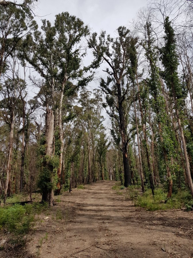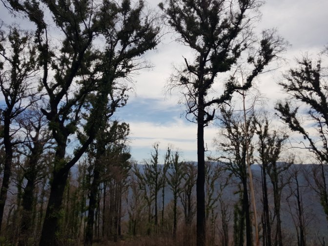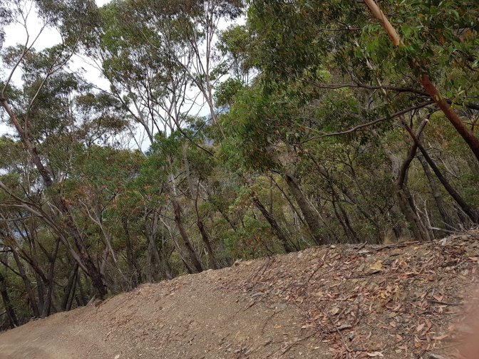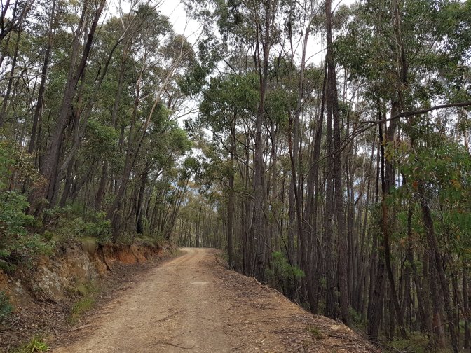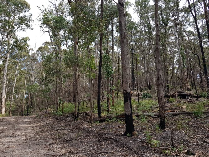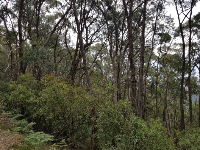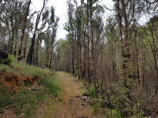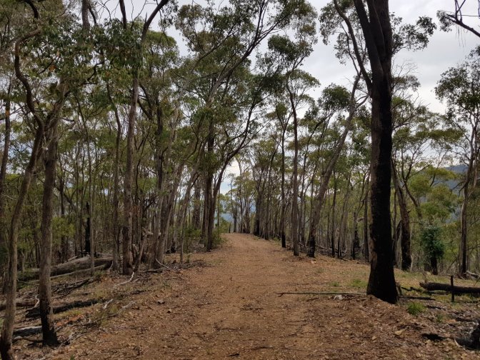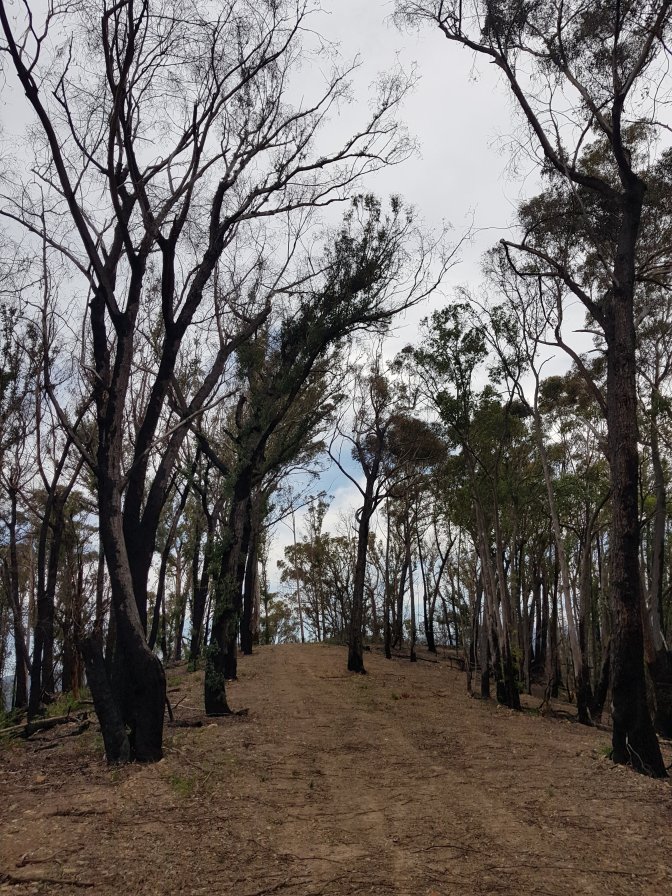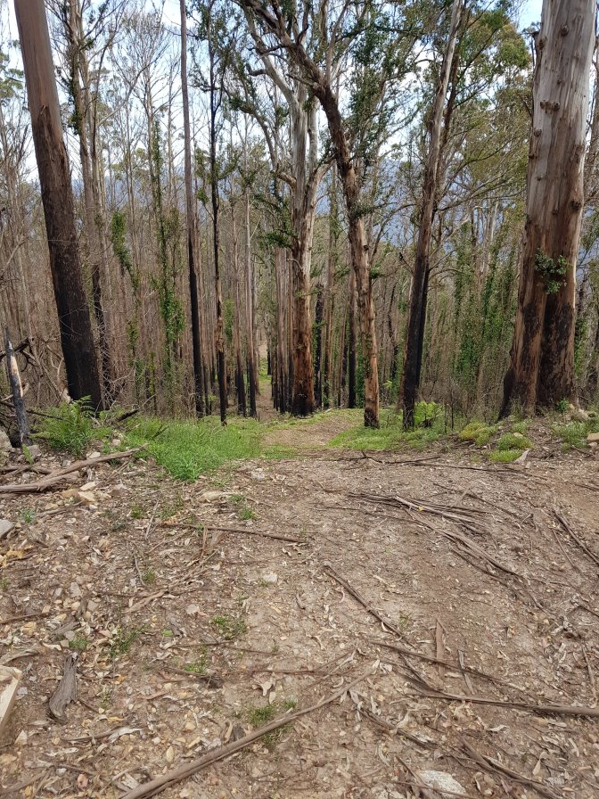 The track wound around a hill to arrive at the junction of my next track, a management trail. This was up to Mt Easton and the part I’d been worried about for navigation. Turns out, it was absolutely beautiful and no problem to get through. Fire had been through the area relatively recently. There was no undergrowth and the most of the trees were burnt but not dead. Their bases had been burnt but their leaves were still alive way up high and they were all sprouting huge amounts of bright green regrowth. I’ve no idea where the official path might once have been, but the path I took was along the management trail which climbed to the top of Mt Easton and just below the summit of Little Easton.
