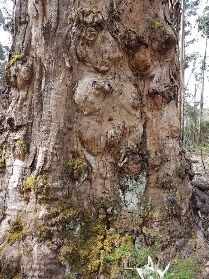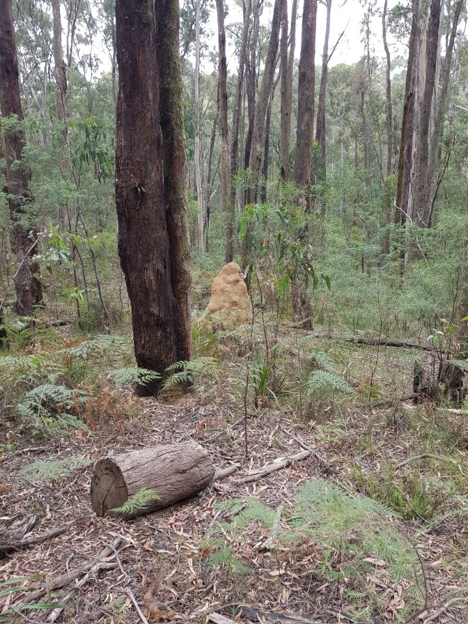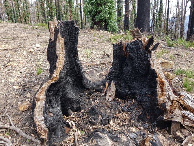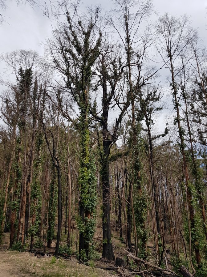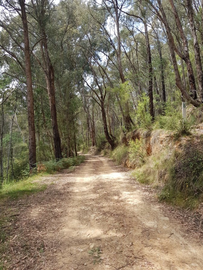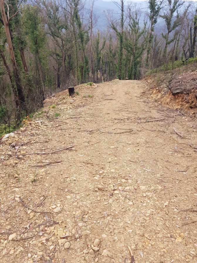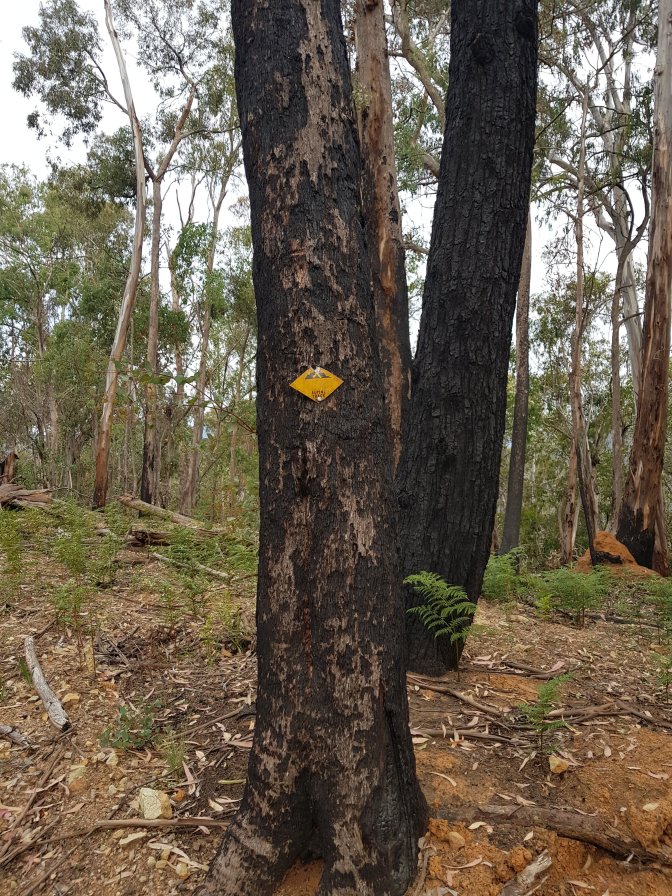 The track wound around a hill to arrive at the junction of my next track, a management trail. This was up to Mt Easton and the part I’d been worried about for navigation. Turns out, it was absolutely beautiful and no problem to get through. Fire had been through the area relatively recently. There was no undergrowth and the most of the trees were burnt but not dead. Their bases had been burnt but their leaves were still alive way up high and they were all sprouting huge amounts of bright green regrowth. I’ve no idea where the official path might once have been, but the path I took was along the management trail which climbed to the top of Mt Easton and just below the summit of Little Easton.