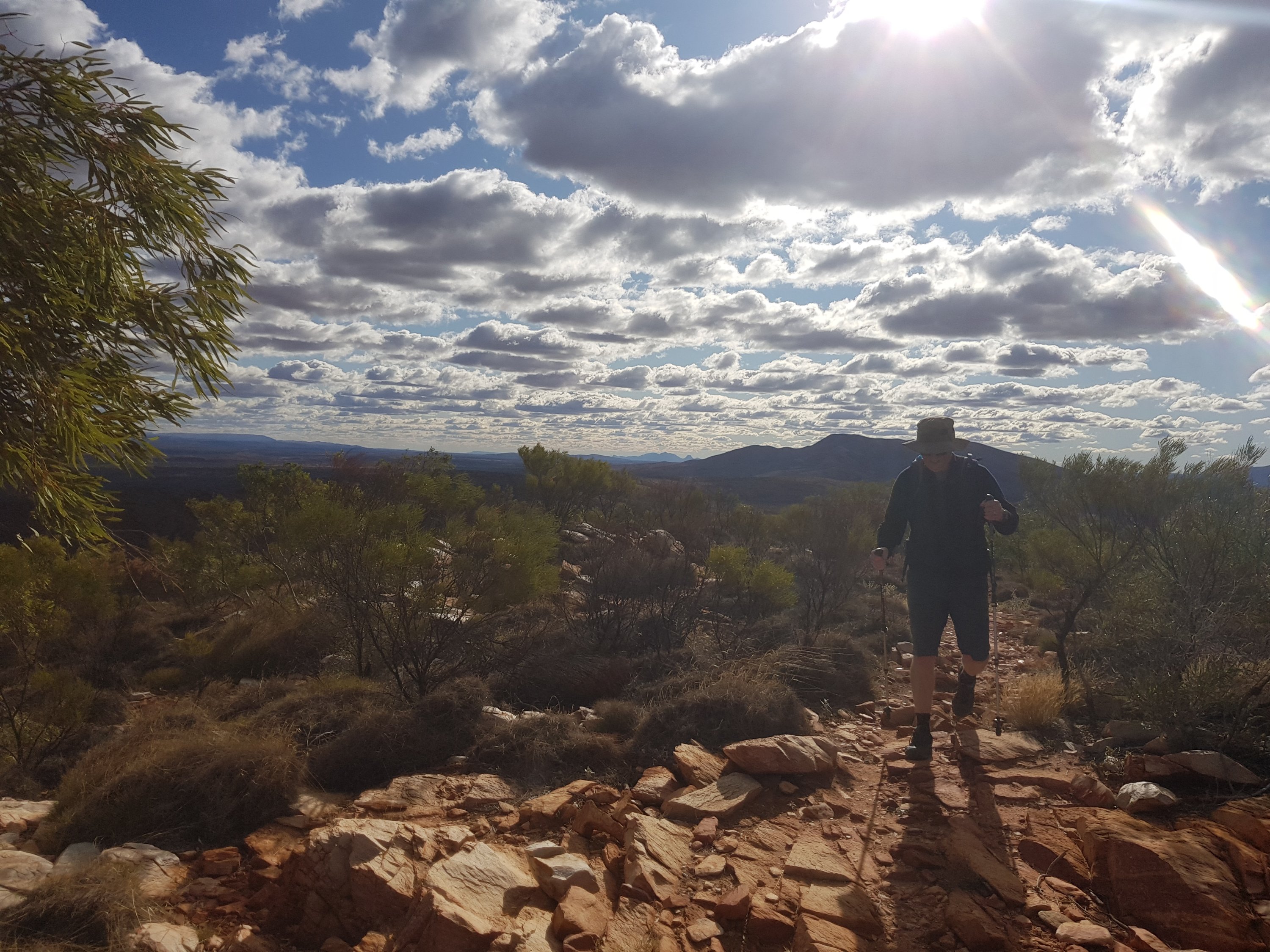 After a quick lunch, we started off to Mt Sonder to get there for sunset. After a gentle stroll, the path started to ascend quite steeply for about 3kms. We started to worry it would take us longer than we’d planned and we might not make sunset. But it was just the first few kms that are steep and we picked up the pace after that. Looking back to the starting point from way up high, we could actually see our tent shining in the sun!