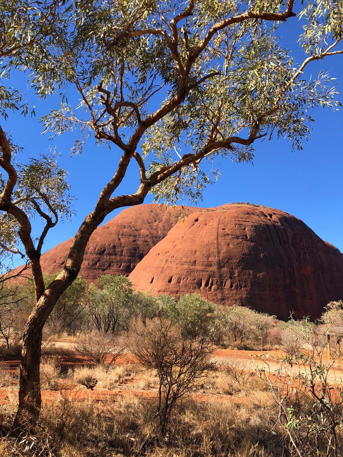 We drove out to Uluru and walked around the base. I had completely not appreciated the grandeur and stark beauty before I saw it in real true life. I loved reading all the stories about the different areas of the rock and why they were important to the aboriginals and imagining them sitting in the various caves grinding seeds to make flat bread or roasting meat over fires that blackened the ceilings or the fellas just hanging out together keeping an eye on the adolescent boys (“bush boys”) who were learning how to become men. Apparently at one of the waterholes, when a mob of emus came to drink the aboriginals would hide, wait for them to leave and then kill the last one. They did that so the emus wouldn’t be afraid to drink at that spot, they’d just wonder where their mate had disappeared to!
