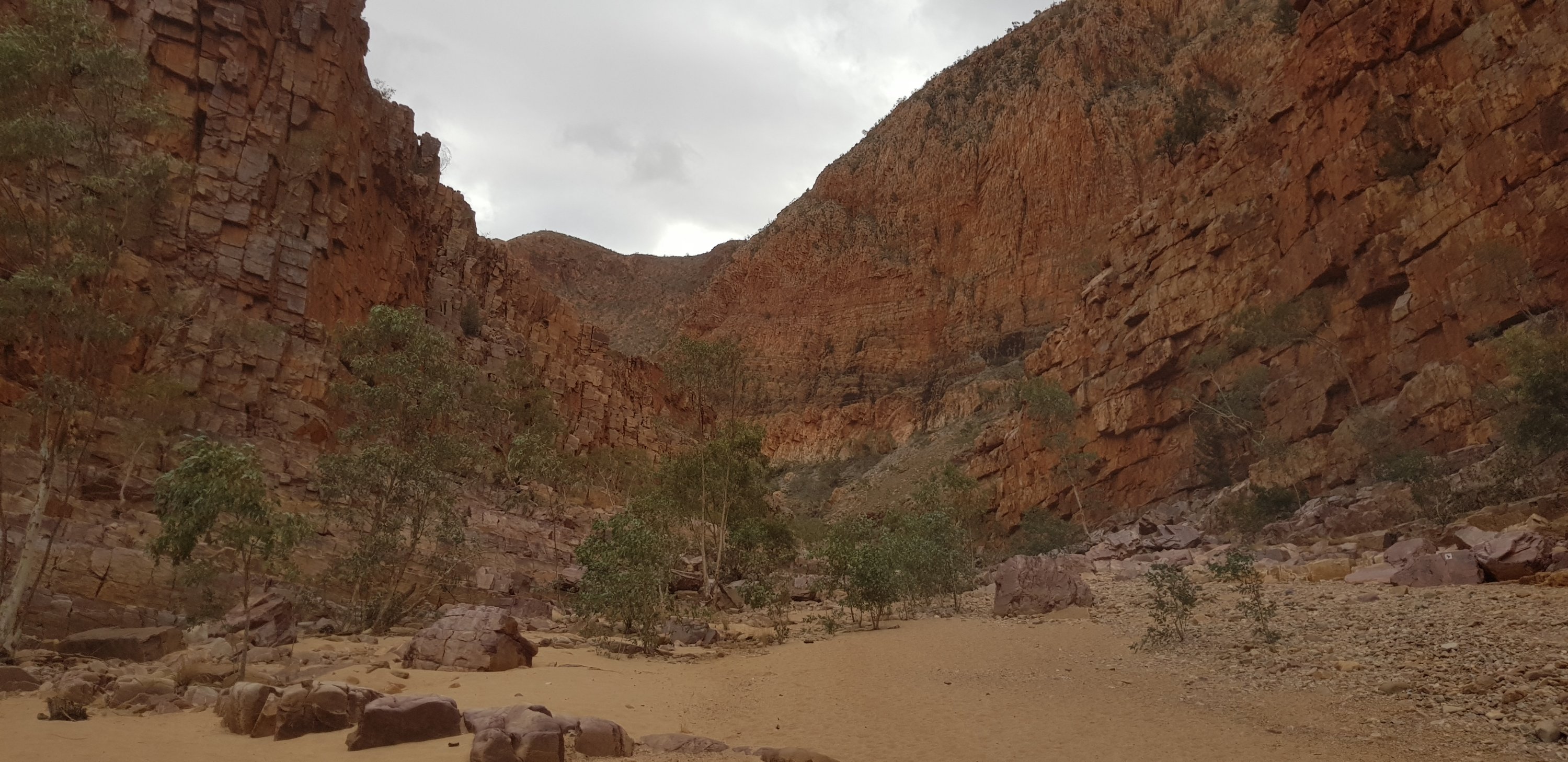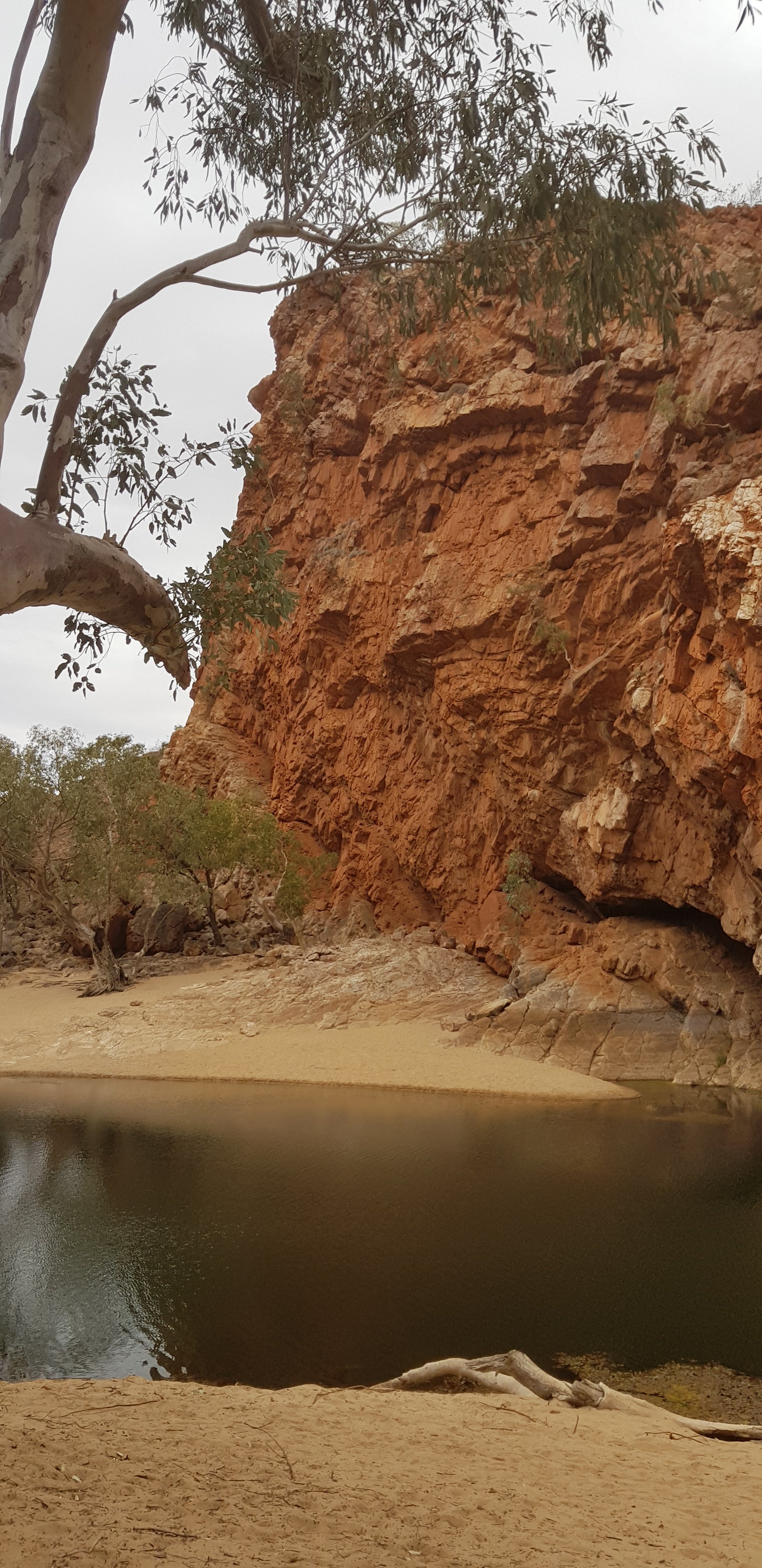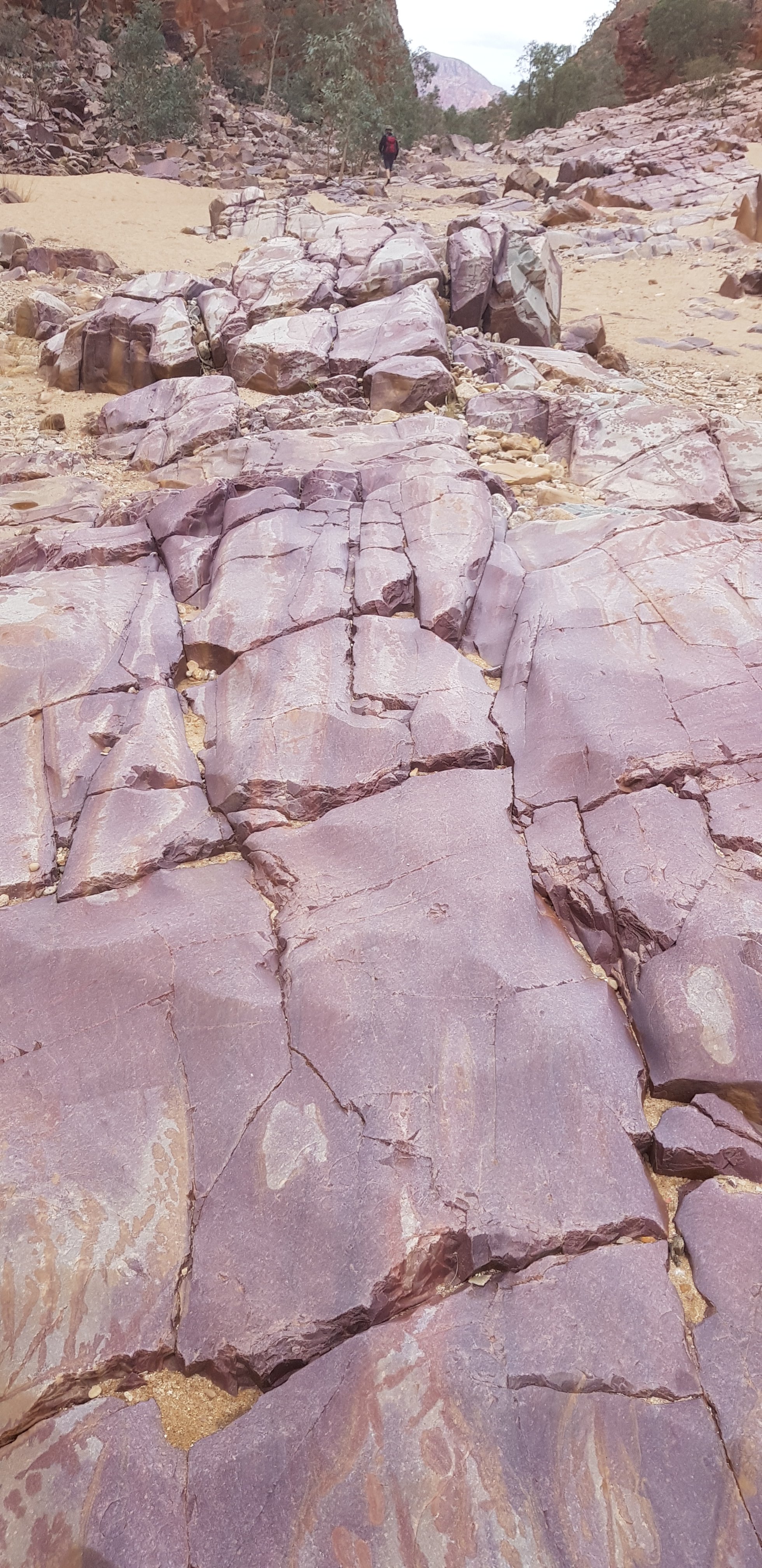 It was raining a bit this morning so we decided to head to Alice Springs to top up our supplies and get more fuel. This may in fact may be the most disjointed hike of the full Larapinta Trail anyone has done!The wind last night was insane – felt and sounded like our tent might get ripped away. Bizarrely it was really warm though with no need for sleeping bags. Funny to think that two nights ago it was 1 degree and we were sleeping in full cold weather kit.It was such a great idea of Jubble’s to camp at Ormiston Gorge with its hot shower and for him to pick me up and drop me back at Finke River. We’ve decided to stay here for the next four nights and travel to and from each hiking section. And the surprise bonus is mobile coverage! I didn’t even bother turning my phone off flight mode. It was Jubble who realised this morning we had full 3G! So spoilt being able to communicate with people, research, answer those questions that come up that only Google can answer.After the supermarket, petrol station and a delicious lunch and coffee, we headed back to Ormiston Gorge and a walk around Ormiston Pound. What a stunning walk. I learnt from Google (thanks mobile coverage) that a pound is a ring of mountains. We started off through Ormiston Gorge going clockwise past the waterhole where there were a few people soaking up the rays on the sand next to the water. Bizarrely apparently at times there is so much water in this waterhole that the only way past it is to wade or sometimes swim across. I saw a photo of one guy washing through, waist deep holding his backpack above his head! From there we made our way along the rocky middle of the gorge. The colours of the rocks are amazing – predominantly purple even though the rocks towering above are mainly burnt orange – but with huge variety of colours – purple, blue, red, brown, green, white. Absolutely stunning.