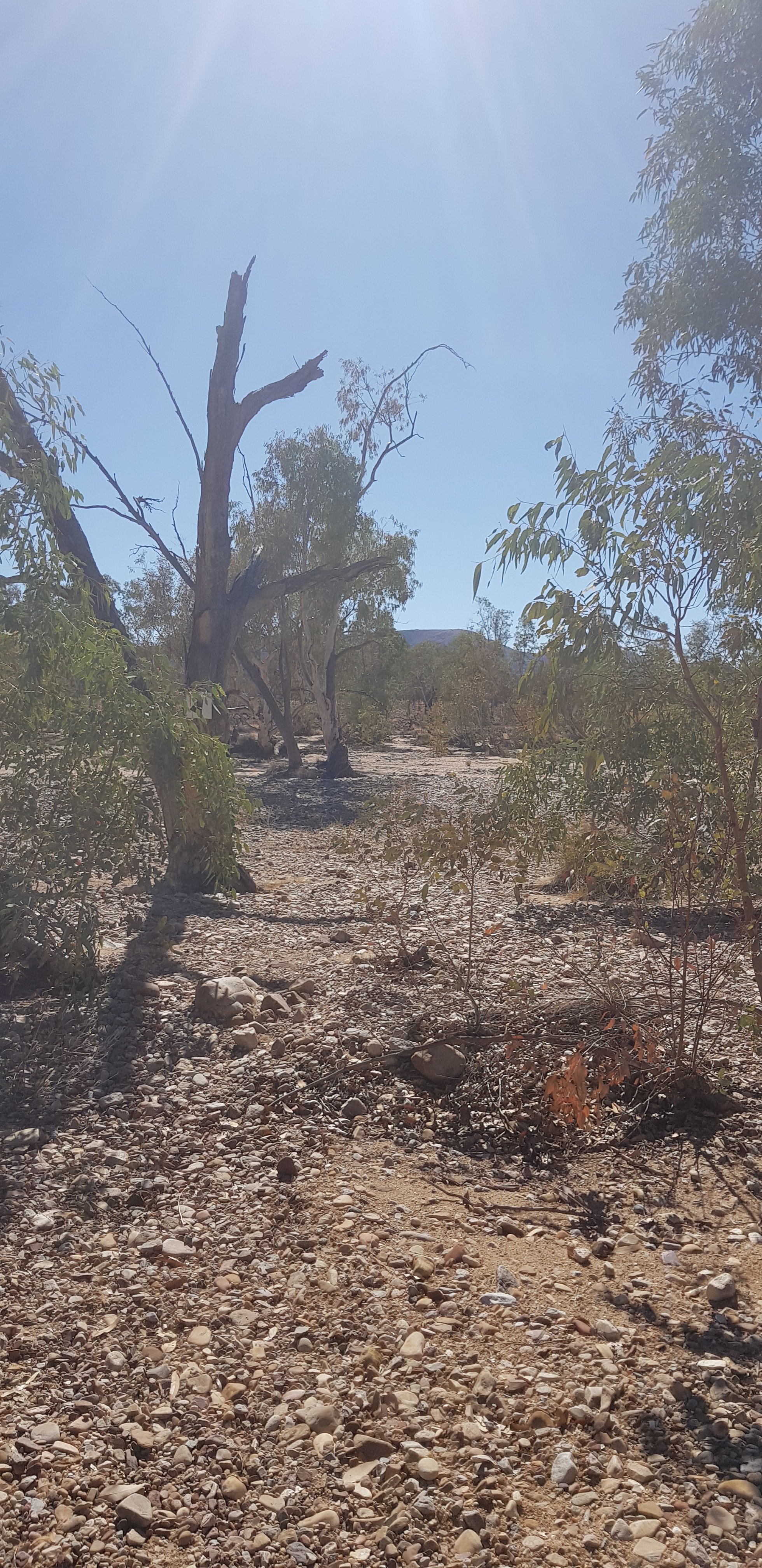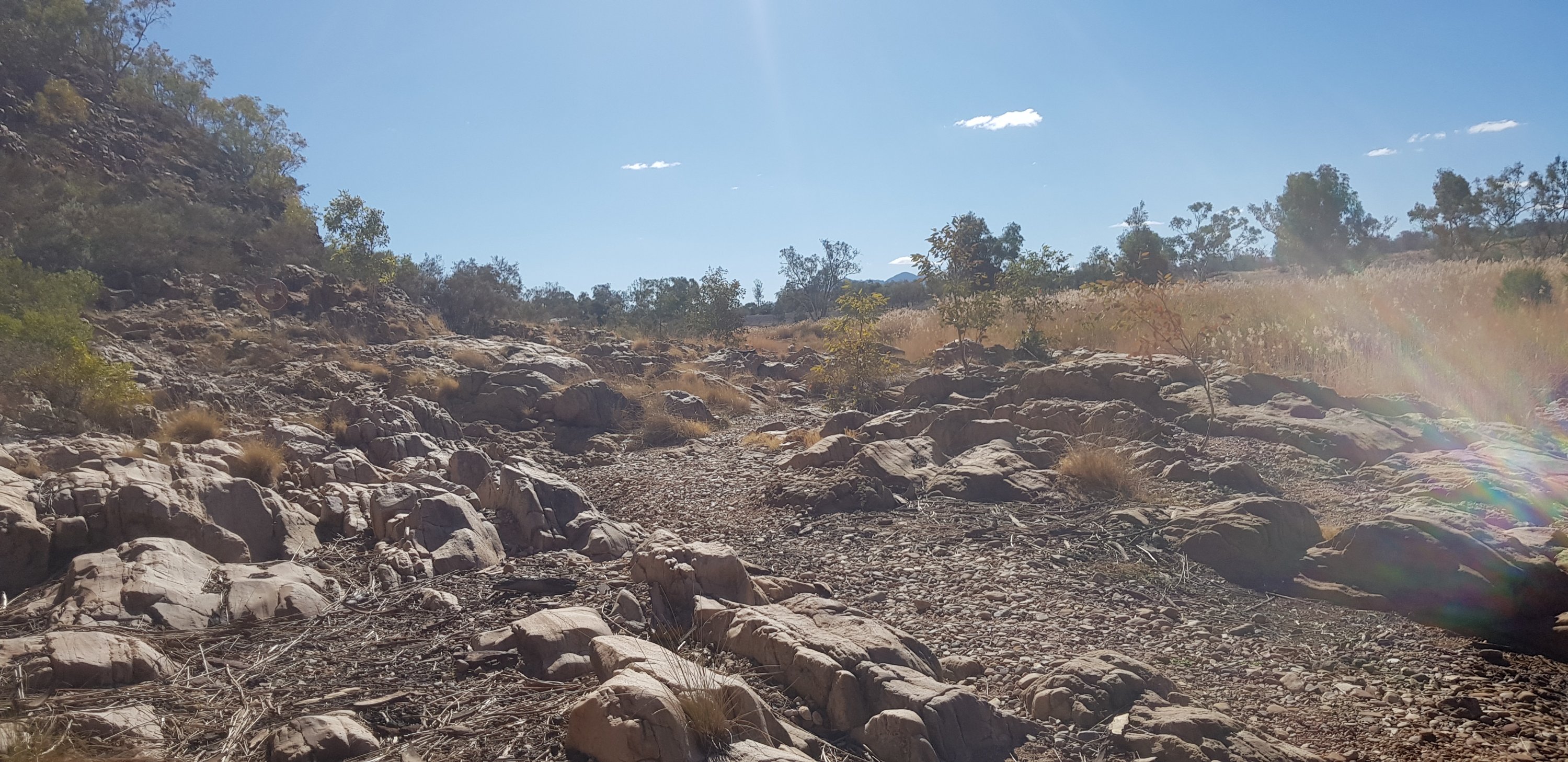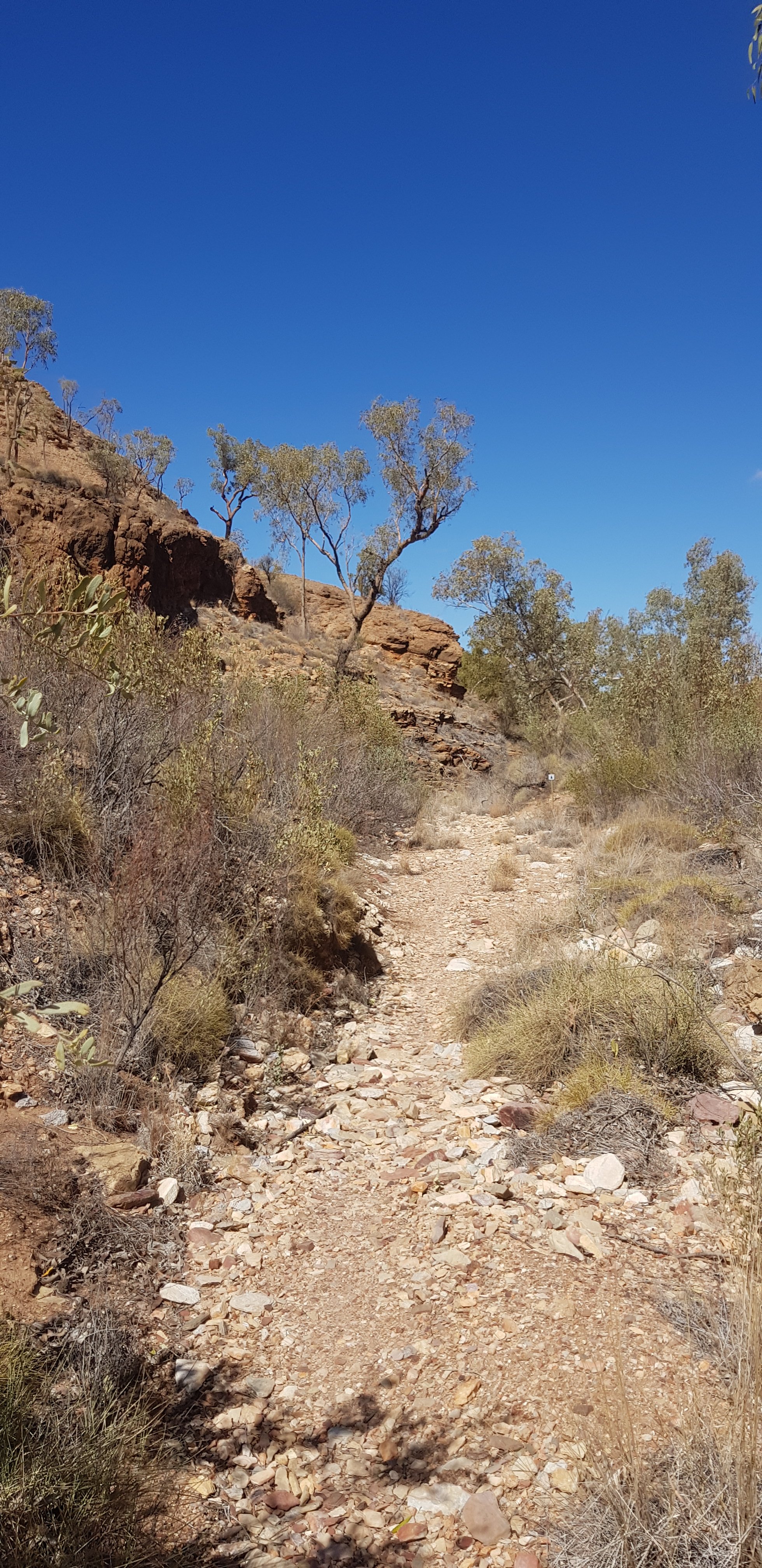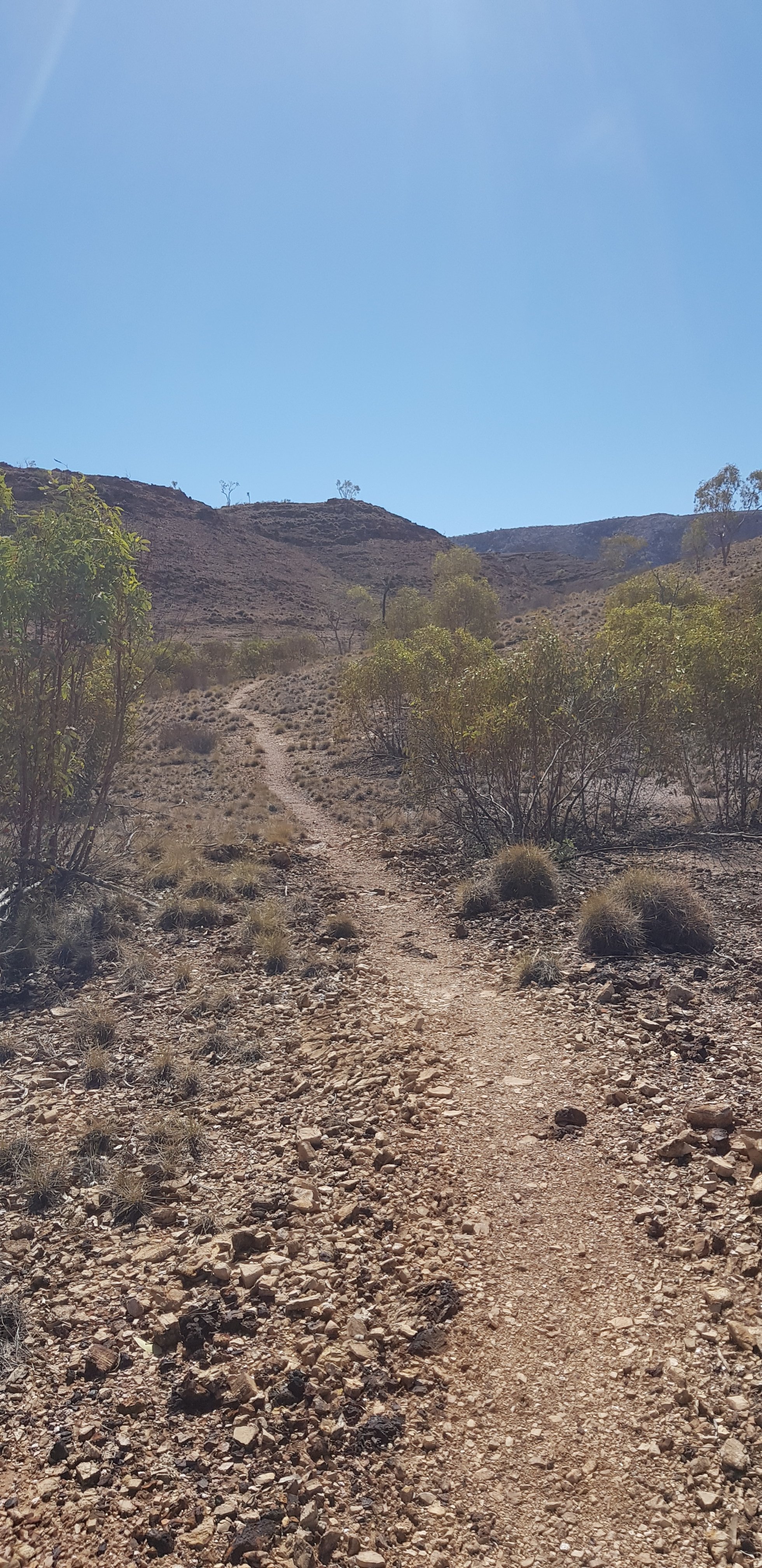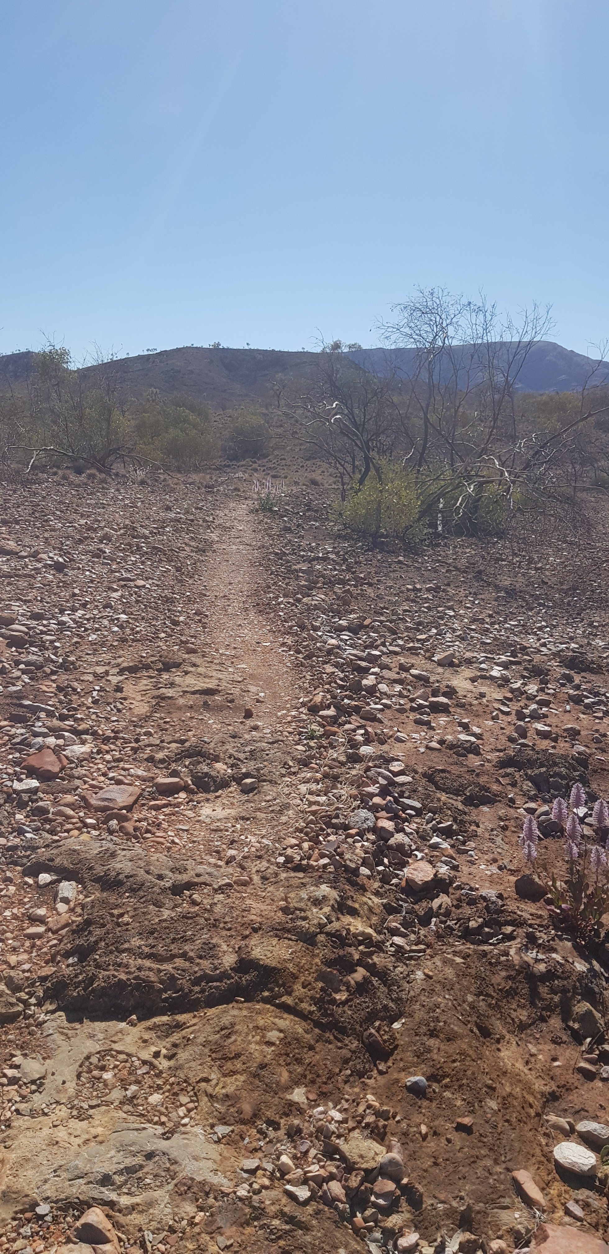 From Finke River the rest of the day’s walk was through pretty barren, rocky landscape. Major fires went through a big section of the park at the start of 2019 and burnt all the spinifex, grass and trees in their path. It’s left the landscape bare and rocky and it’s hard to imagine how it will recover. There are signs of green in certain areas, but there hasn’t been enough meaningful rain to really make a difference. That certainly shows with all the dry creeks I’ve crossed along the way. There has been absolutely no water other than the waterholes at Redbank Gorge and Ormiston Gorge and even those have been small compared with photos I’ve seen. Some photos and blogs show the waterhole at Ormiston Gorge filling the whole gorge and people needing to wade or swim across!
