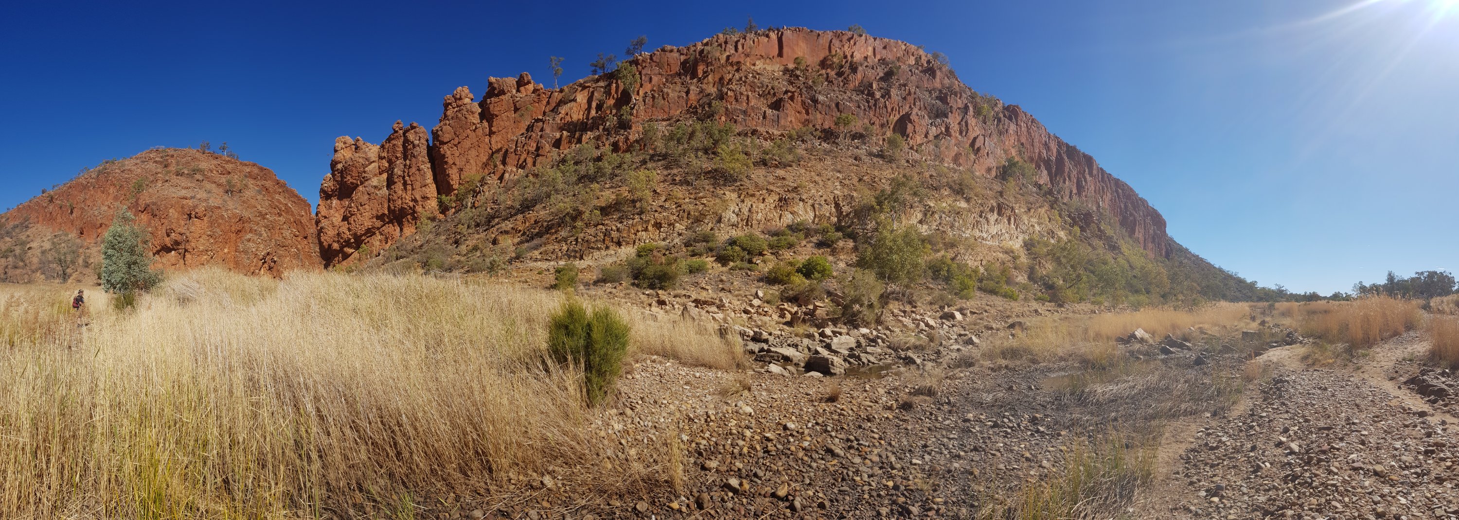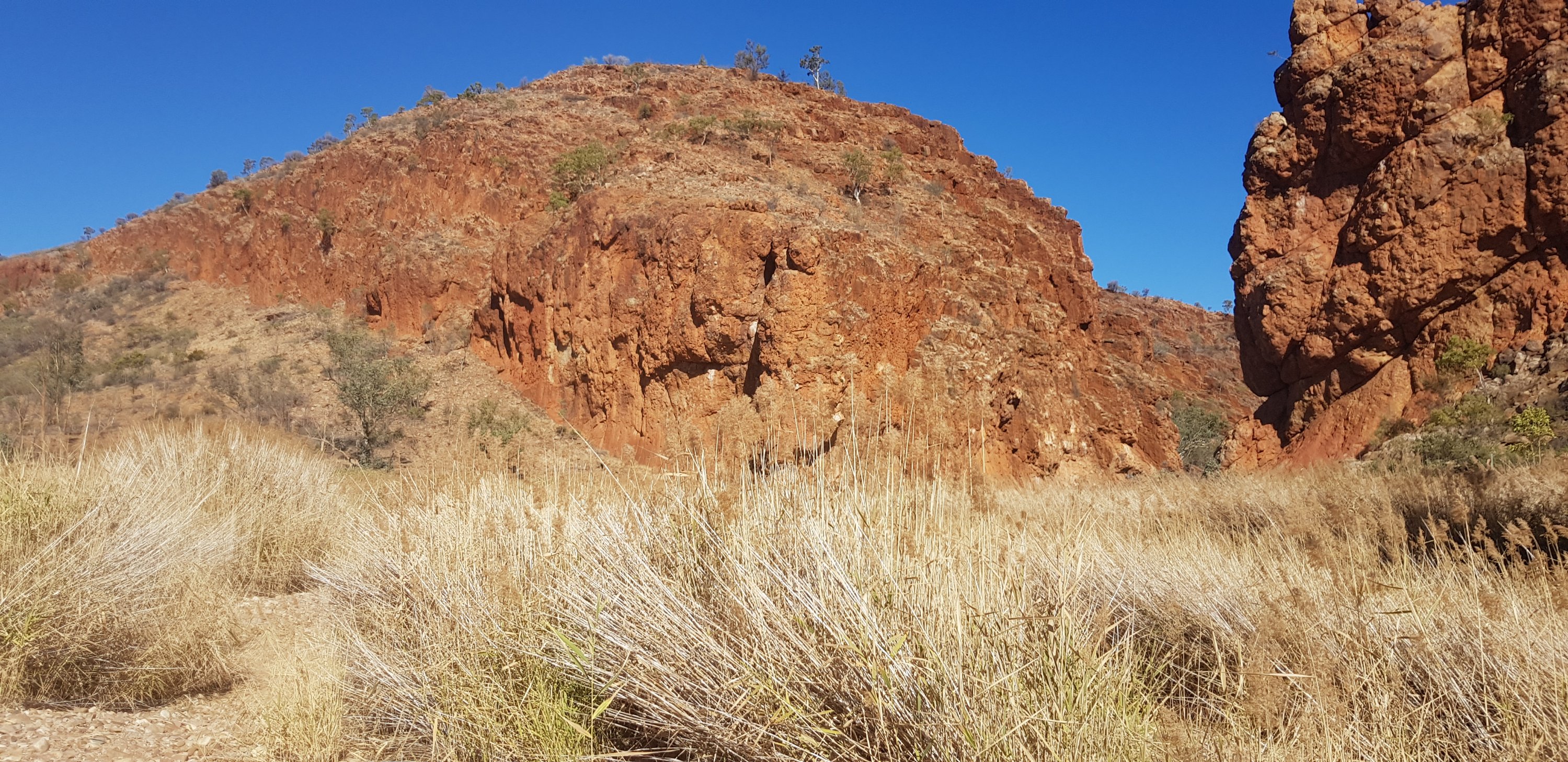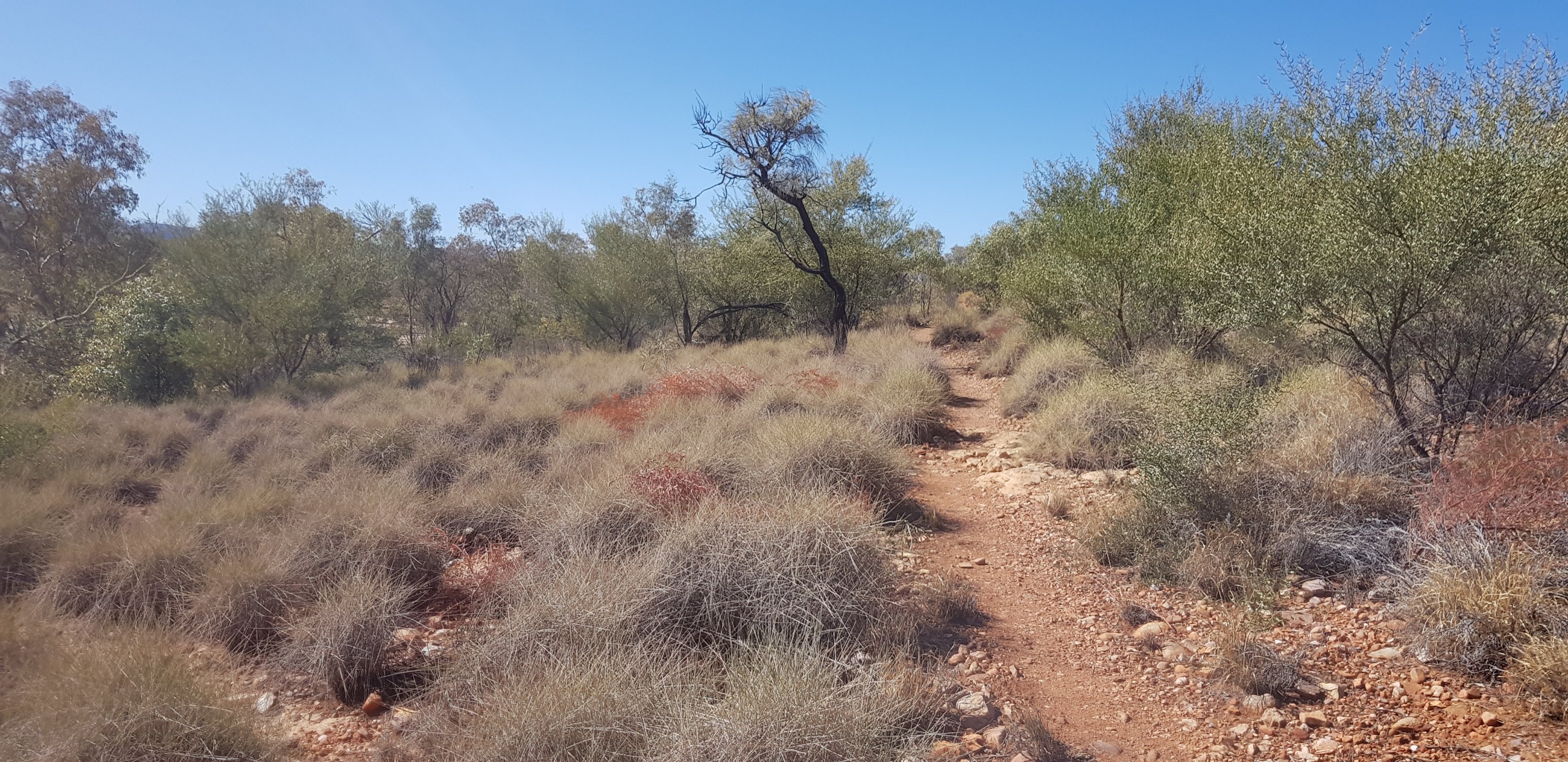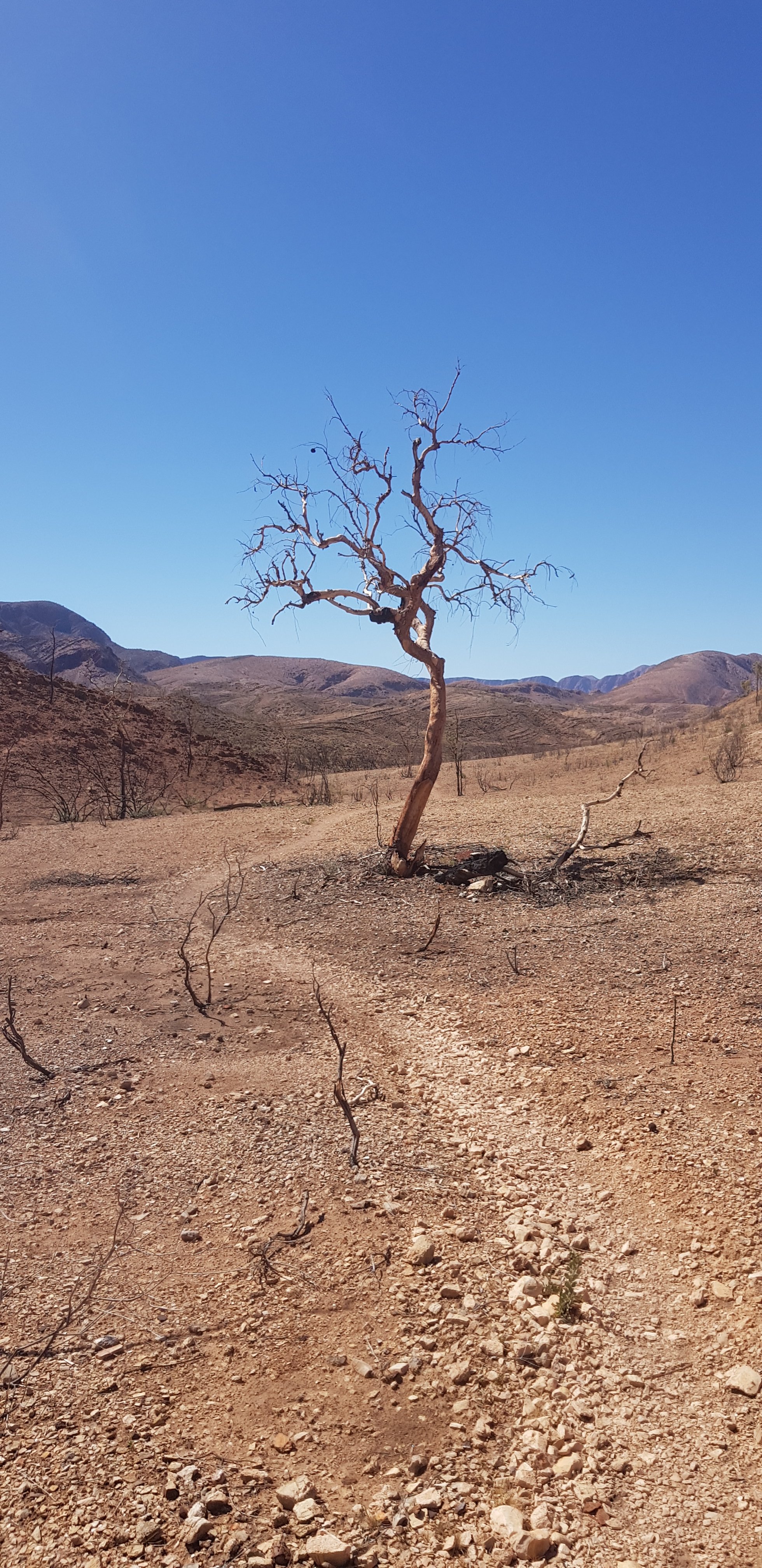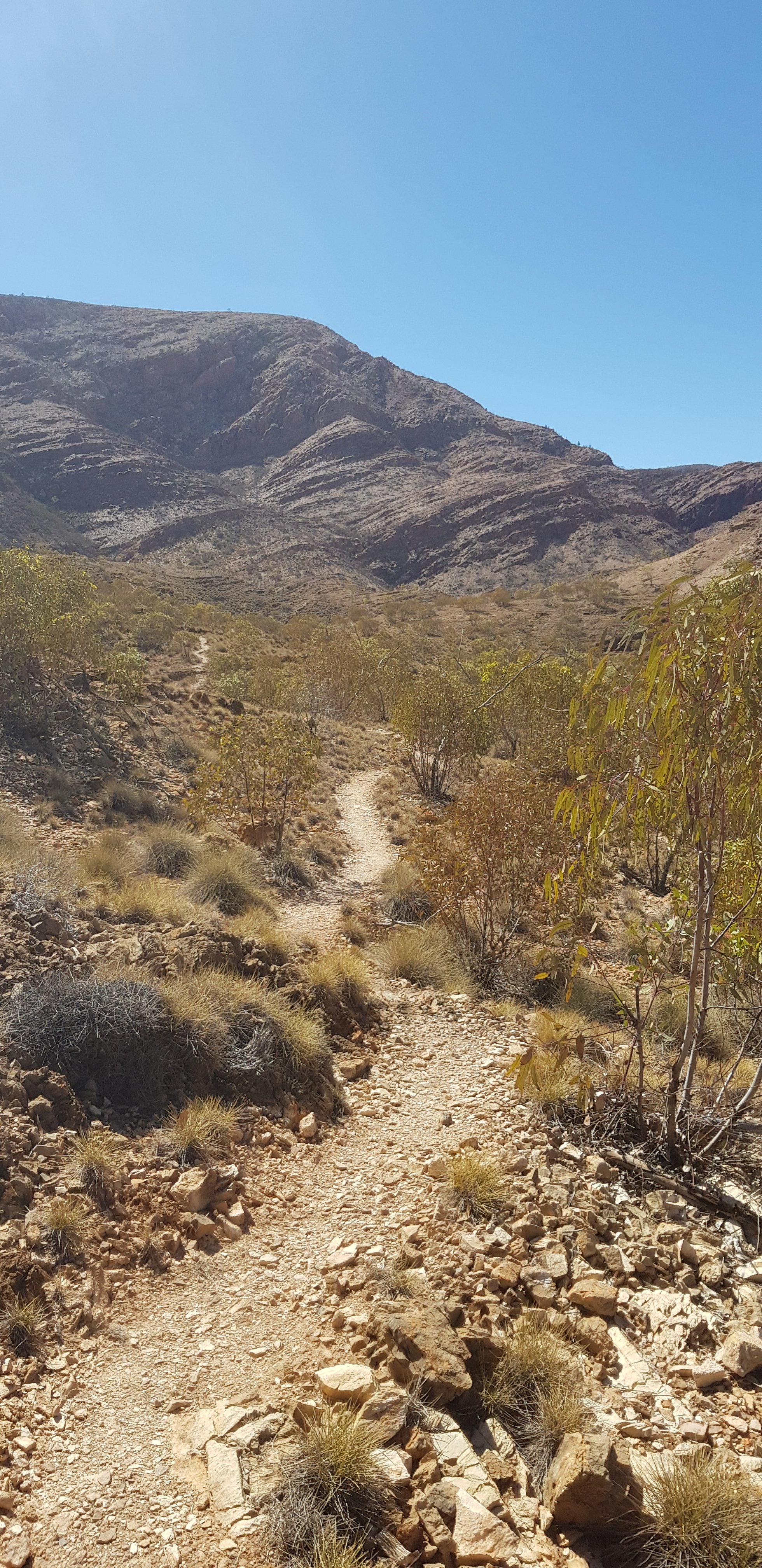 From Finke River the rest of the day’s walk was through pretty barren, rocky landscape. Major fires went through a big section of the park at the start of 2019 and burnt all the spinifex, grass and trees in their path. It’s left the landscape bare and rocky and it’s hard to imagine how it will recover. There are signs of green in certain areas, but there hasn’t been enough meaningful rain to really make a difference. That certainly shows with all the dry creeks I’ve crossed along the way. There has been absolutely no water other than the waterholes at Redbank Gorge and Ormiston Gorge and even those have been small compared with photos I’ve seen. Some photos and blogs show the waterhole at Ormiston Gorge filling the whole gorge and people needing to wade or swim across!
