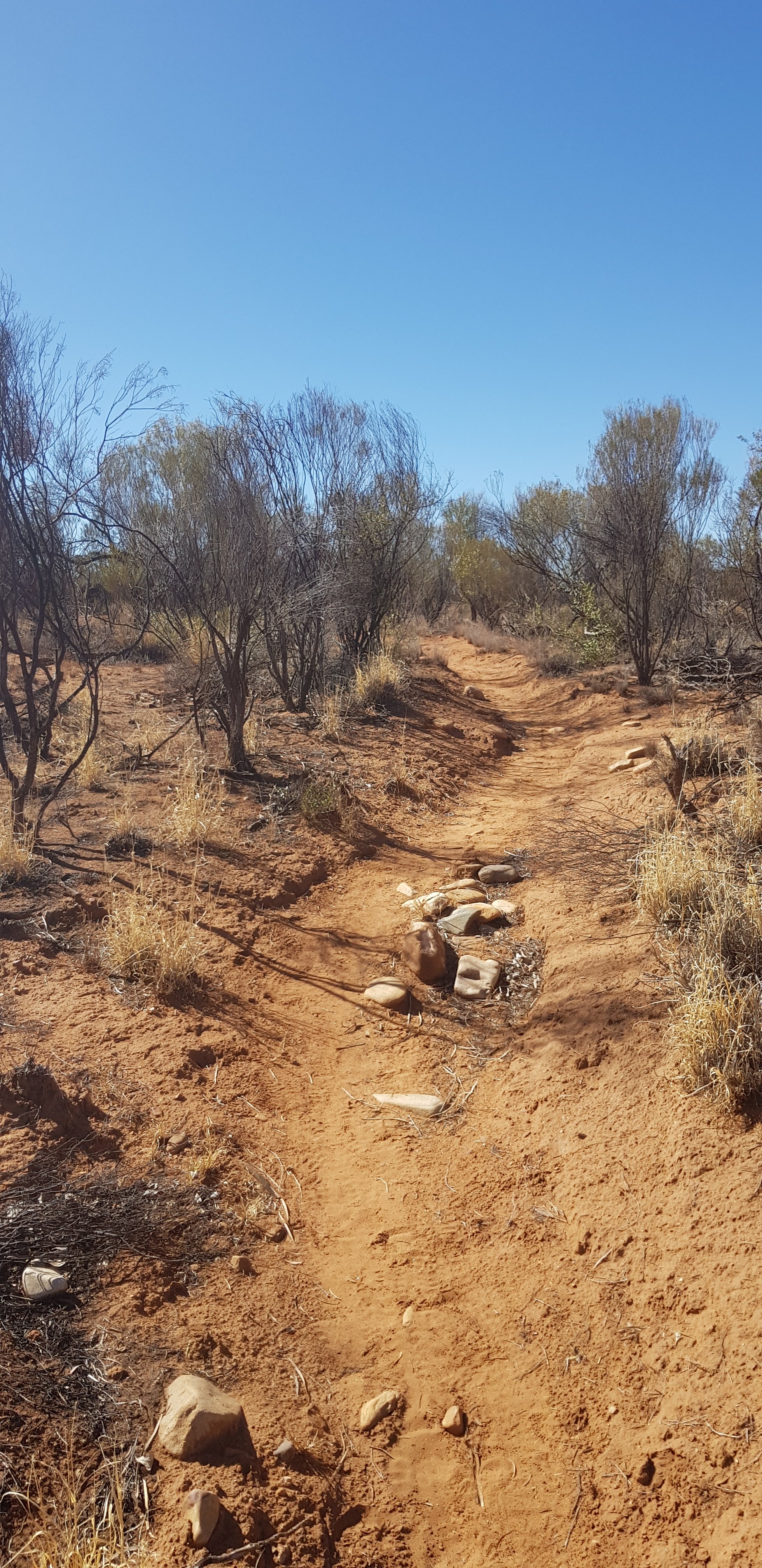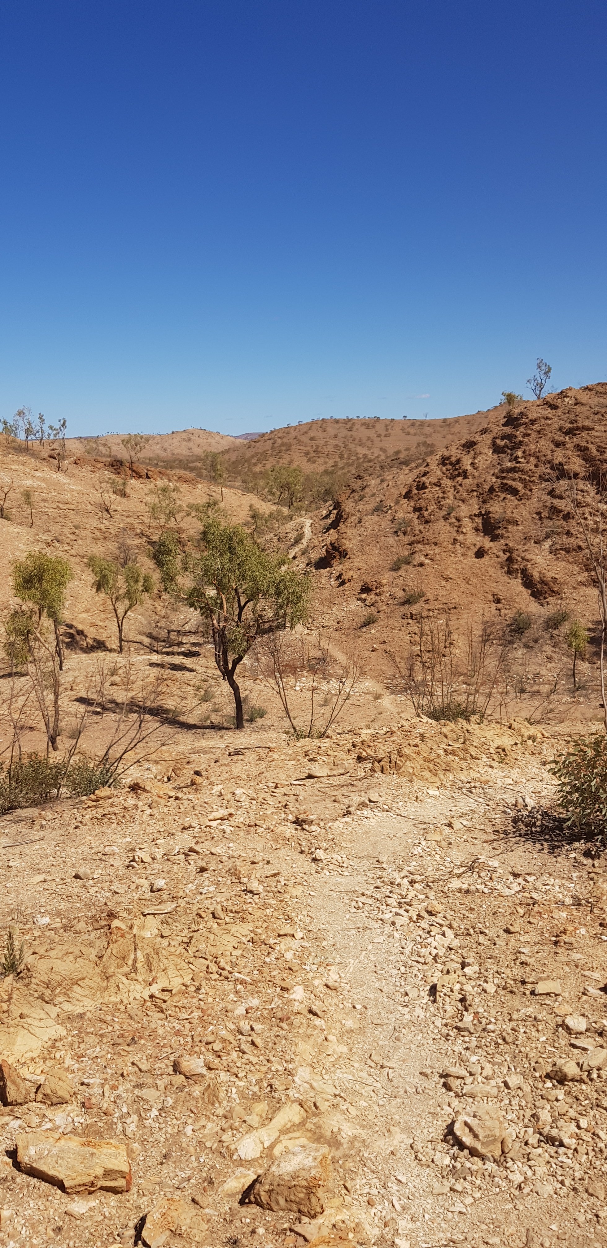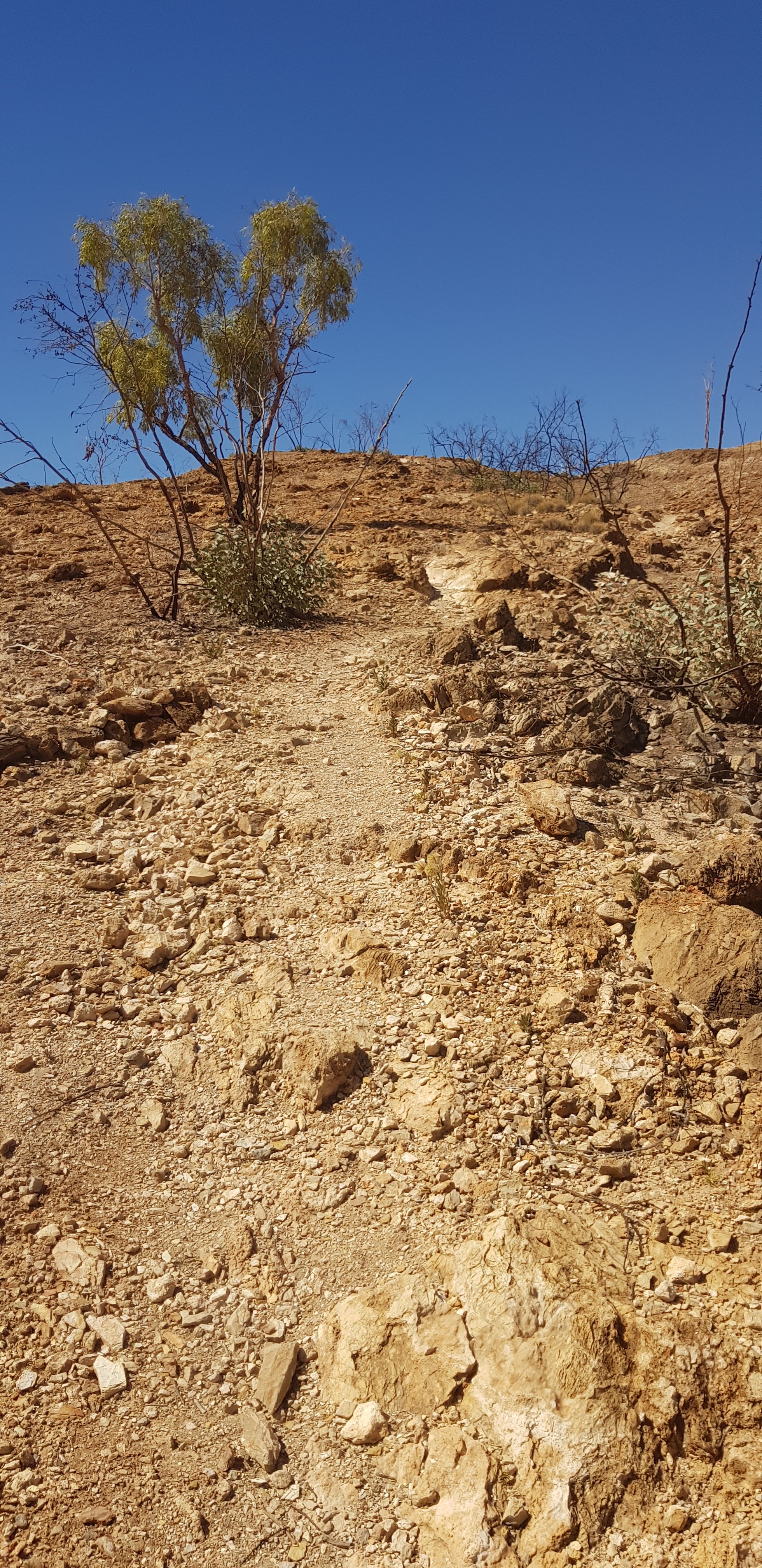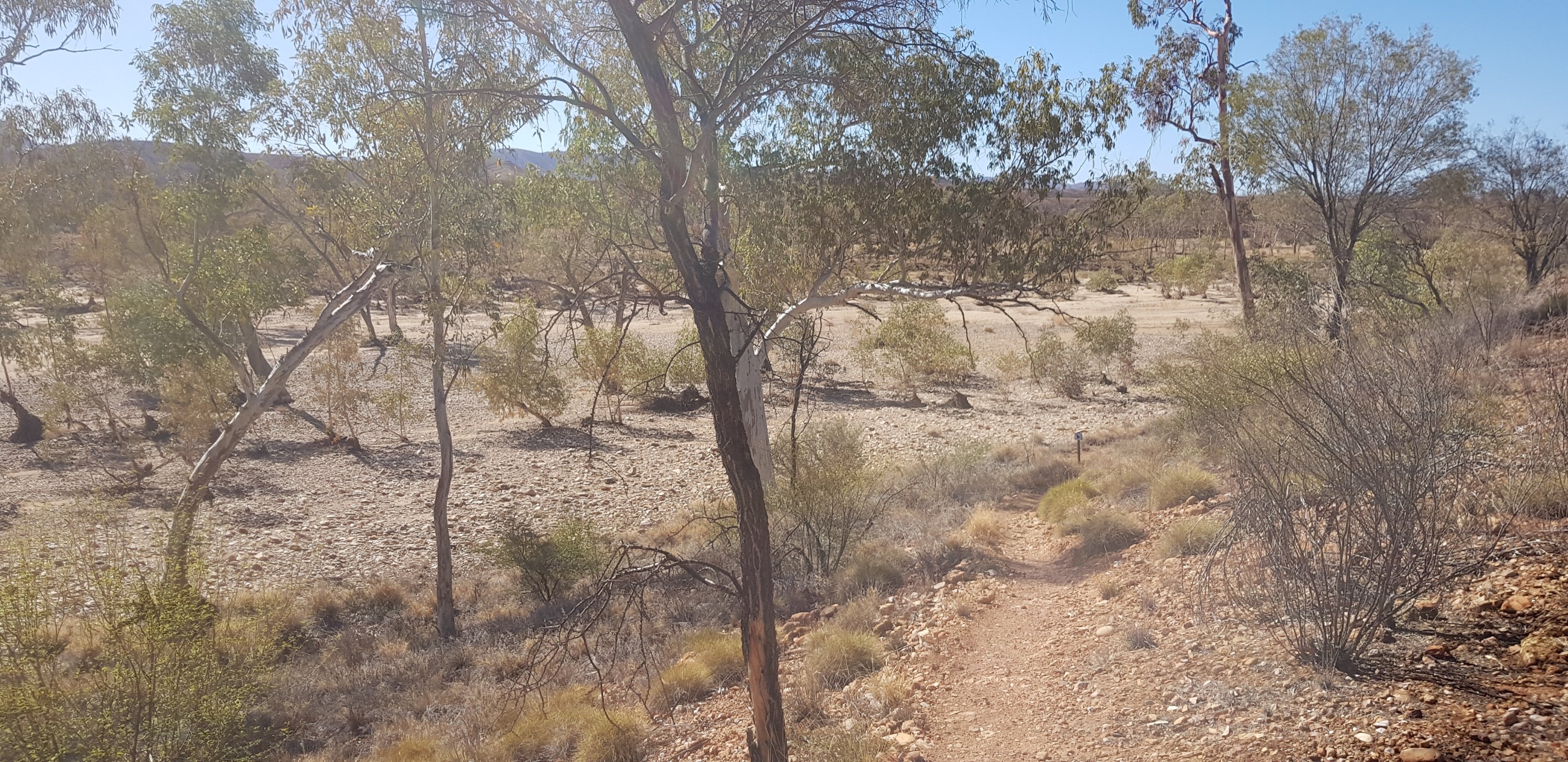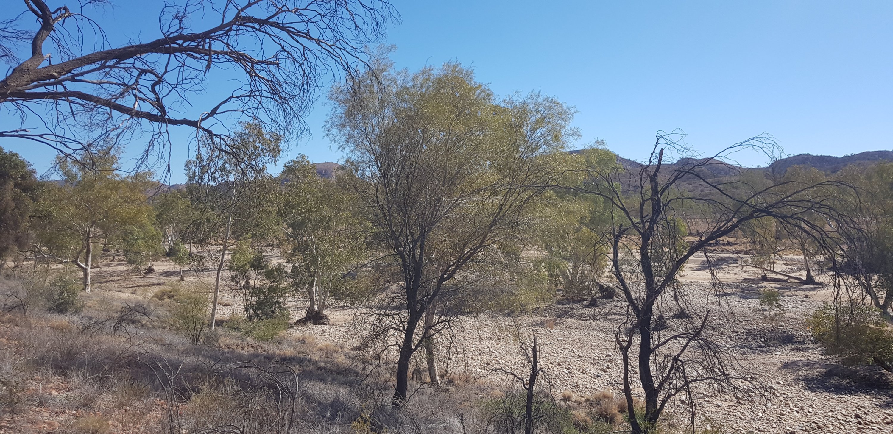 From Finke River the rest of the day’s walk was through pretty barren, rocky landscape. Major fires went through a big section of the park at the start of 2019 and burnt all the spinifex, grass and trees in their path. It’s left the landscape bare and rocky and it’s hard to imagine how it will recover. There are signs of green in certain areas, but there hasn’t been enough meaningful rain to really make a difference. That certainly shows with all the dry creeks I’ve crossed along the way. There has been absolutely no water other than the waterholes at Redbank Gorge and Ormiston Gorge and even those have been small compared with photos I’ve seen. Some photos and blogs show the waterhole at Ormiston Gorge filling the whole gorge and people needing to wade or swim across!