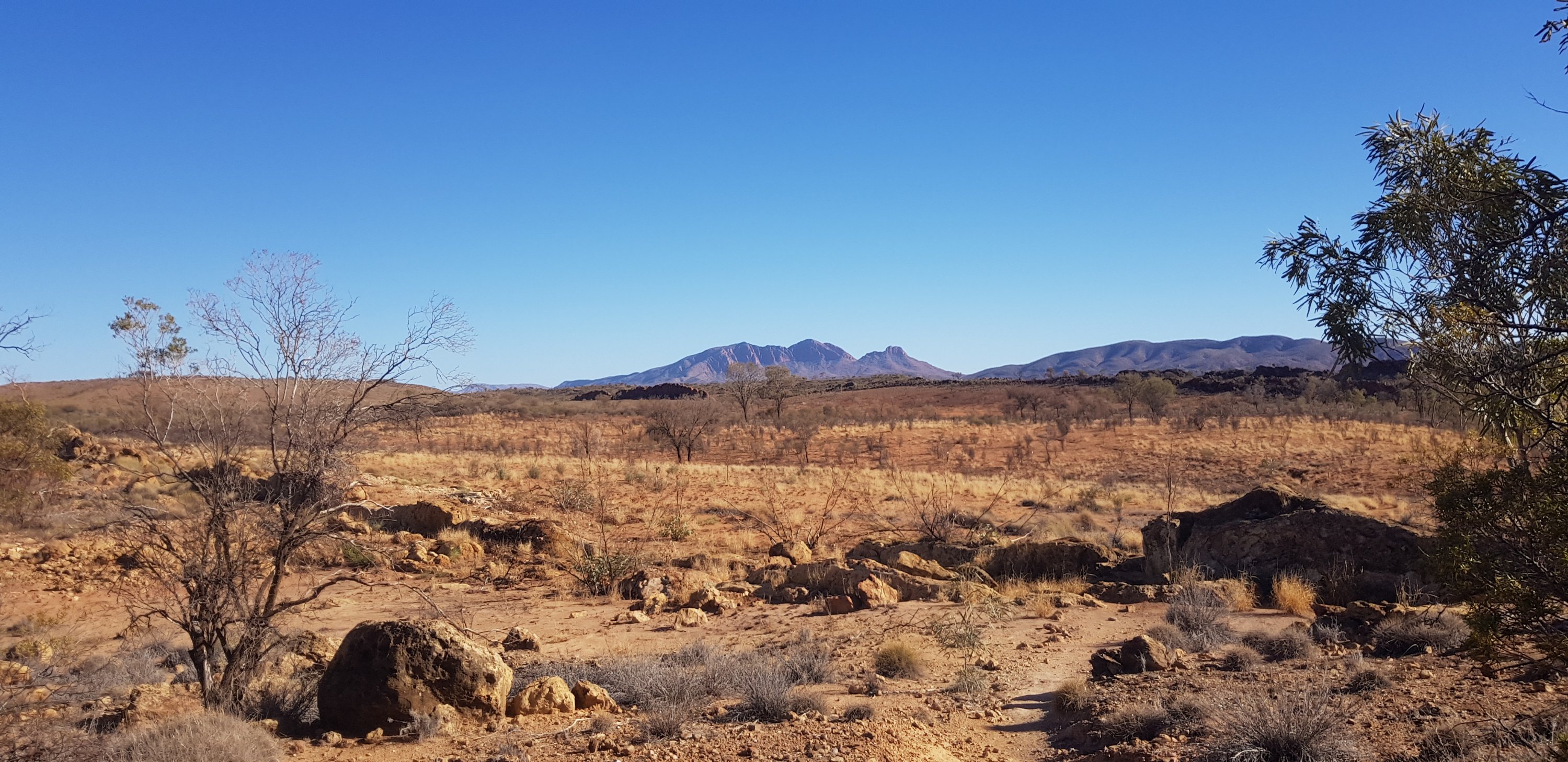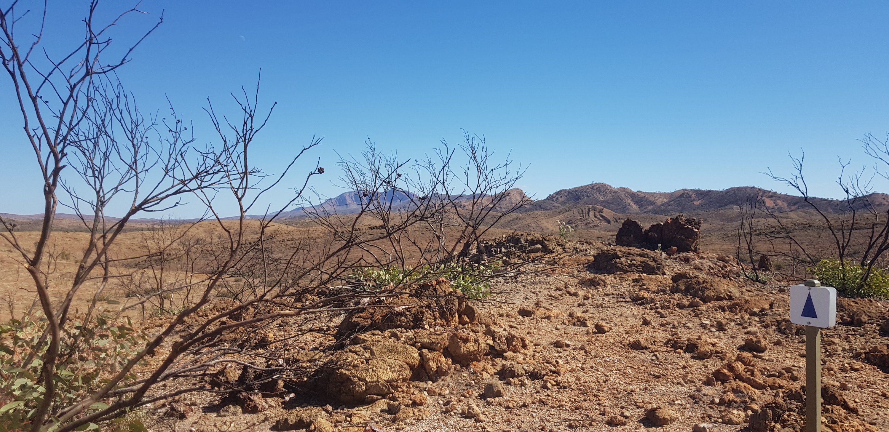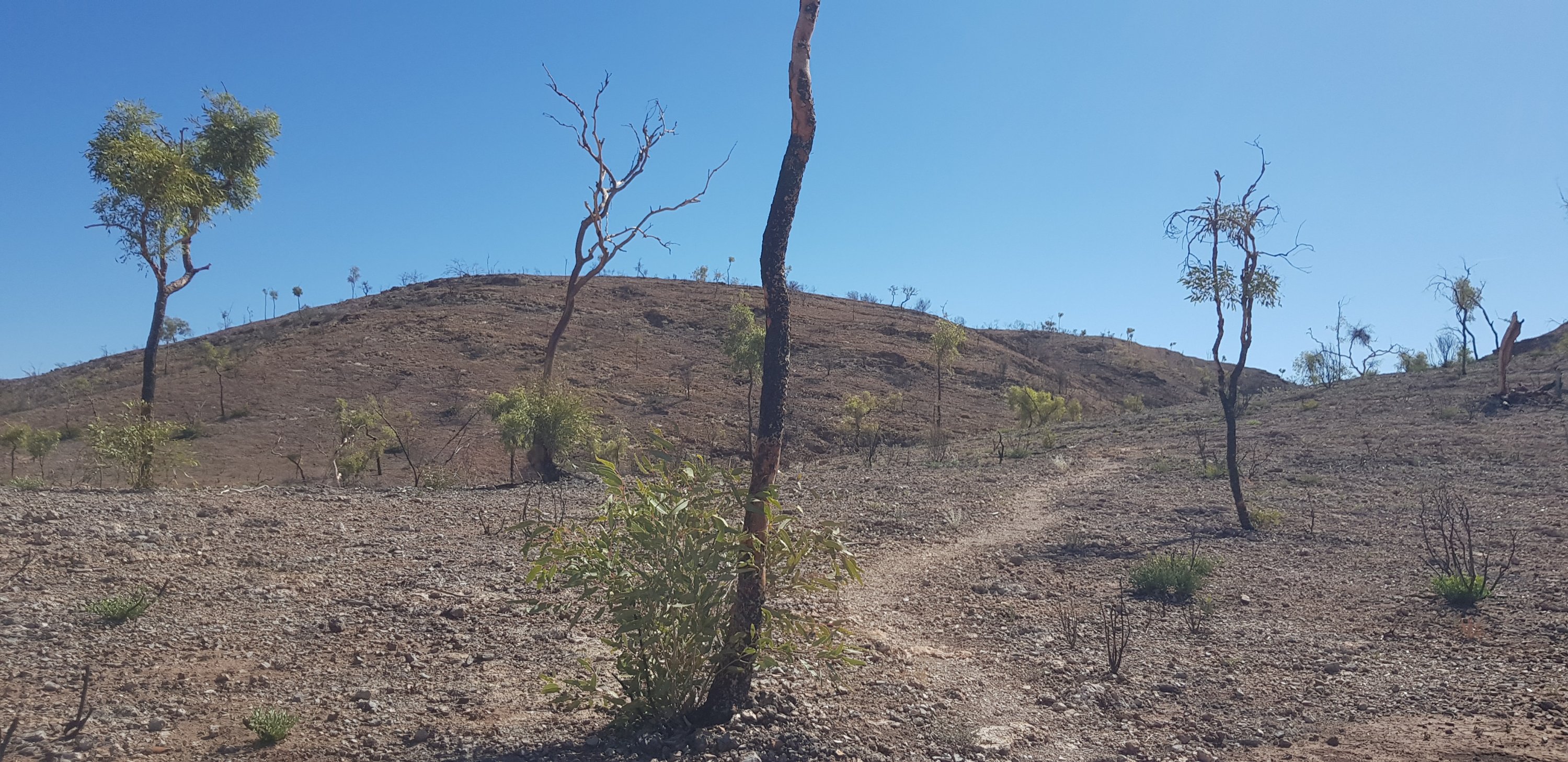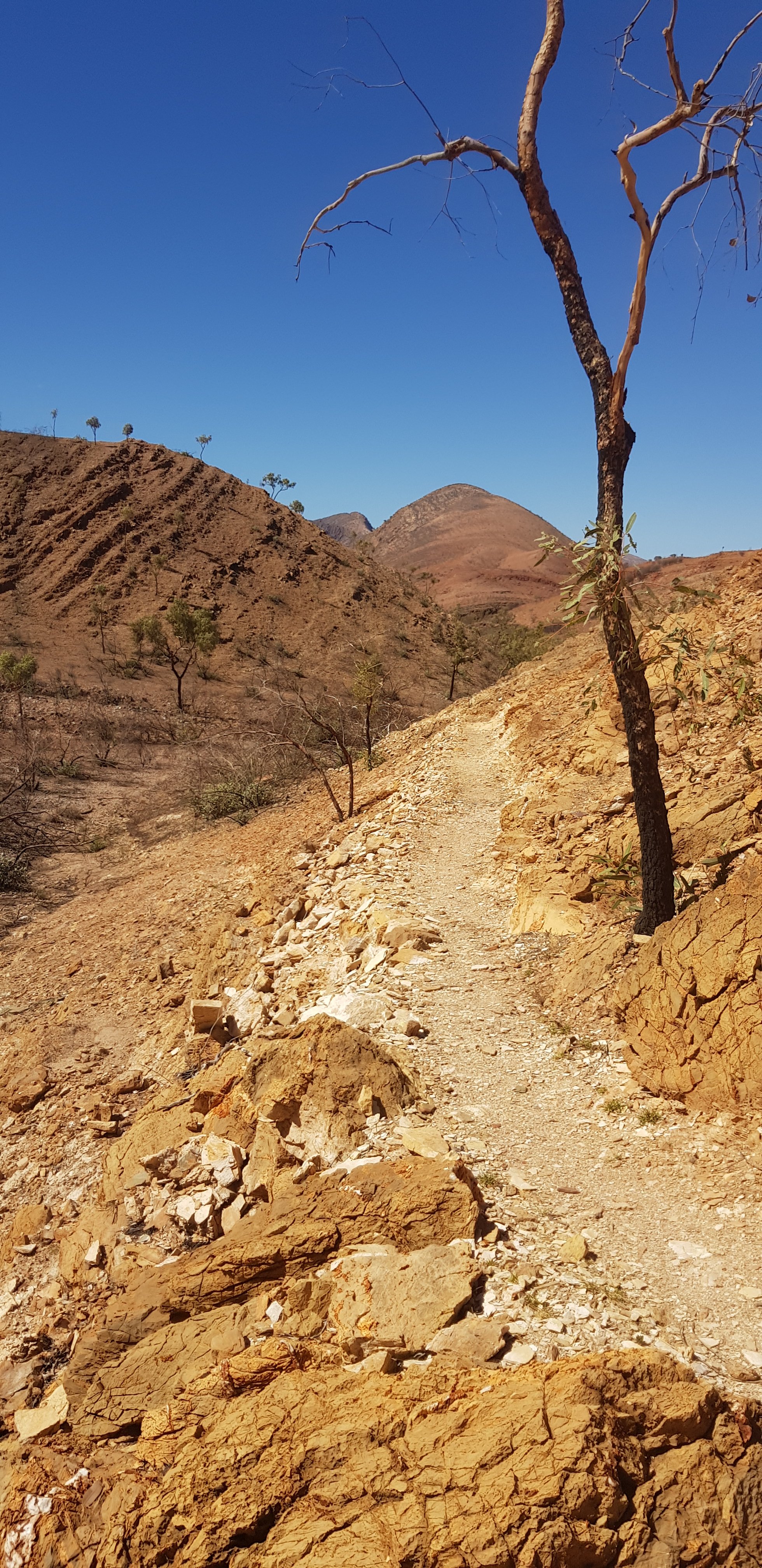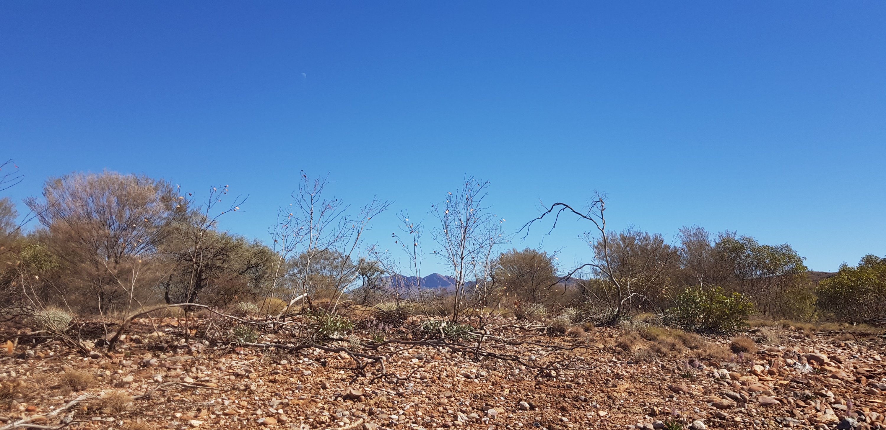 From Finke River the rest of the day’s walk was through pretty barren, rocky landscape. Major fires went through a big section of the park at the start of 2019 and burnt all the spinifex, grass and trees in their path. It’s left the landscape bare and rocky and it’s hard to imagine how it will recover. There are signs of green in certain areas, but there hasn’t been enough meaningful rain to really make a difference. That certainly shows with all the dry creeks I’ve crossed along the way. There has been absolutely no water other than the waterholes at Redbank Gorge and Ormiston Gorge and even those have been small compared with photos I’ve seen. Some photos and blogs show the waterhole at Ormiston Gorge filling the whole gorge and people needing to wade or swim across!