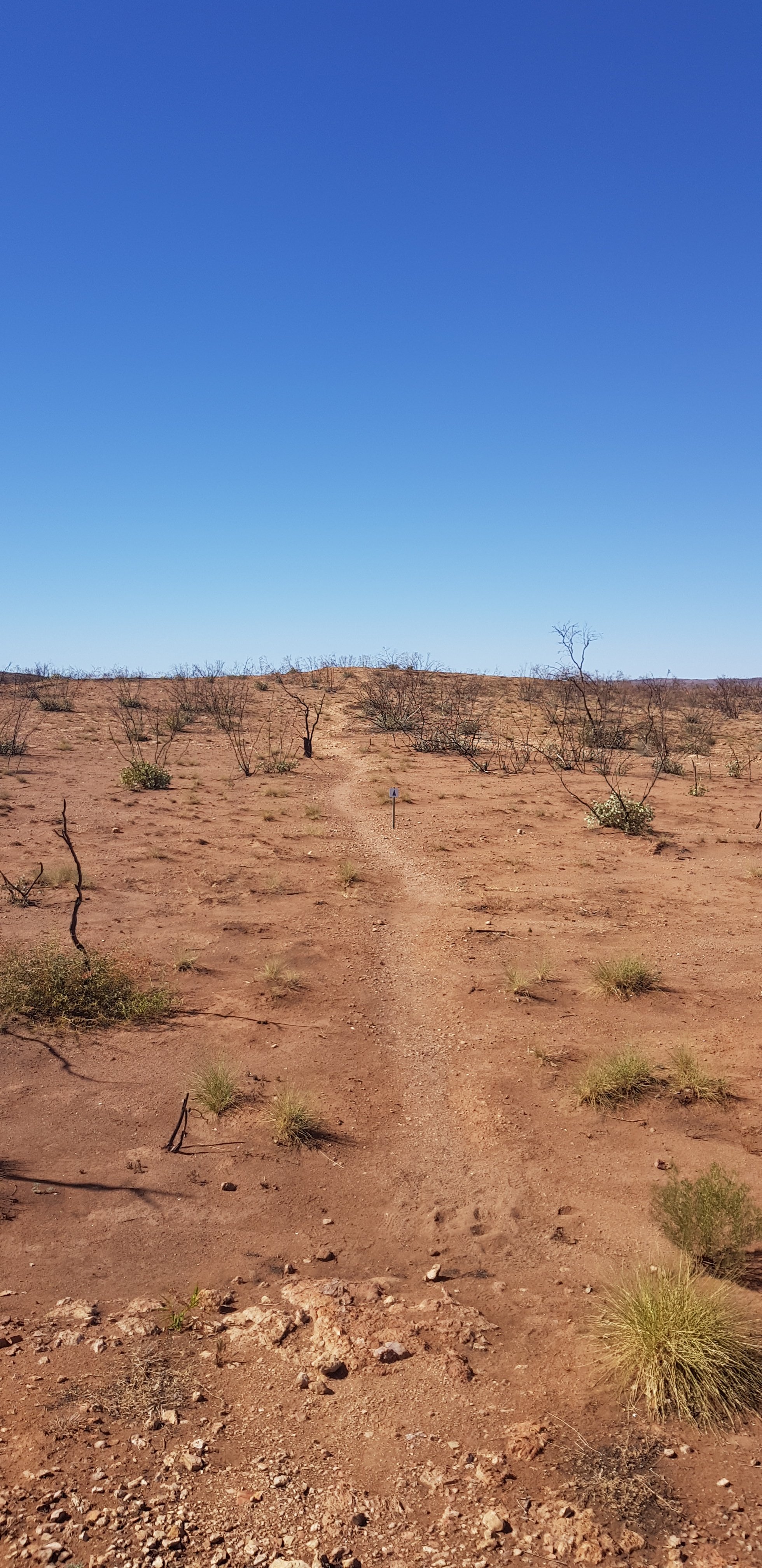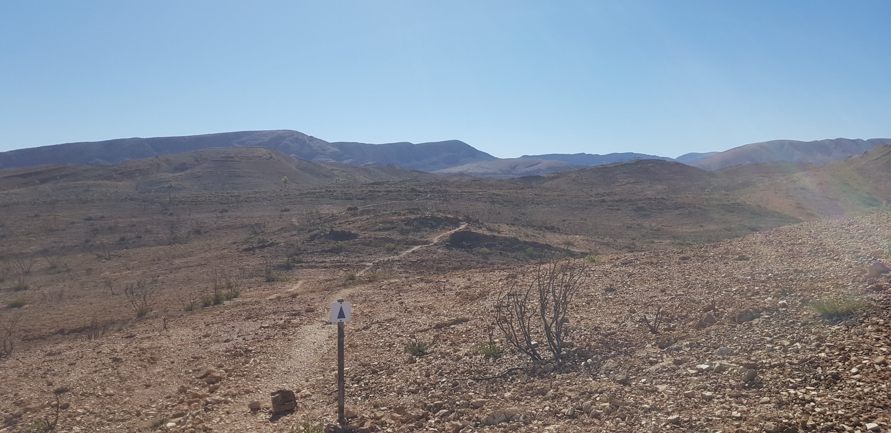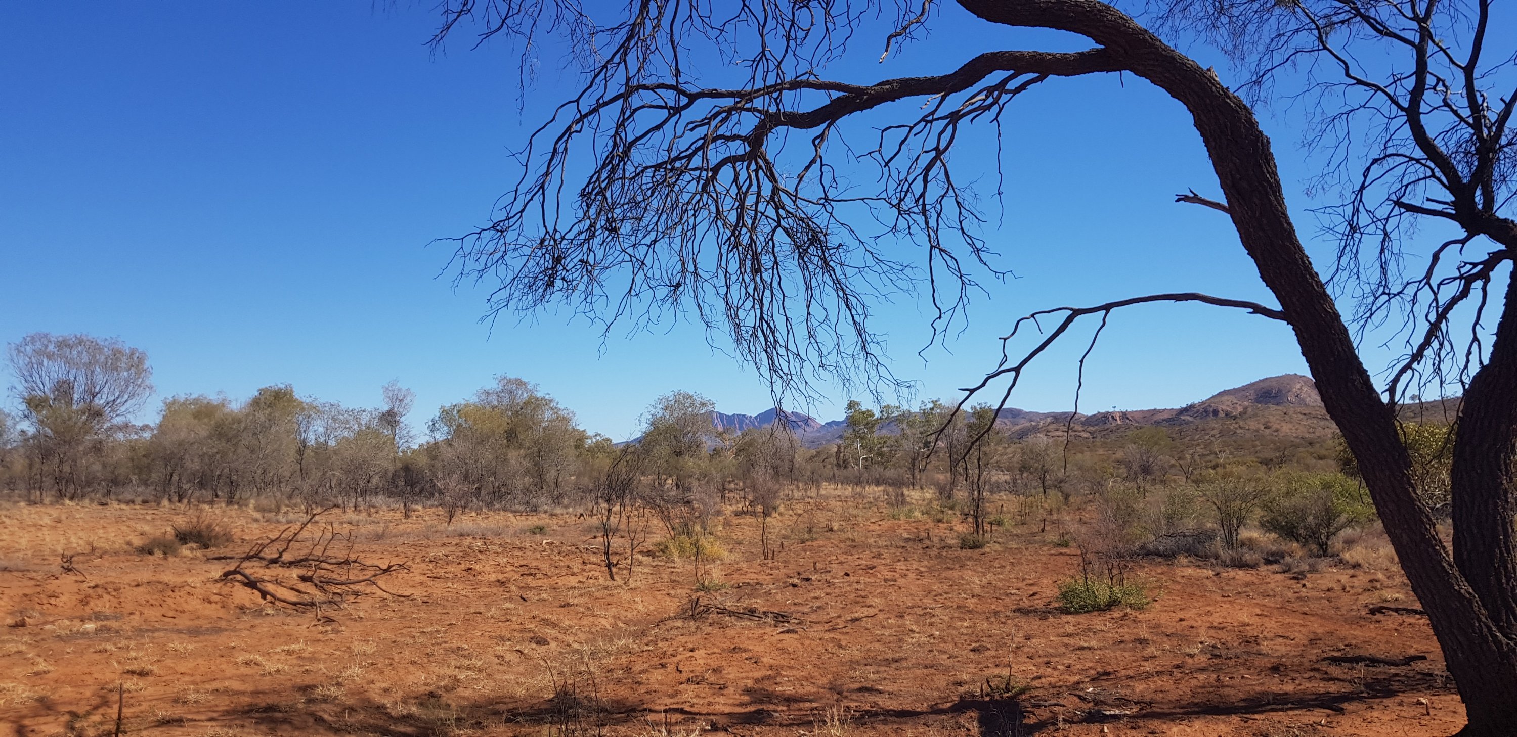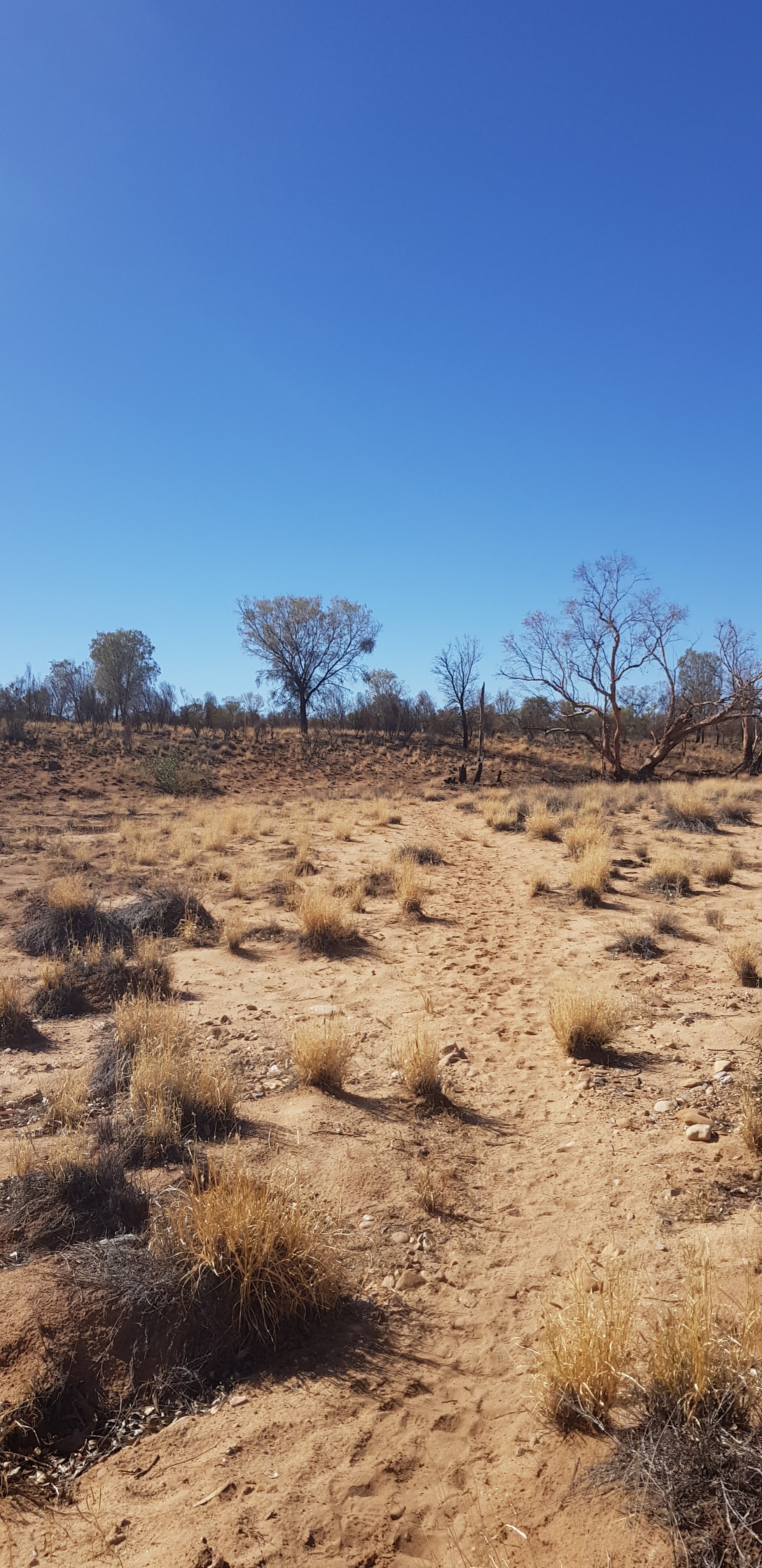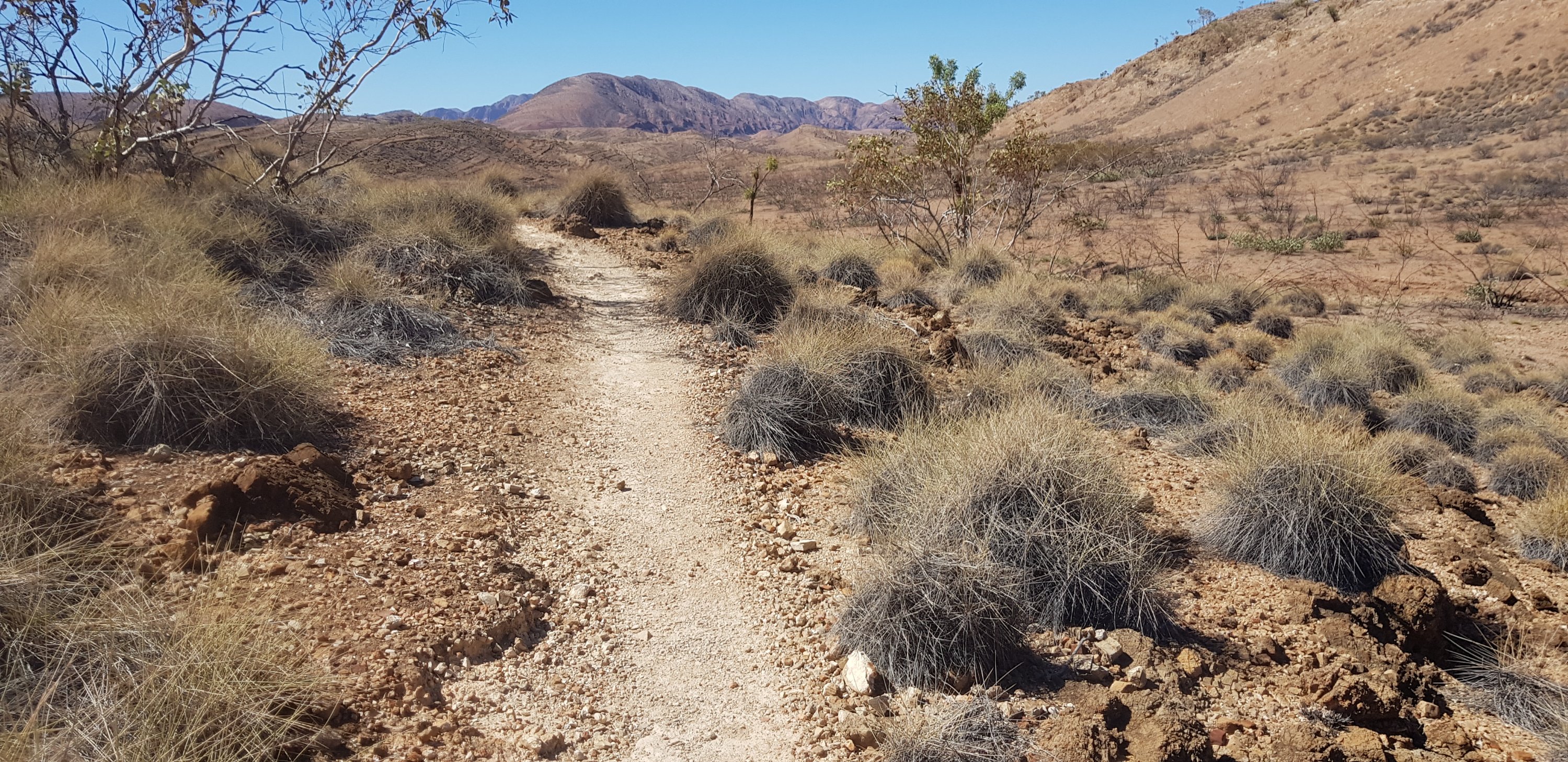 From Finke River the rest of the day’s walk was through pretty barren, rocky landscape. Major fires went through a big section of the park at the start of 2019 and burnt all the spinifex, grass and trees in their path. It’s left the landscape bare and rocky and it’s hard to imagine how it will recover. There are signs of green in certain areas, but there hasn’t been enough meaningful rain to really make a difference. That certainly shows with all the dry creeks I’ve crossed along the way. There has been absolutely no water other than the waterholes at Redbank Gorge and Ormiston Gorge and even those have been small compared with photos I’ve seen. Some photos and blogs show the waterhole at Ormiston Gorge filling the whole gorge and people needing to wade or swim across!
