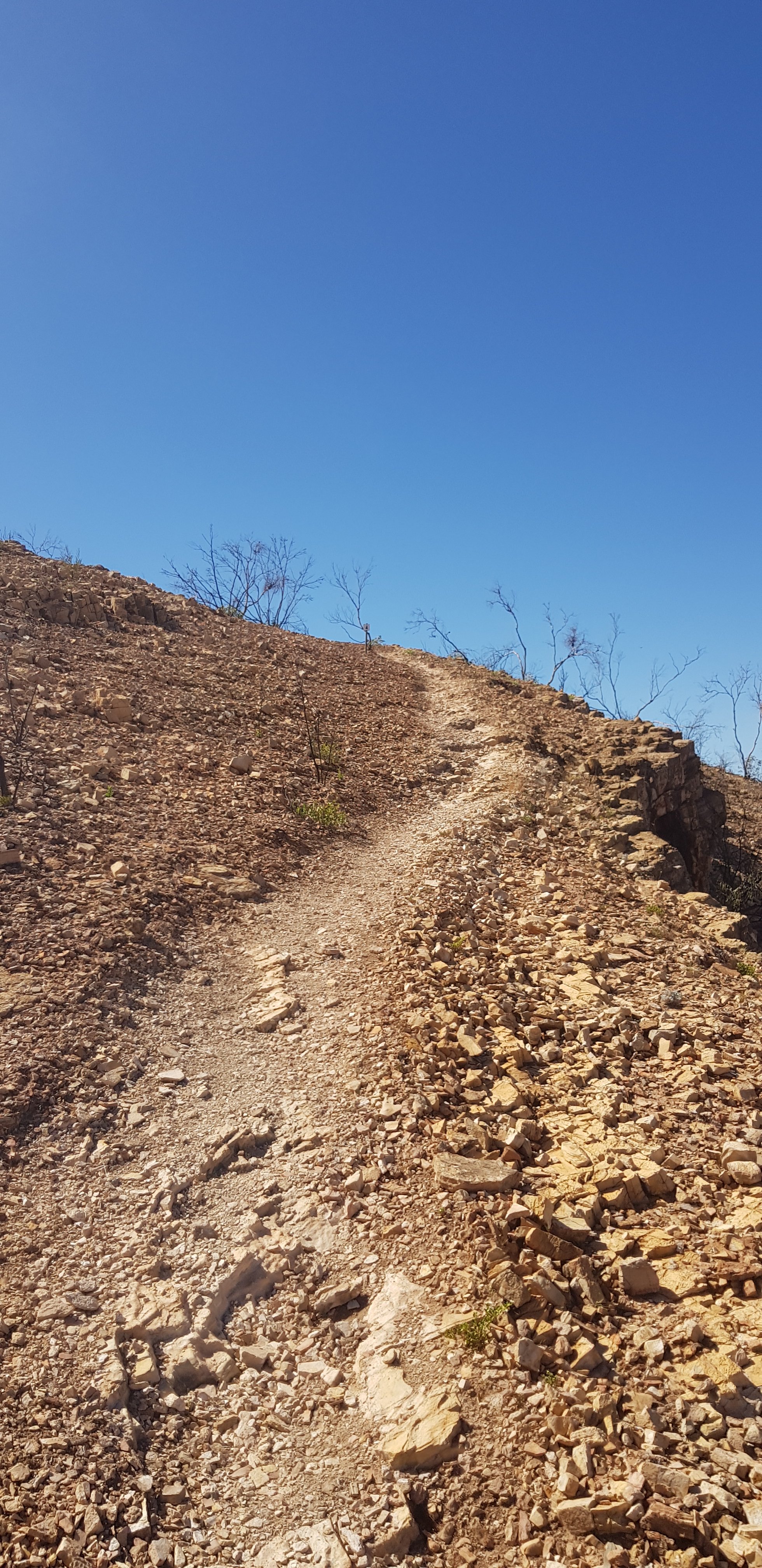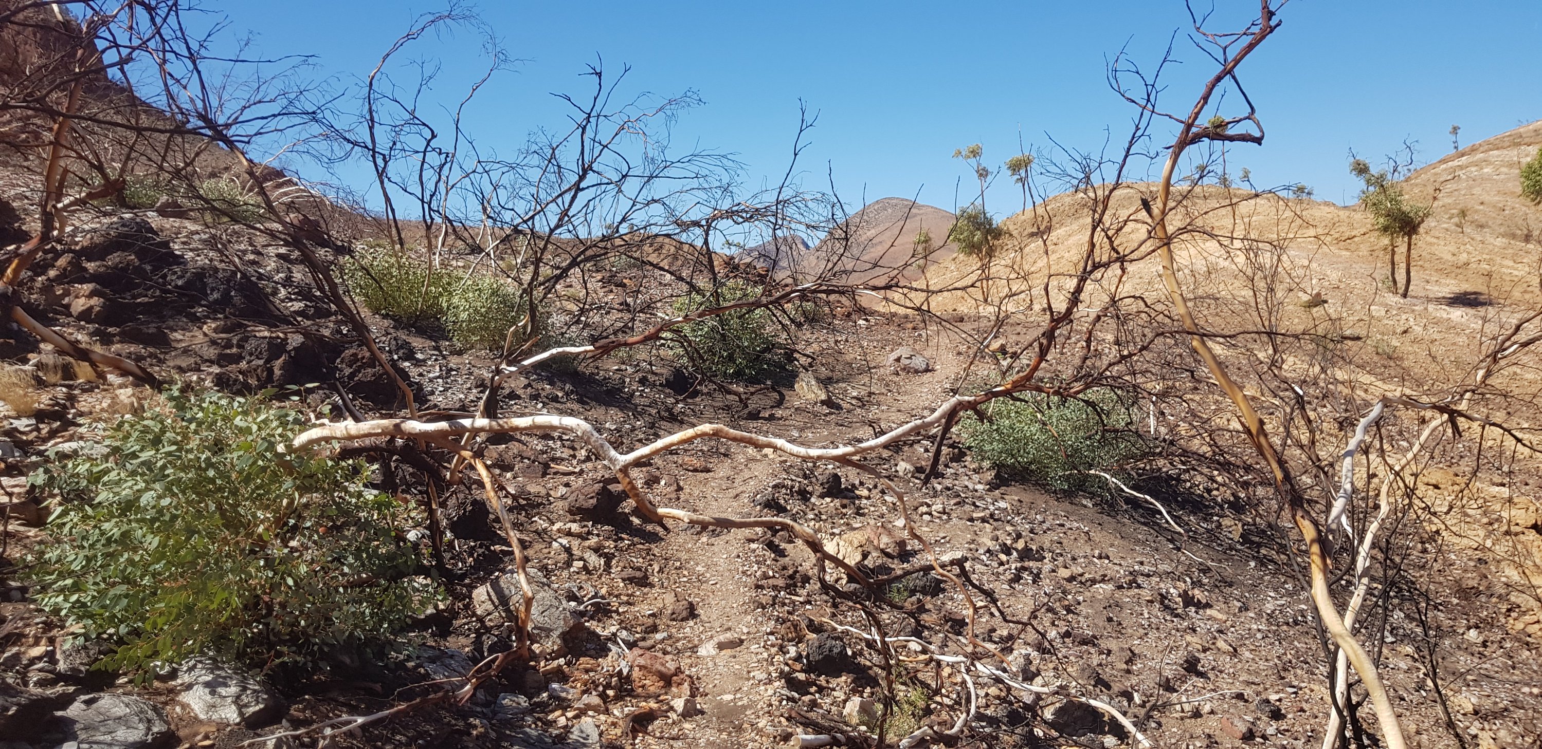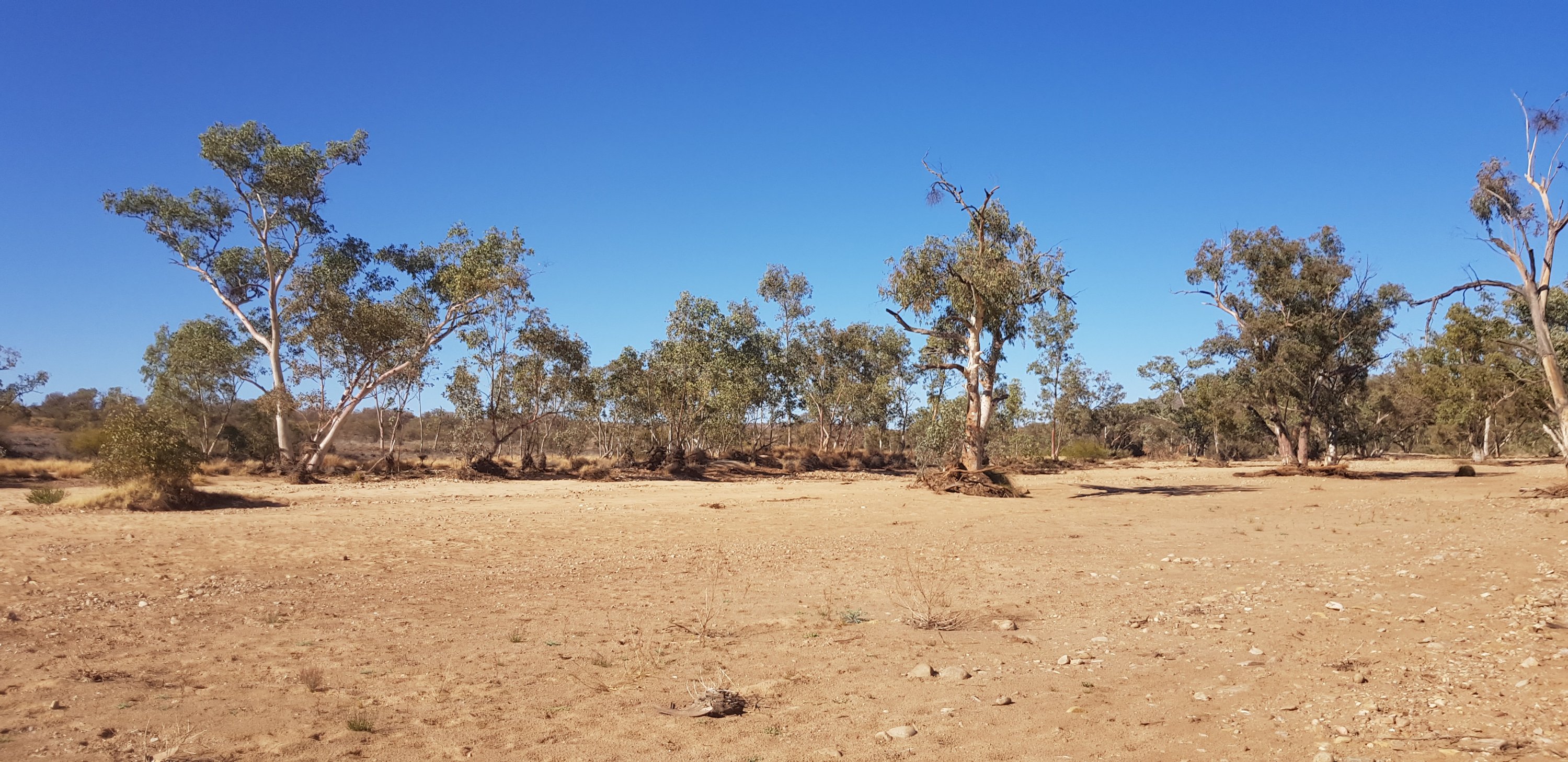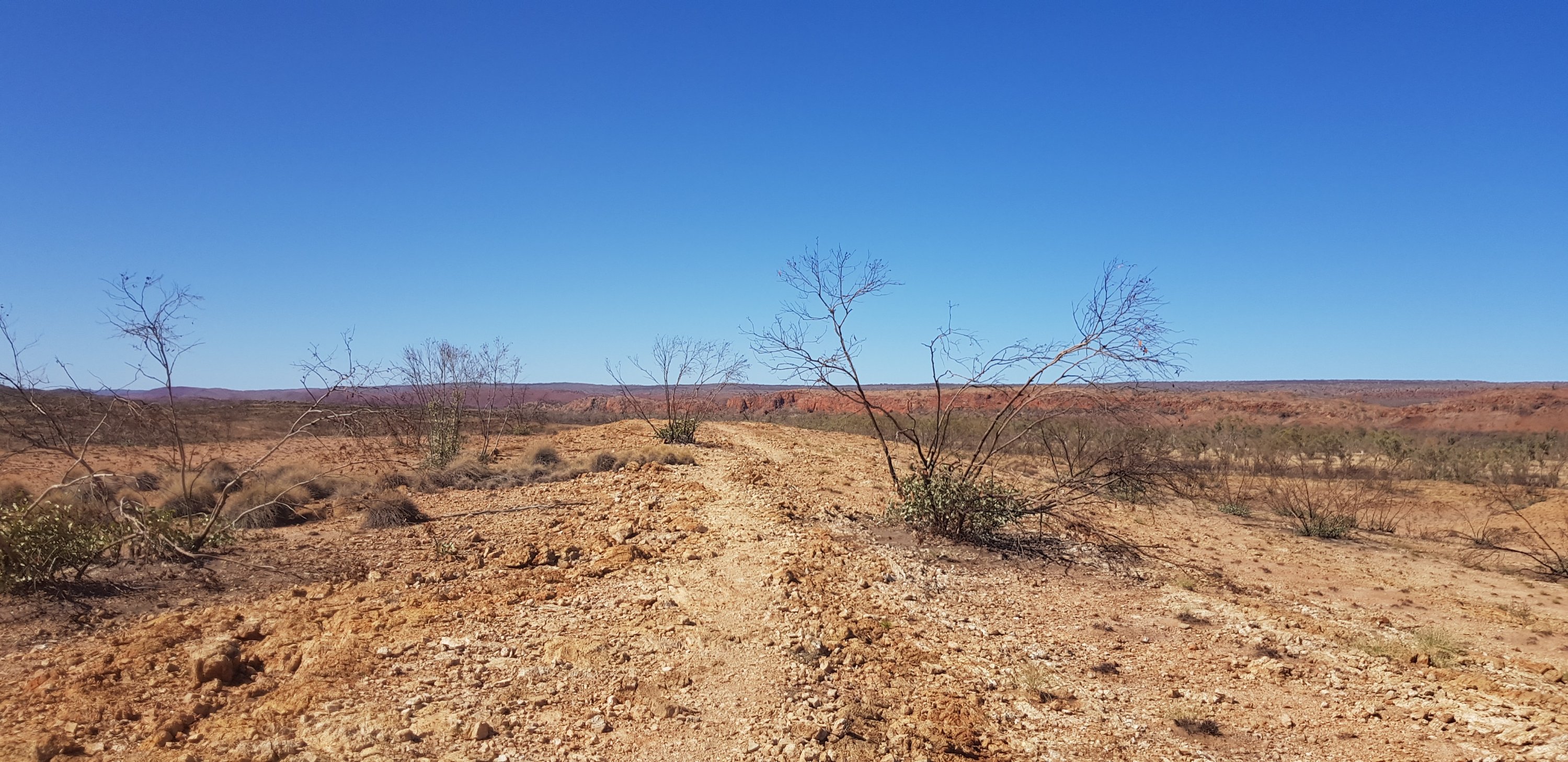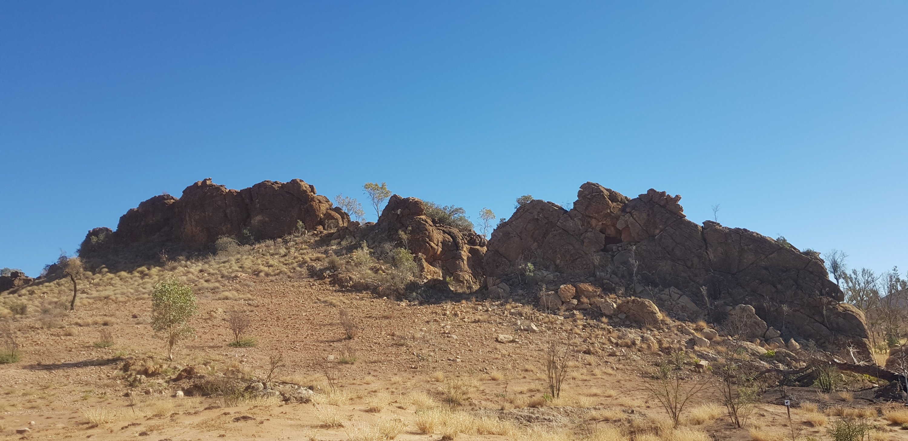 From Finke River the rest of the day’s walk was through pretty barren, rocky landscape. Major fires went through a big section of the park at the start of 2019 and burnt all the spinifex, grass and trees in their path. It’s left the landscape bare and rocky and it’s hard to imagine how it will recover. There are signs of green in certain areas, but there hasn’t been enough meaningful rain to really make a difference. That certainly shows with all the dry creeks I’ve crossed along the way. There has been absolutely no water other than the waterholes at Redbank Gorge and Ormiston Gorge and even those have been small compared with photos I’ve seen. Some photos and blogs show the waterhole at Ormiston Gorge filling the whole gorge and people needing to wade or swim across!
