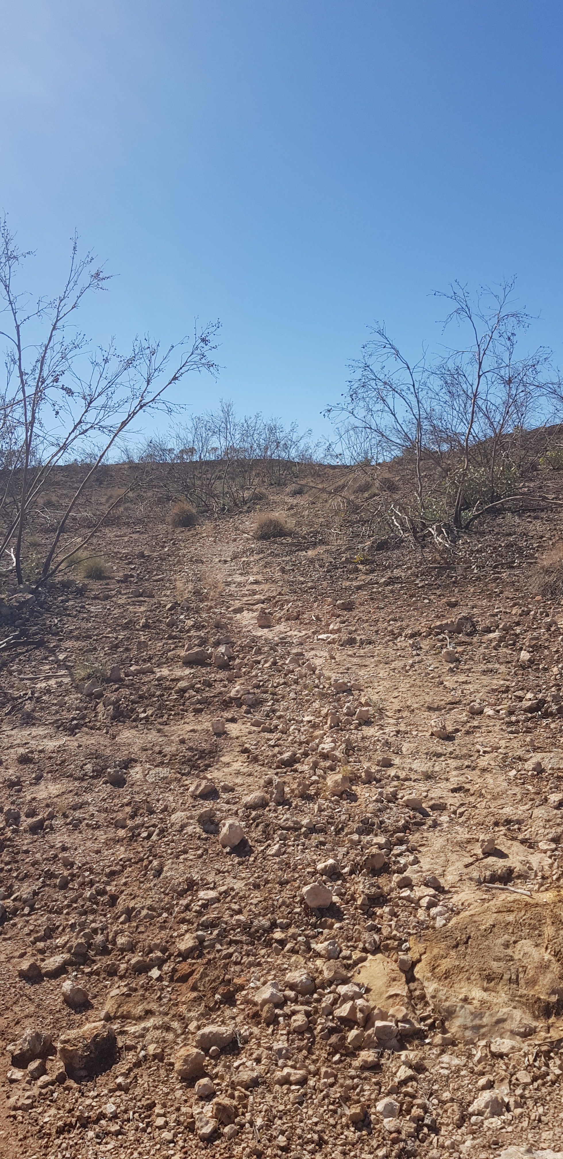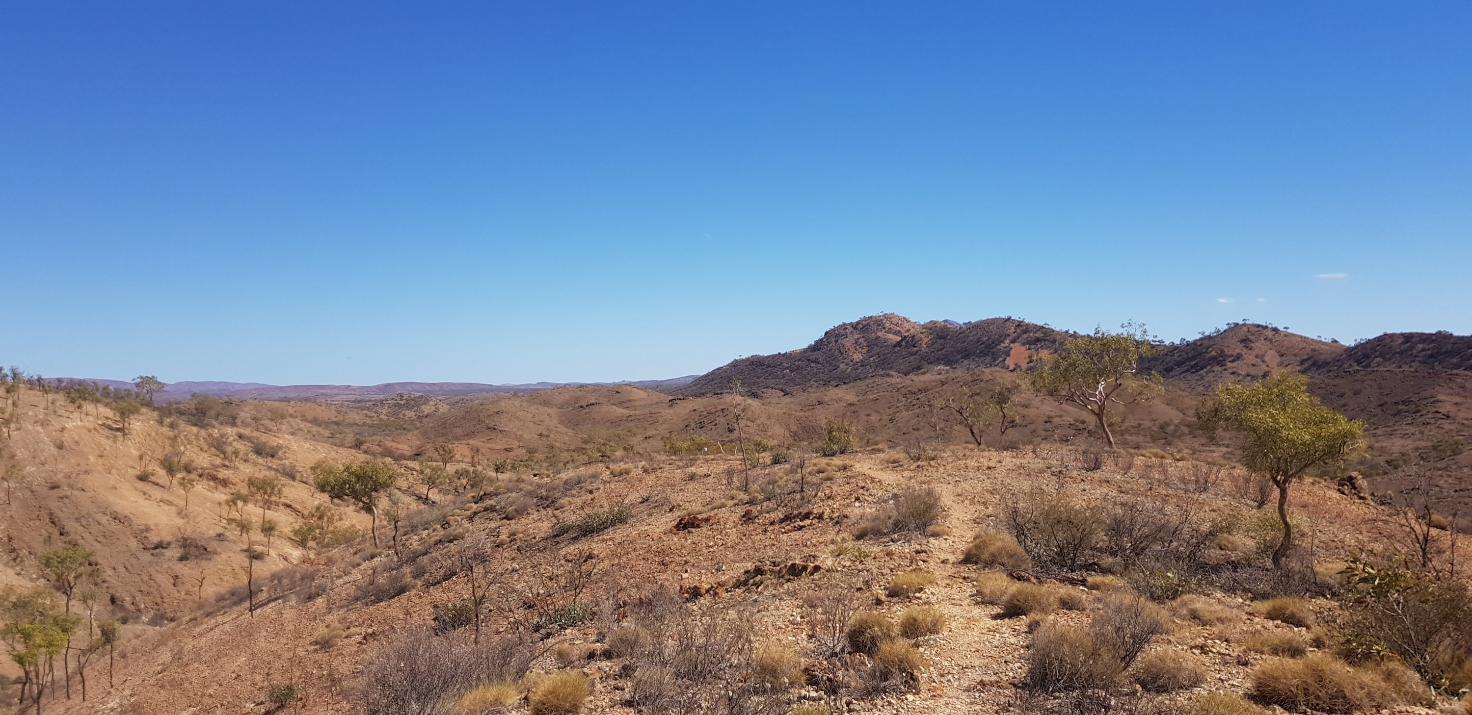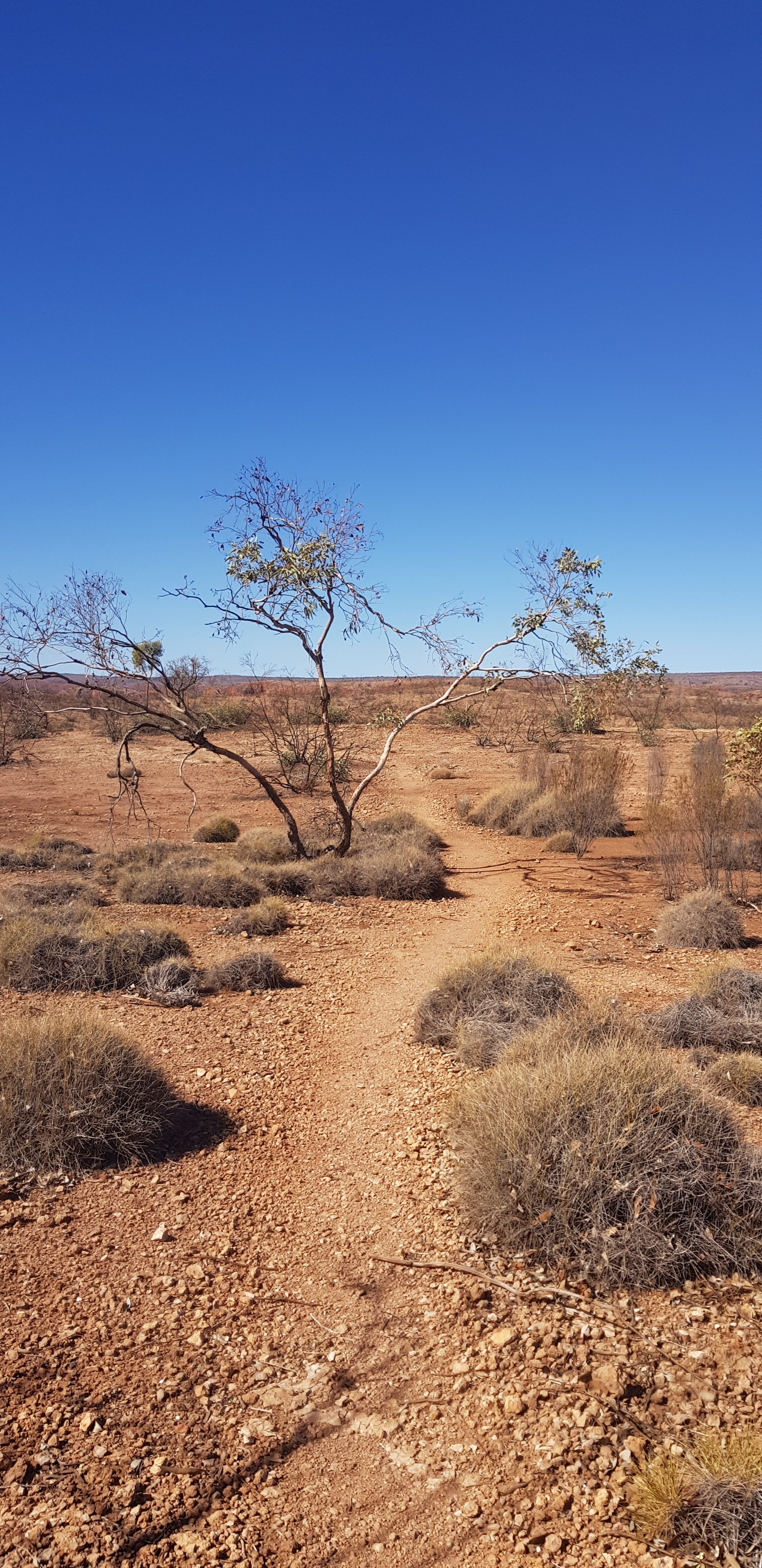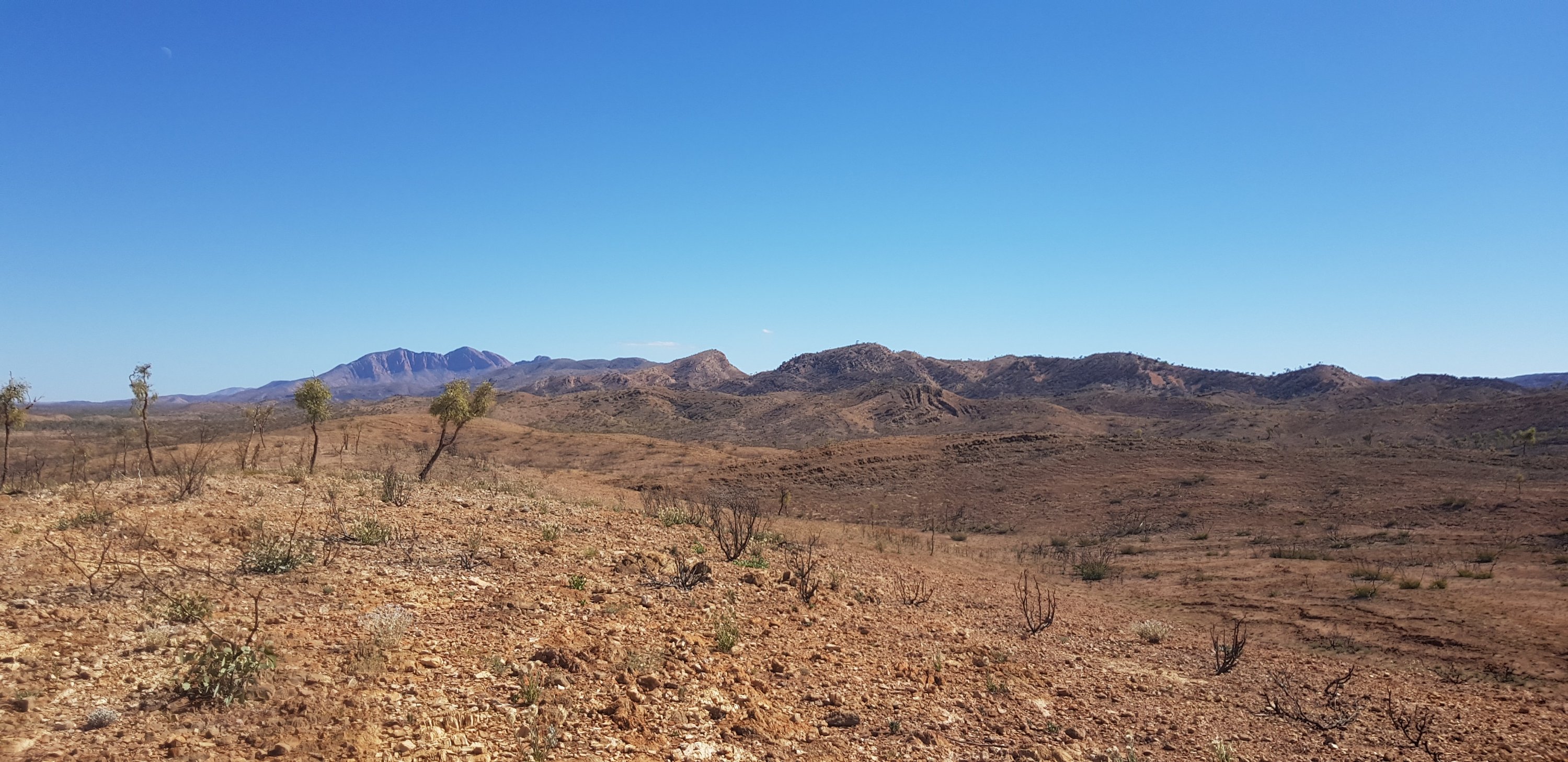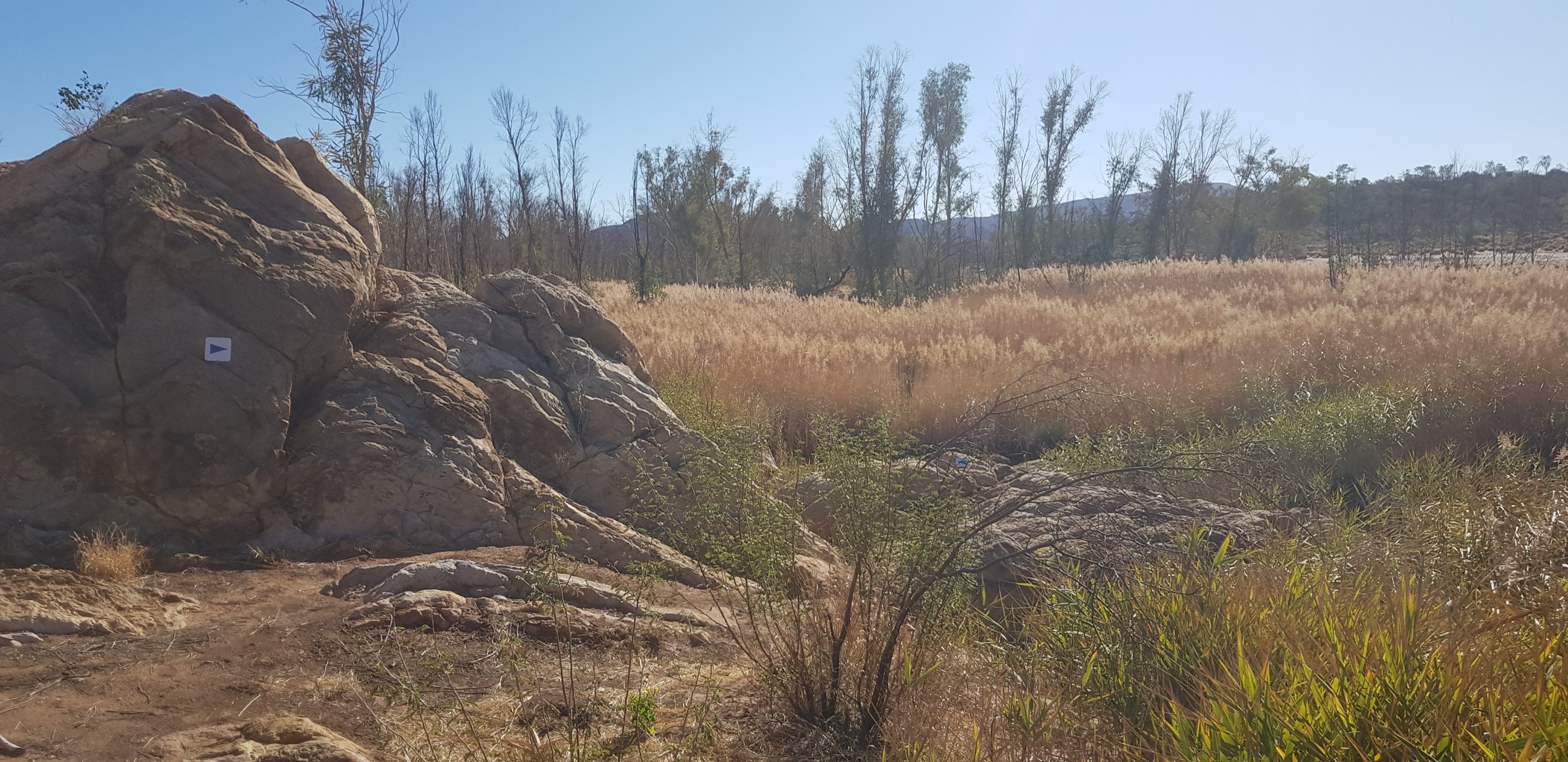 From Finke River the rest of the day’s walk was through pretty barren, rocky landscape. Major fires went through a big section of the park at the start of 2019 and burnt all the spinifex, grass and trees in their path. It’s left the landscape bare and rocky and it’s hard to imagine how it will recover. There are signs of green in certain areas, but there hasn’t been enough meaningful rain to really make a difference. That certainly shows with all the dry creeks I’ve crossed along the way. There has been absolutely no water other than the waterholes at Redbank Gorge and Ormiston Gorge and even those have been small compared with photos I’ve seen. Some photos and blogs show the waterhole at Ormiston Gorge filling the whole gorge and people needing to wade or swim across!
