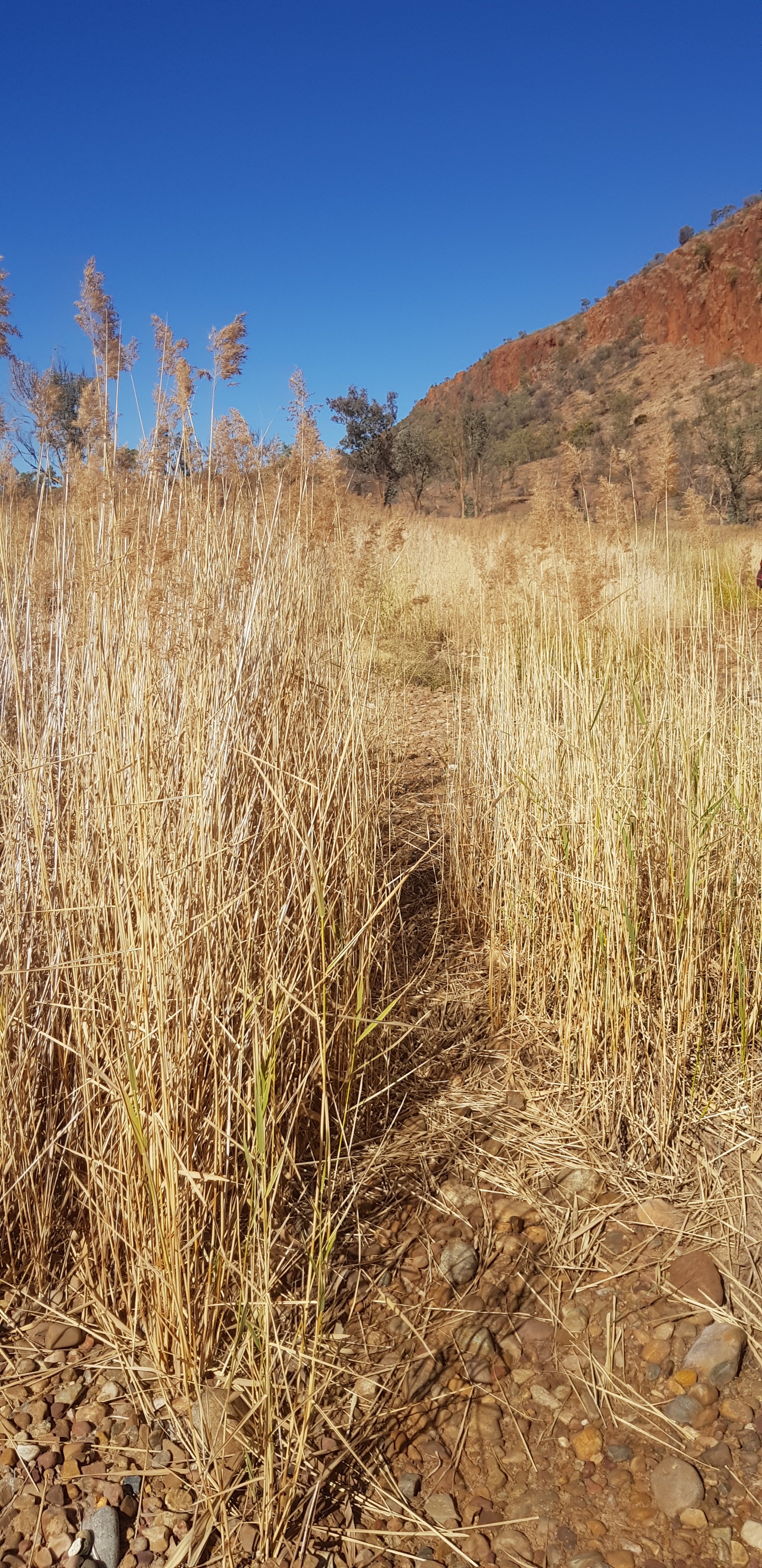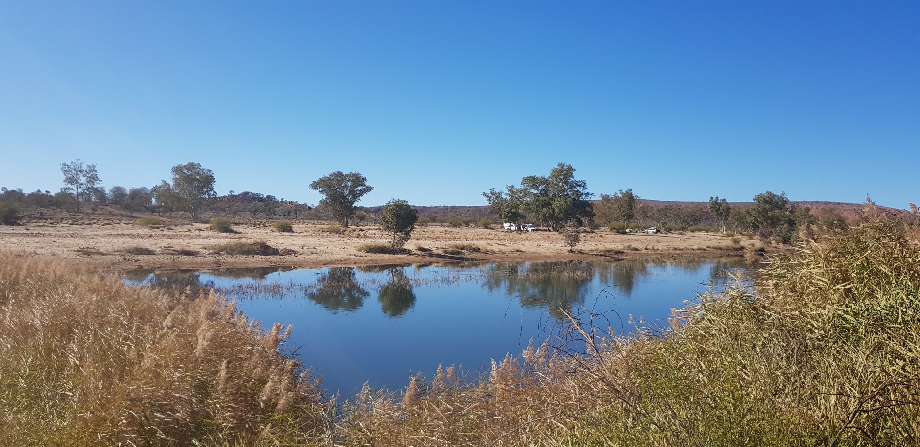 Along the way I met a group of hikers who stayed at Ormiston Gorge last night. They were sprawled out under one of the few trees around and they all looked pretty exhausted. This is day 10 for them and the previous day they’d woken up at midnight to leave Serpentine Chalet Dam to get to a Mt Sonder lookout for sunrise! The girl doing the uni tests and her partner were also part of the group. Apparently that girl has been studying every night when they finish hiking for the day.Today’s walk was fairly flat with a few small hills. The ground was mostly rocky and fairly easy to walk on. I’m much happier with my trail runners than my boots. Makes me wonder if, all those nights in the alps when my feet were sore, they could have been not sore with different shoes! I had just assumed feet get sore after big days of hiking.I arrived back at Camp Jubbie in time for lunch. In the afternoon we headed to Glen Helen, the closed lodge, for a look around Glen Helen Gorge. There’s a really lovely body of water with long grasses all around. There’s a lot of water – to get through the gorge you’d need to go for a swim.
