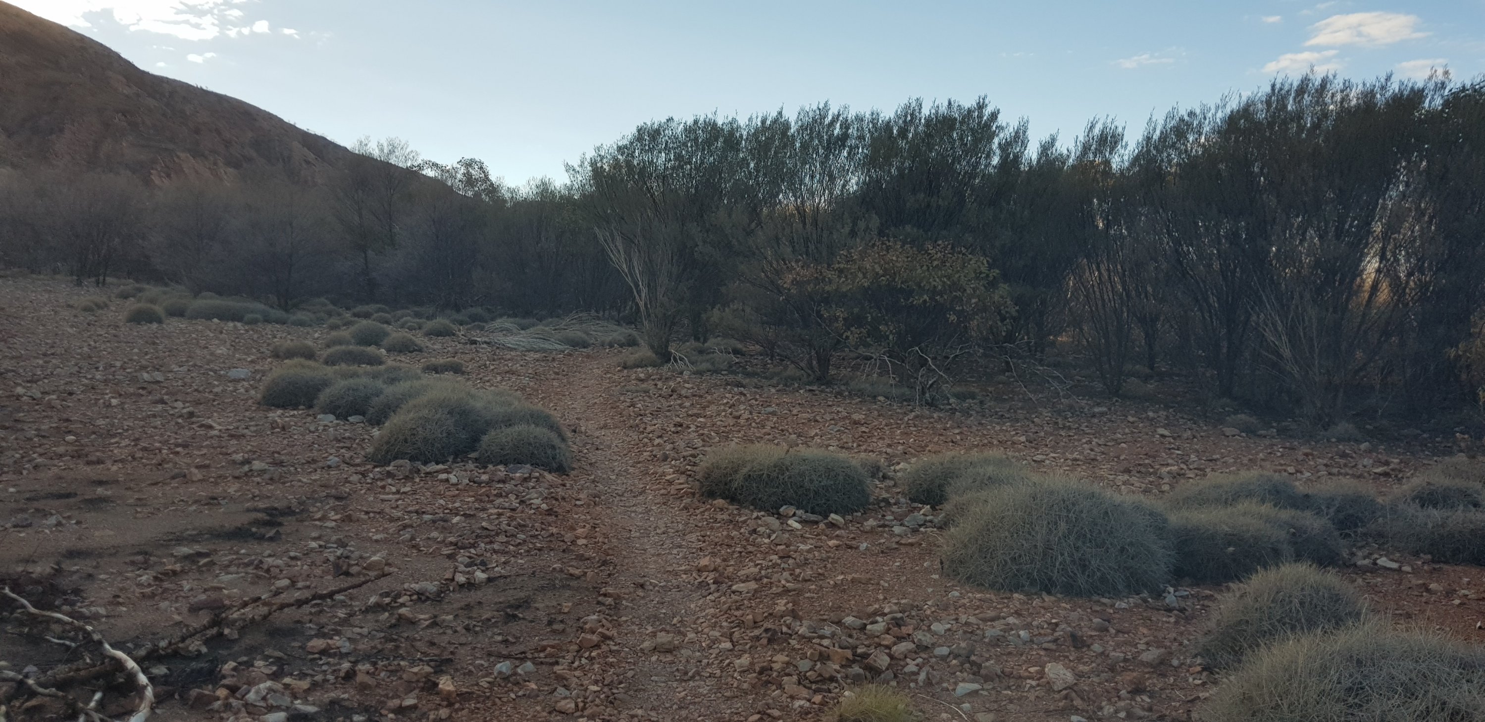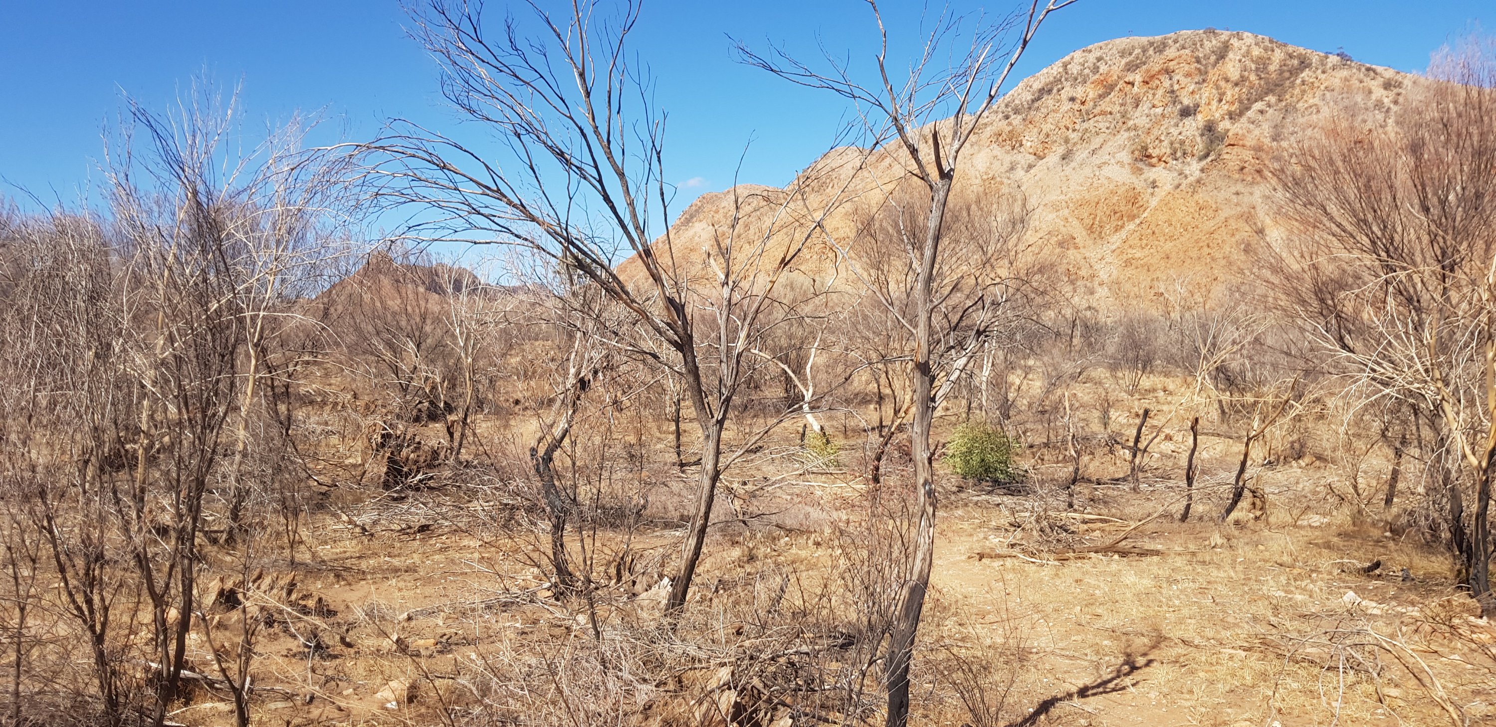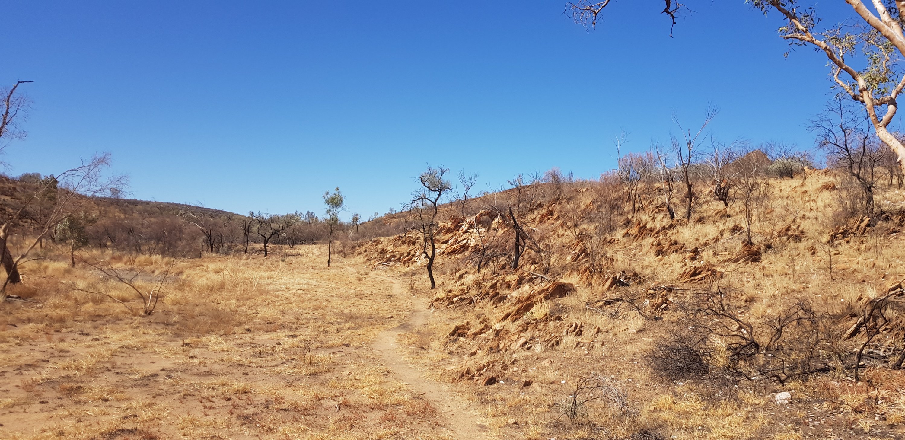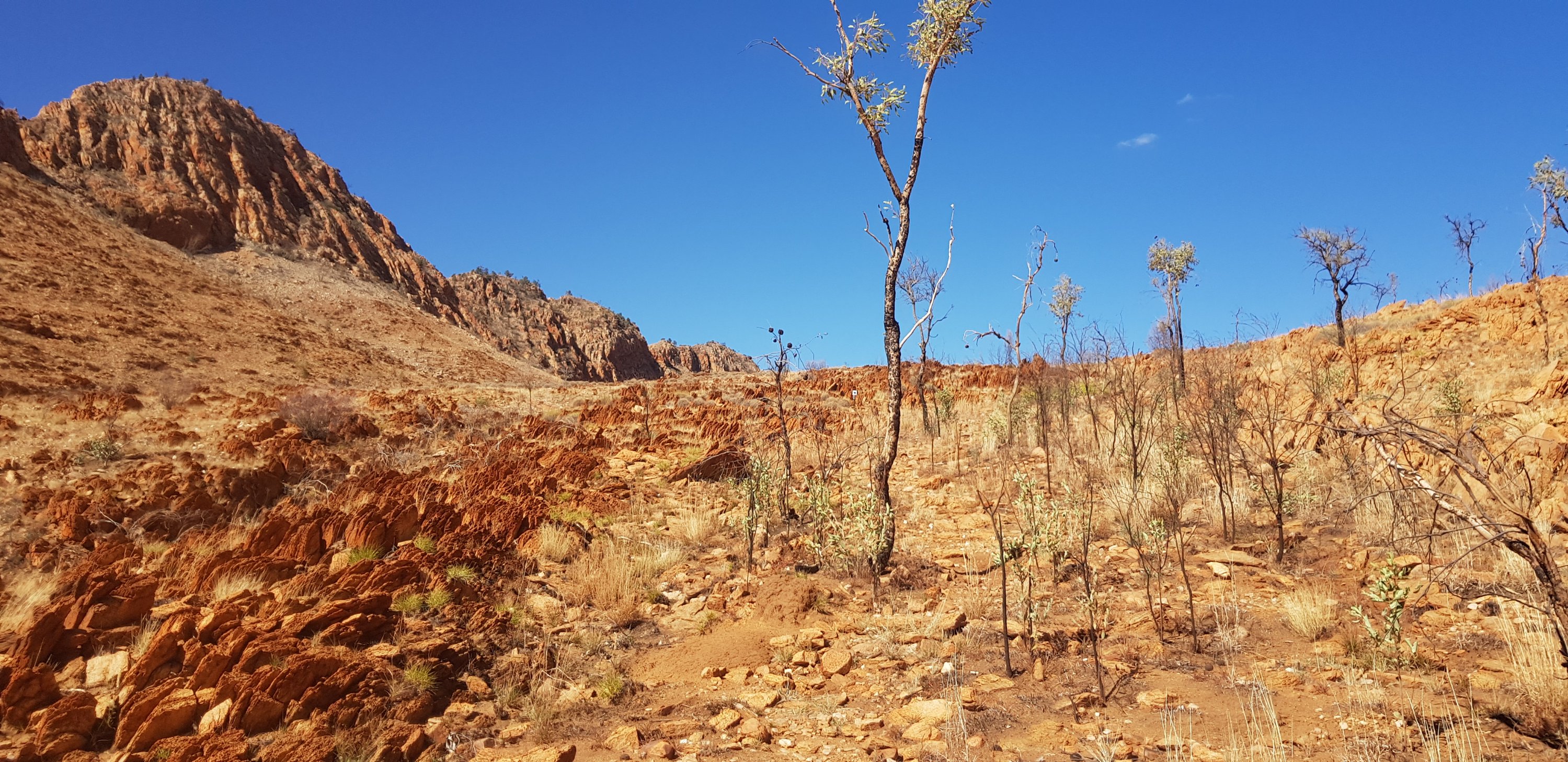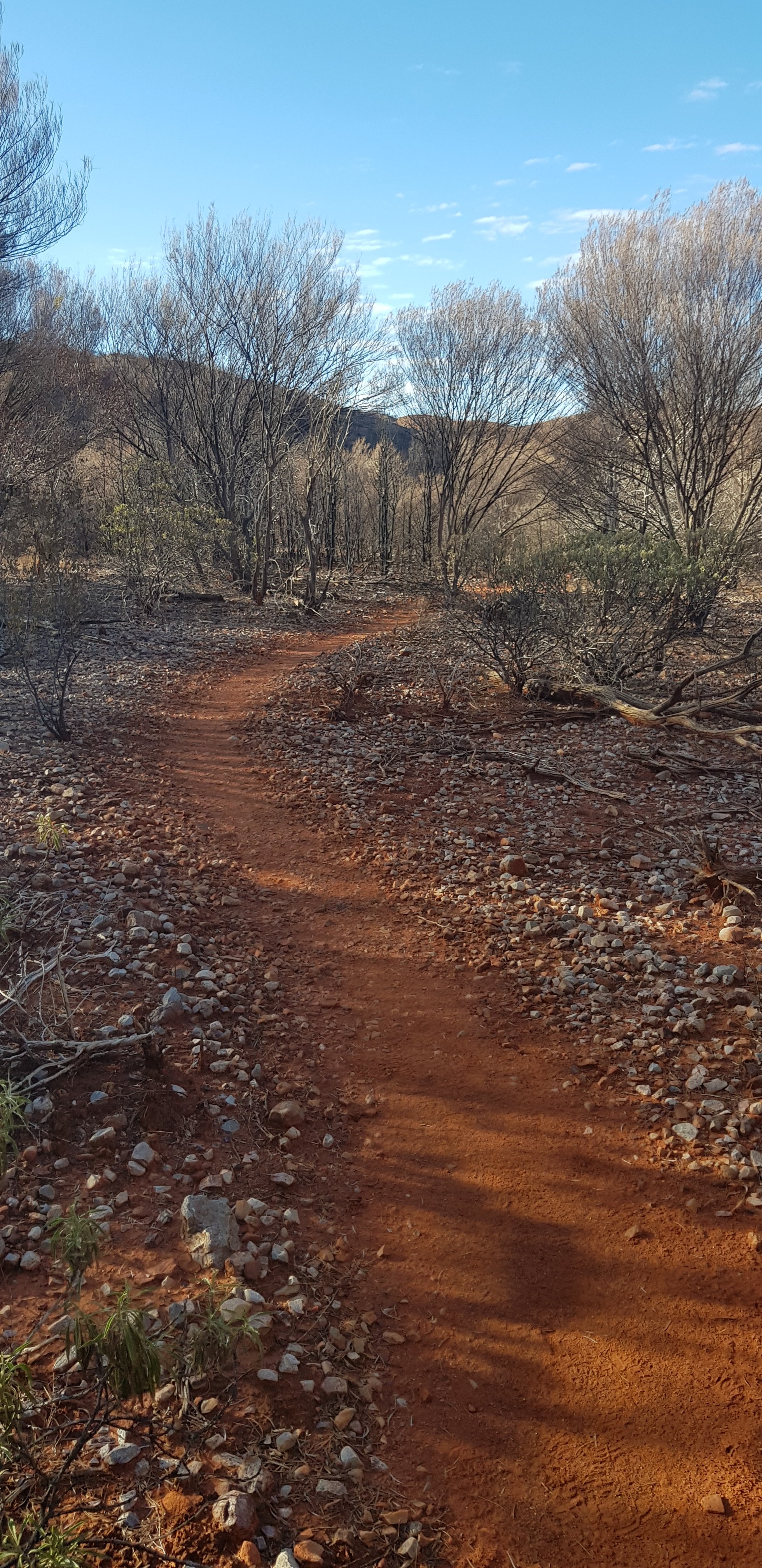For a short while the trail was rocky and sandy and passed right next to some towering rock walks. I hoped that wasn’t the time for a large section to fall off! The trail climbed pretty quickly out of Ormiston Gorge and made its way gently uphill through completely burnt out country. The fires have absolutely devastated this landscape.