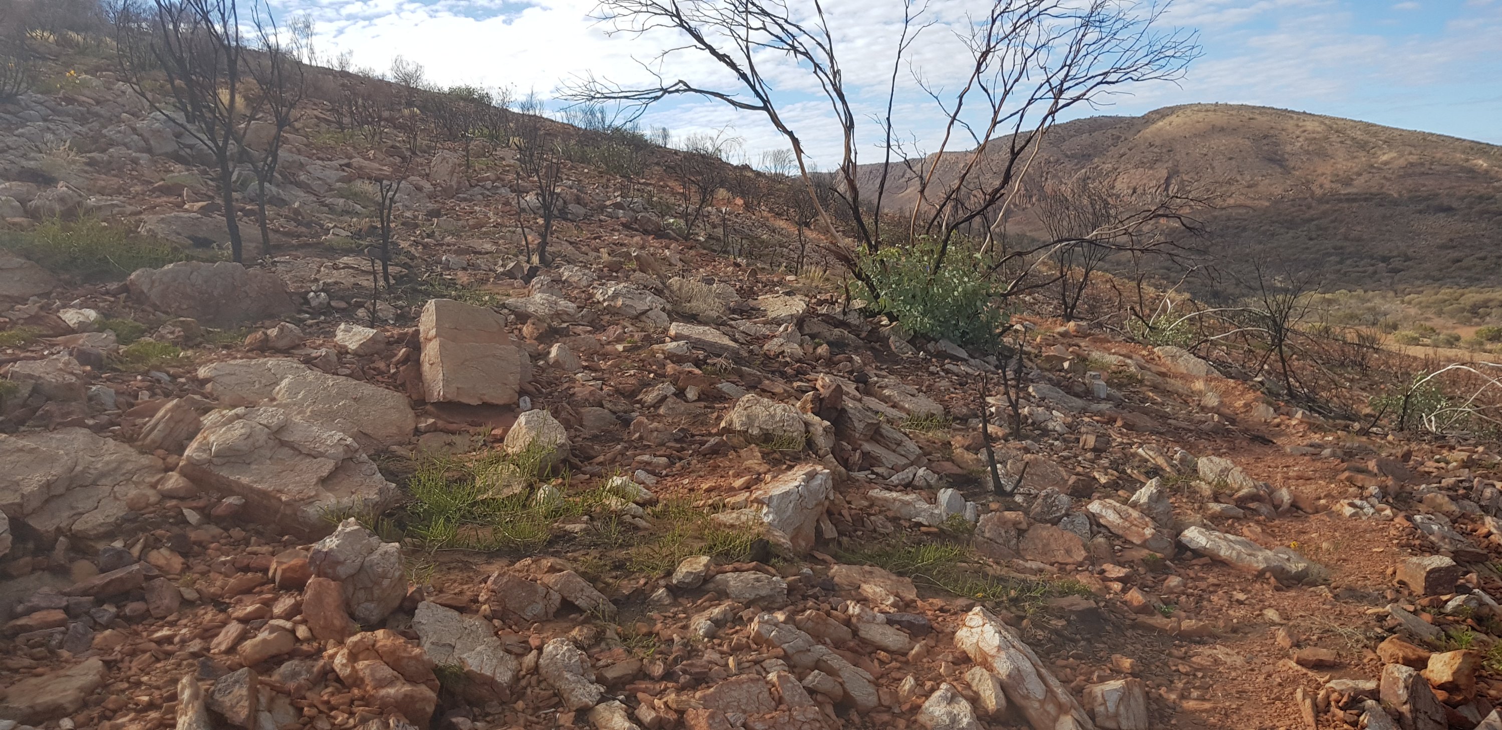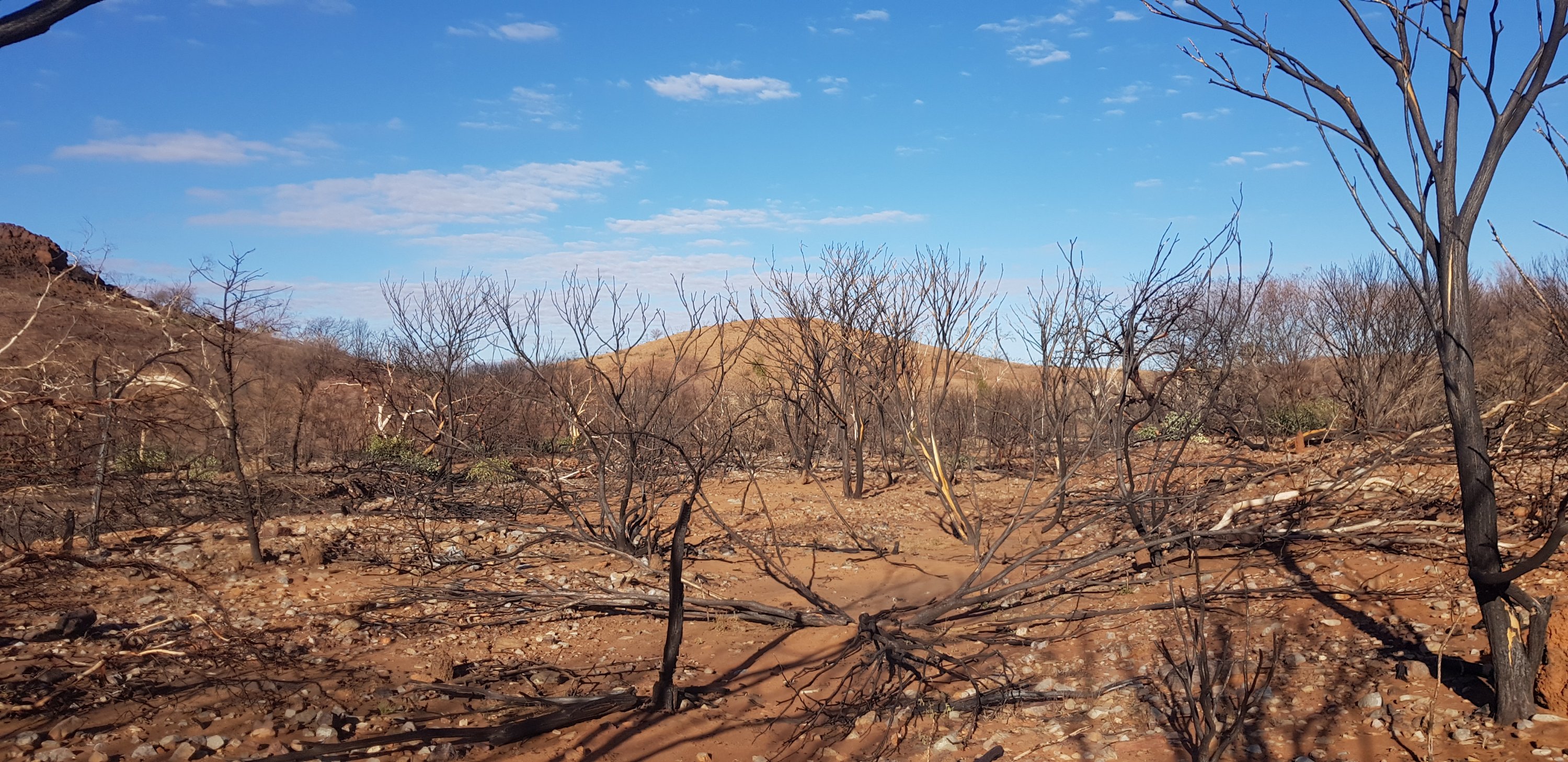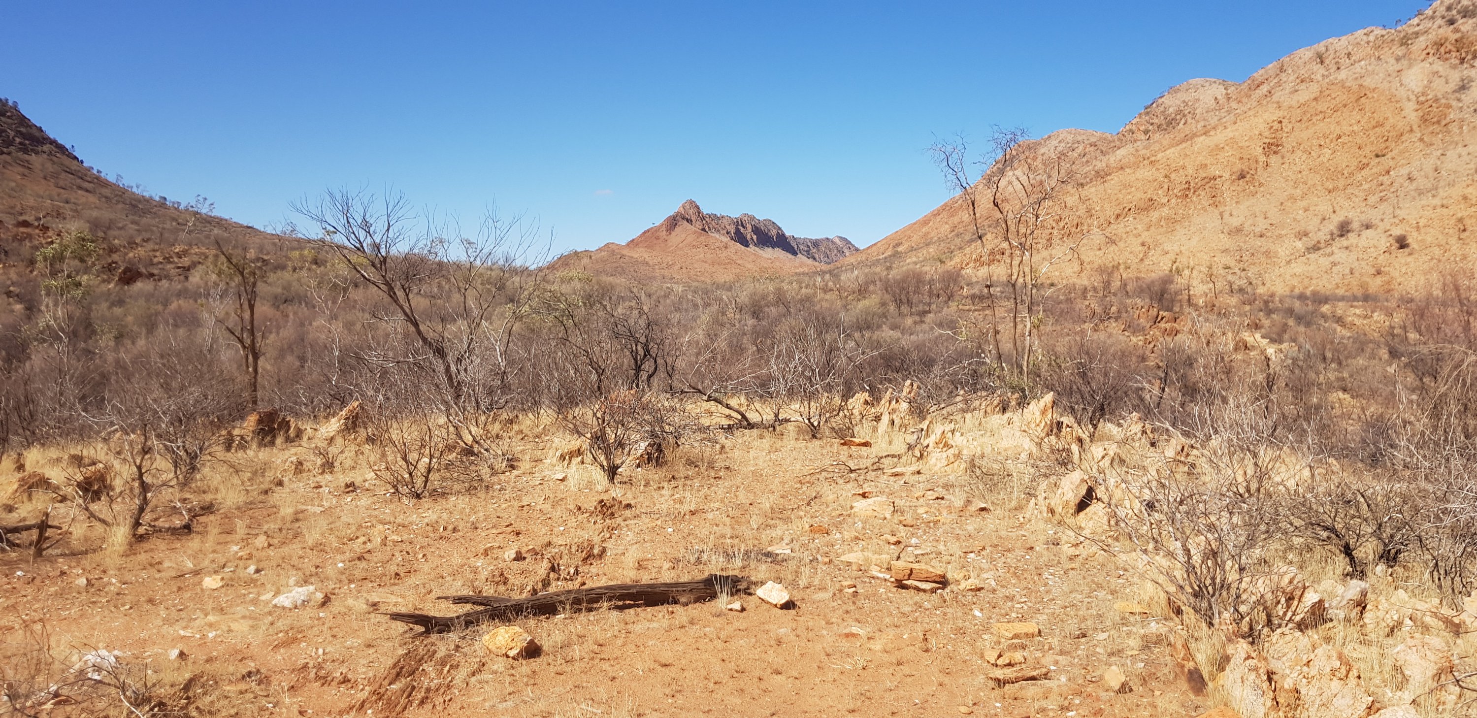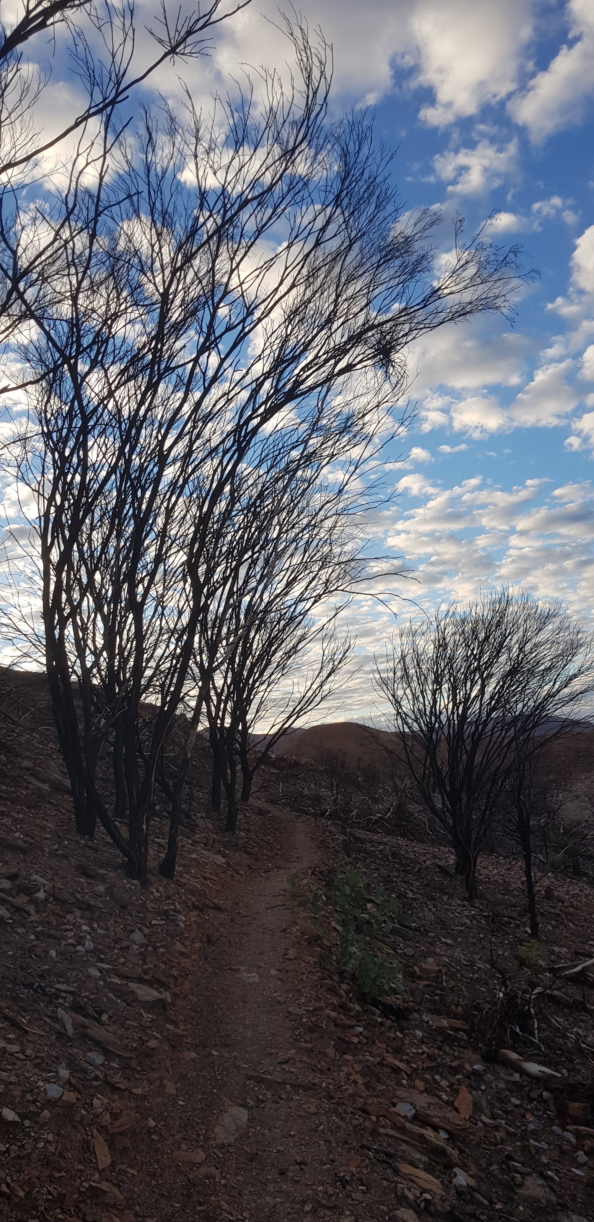 For a short while the trail was rocky and sandy and passed right next to some towering rock walks. I hoped that wasn’t the time for a large section to fall off! The trail climbed pretty quickly out of Ormiston Gorge and made its way gently uphill through completely burnt out country. The fires have absolutely devastated this landscape.