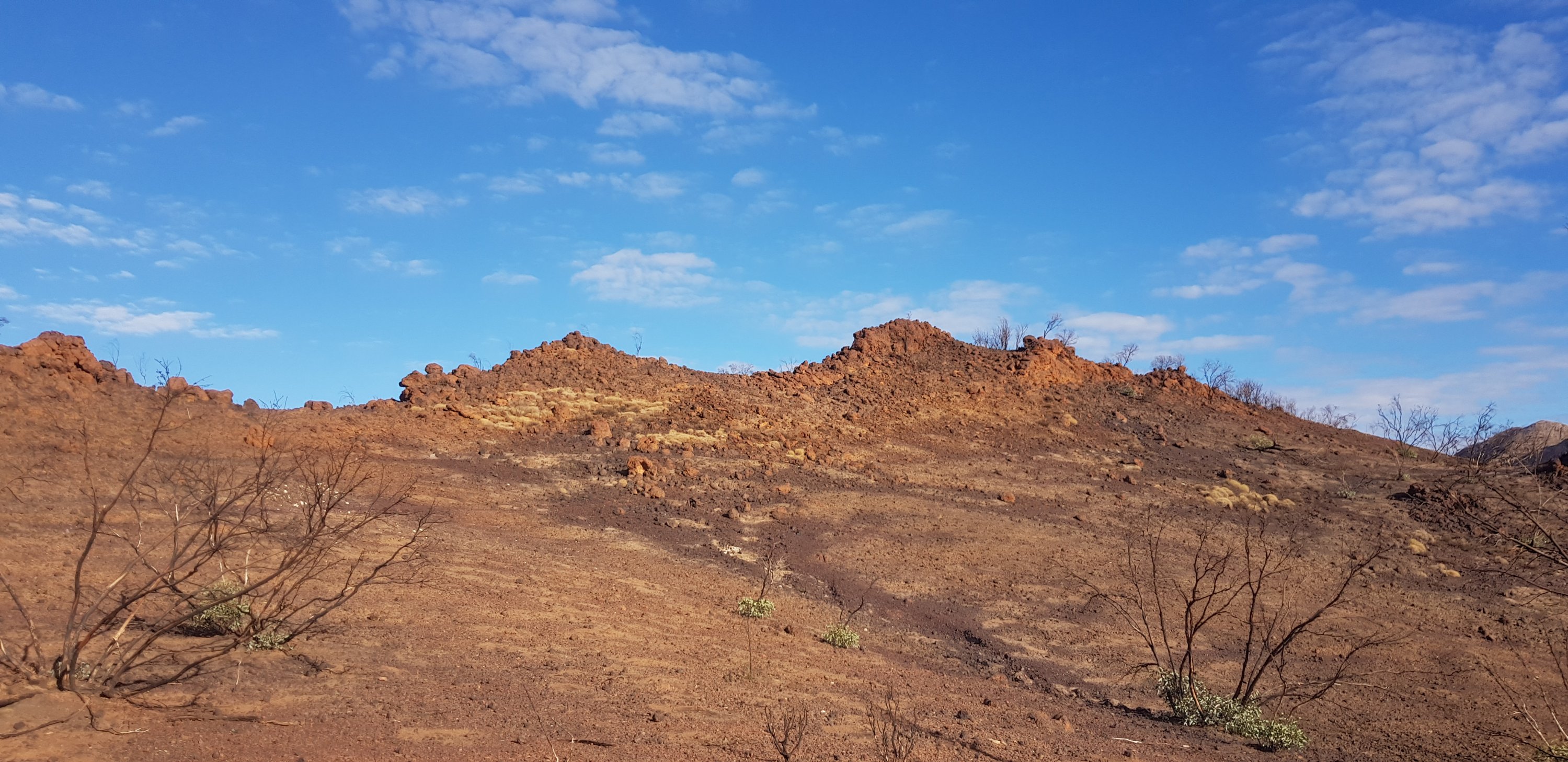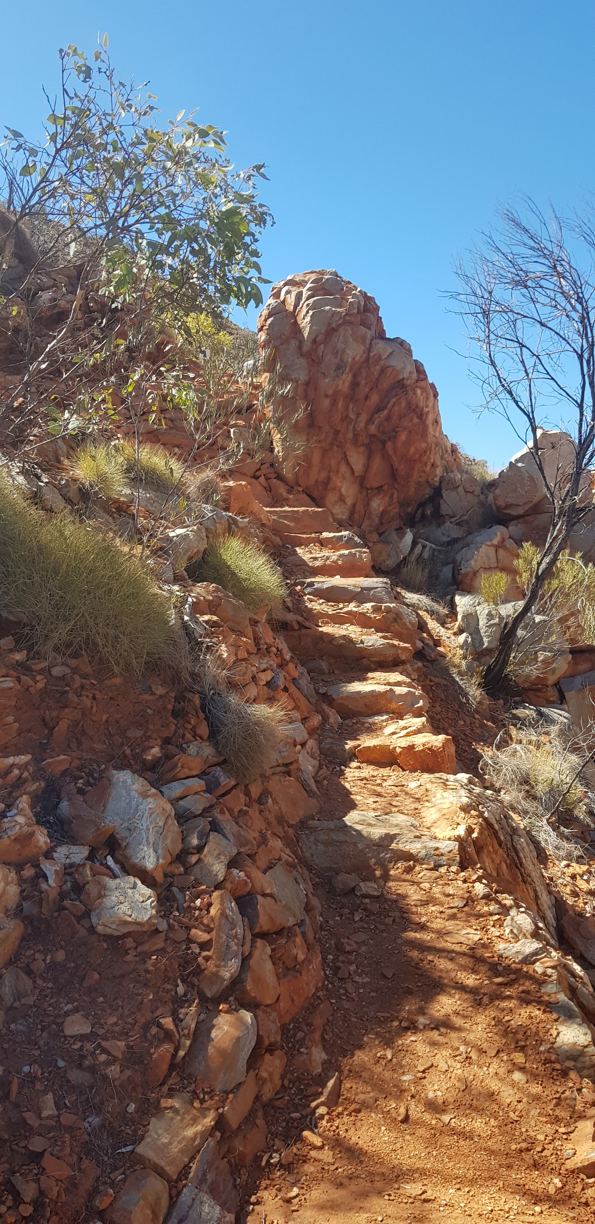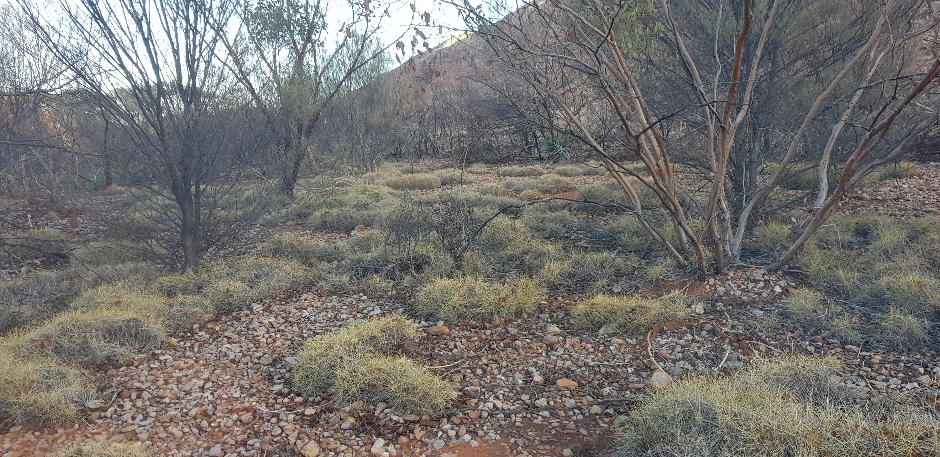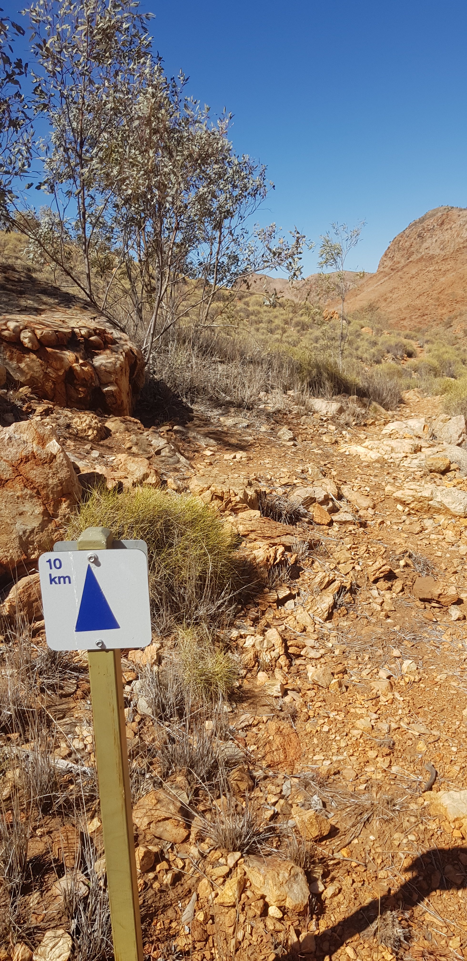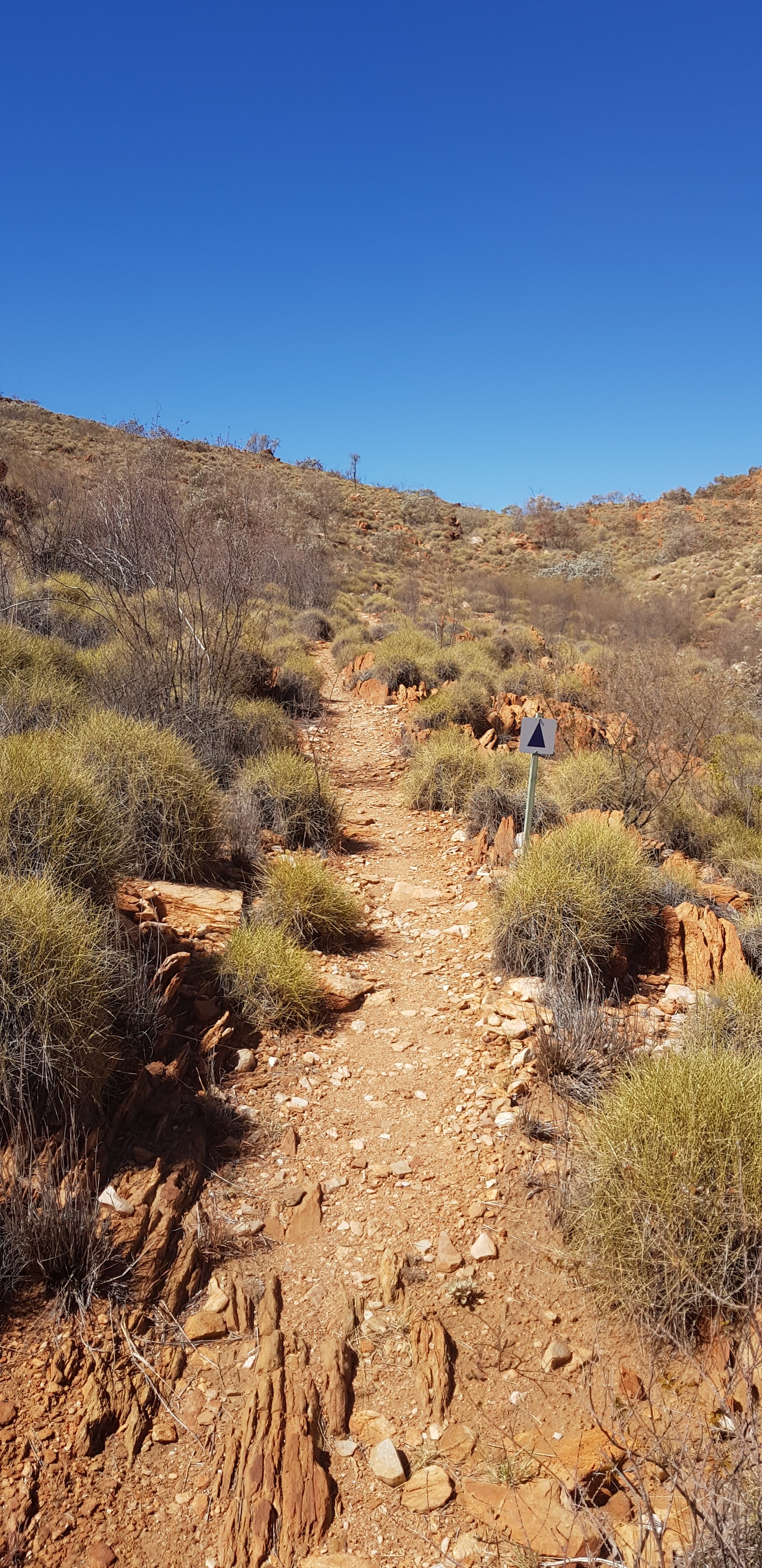 For a short while the trail was rocky and sandy and passed right next to some towering rock walks. I hoped that wasn’t the time for a large section to fall off! The trail climbed pretty quickly out of Ormiston Gorge and made its way gently uphill through completely burnt out country. The fires have absolutely devastated this landscape.