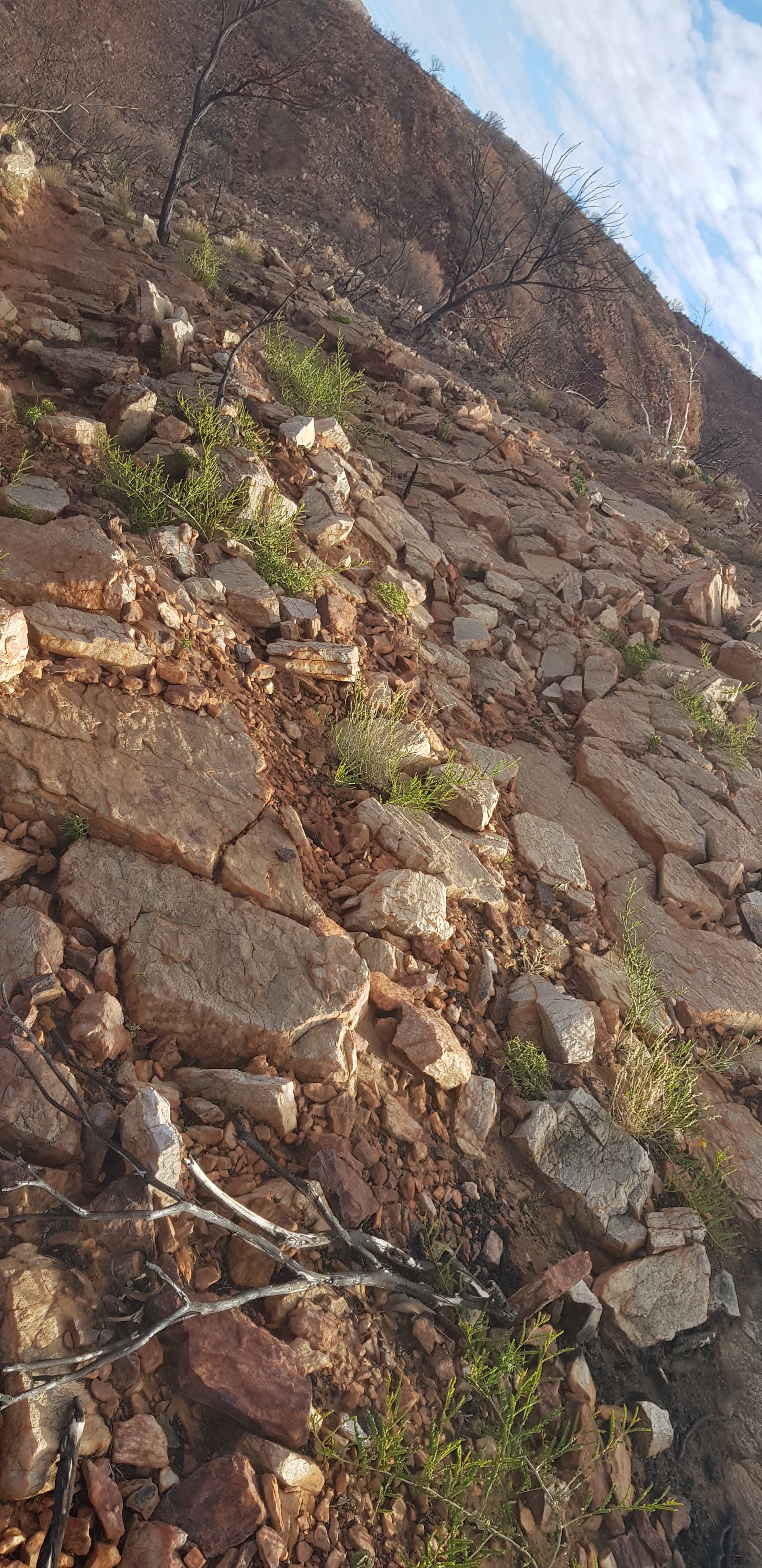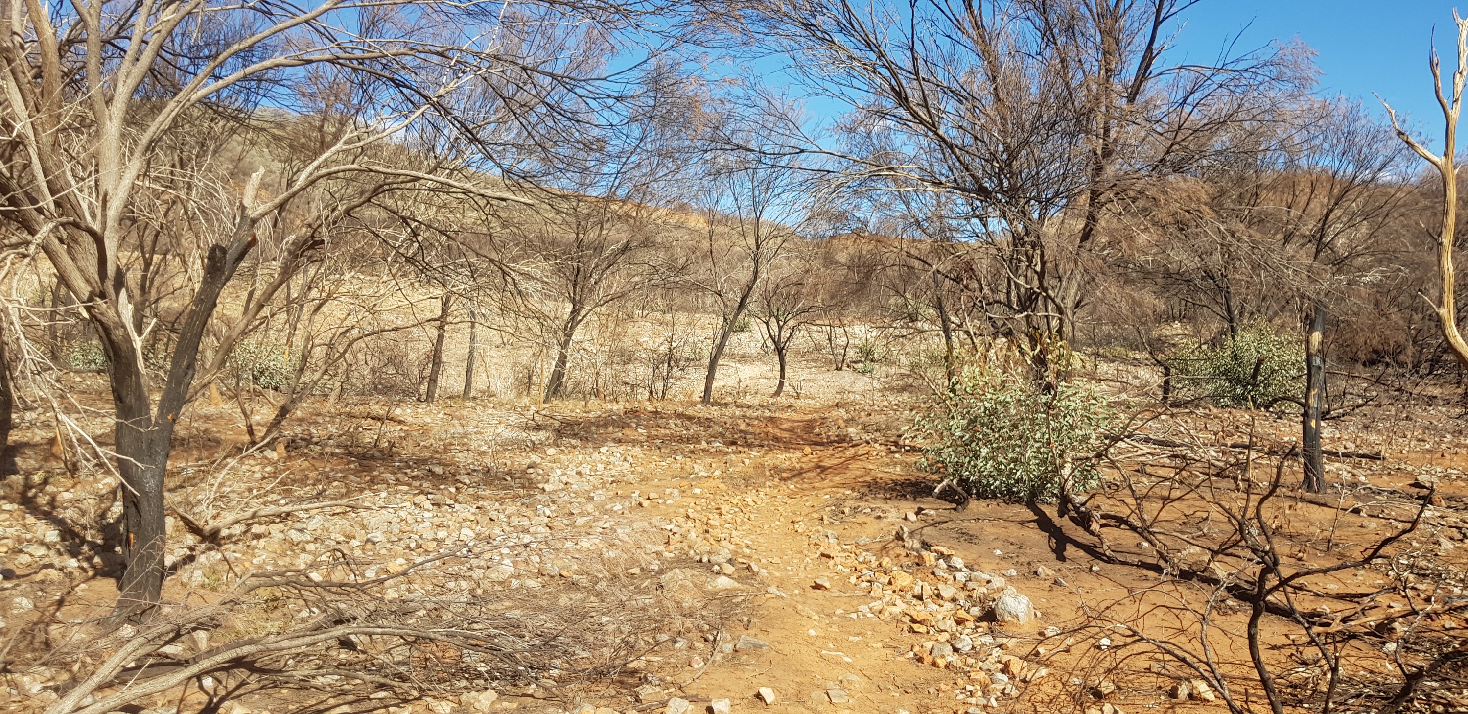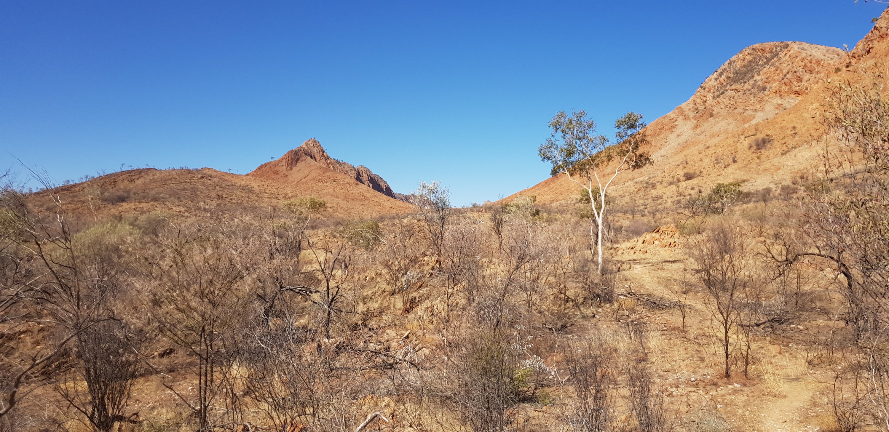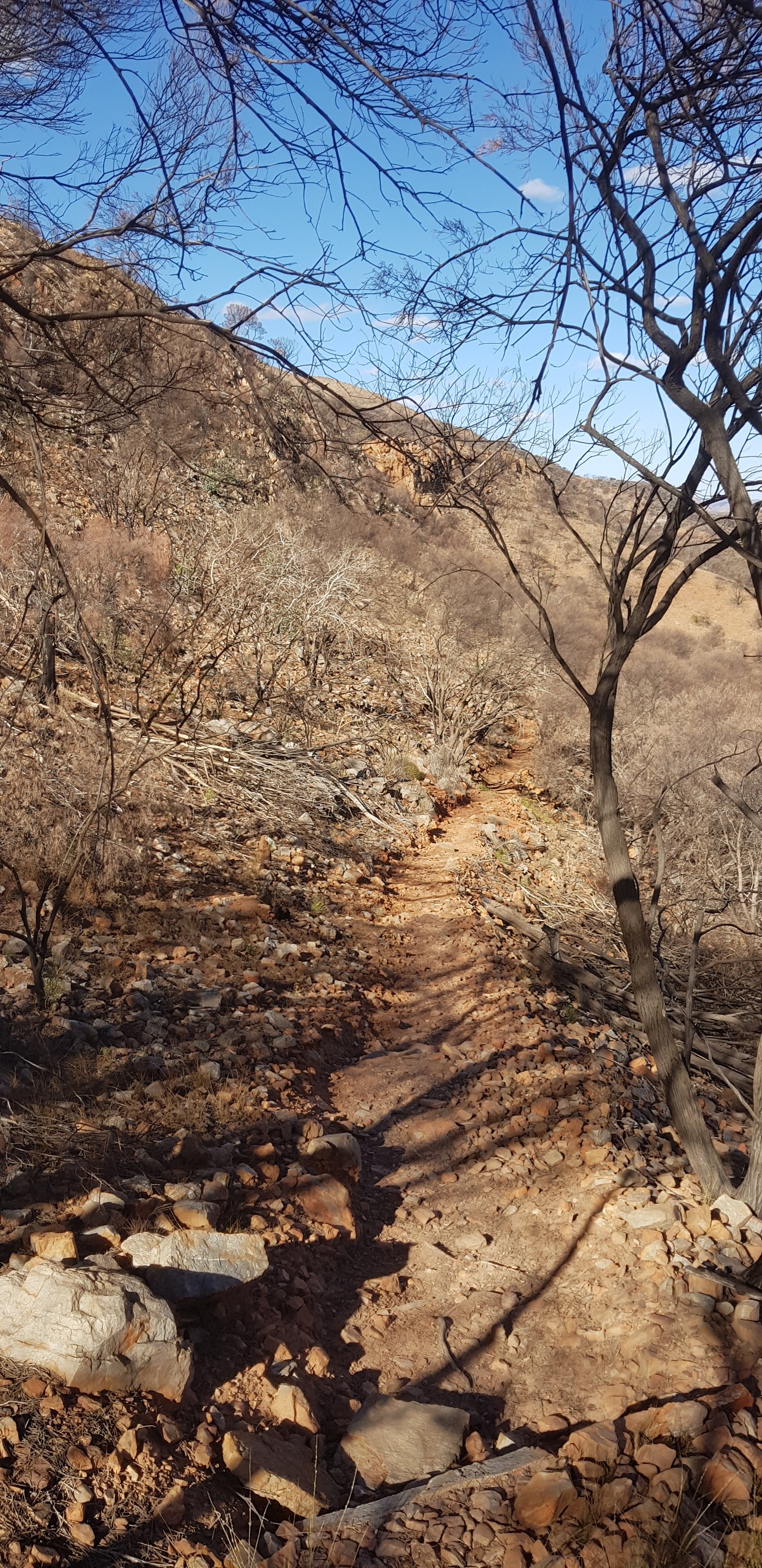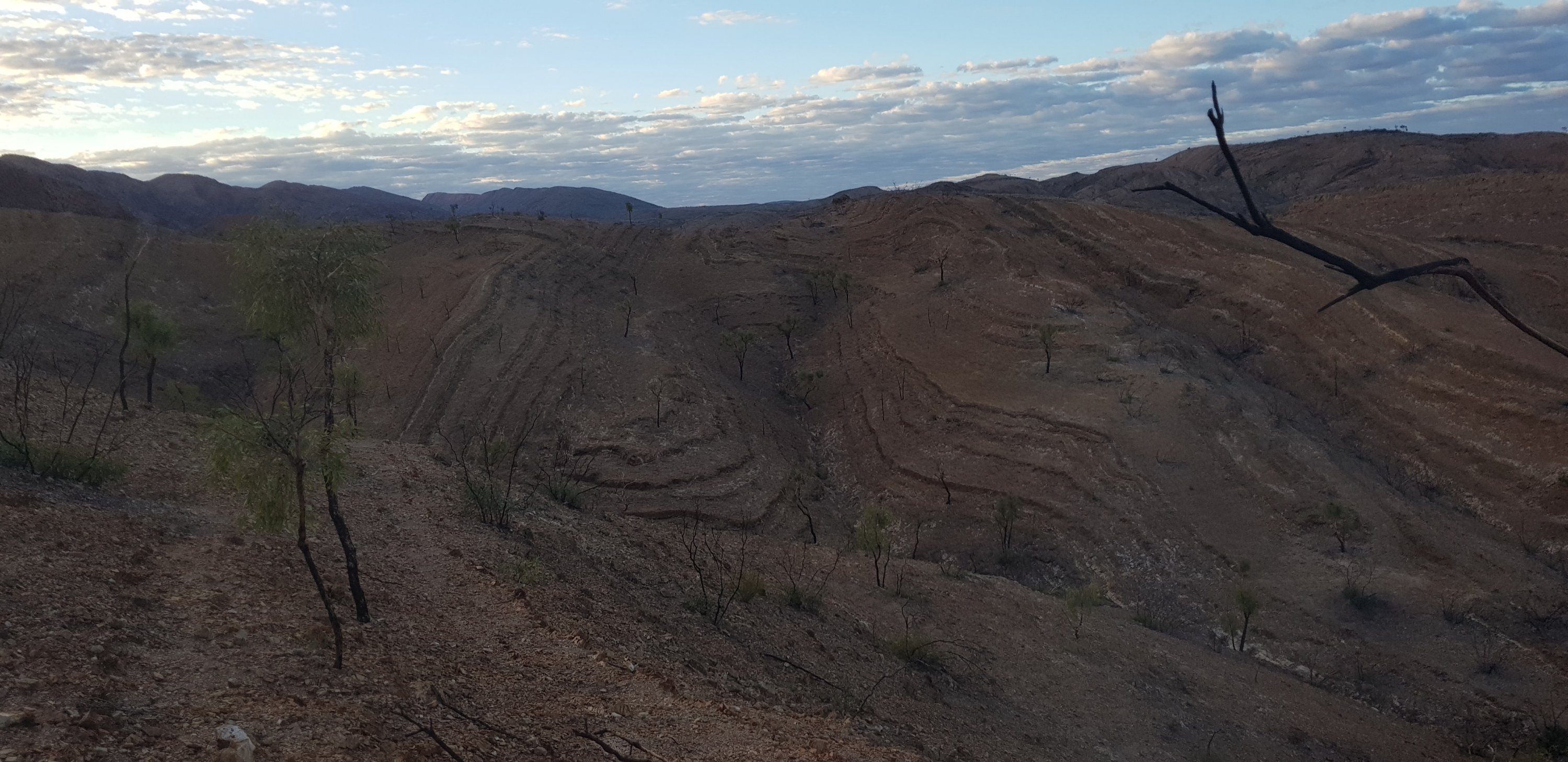 For a short while the trail was rocky and sandy and passed right next to some towering rock walks. I hoped that wasn’t the time for a large section to fall off! The trail climbed pretty quickly out of Ormiston Gorge and made its way gently uphill through completely burnt out country. The fires have absolutely devastated this landscape.
