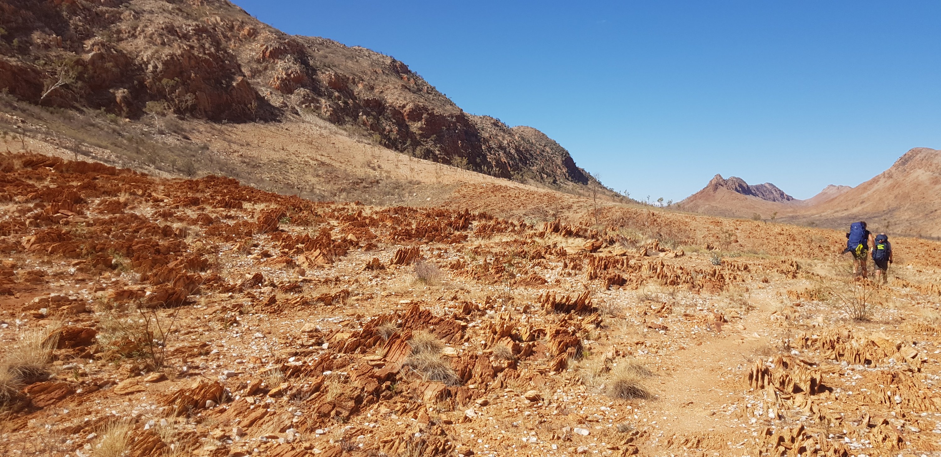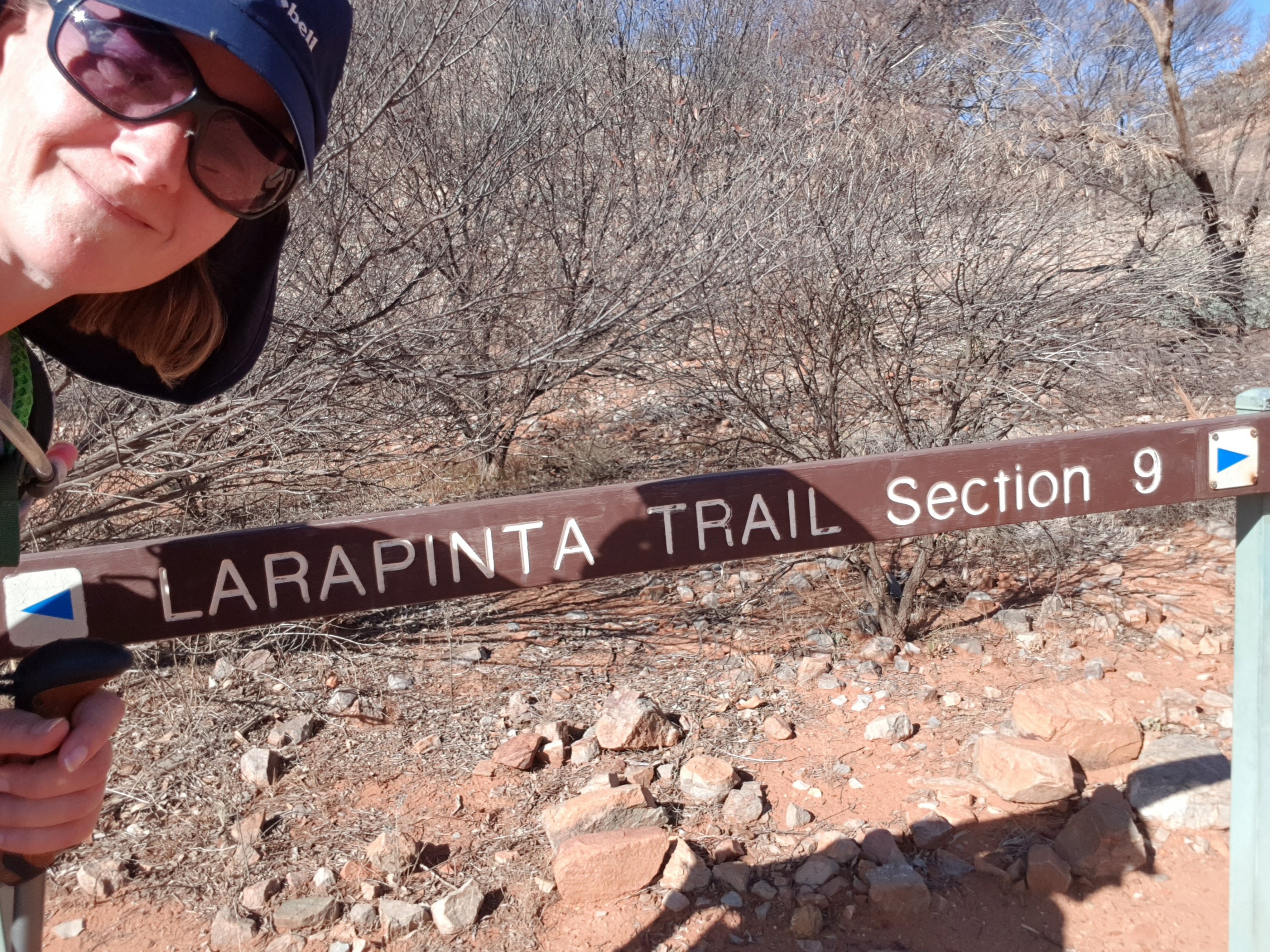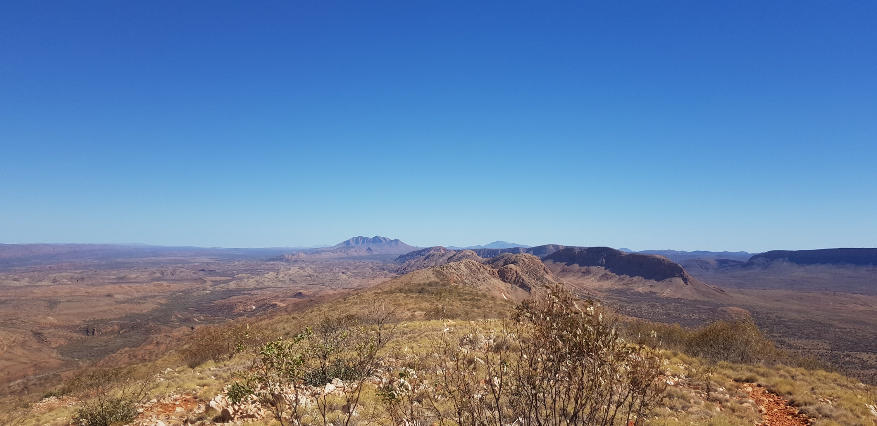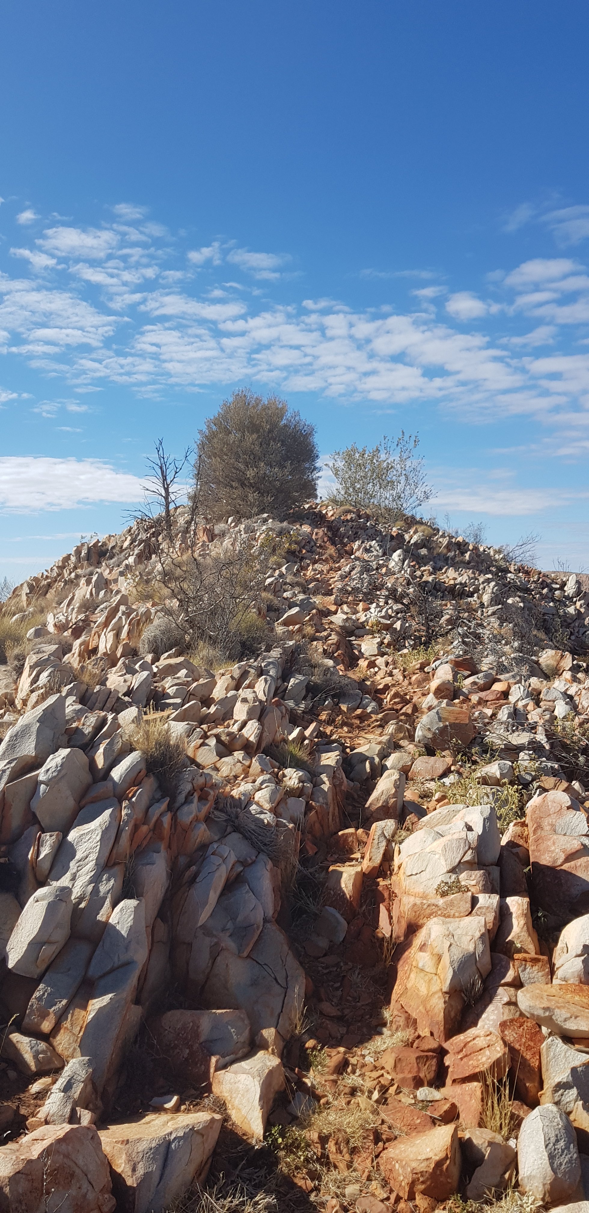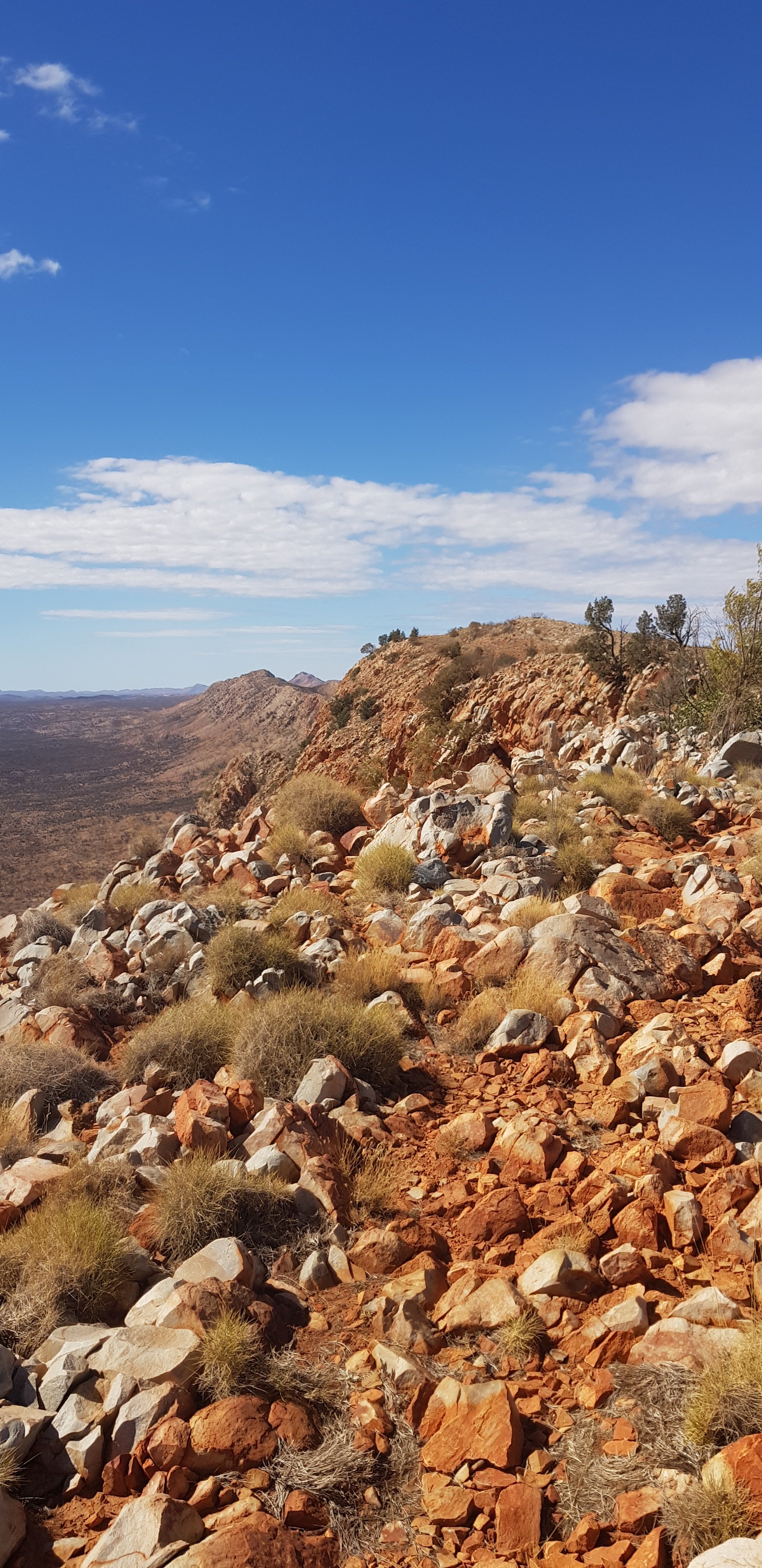After a couple of hours the track made its way up towards the top of a hill and an amazing lookout back towards Mt Sonder, north towards Mt Giles and east along the path I’ll be traveling. The trail followed the super rocky ridgeline across a saddle and up to a higher lookout. There were cleared tent pads and some trees and it seemed quite sheltered. What a fantastic place to camp. No better place to see both sunset and sunrise. At the end of the day I found out the couple I’d meet on the way to Finke River (Sim and Kyle) camped up there and it was amazing.