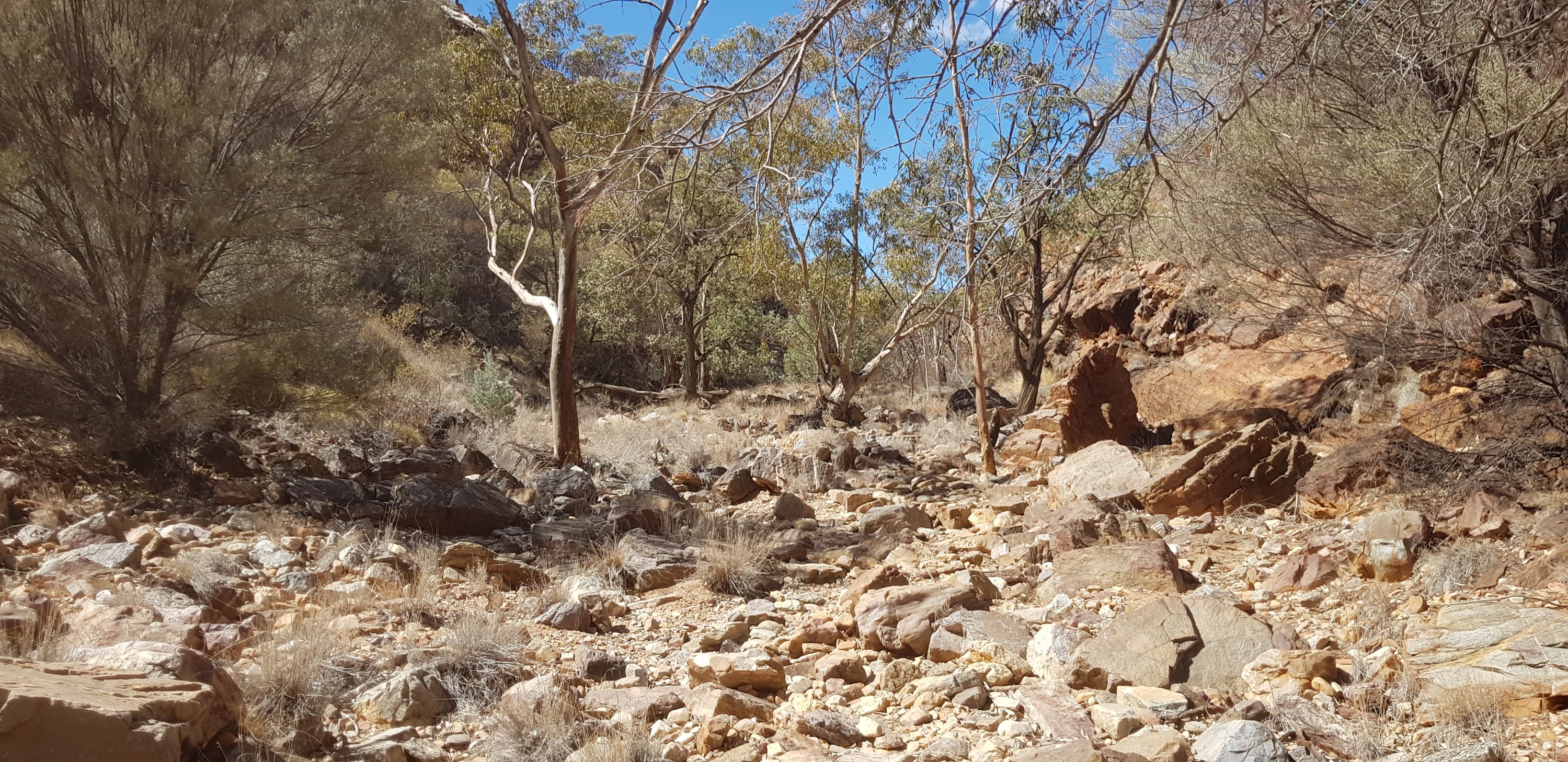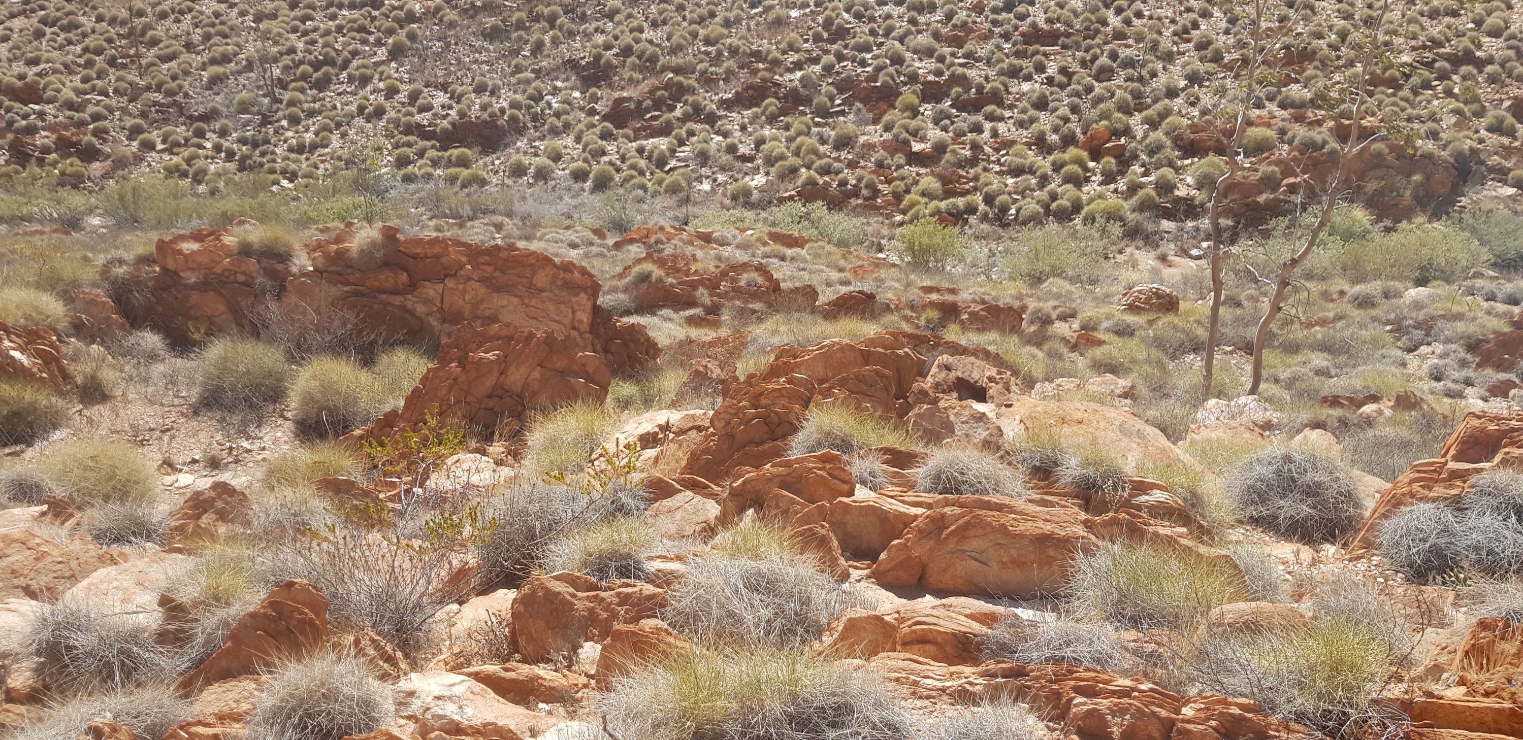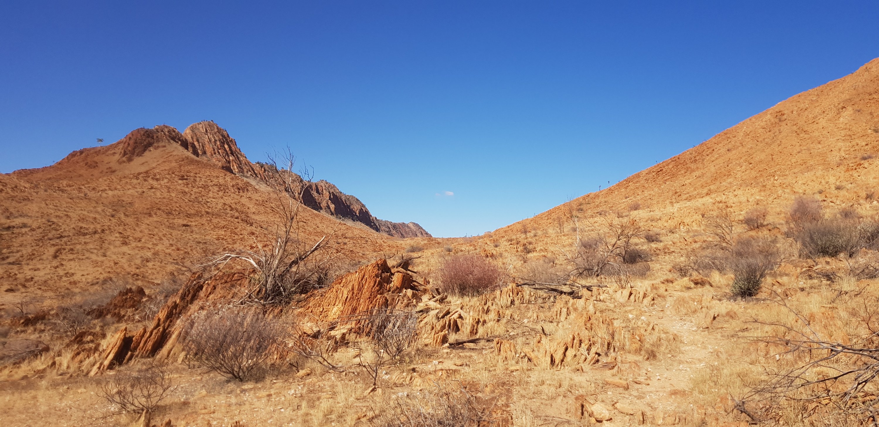 After lunch I continued climbing across the rocks through the gorge to the “waterfall” – completely non existent with everything as dry as it is. From there I walked through huge open valleys covered with spinifex and vertical shards of rock and more sweeping valleys of rocks.