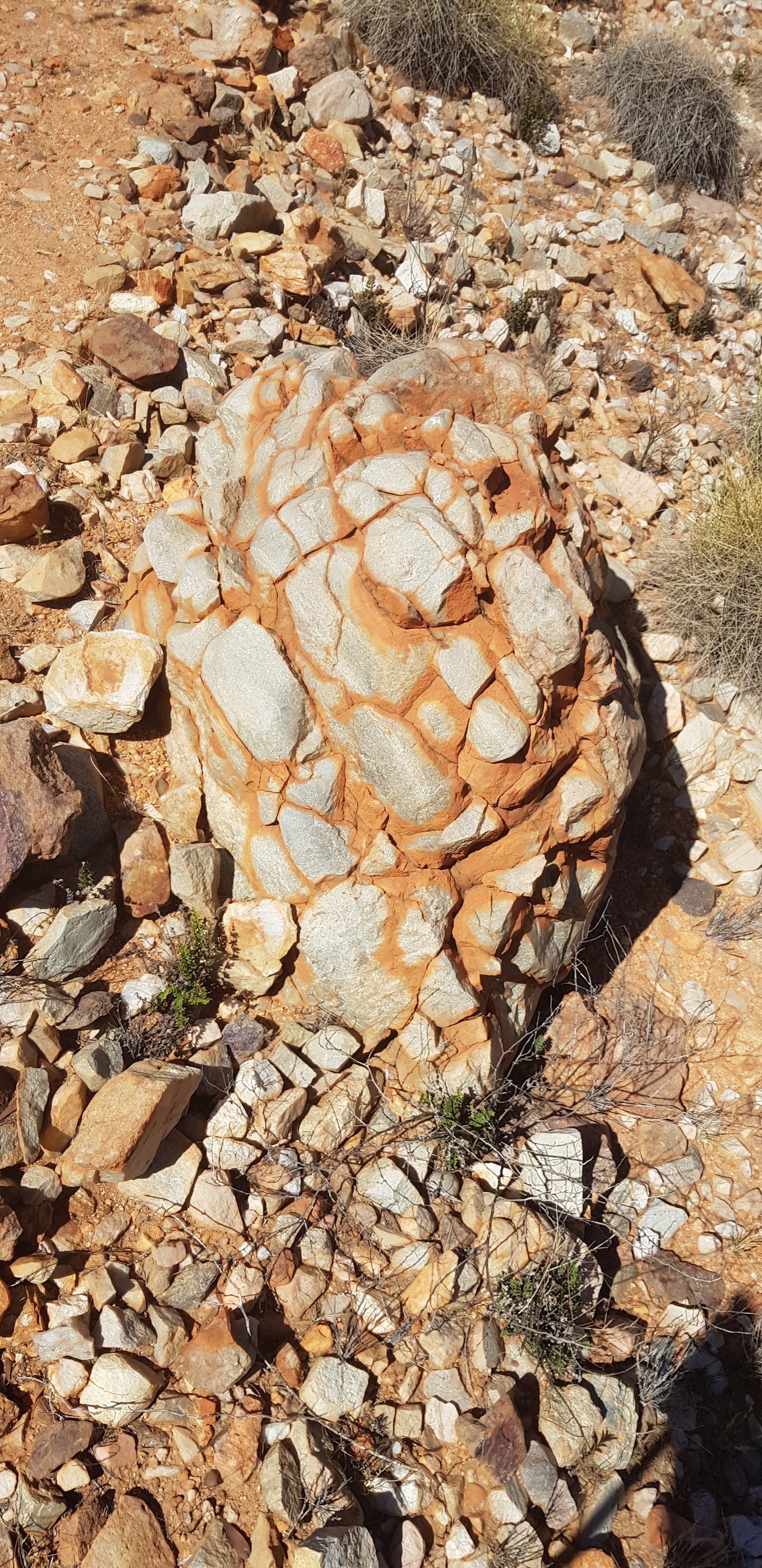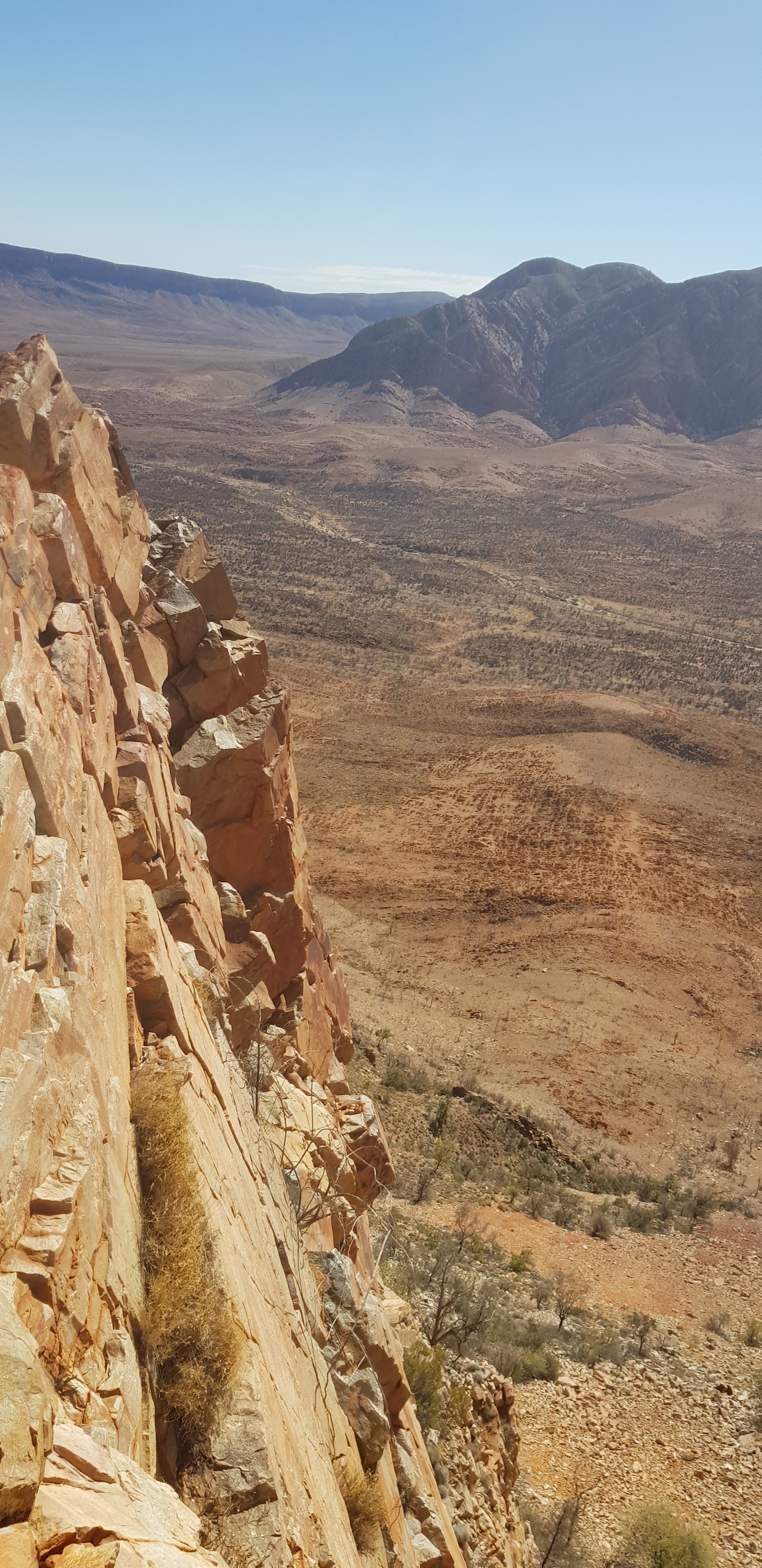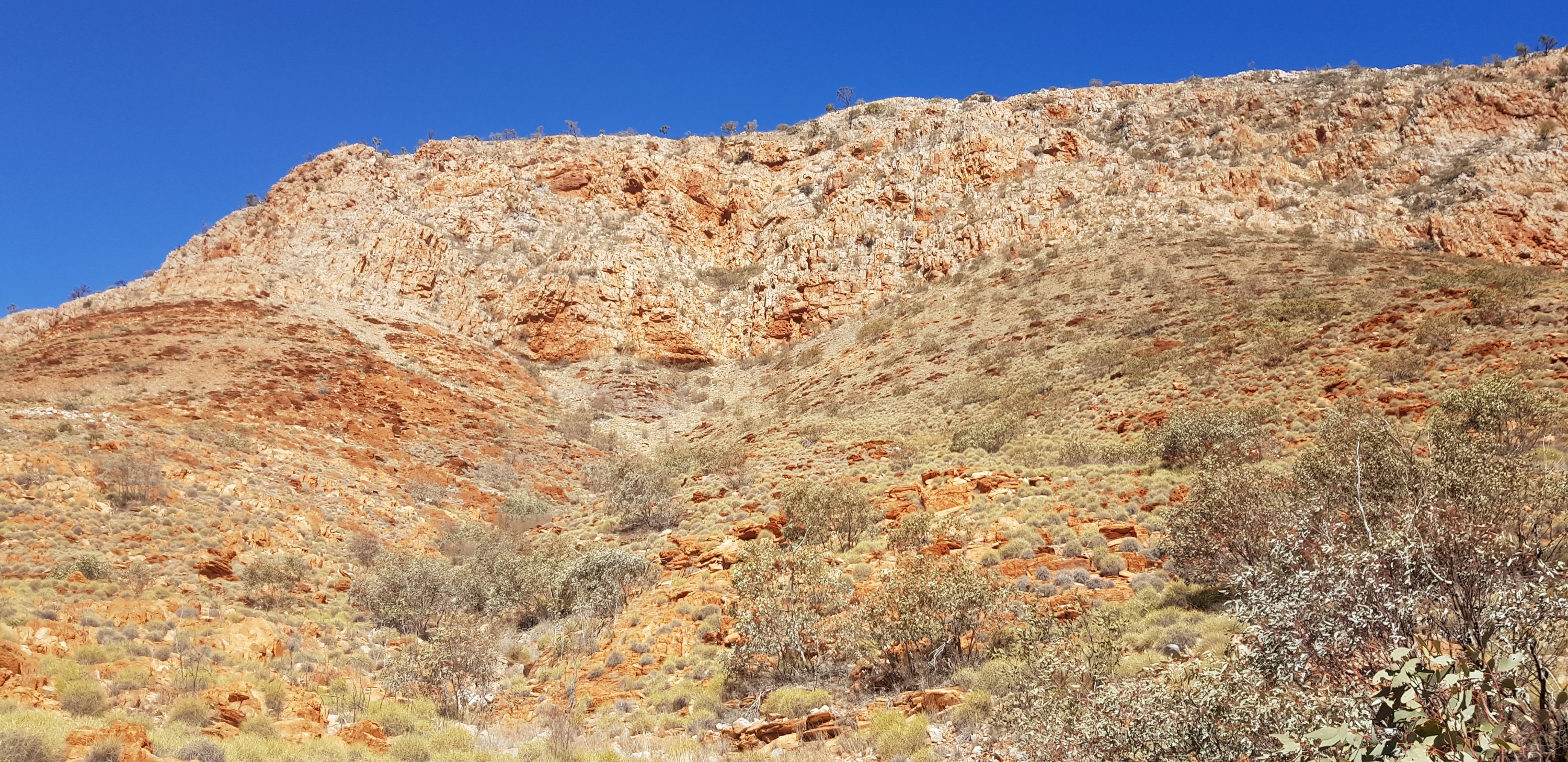 After lunch I continued climbing across the rocks through the gorge to the “waterfall” – completely non existent with everything as dry as it is. From there I walked through huge open valleys covered with spinifex and vertical shards of rock and more sweeping valleys of rocks.