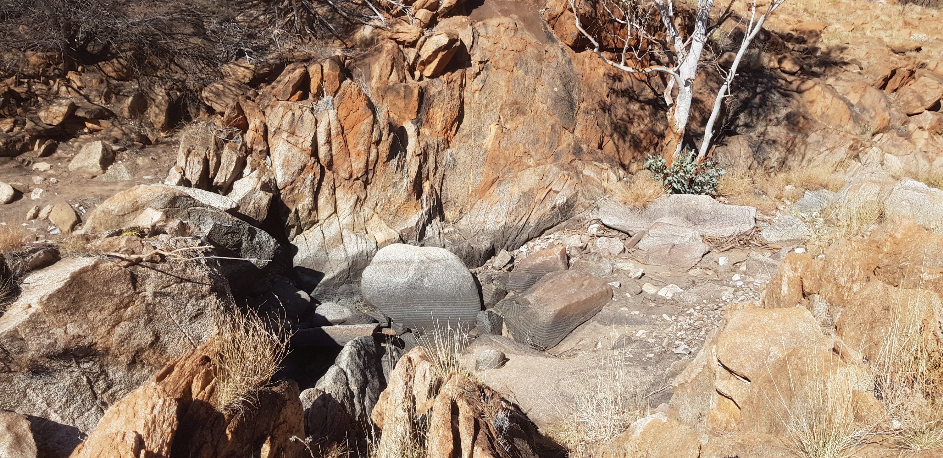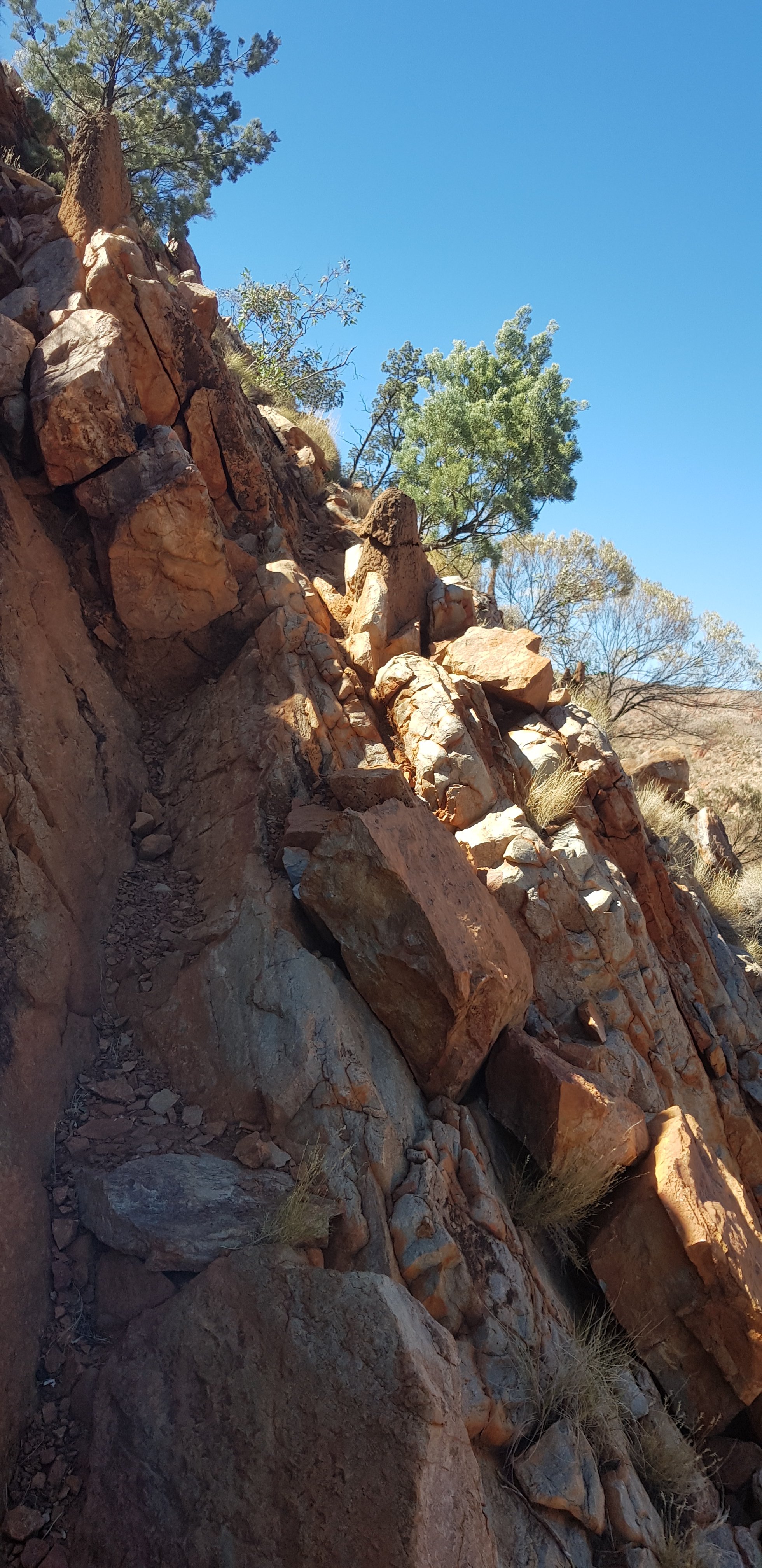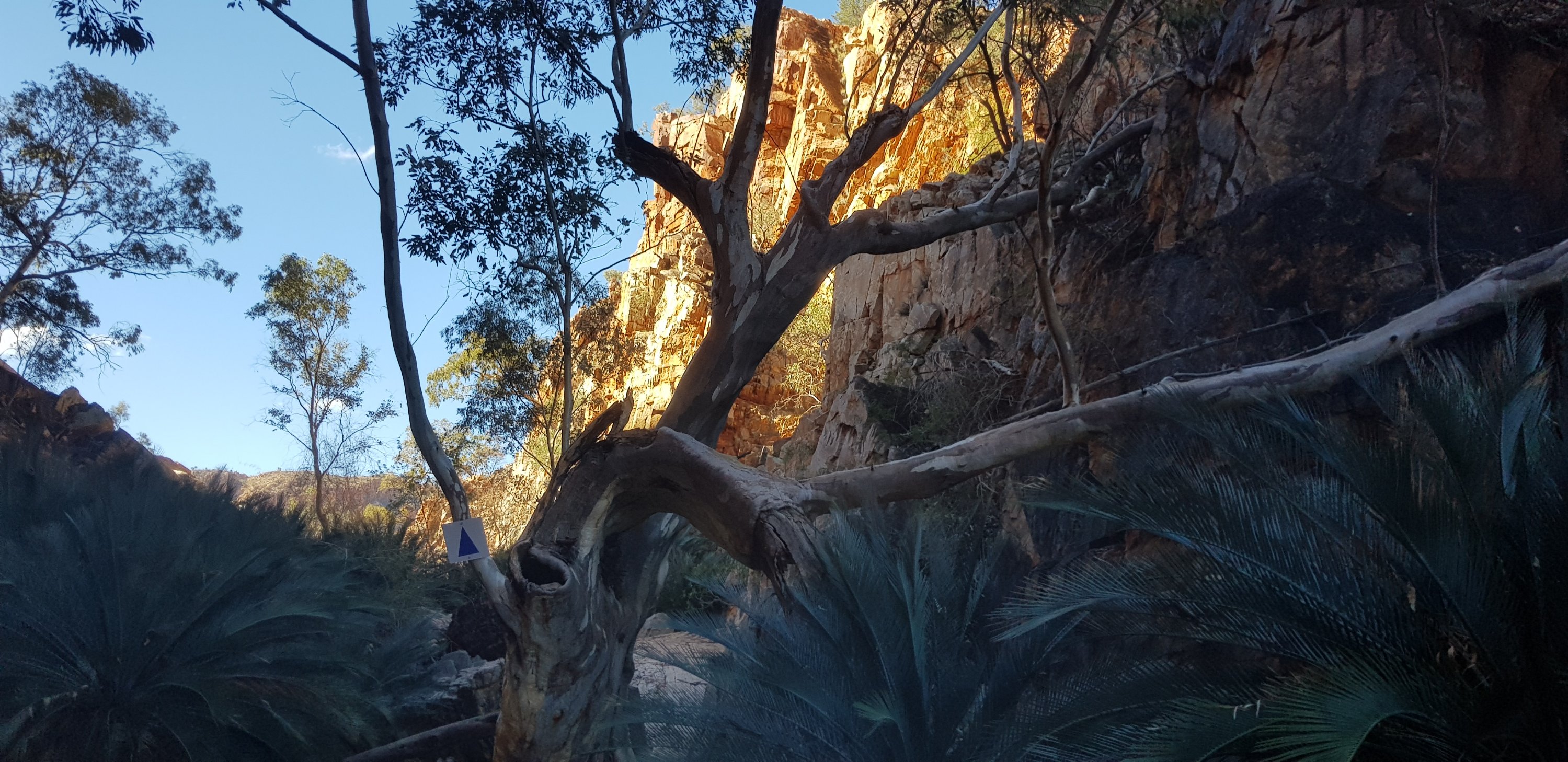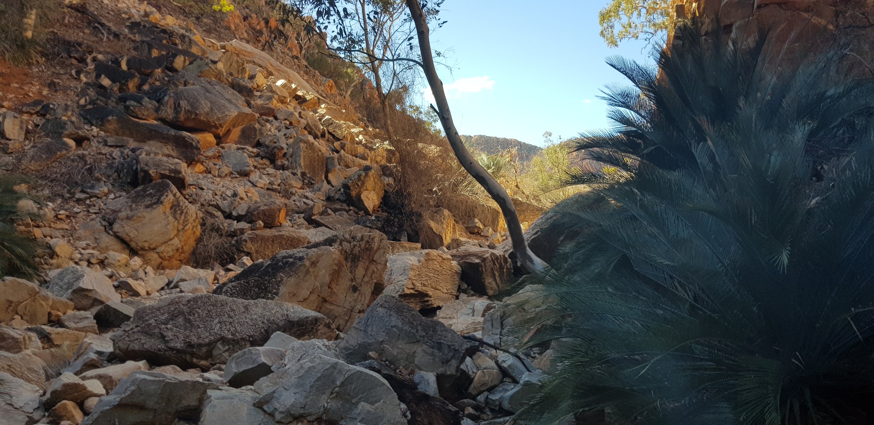 A real highlight of the walk and something I hadn’t expected was Inalarga Pass. The pass was full of boulders that had tumbled from above and had lots of greenery including those really old plants we’d seen at Kings Canyon. Apparently it’s a sacred area for the indigenous people.