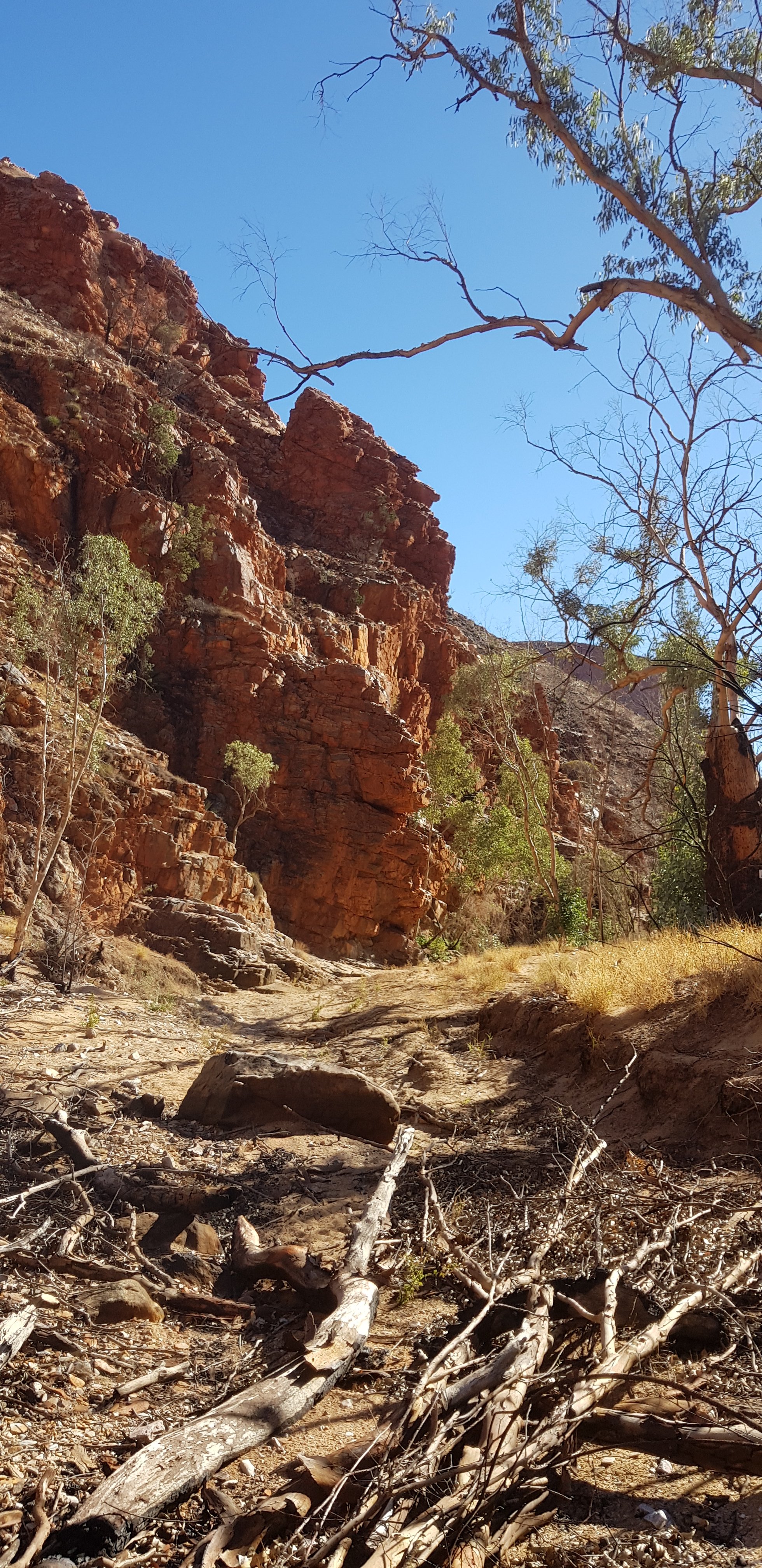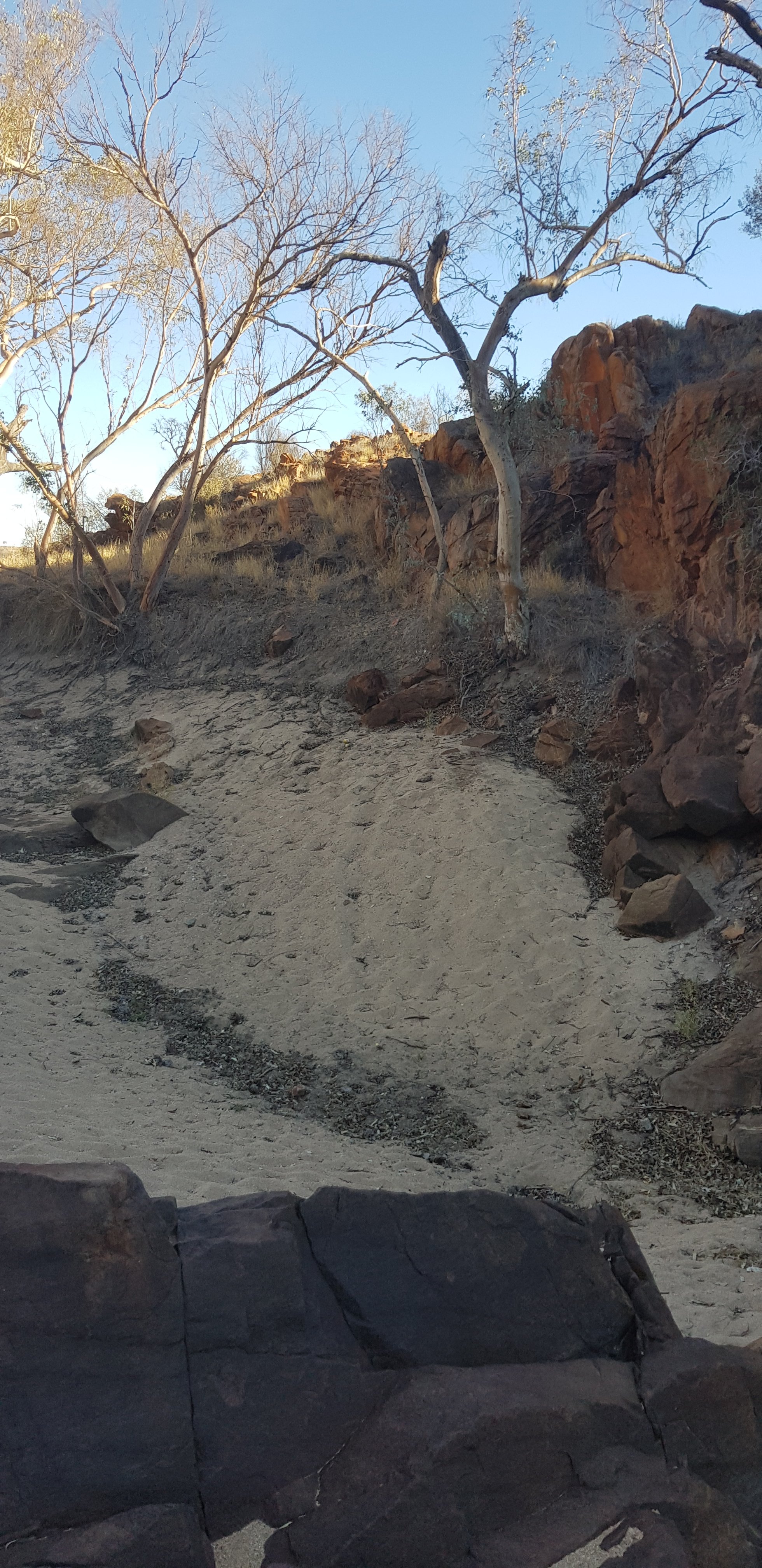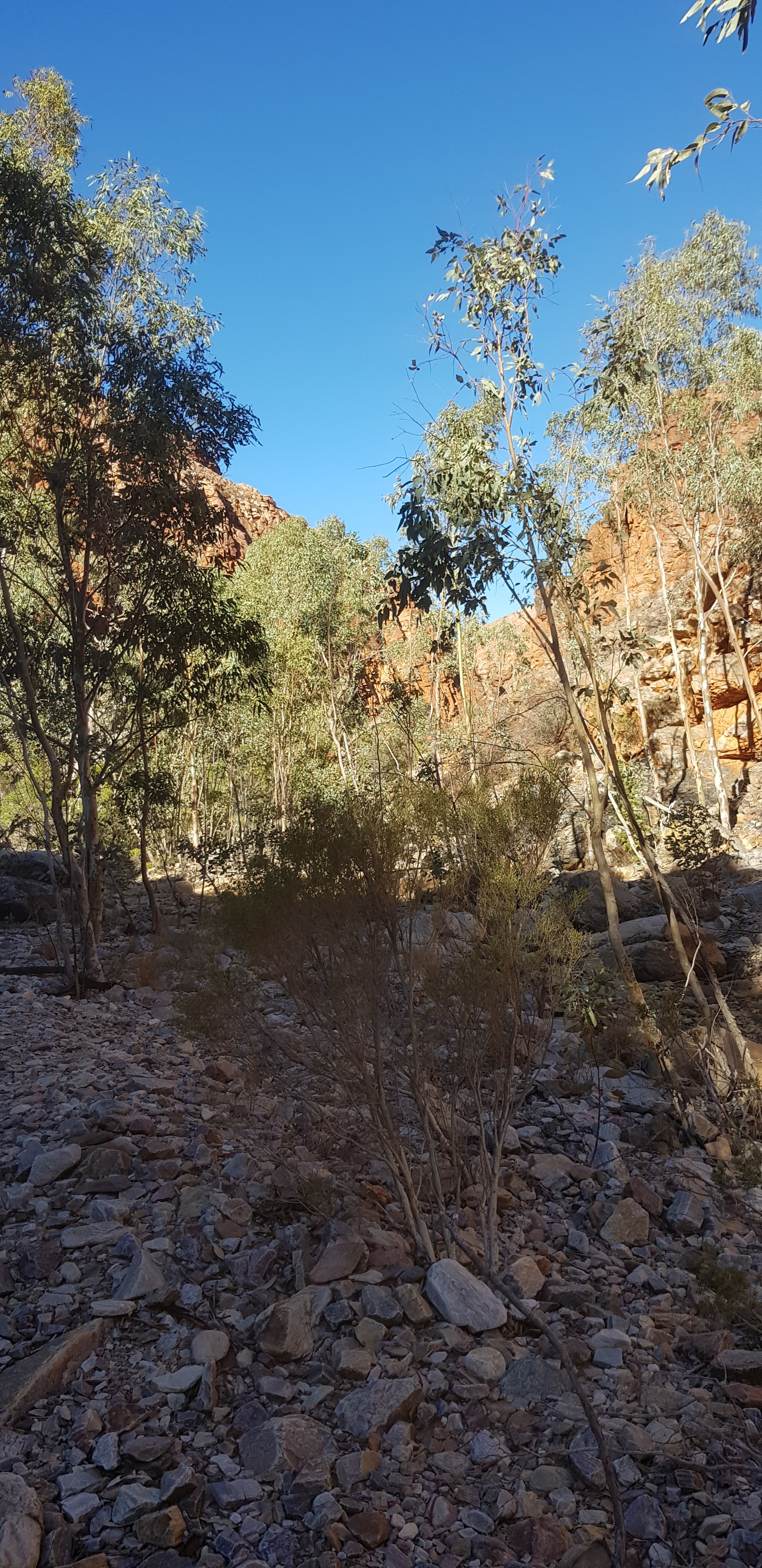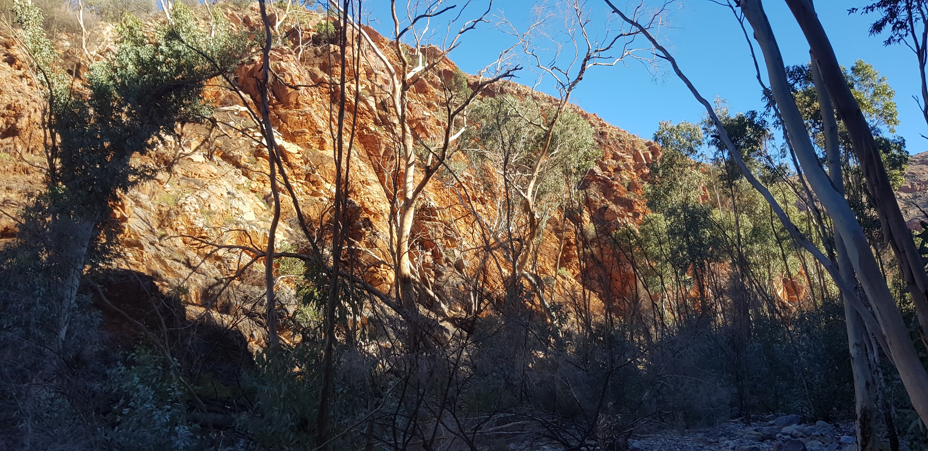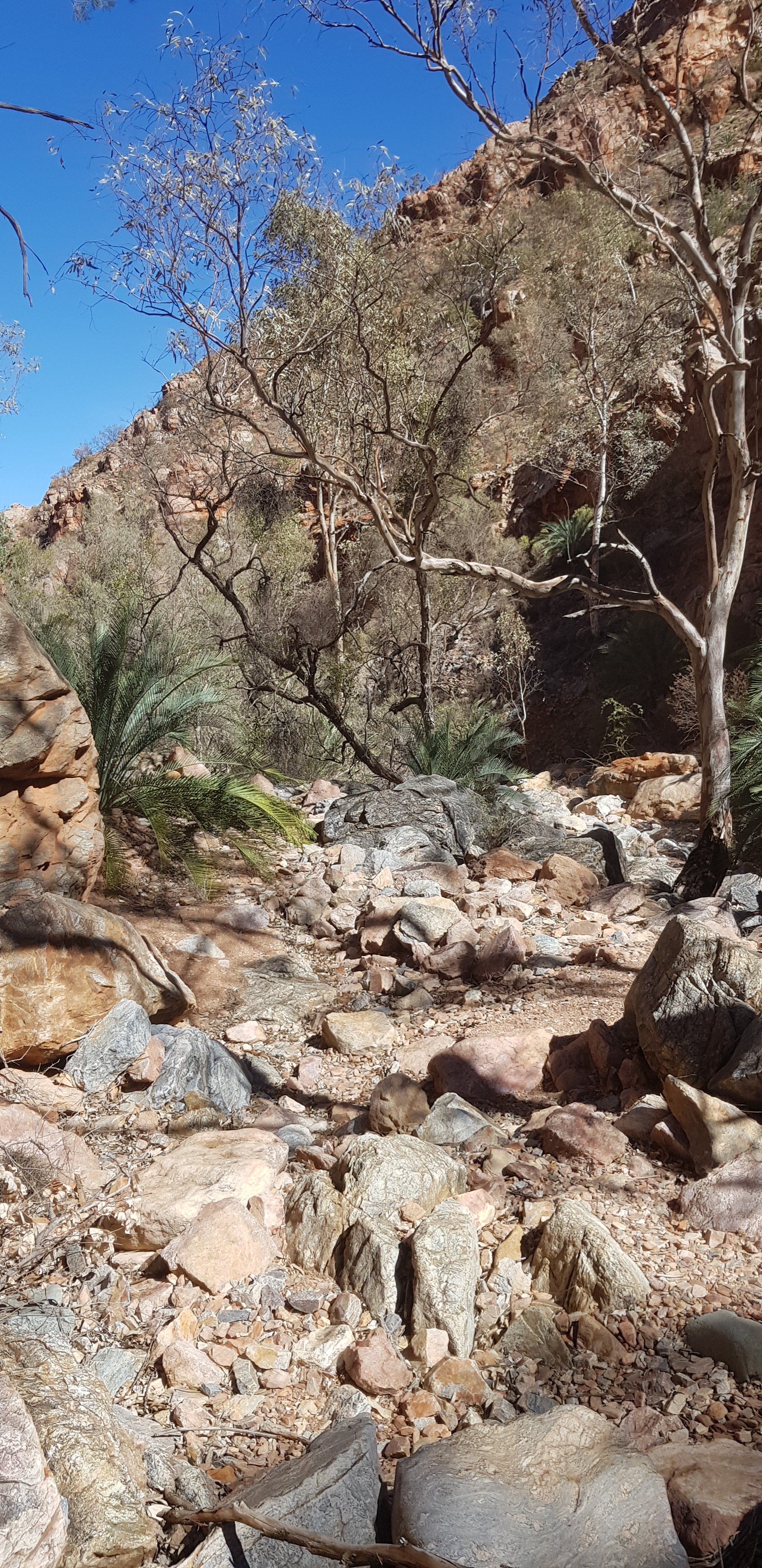 We left Alice Springs around 7am after a surprisingly delicious breakfast of avocado toast and mushrooms at the motel. It was half an hour back to the 4WD track and 50 minutes along a very rough track to get back to Hugh Gorge. We got back to the hikers camp and set off around 9am, with Jubbie coming along for the walk through the gorge. It was a never ending gorge and I felt like I might have spent the rest of my life walking through it! Jubble turned around at what would end up being about the half way mark. All up I think it went for 4kms and took an hour twenty. It was rocky underfoot but no scrambling required, just crossing from one side of the “creek” to the other to find the easiest path.