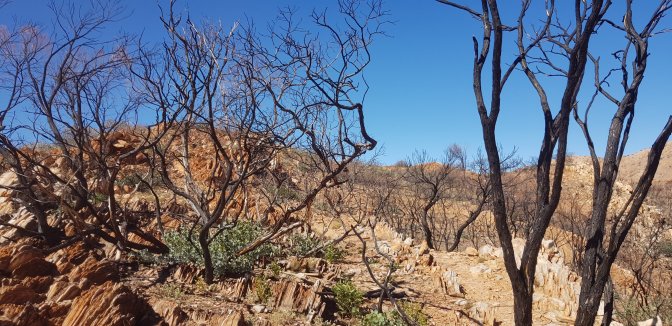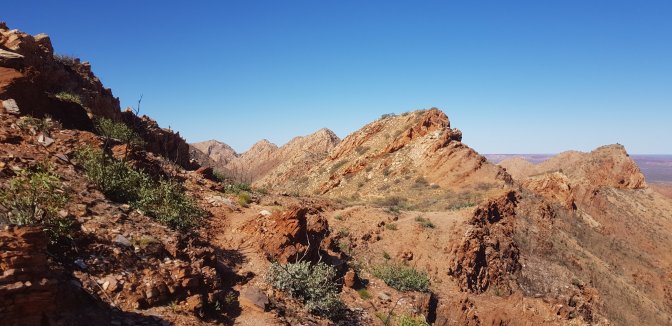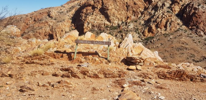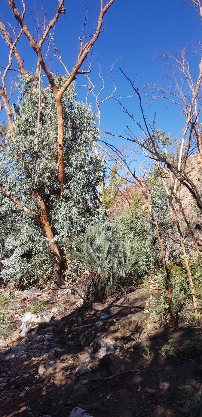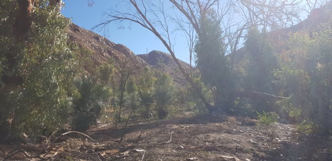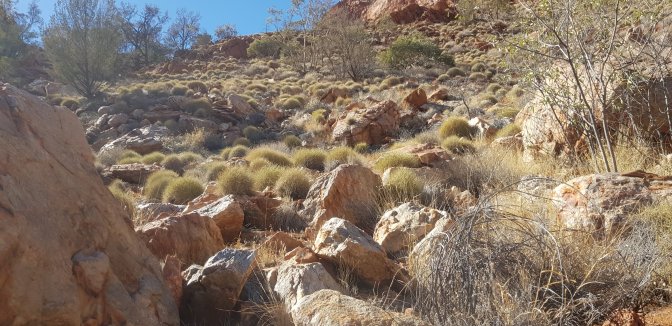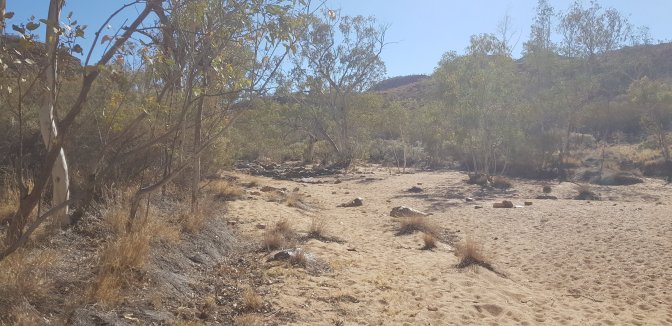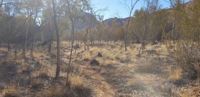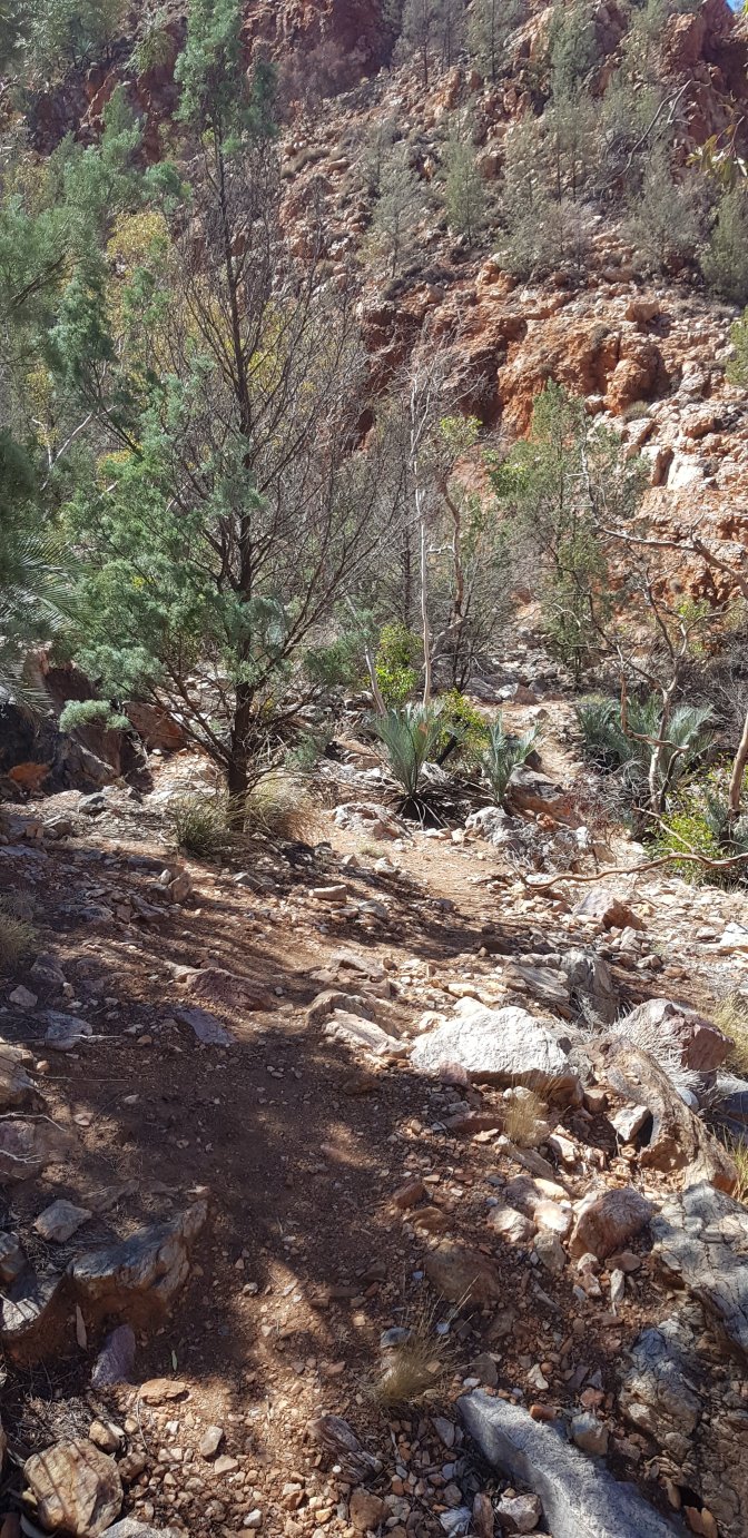 At the bottom of the valley I loved looking back and seeing where I’d come from. The valley joined yet another long, rocky gorge. I made my way along the rocky bottom, swapping from side to side, looking for the best path, and came out very surprisingly on a road. It’s really the first time the path has abruptly met a road. The path followed the road 700m to Standley Chasm. A lot of hikers love this stop because there’s a cafe with burgers and cold drinks. The camping is fairly average, being a small strip of grass on the side of the road. At least there are showers. Jubbie wasn’t at the car when I arrived – he’d gone off to meet me down a different path that’s apparently also marked as the Larapinta Trail!