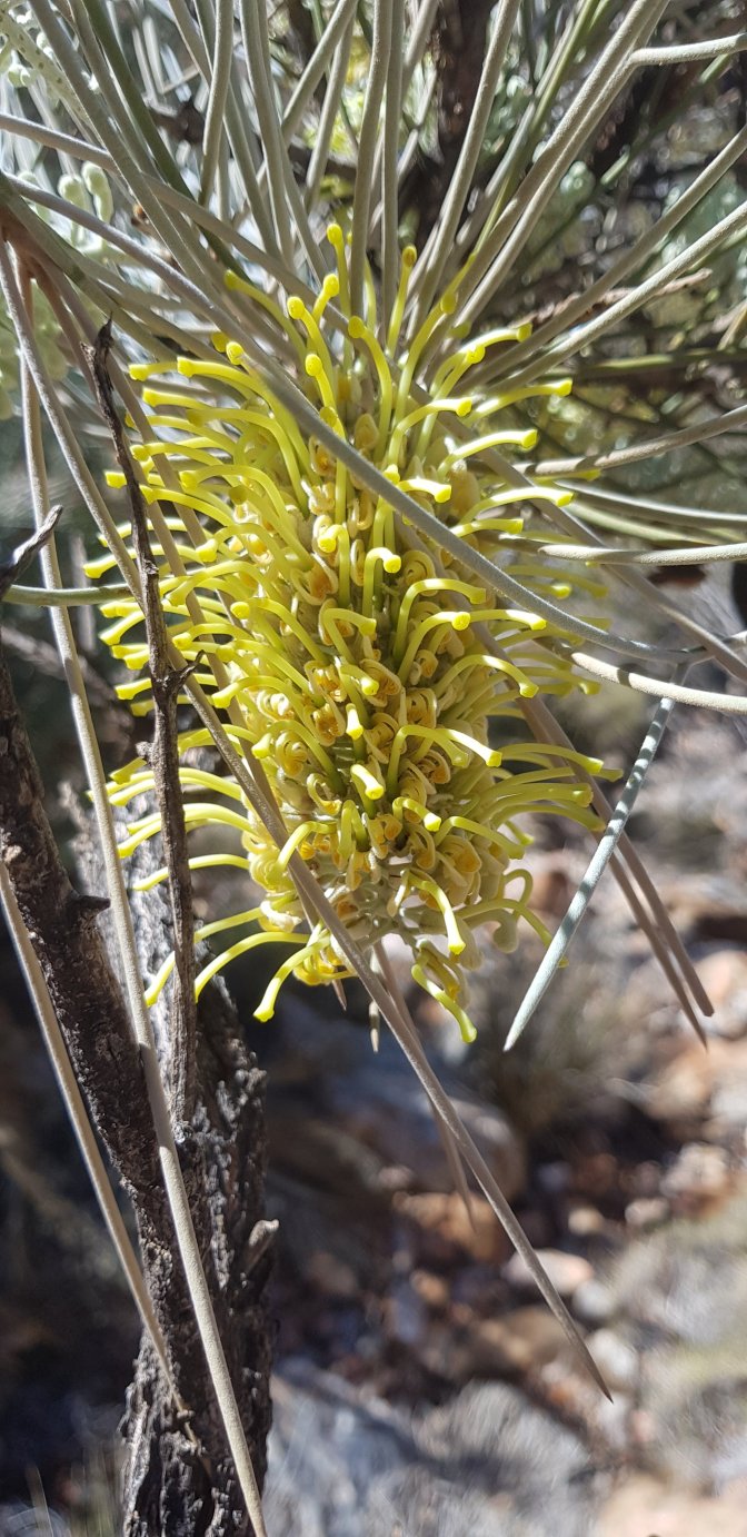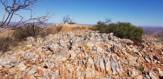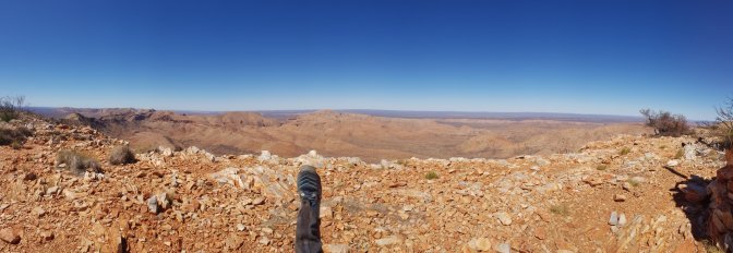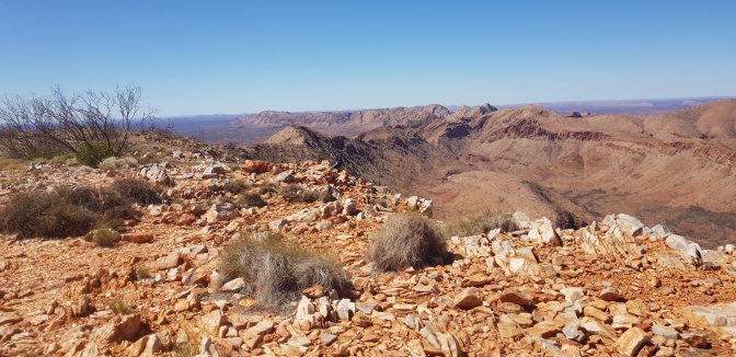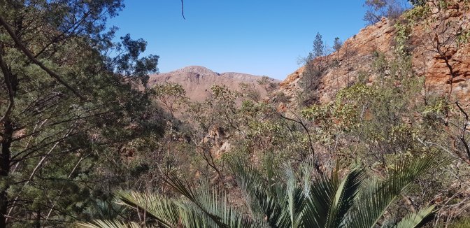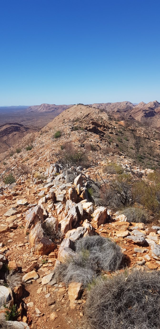After that little gully the path climbed steeply all the way up to Brinkley Bluff. It was a tough climb, starting with a scramble up a rocky gully between switchbacks for those among us who lost the path! The switchbacks were sharp and steep. It was great looking back to the saddle I’d climbed up and through and down into the valley. As I climbed higher, I lost sight of the saddle. It was certainly a tough slog up to the summit. But oh how worth it. It might have been my favourite summit of the trip. Fantastic views, lots of great camping options, mobile coverage (!), and the perfect rock to sit on for lunch! I met Steve and Kate up there and had a quick chat before they headed off towards Standley Chasm.