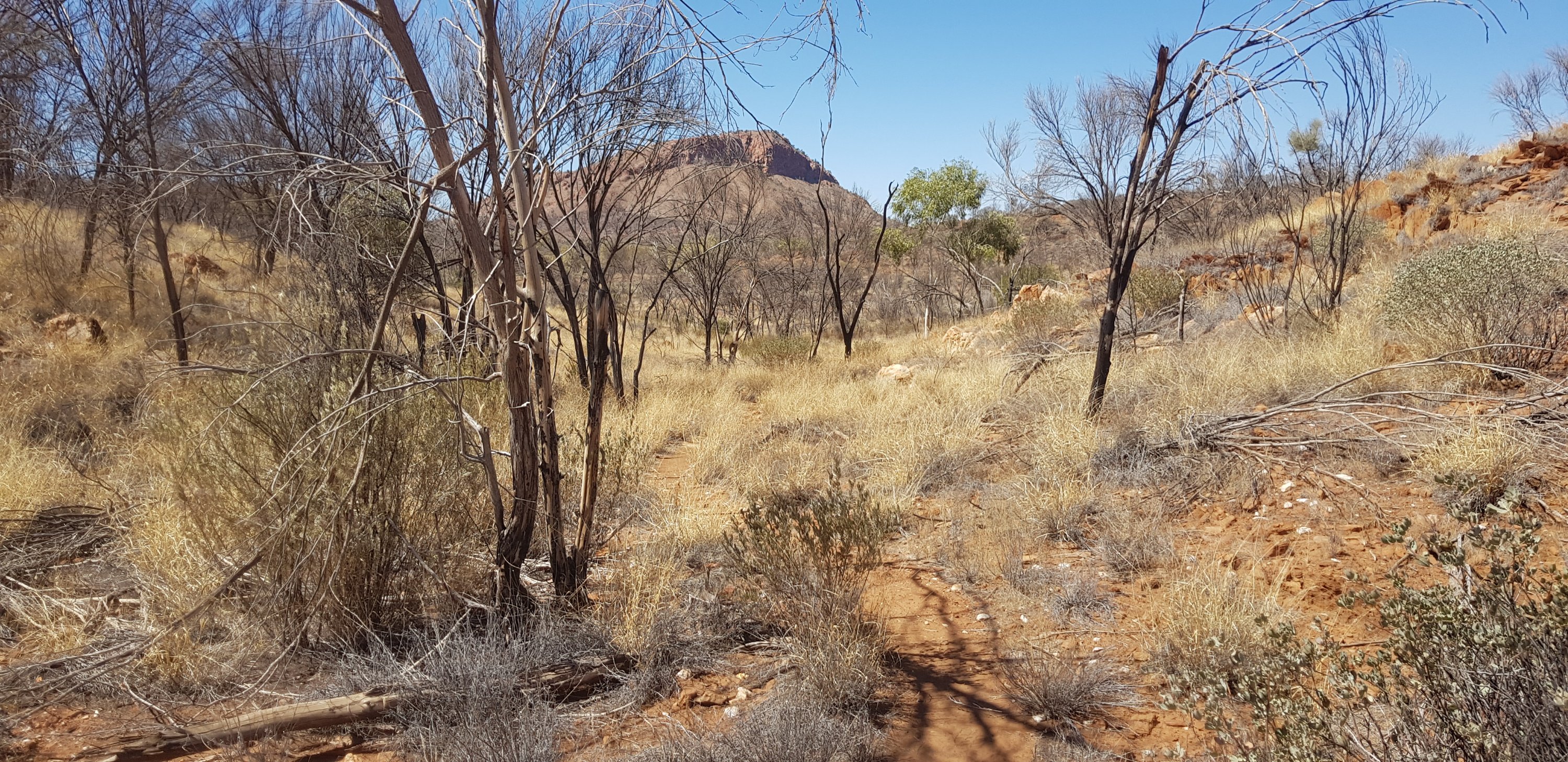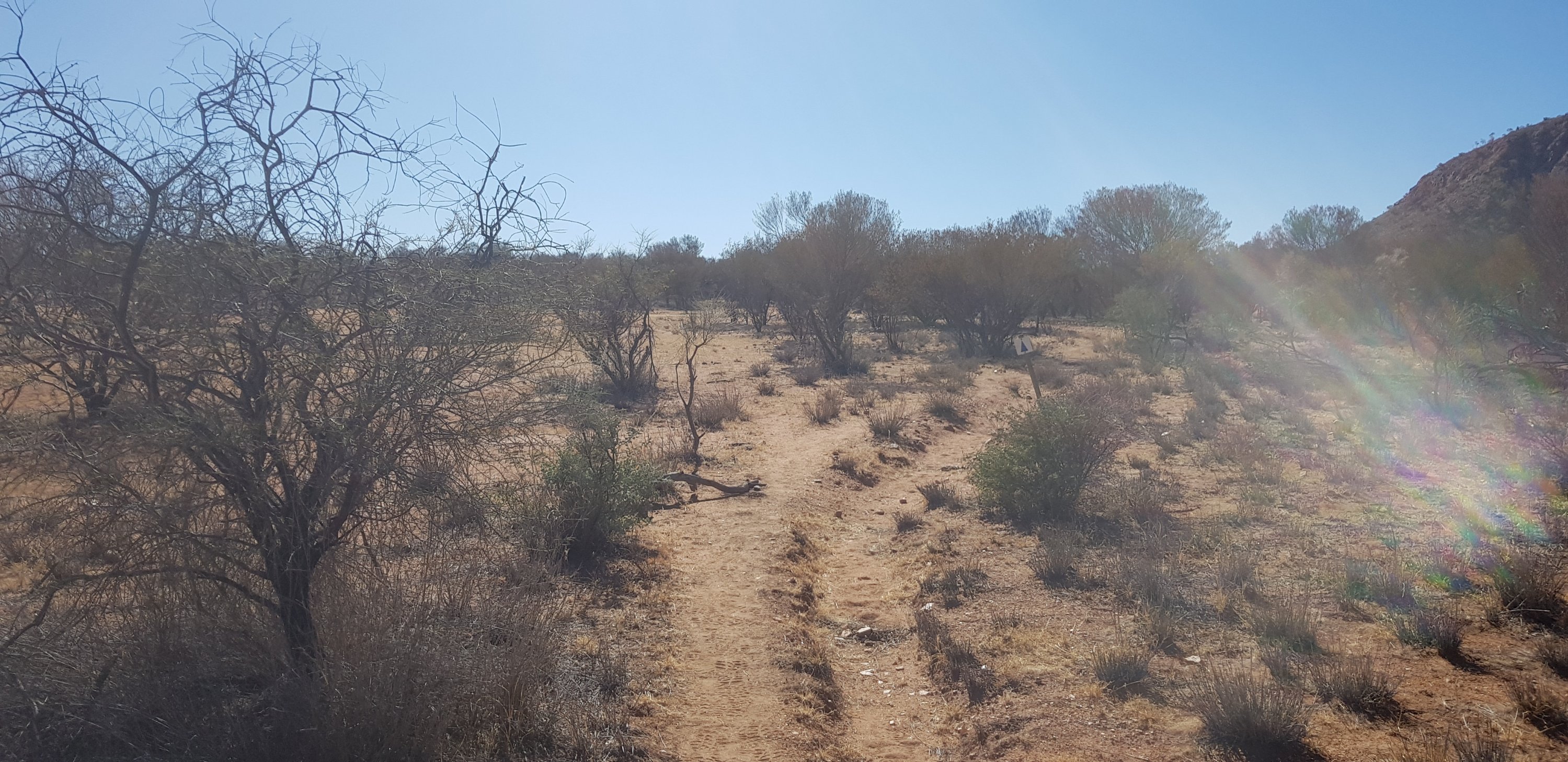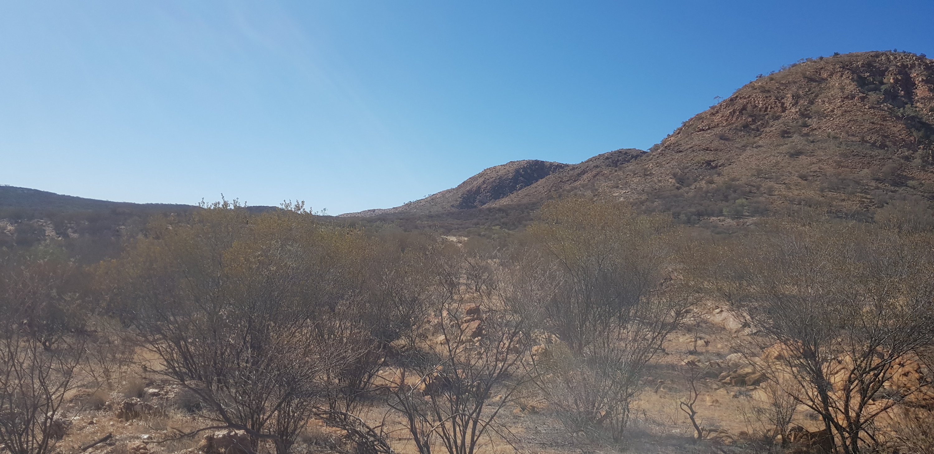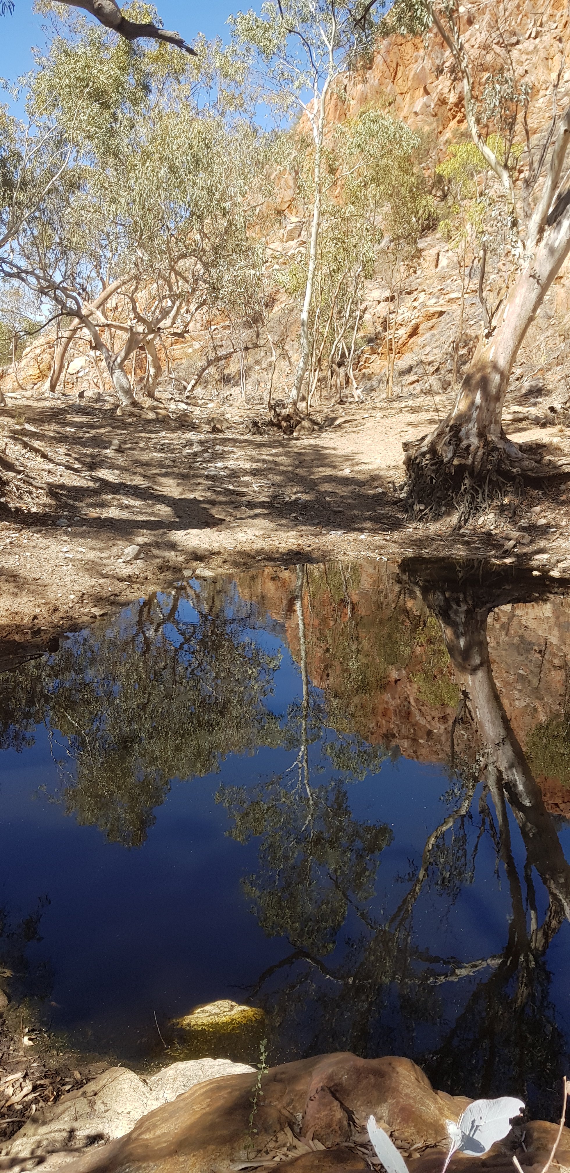 There were very few wild flowers and very little variation of terrain. In some areas there were more rocks and a little less grass, but that was about it. At the end of the day I caught up with Kate and Steve at the hikers camp. They both looked absolutely exhausted and had not enjoyed today. Kate especially found it long and boring. I can understand that even though I quite enjoyed it myself. I met Jubble and had a quick look at Simpsons Gap. It’s a permanent waterhole but clearly the water is low. In the gap there’s a rockslide down one of the sides where a colony of black footed rock wallabies lives. Jub was lucky enough to see one a bit earlier.