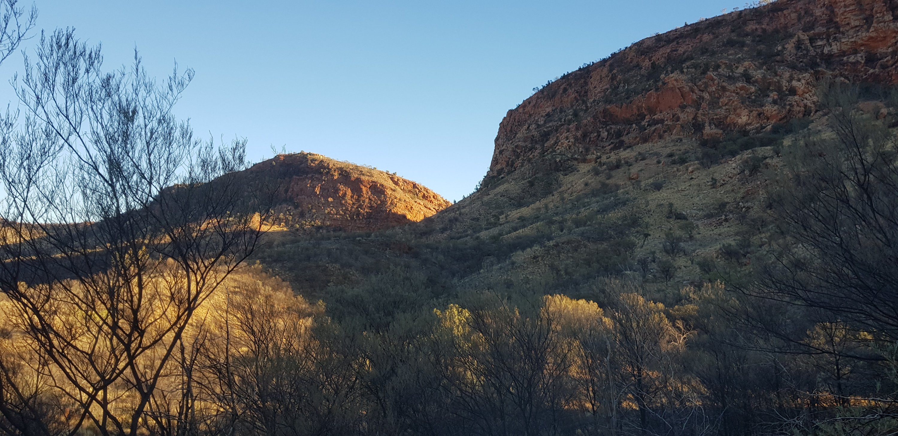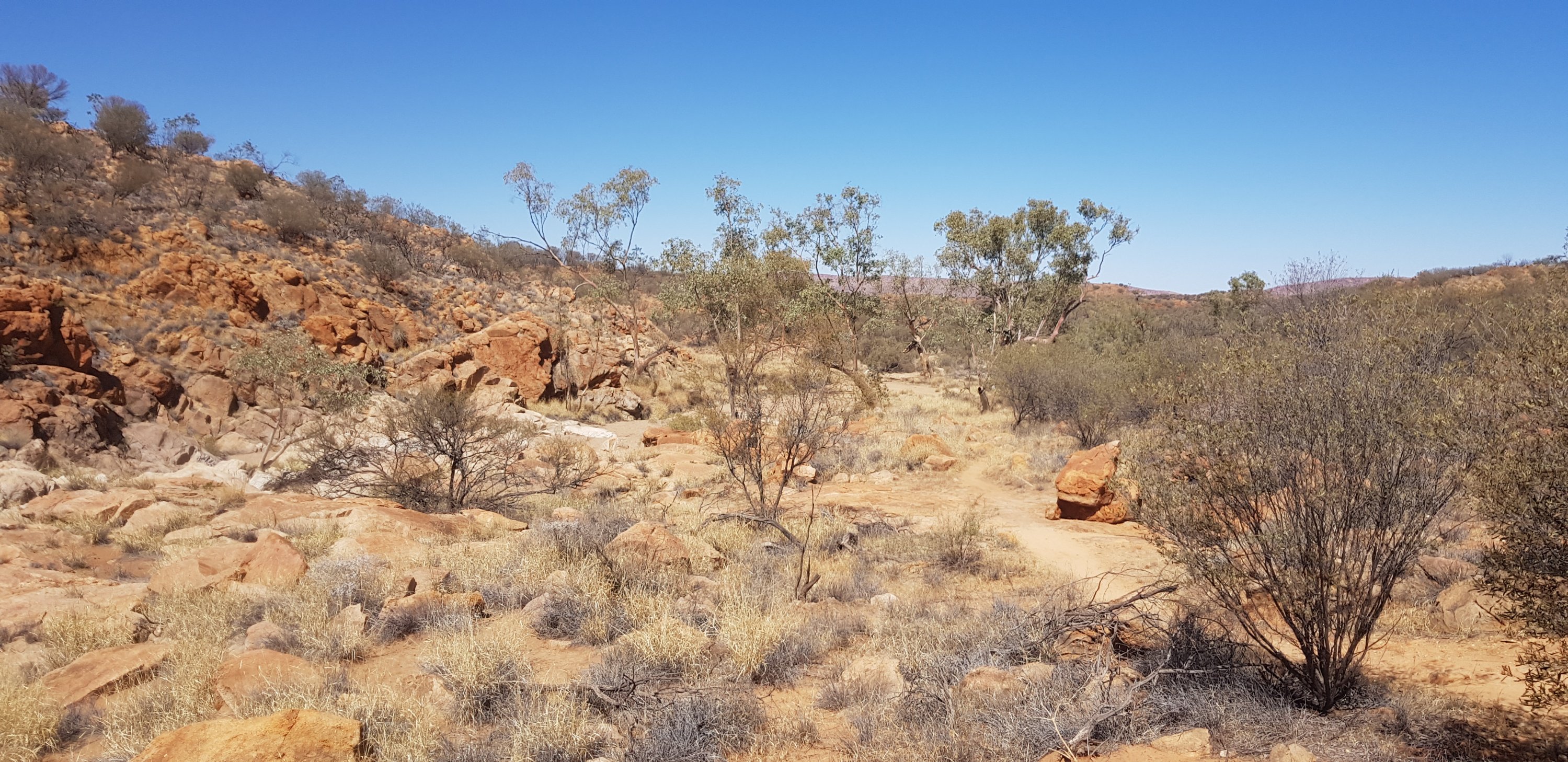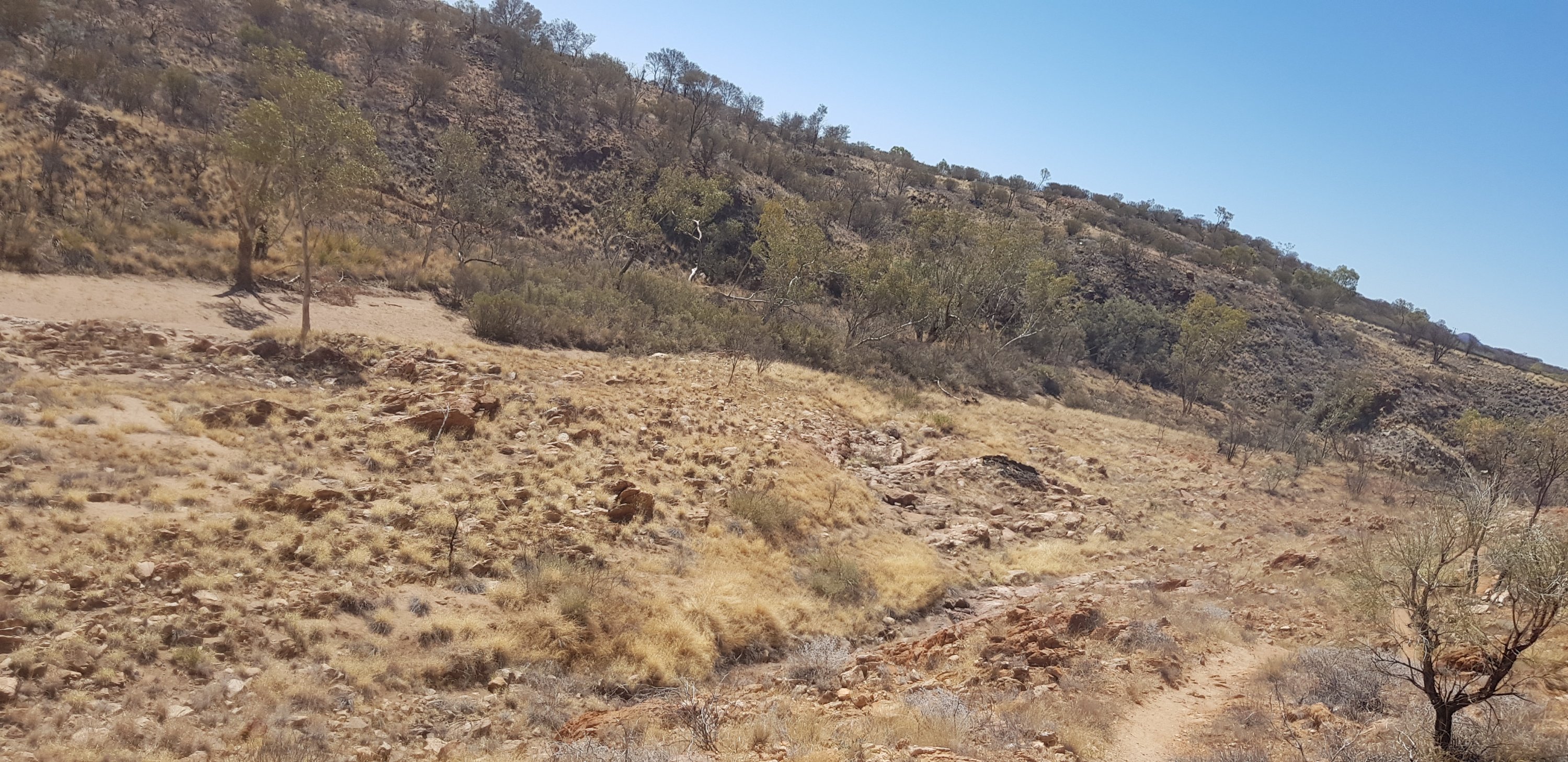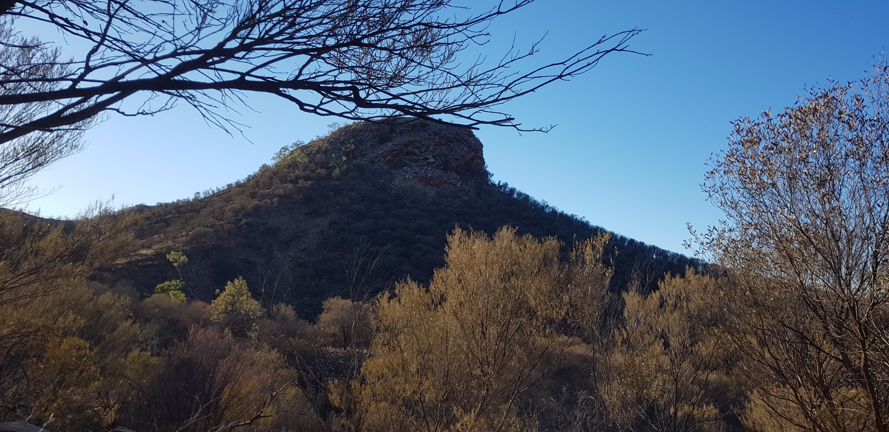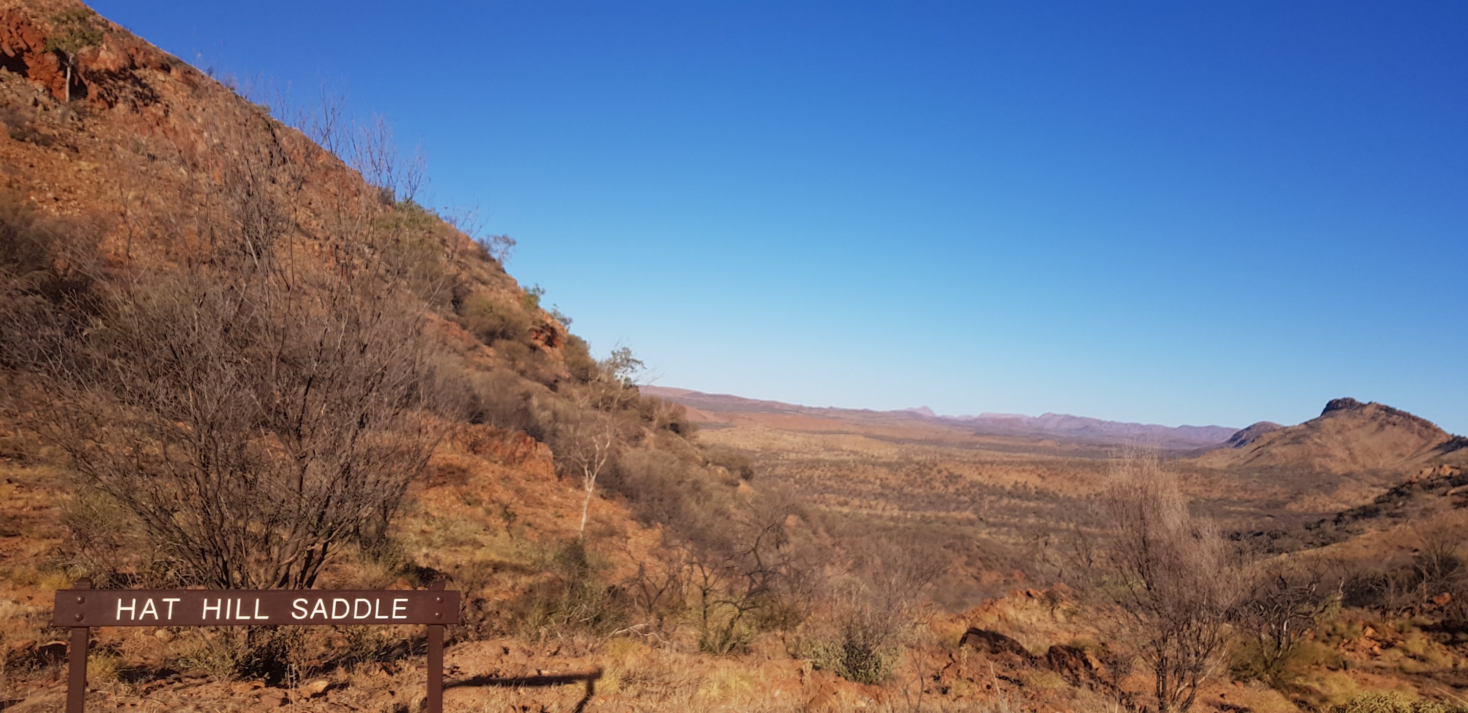 Today’s trail headed up the south slope of Hat Hill and skirted around it just below the junction of the slope and the vertical rock. I’d seen Hat Hill from a previous lookout without realising what it was and that I’d be circumnavigating it. From there the track was flat or slightly undulating hills to Wallaby Gap. Wallaby Gap was pretty unimpressive compared to the other gaps and waterholes I’ve seen.