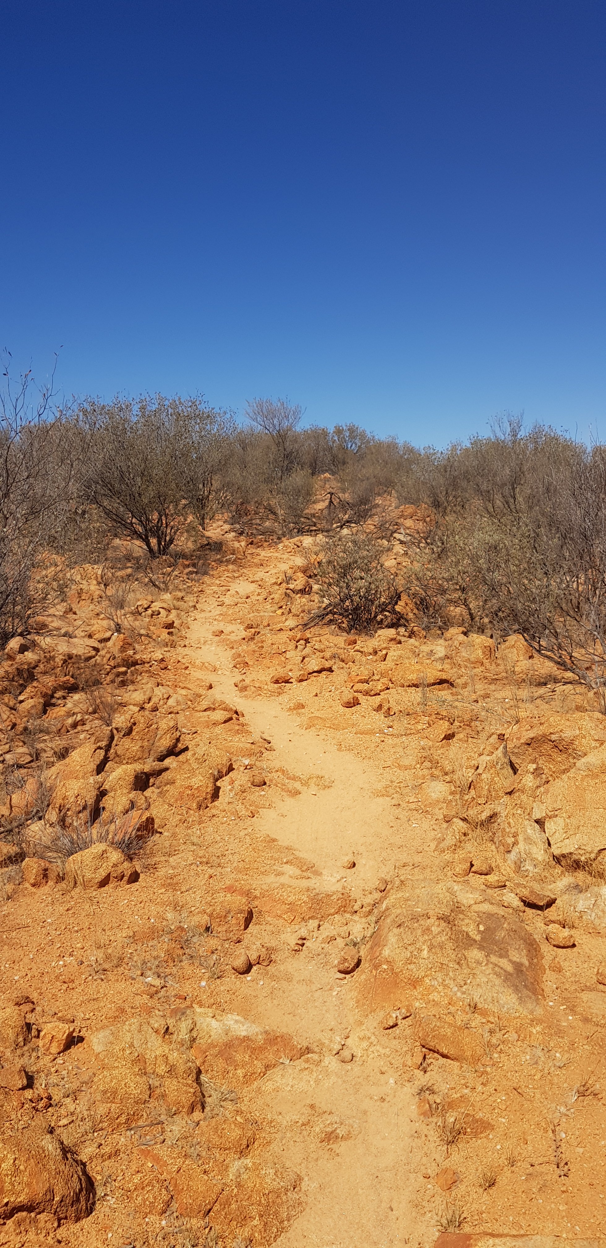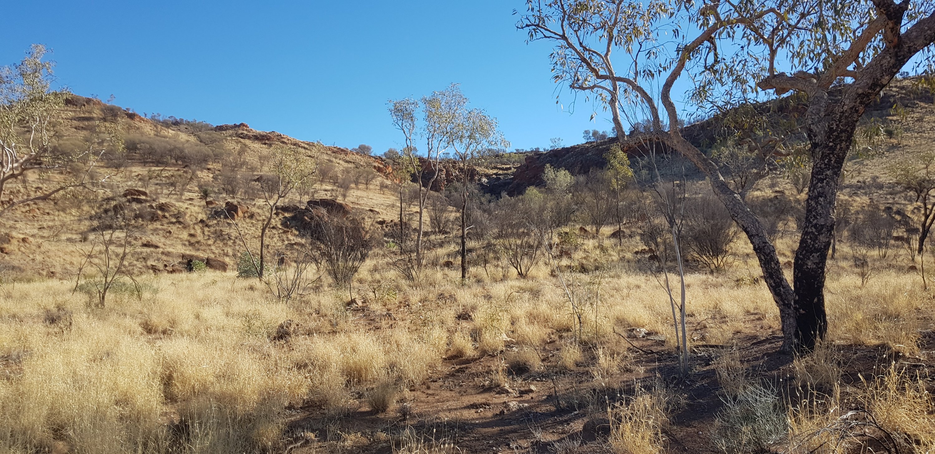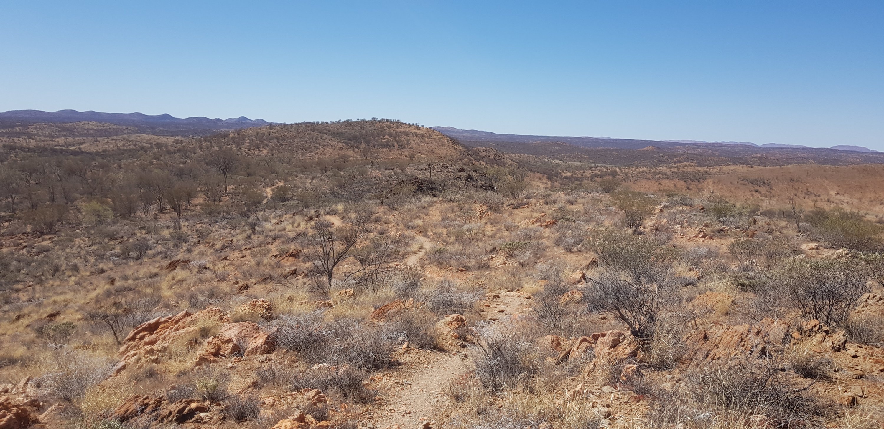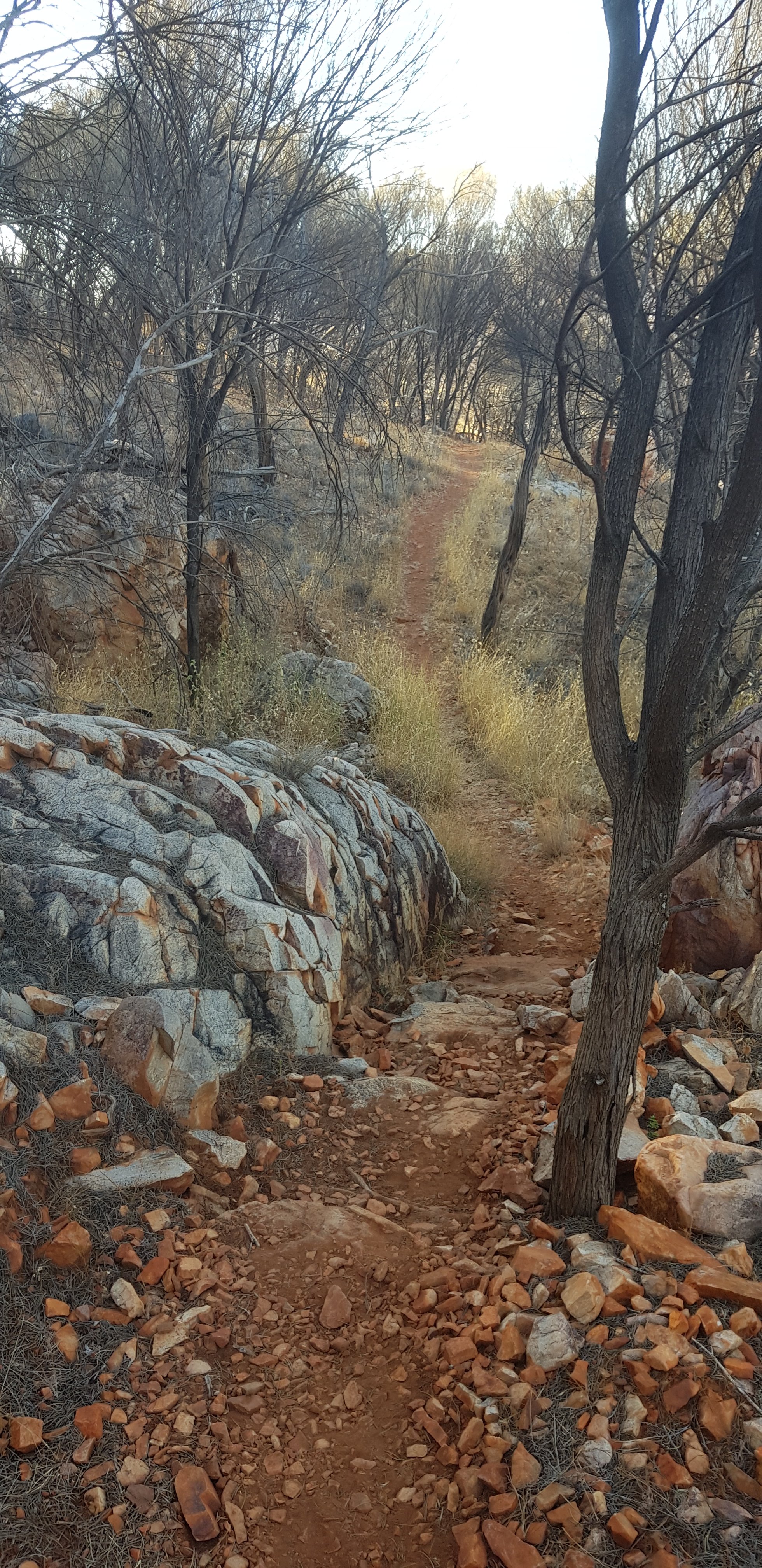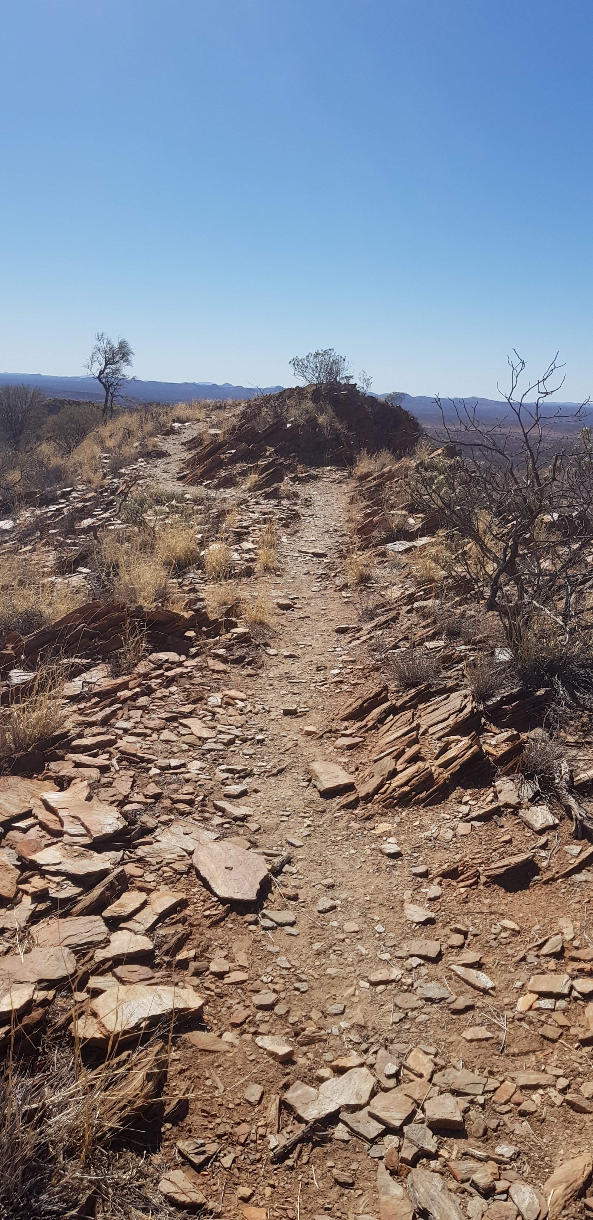 Today’s trail headed up the south slope of Hat Hill and skirted around it just below the junction of the slope and the vertical rock. I’d seen Hat Hill from a previous lookout without realising what it was and that I’d be circumnavigating it. From there the track was flat or slightly undulating hills to Wallaby Gap. Wallaby Gap was pretty unimpressive compared to the other gaps and waterholes I’ve seen.