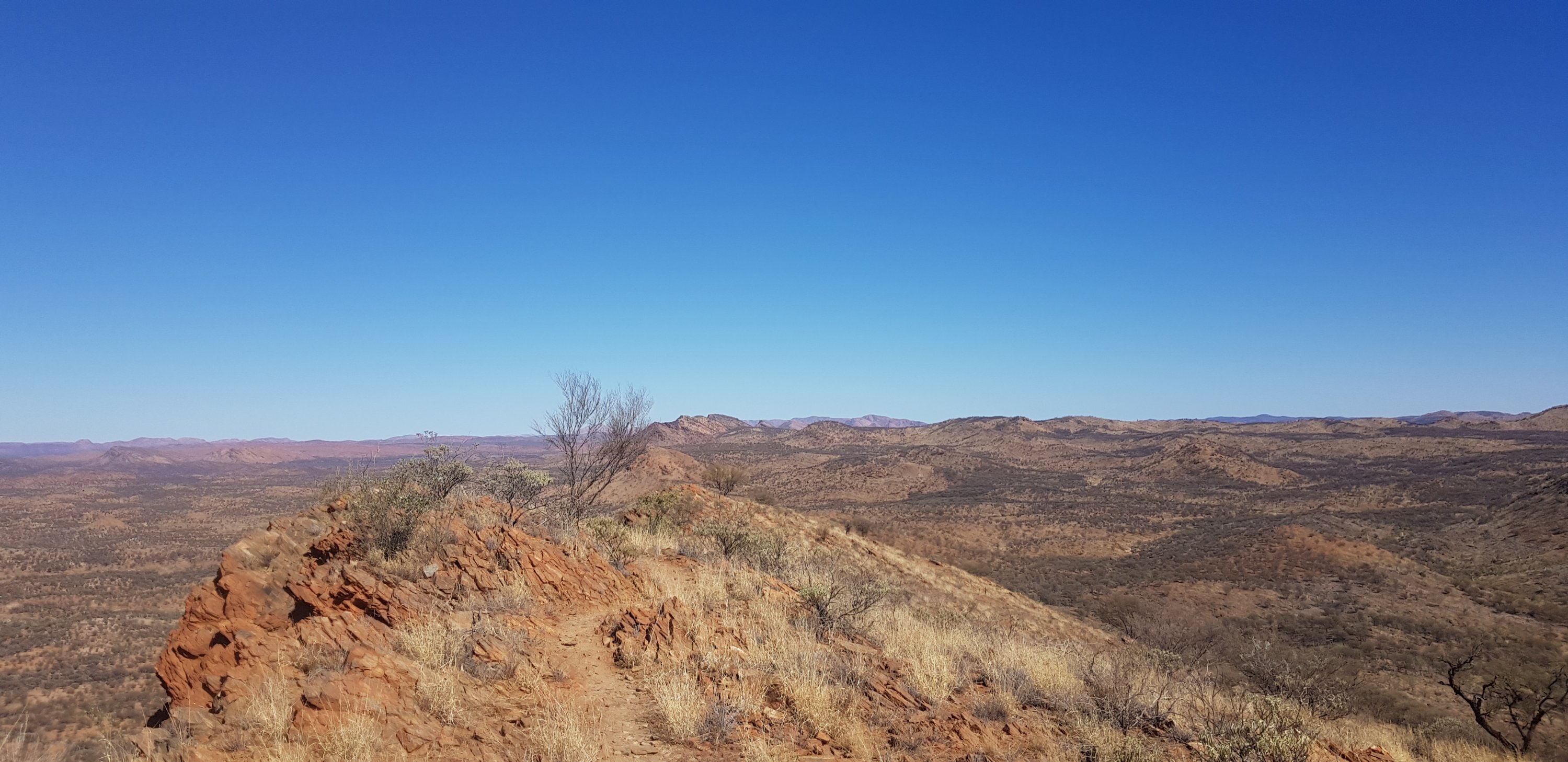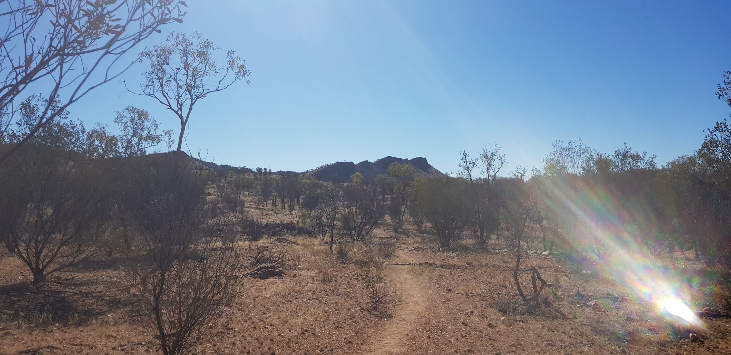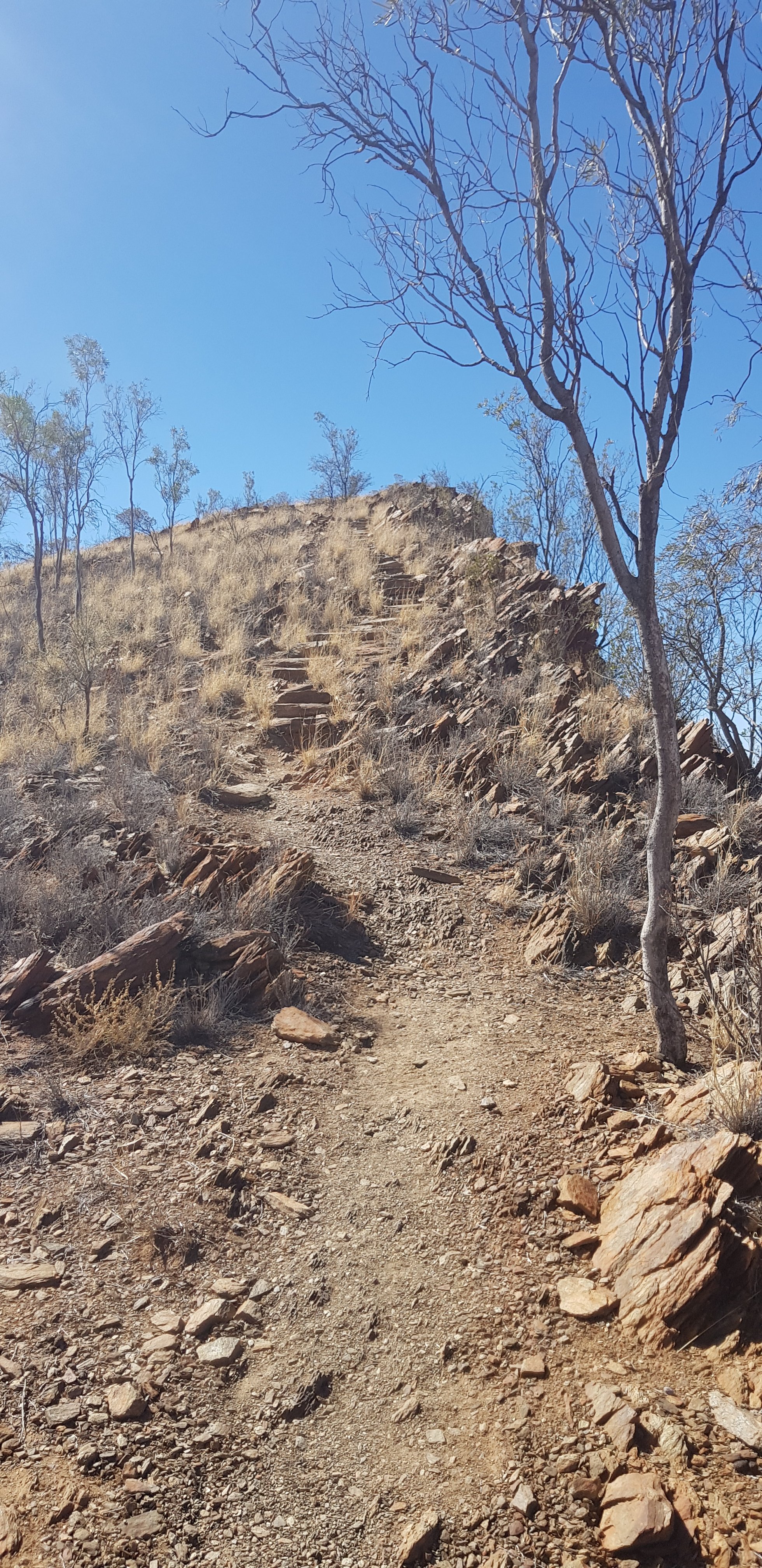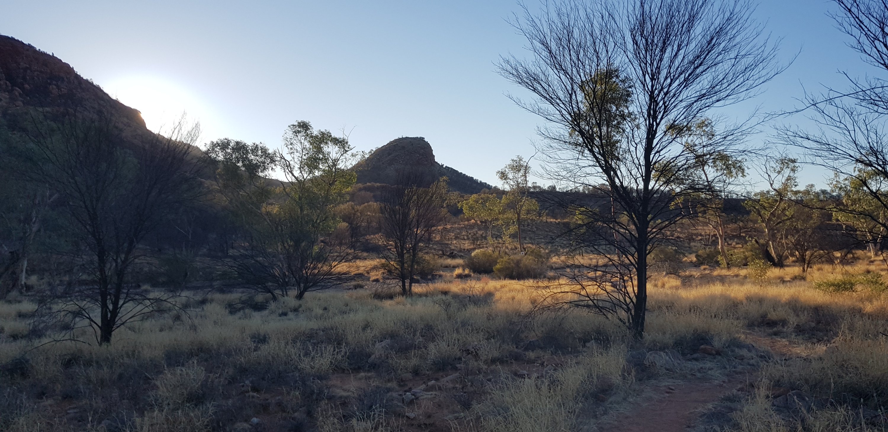 Today’s trail headed up the south slope of Hat Hill and skirted around it just below the junction of the slope and the vertical rock. I’d seen Hat Hill from a previous lookout without realising what it was and that I’d be circumnavigating it. From there the track was flat or slightly undulating hills to Wallaby Gap. Wallaby Gap was pretty unimpressive compared to the other gaps and waterholes I’ve seen.