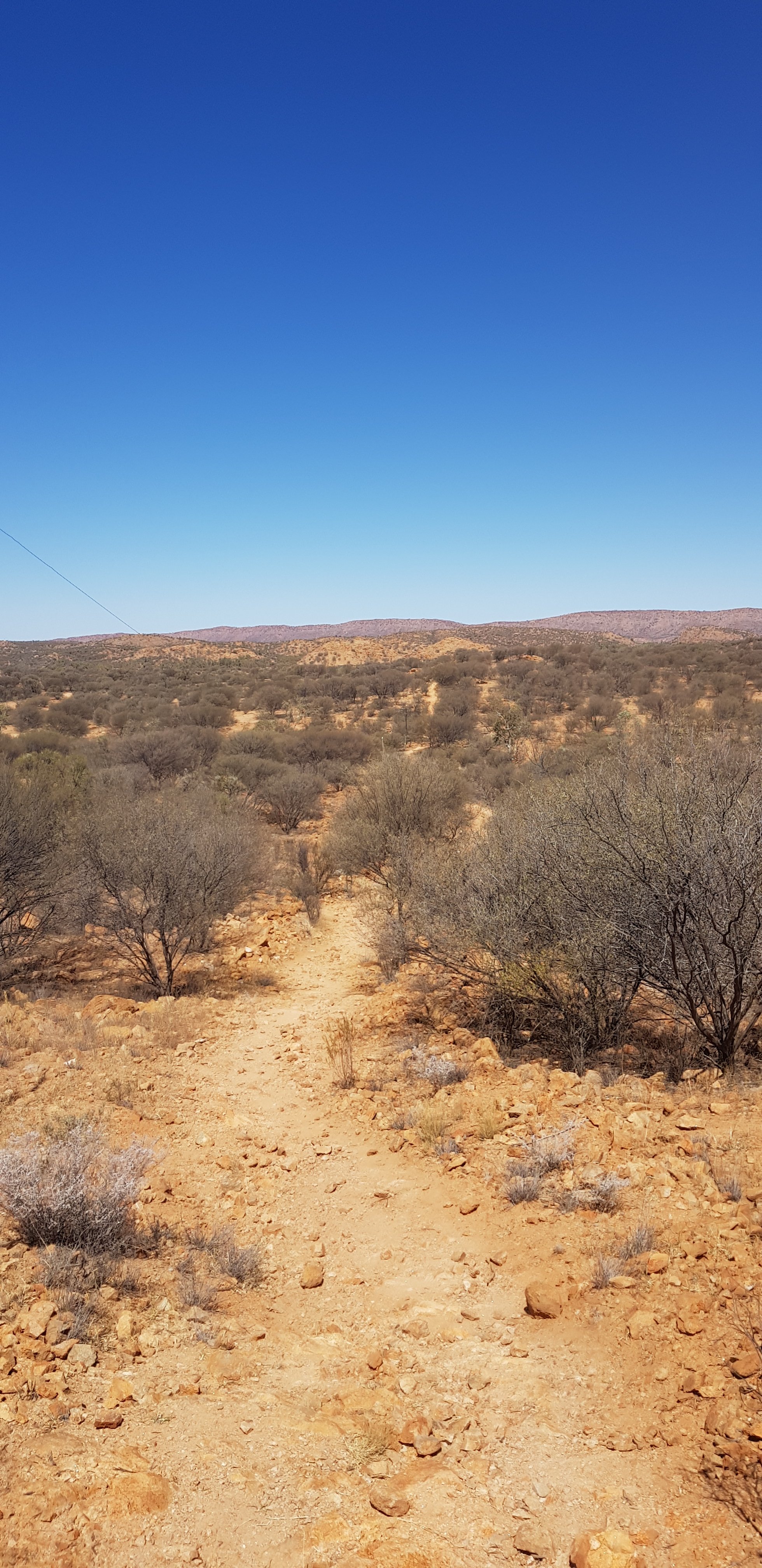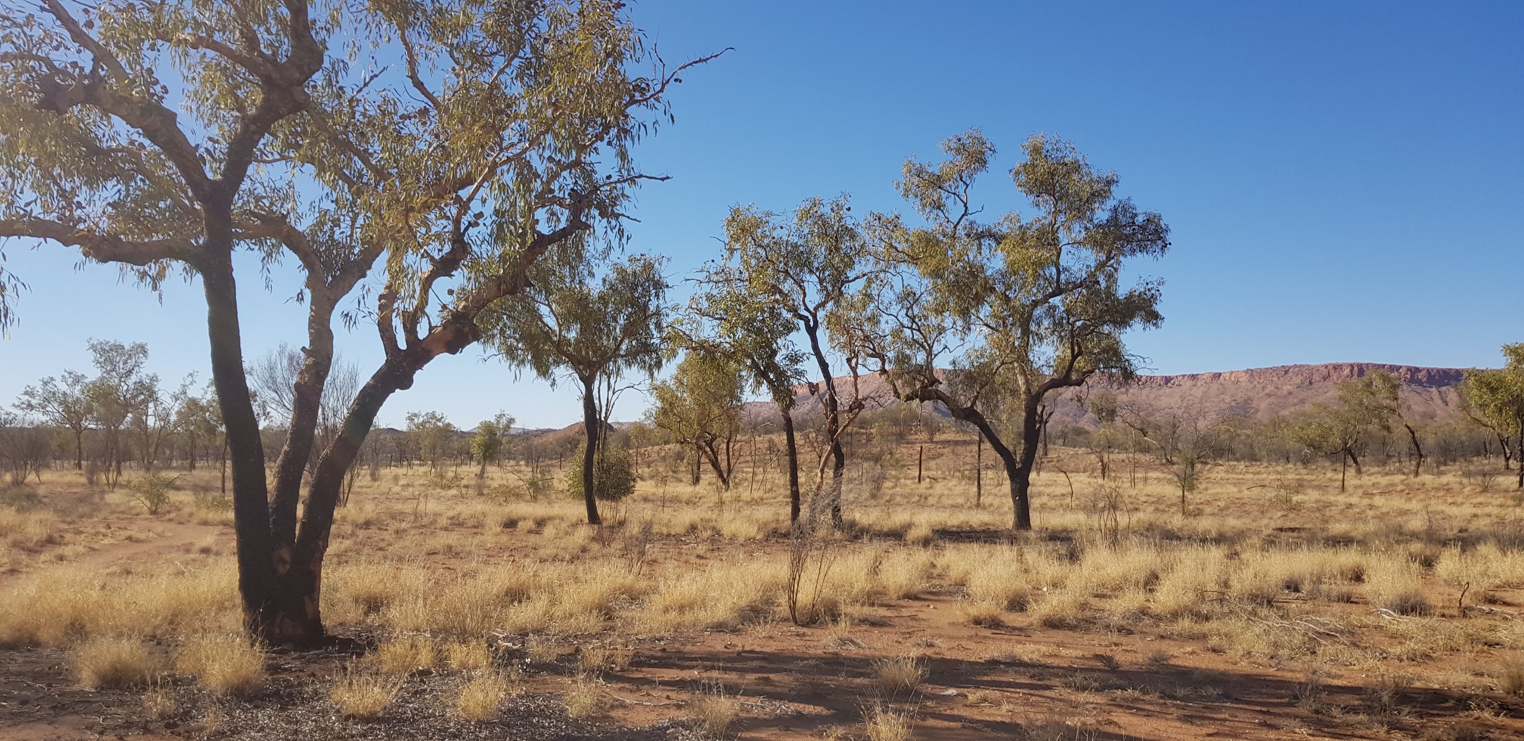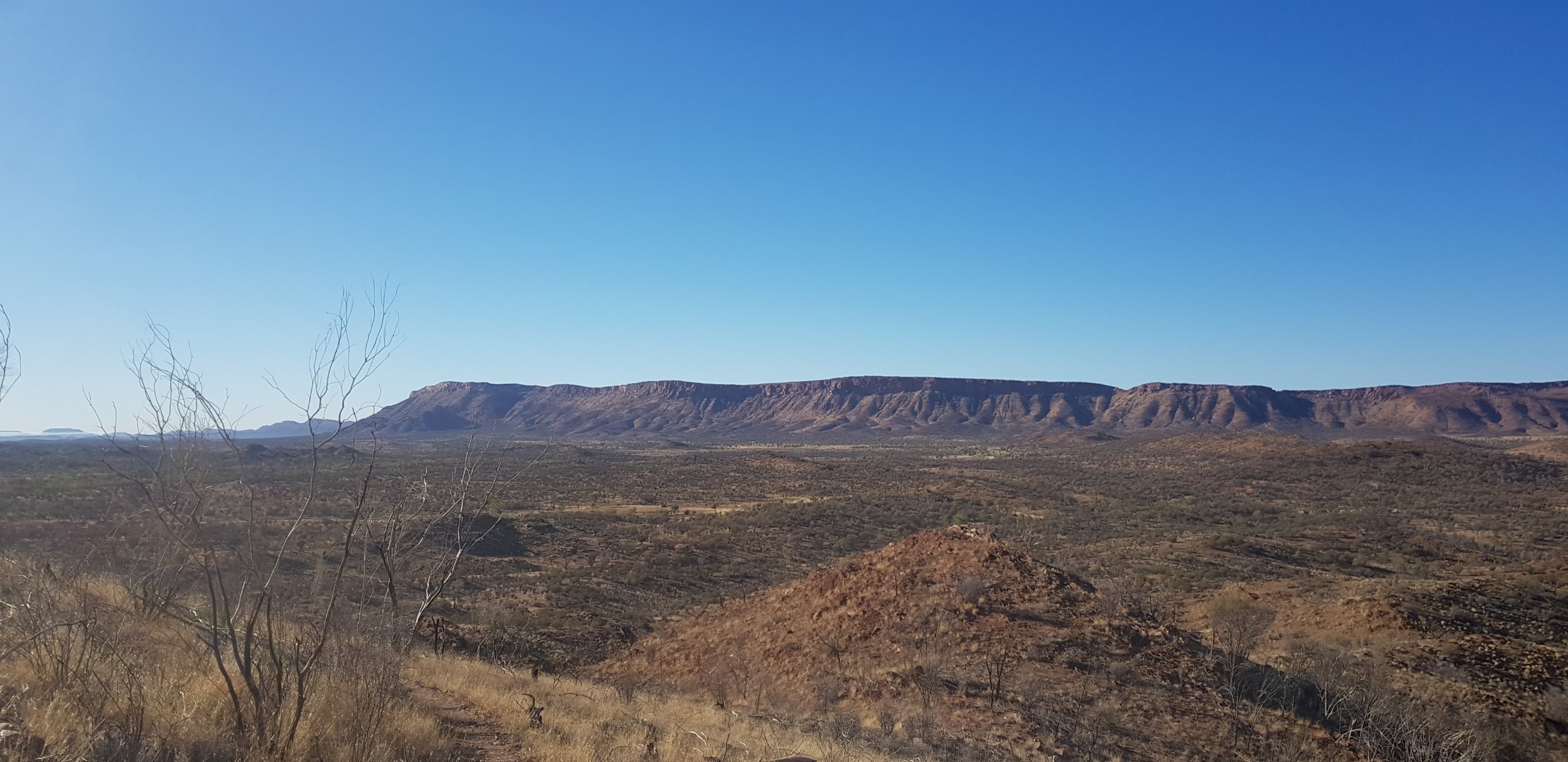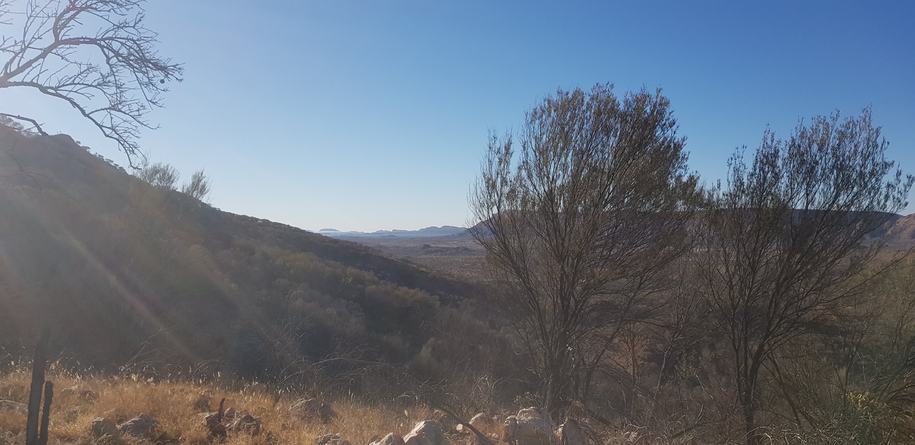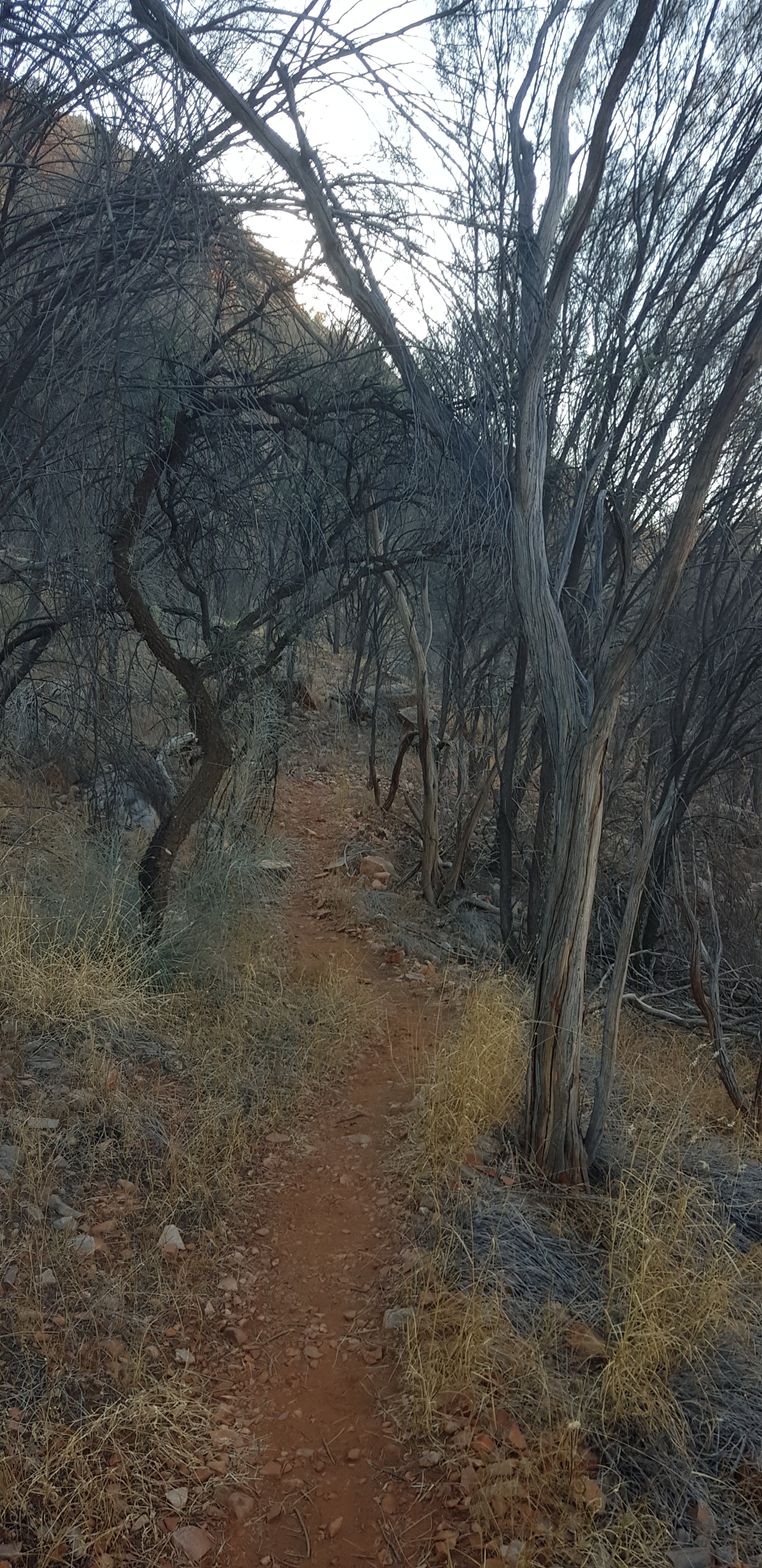 Today’s trail headed up the south slope of Hat Hill and skirted around it just below the junction of the slope and the vertical rock. I’d seen Hat Hill from a previous lookout without realising what it was and that I’d be circumnavigating it. From there the track was flat or slightly undulating hills to Wallaby Gap. Wallaby Gap was pretty unimpressive compared to the other gaps and waterholes I’ve seen.