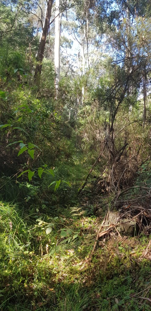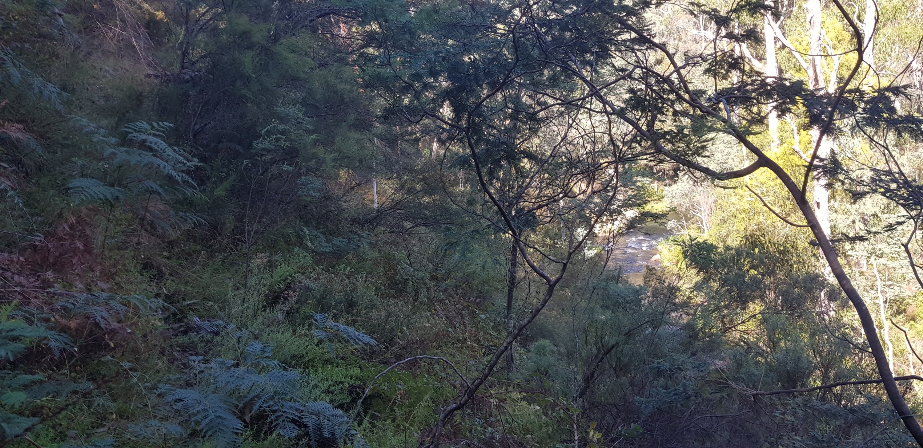 When I got to the next river crossing, I lost the track. I didn’t realise I was at the point I needed to cross and kept looking for the track. I can officially tell you, I do not like blackberries! I was caught in them trying to work out where the track was. I went along a way, back tracked, tried to go up higher. I was thinking I might not find the track and I’d run out of time to get to camp even if I did find the track. The walk had been way slower than I’d imagined. Finally I worked out where I was, saw a little pink ribbon hanging from a tree on the other side behind some blackberries, and knew that I needed to cross the river (Crooked River) straight into the blackberry patch on the other side. Luckily the patch was a small one and I was able to pull and push my way through it.