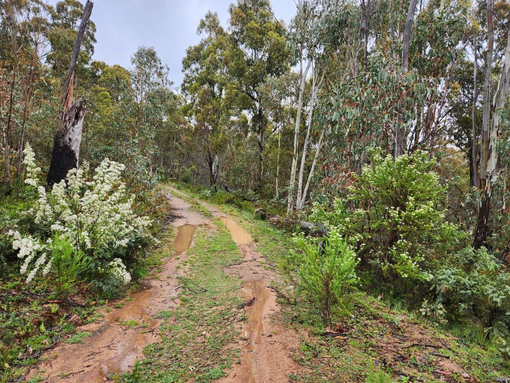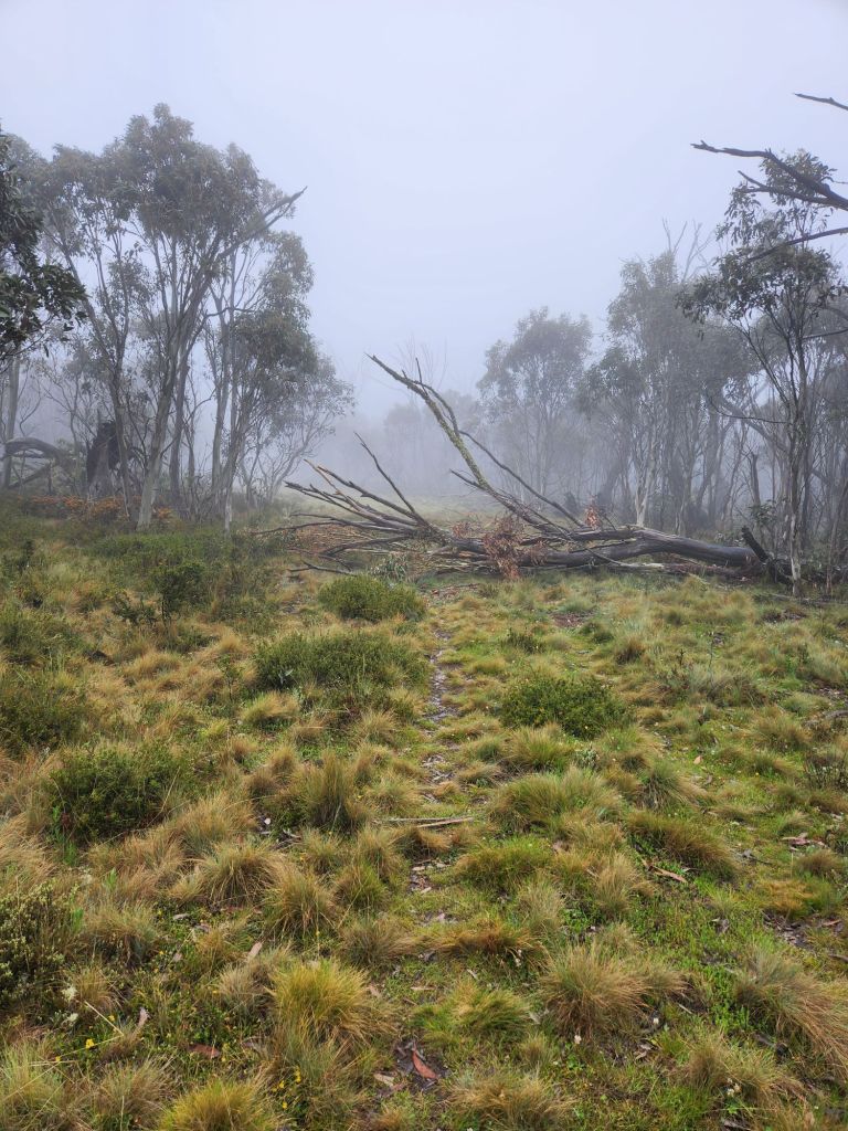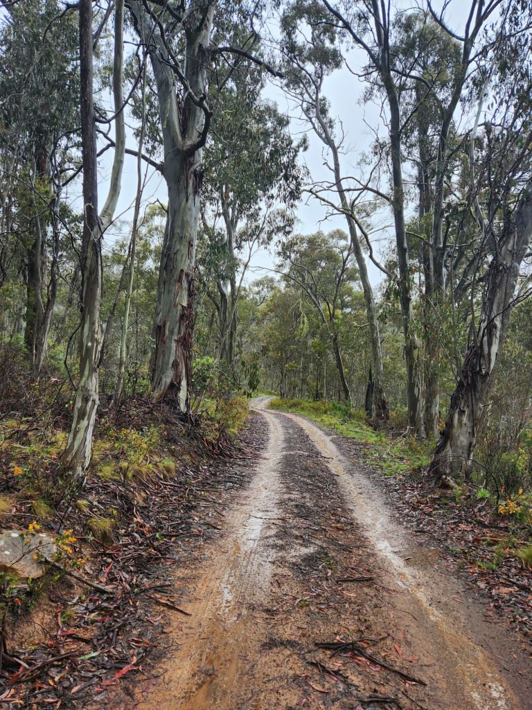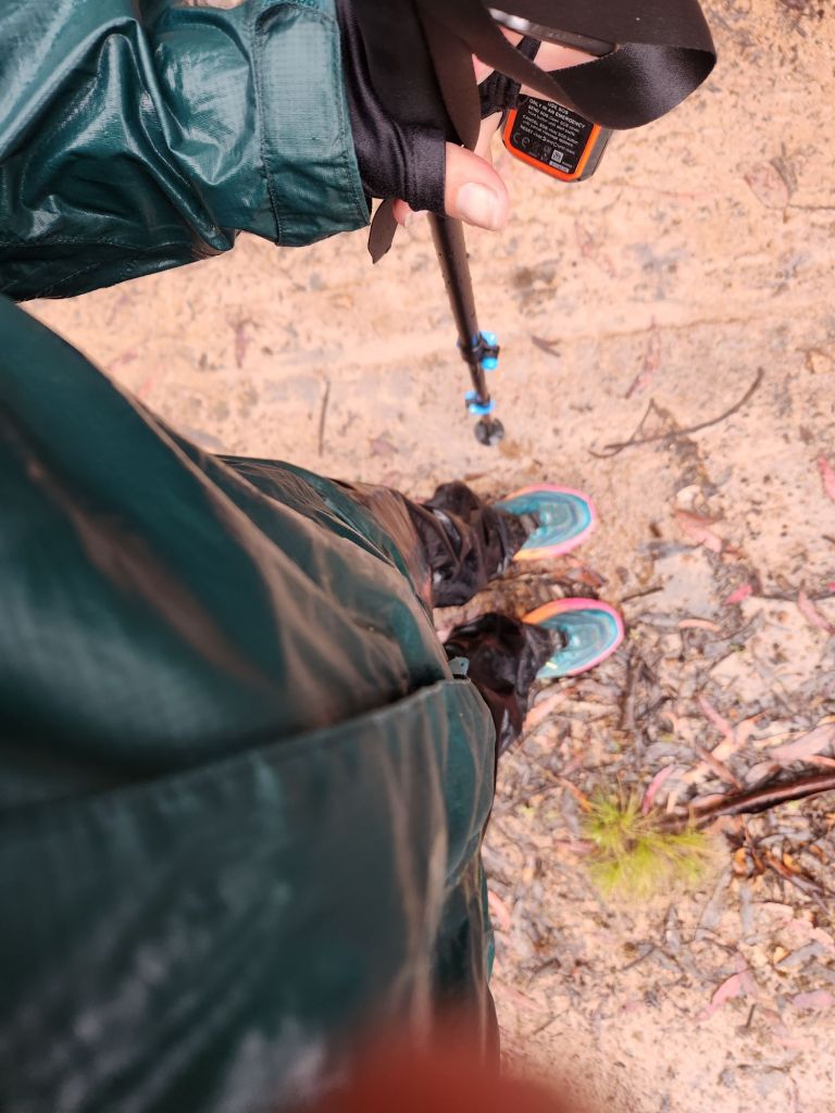 It rained on and off last night, at times very heavily. I hadn’t stretched my tent as tight as I should have, and sometimes, when a gust of wind blew, it flapped, and a sprinkling of condensation rained on me. At least I was warm. I didn’t sleep too well and seemed to be awake a lot, but at least I was off my feet for lots of hours. The rain eased up around 5:30, so I got up and ready, packing up my wet tent to get dry another time. After savoury oats breakie, I was on the track at 7am, just after Lachie, who left at 6:30.