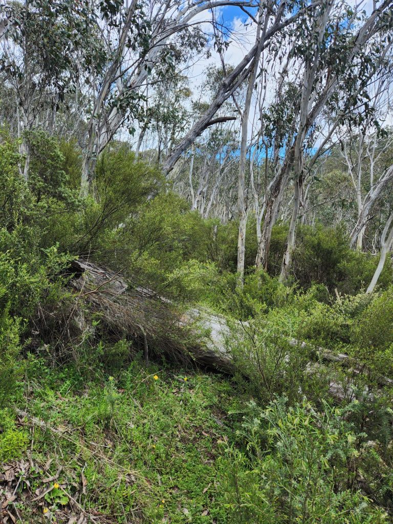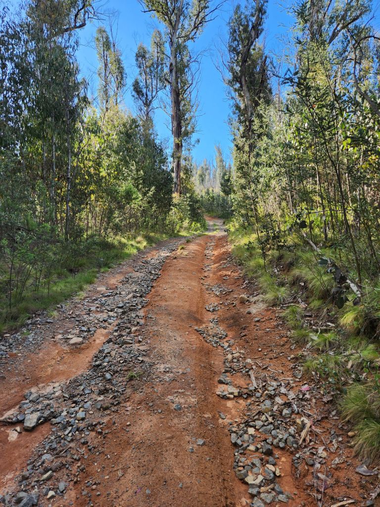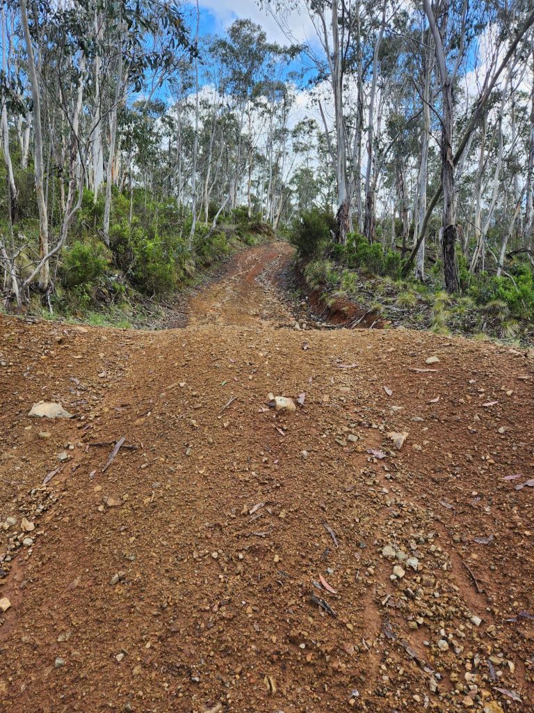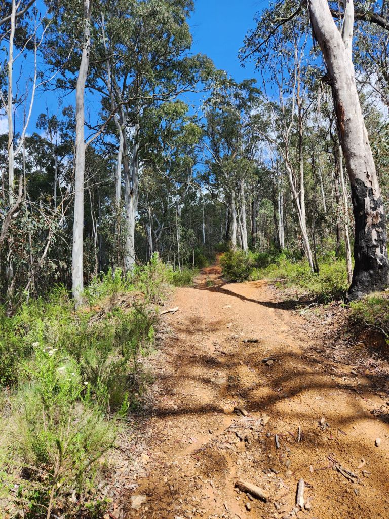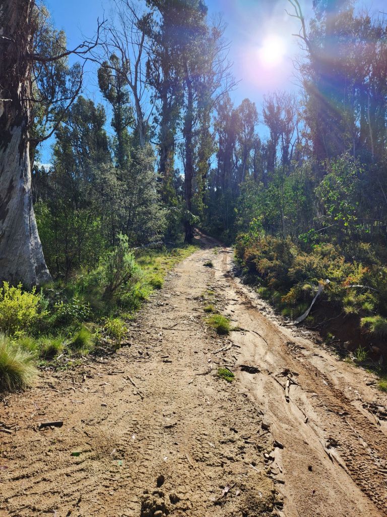 After walking through a valley for a while (hello daddy emu and four cute baby emus – sadly, no photo), the climb started. It was super steep, and the regrowth from the 2019/20 bushfire made it extremely challenging. I lost the track and had to full-blown bush bash to the top. I had to constantly check the direction to aim for, and it was so easy to drift off course. Very slow going and very difficult. But nothing I haven’t done before and this too shall pass. I arrived at the top to find a little tractor buggy thing that I assumed clears tracks (shame it hadn’t got to that one earlier!).
