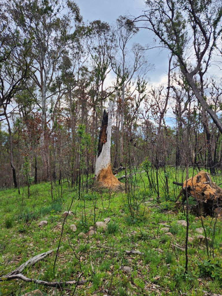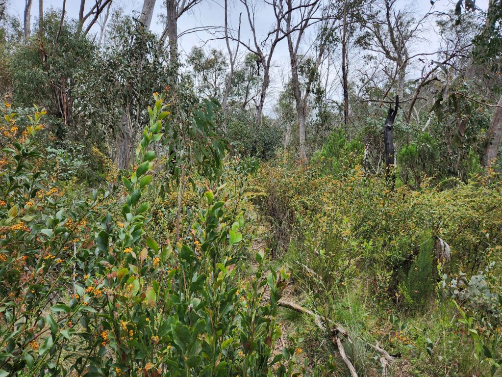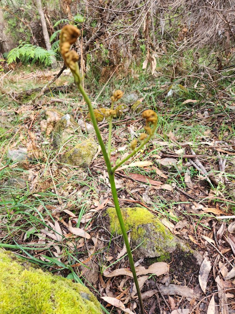 Eventually, the dense bush thinned out, and the track started to descend along a spur. In some places, it was super steep and rocky, so I was picking my way from rock to rock, trying to land on one that wouldn’t move under foot. I thought about that poor guy with his heavy backpack going up this! As I came down, the thunder started again, and it looked like rain was coming. I stayed on course until about 1km from the end when I drifted off and took the way of the creatures. I knew the general direction I needed to go, and the bush was not dense, so it was easy to just head in the right direction. I followed several creature tracks, which made the walking even easier. I finally popped out onto the road a few hundred metres away from Jubble and our meeting spot. I’m glad I didn’t know about the large copperhead snake he’d seen close to there while waiting for me. It slid onto the road for a sunbake. He walked towards it, not too close he says, it reared up its head at him like a cobra, then went back into the bushes. Within five minutes of getting into the car, it started pouring. What amazing timing!